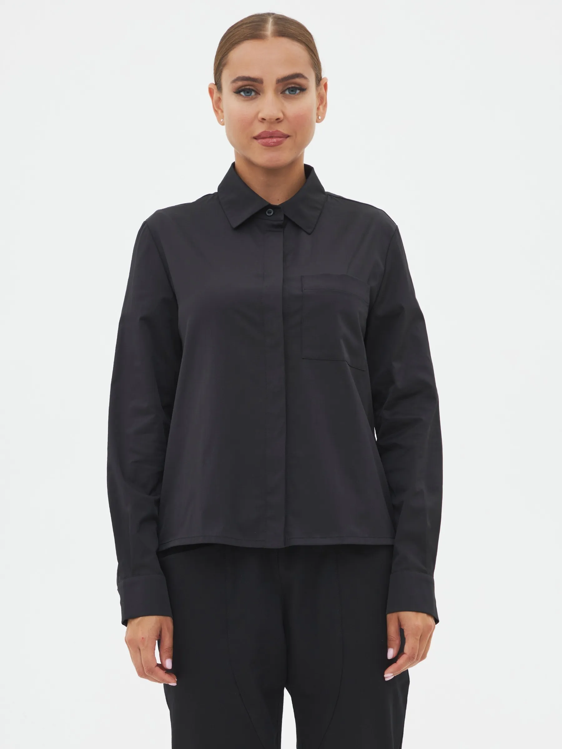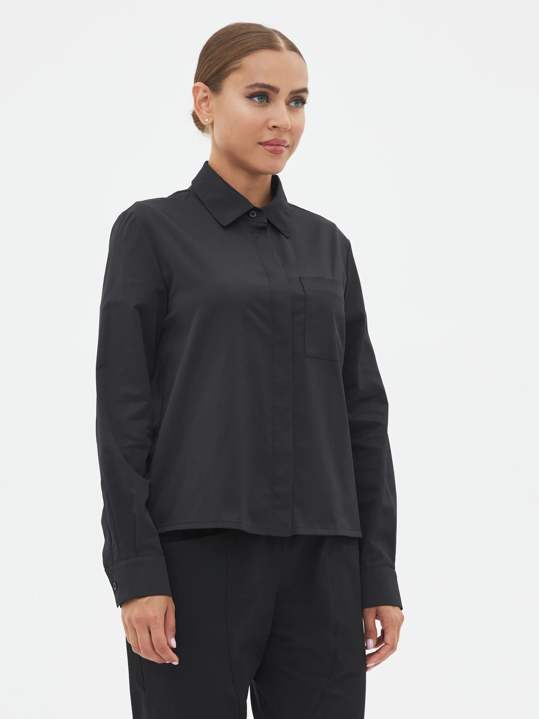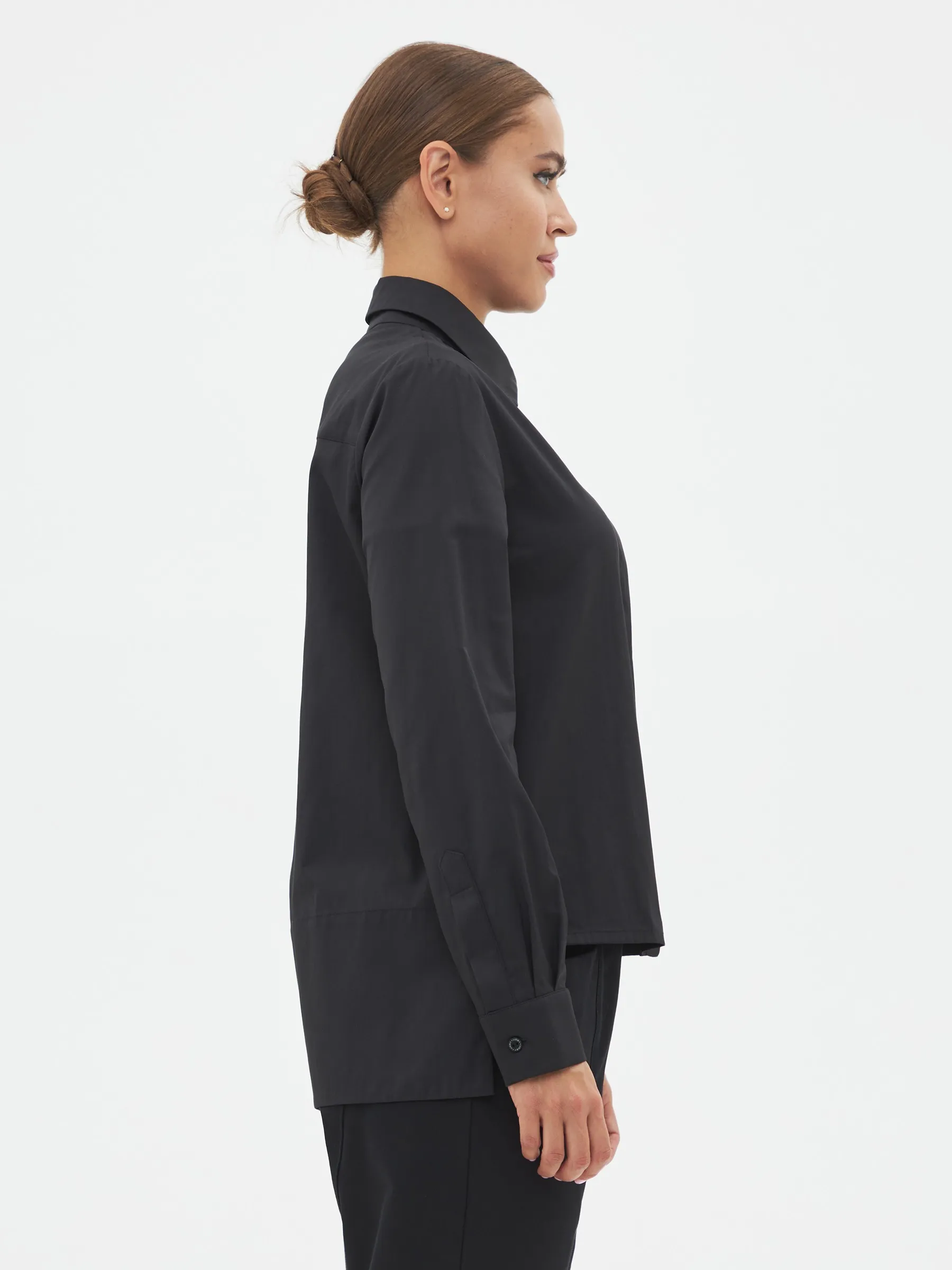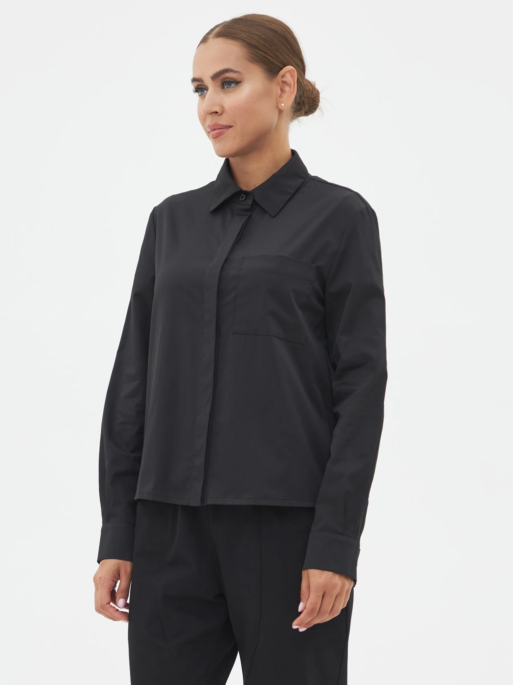 Свободная блуза-рубашка на брендовых пуговицах с отложным воротником, длинным рукавом и изящными узкими манжетами. Модель выполнена из ткани премиального качества, в составе которой мягкий хлопок, прочный полиэстер и эластичная лайкра в матовом чёрном цвете. Подойдет для создания повседневных образов и универсальных сочетаний с футболками и топами.