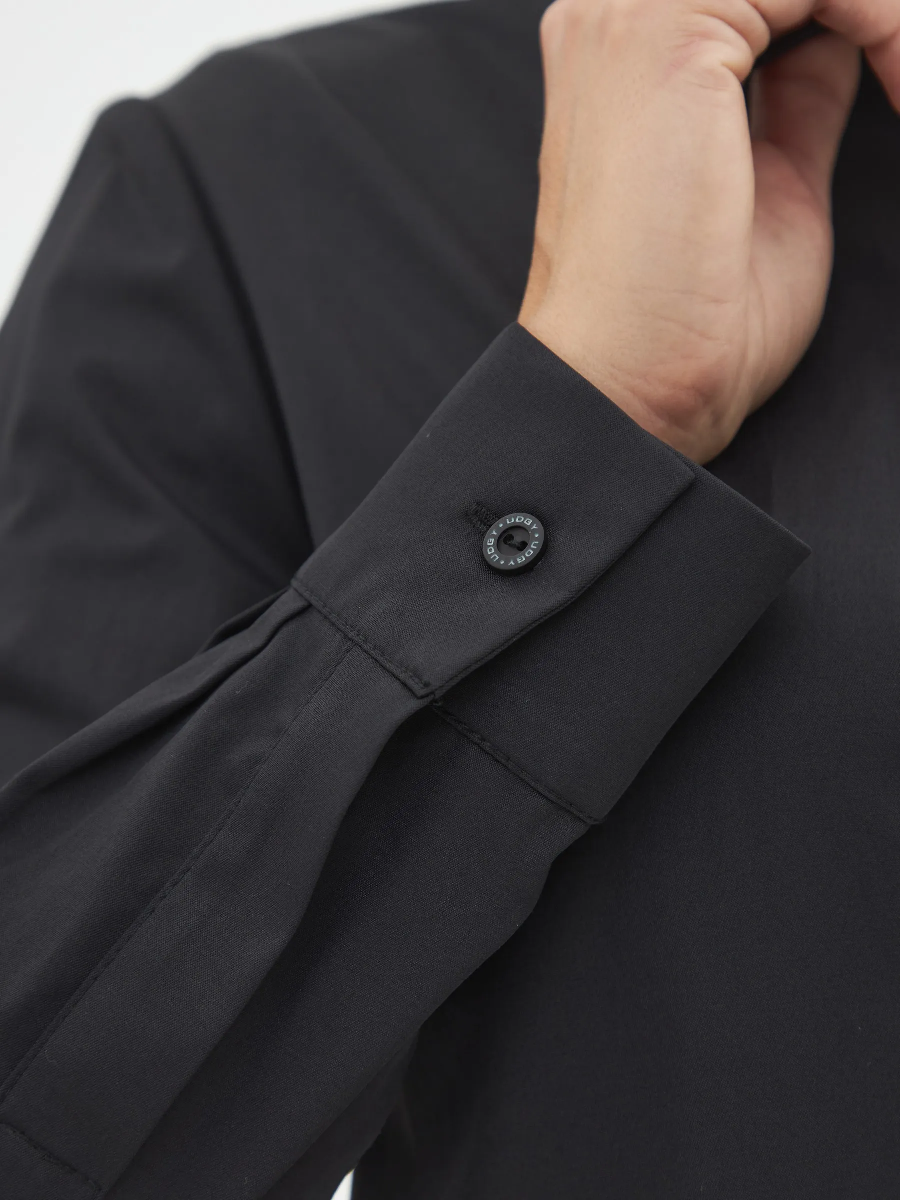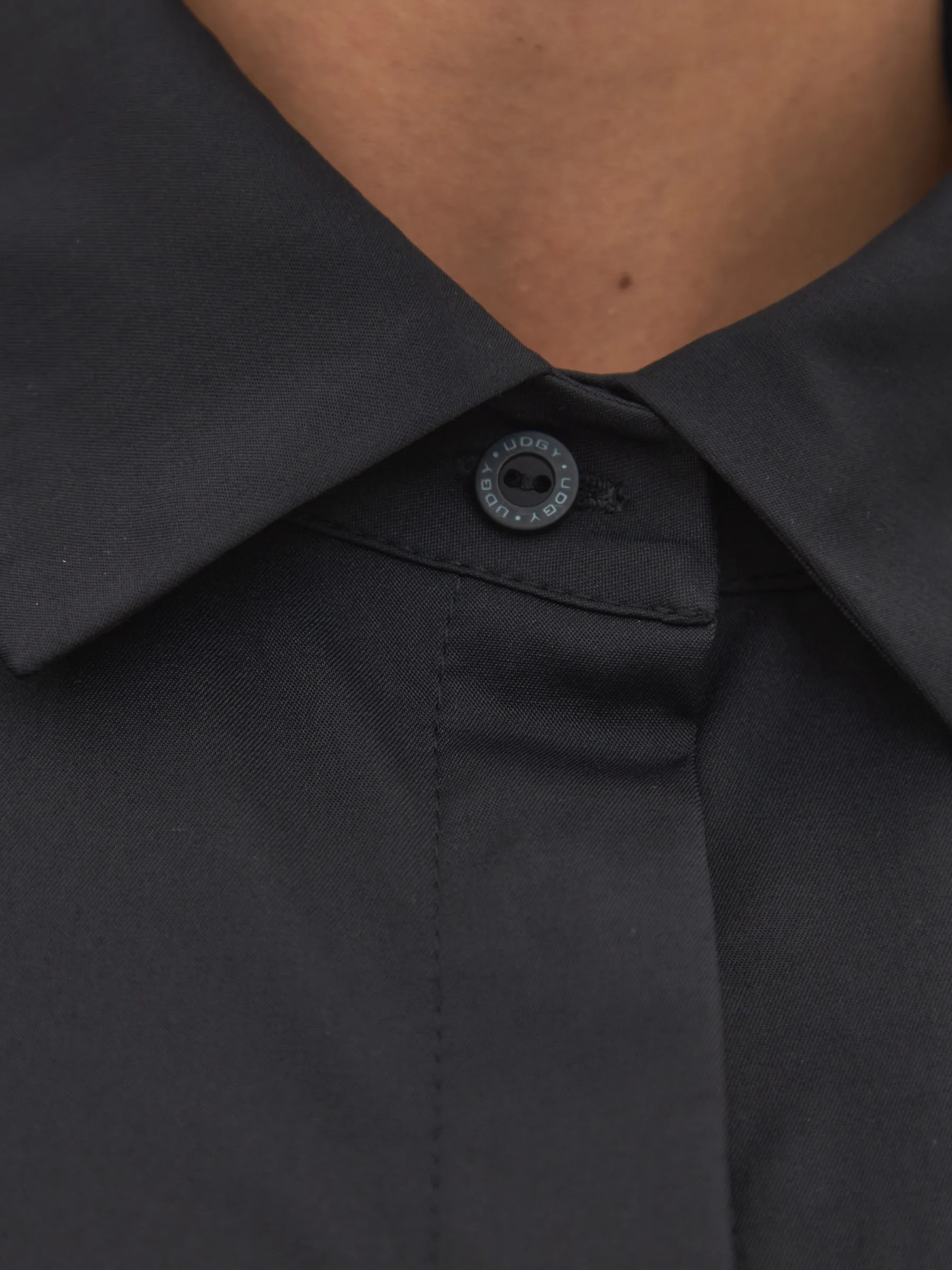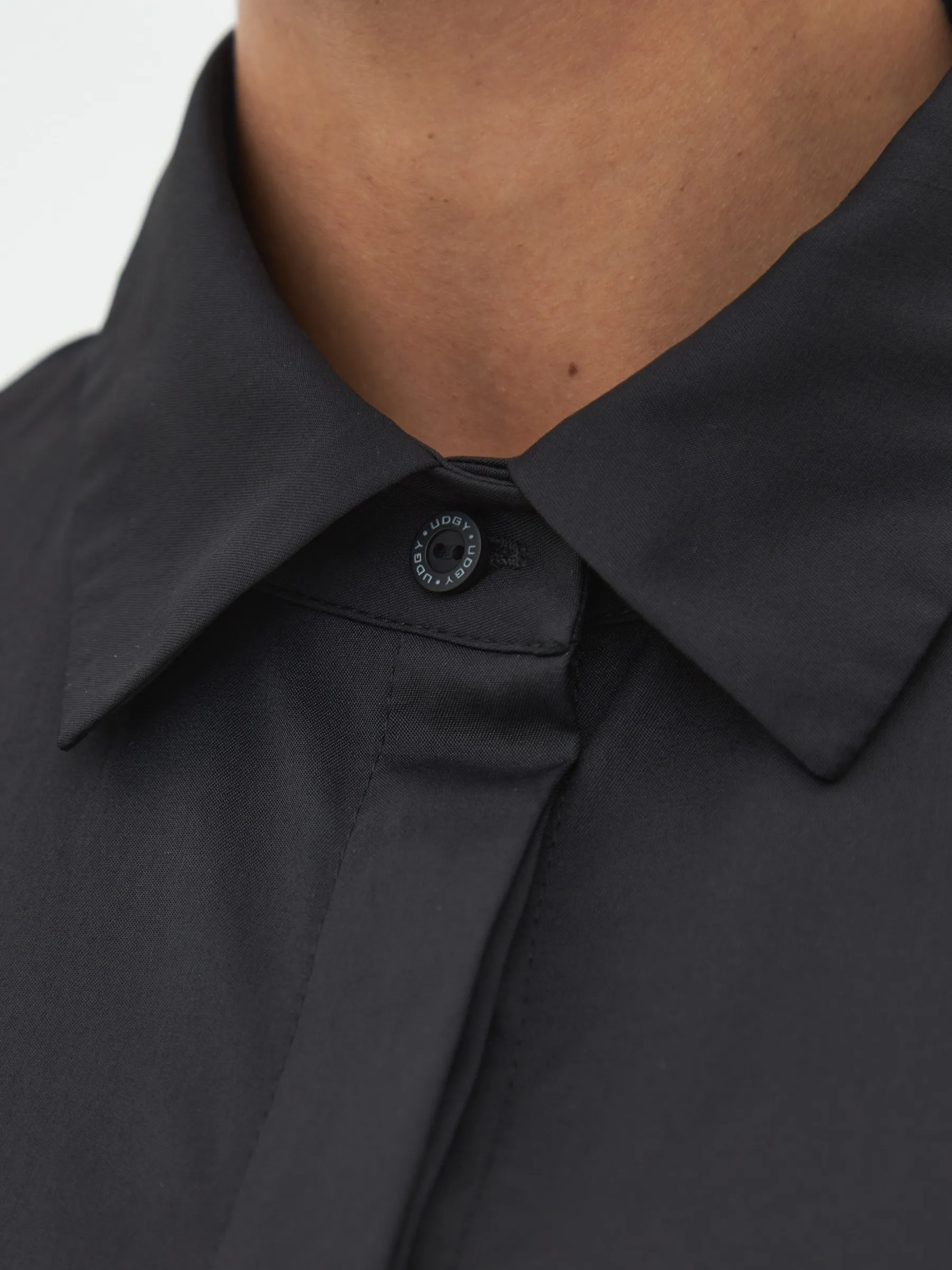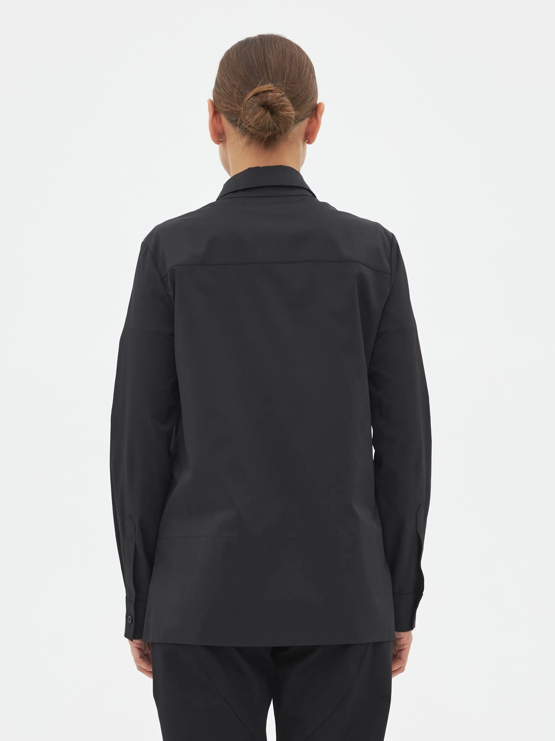 Свободная блуза-рубашка на брендовых пуговицах с отложным воротником, длинным рукавом и изящными узкими манжетами. Модель выполнена из ткани премиального качества, в составе которой мягкий хлопок, прочный полиэстер и эластичная лайкра в матовом чёрном цвете. Подойдет для создания повседневных образов и универсальных сочетаний с футболками и топами.