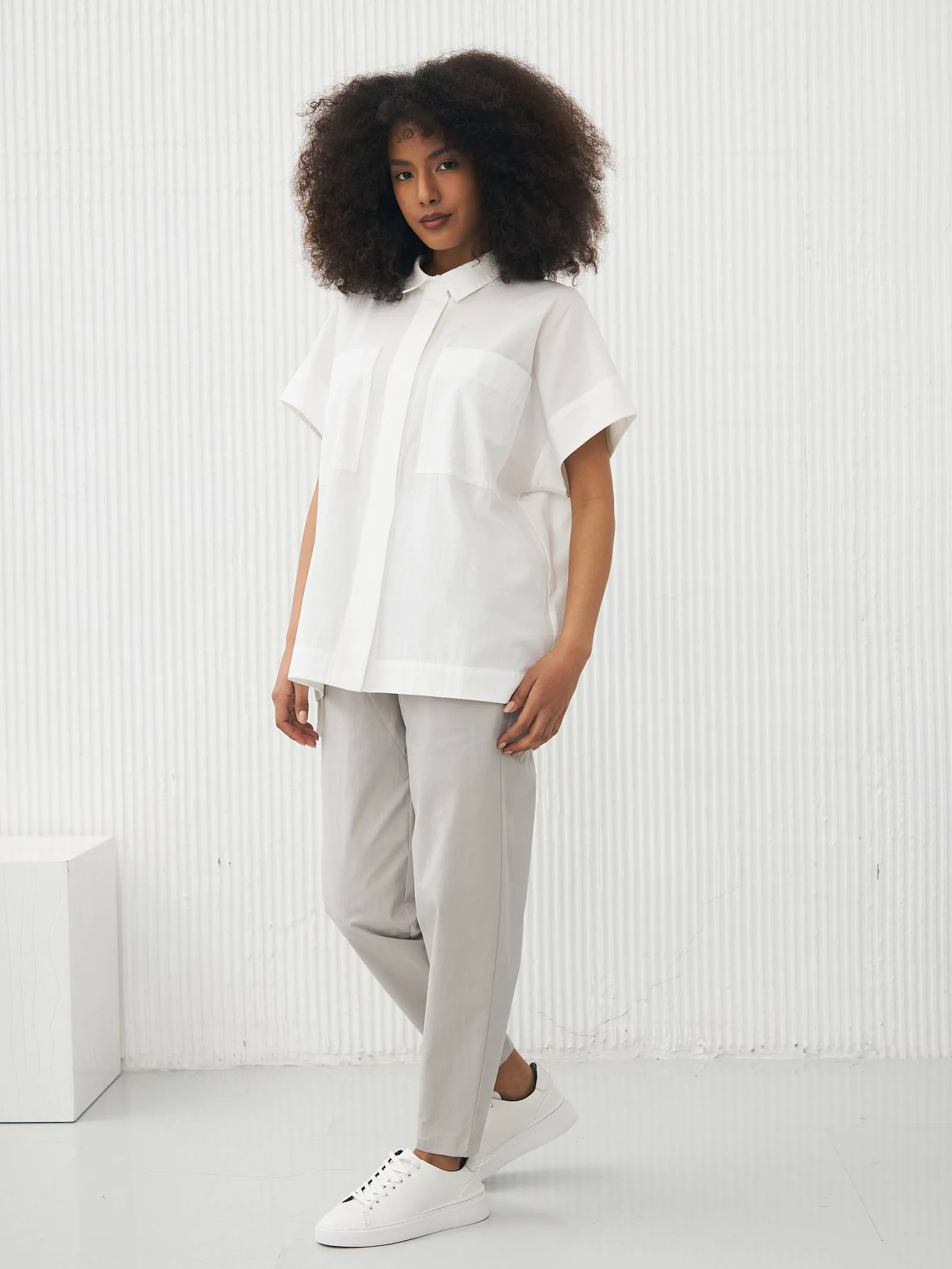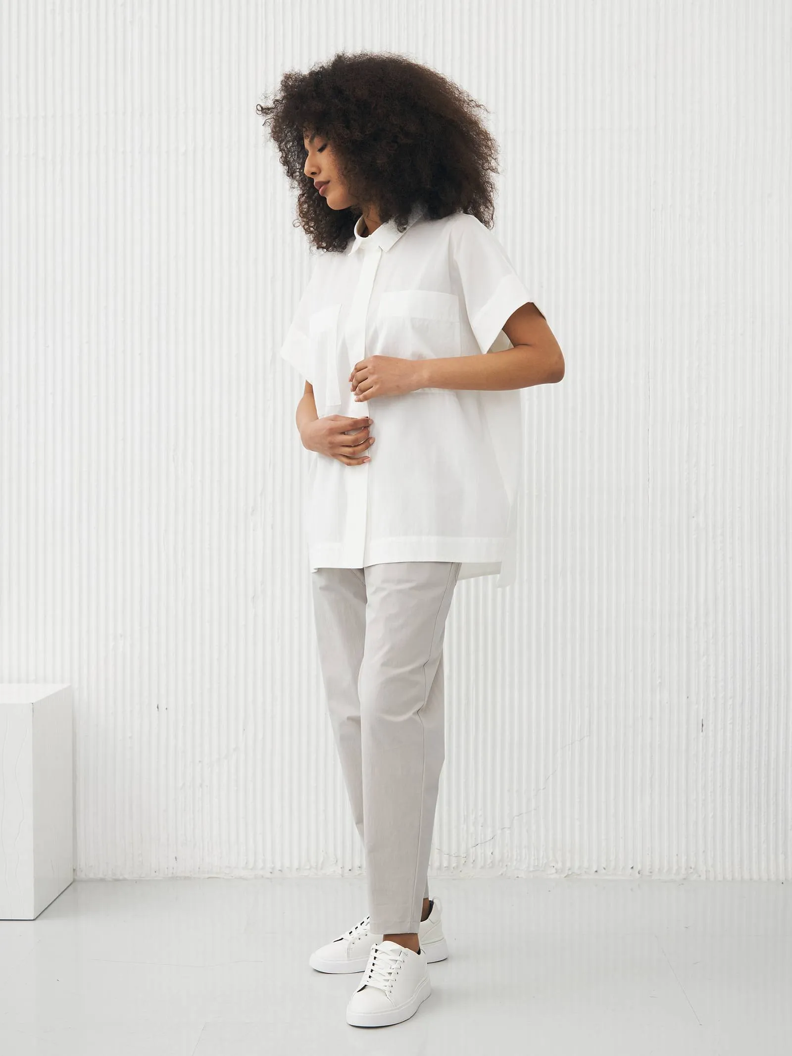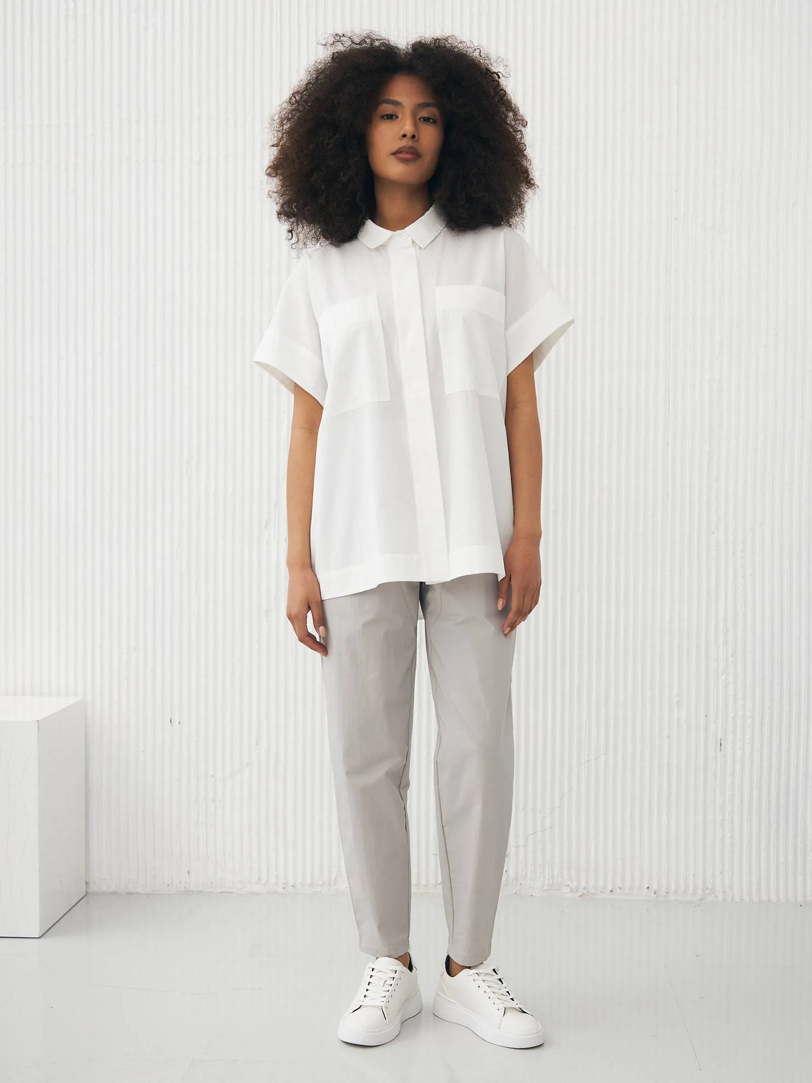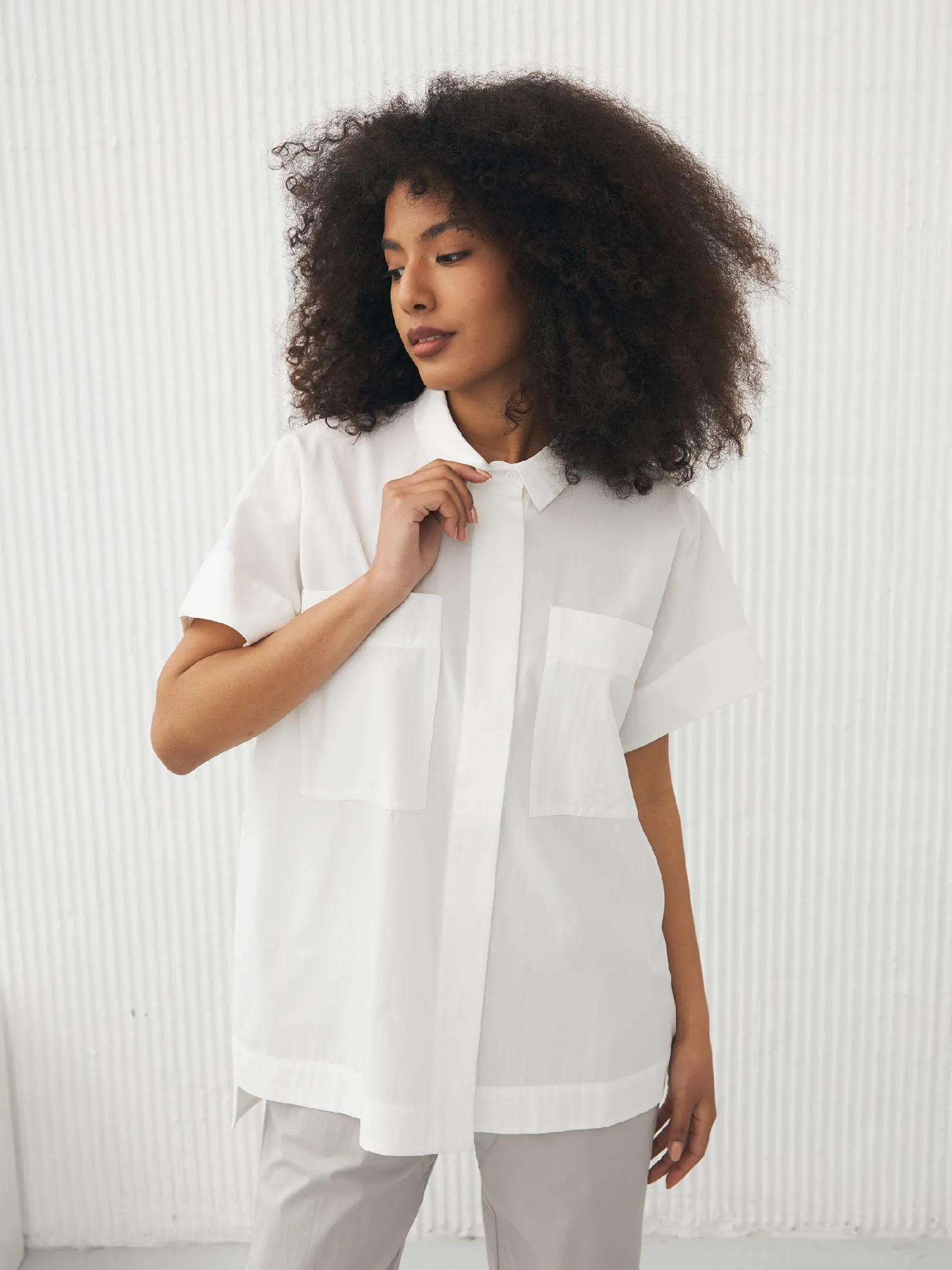 Рубашка в белом цвете с отложным воротником, удлиненной спинкой и двумя большими карманами на груди для весенне-летнего сезона. Модель выполнена из органических и гипоаллергенных материалов: дышащий лен и мягкий хлопок. Подойдет для создания непосредственных и легких сочетаний в стиле кэжуал.