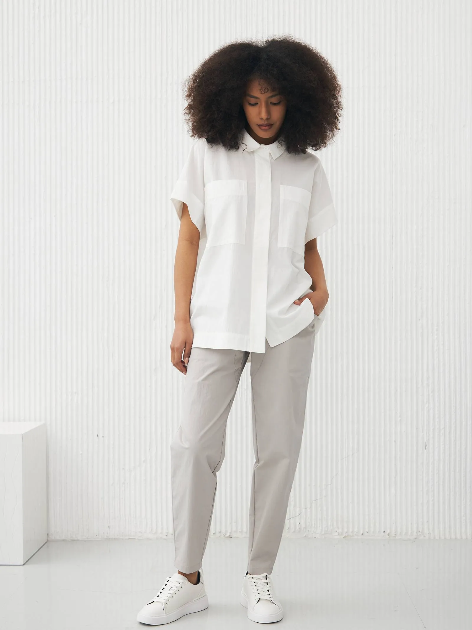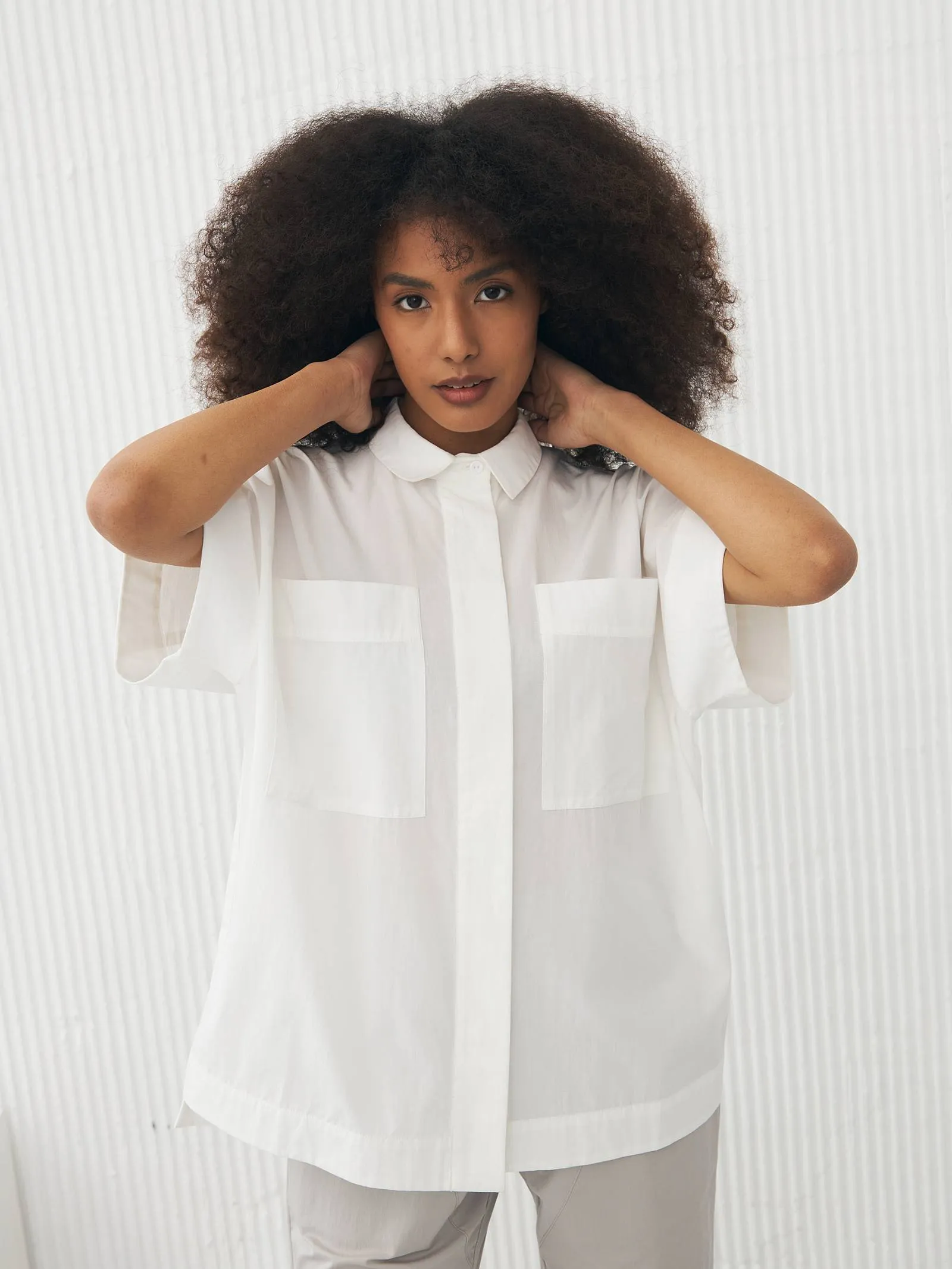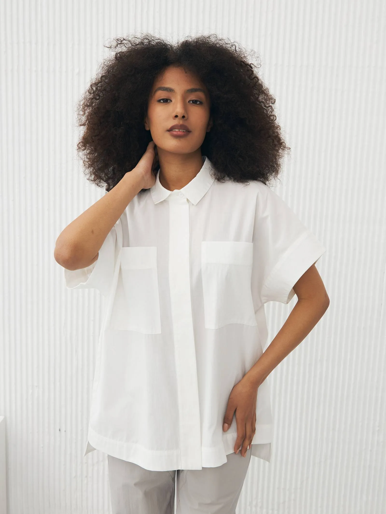 Рубашка в белом цвете с отложным воротником, удлиненной спинкой и двумя большими карманами на груди для весенне-летнего сезона. Модель выполнена из органических и гипоаллергенных материалов: дышащий лен и мягкий хлопок. Подойдет для создания непосредственных и легких сочетаний в стиле кэжуал.