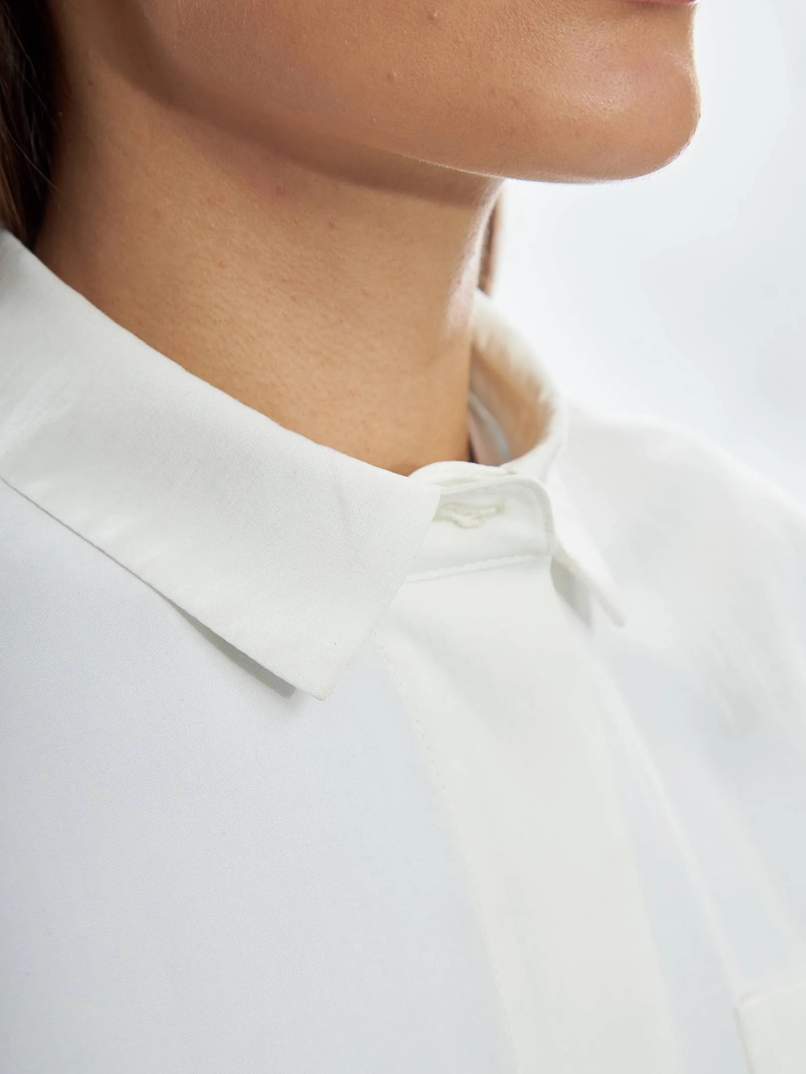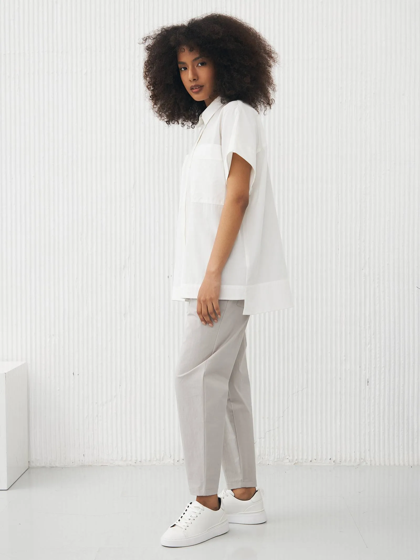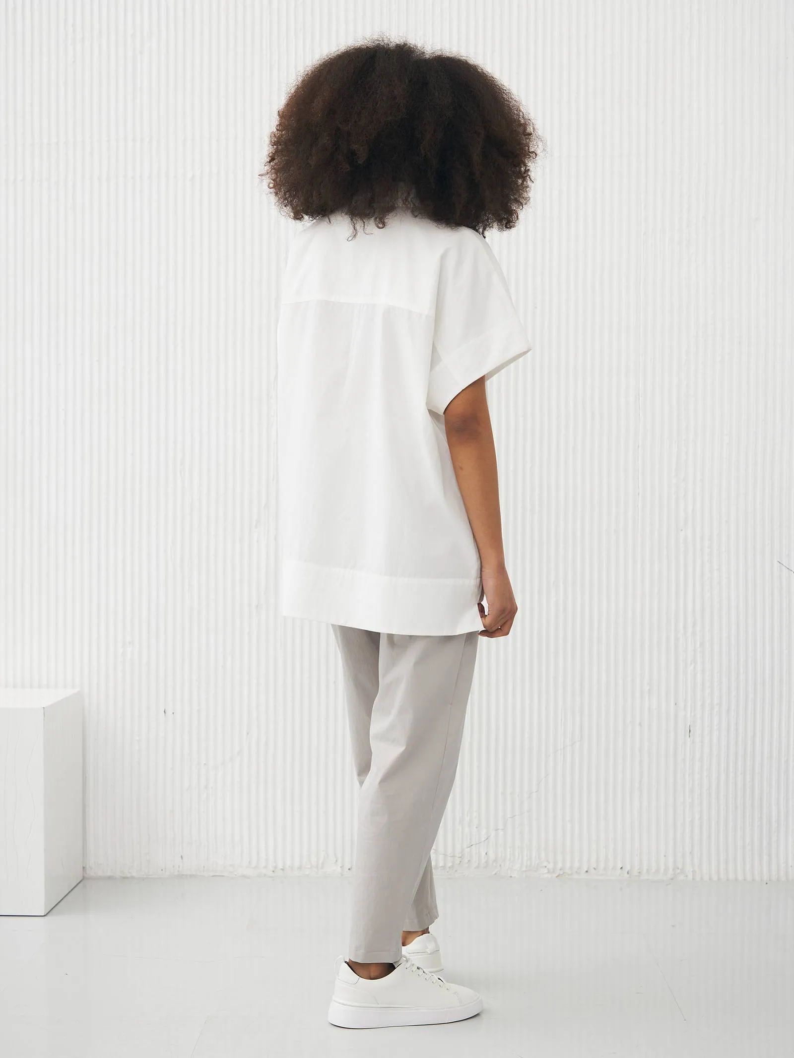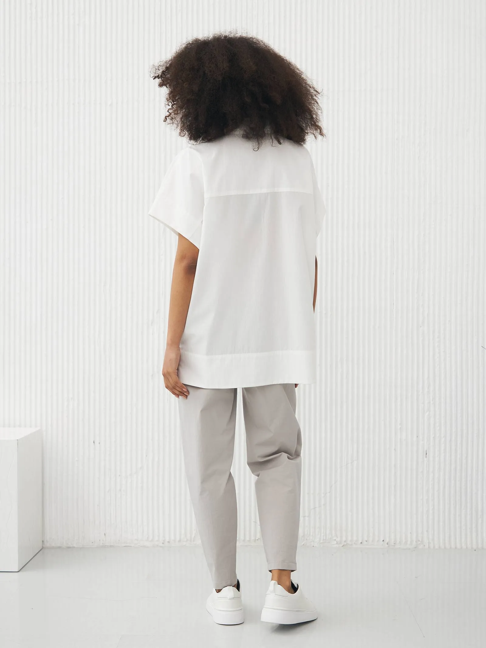 Рубашка в белом цвете с отложным воротником, удлиненной спинкой и двумя большими карманами на груди для весенне-летнего сезона. Модель выполнена из органических и гипоаллергенных материалов: дышащий лен и мягкий хлопок. Подойдет для создания непосредственных и легких сочетаний в стиле кэжуал.