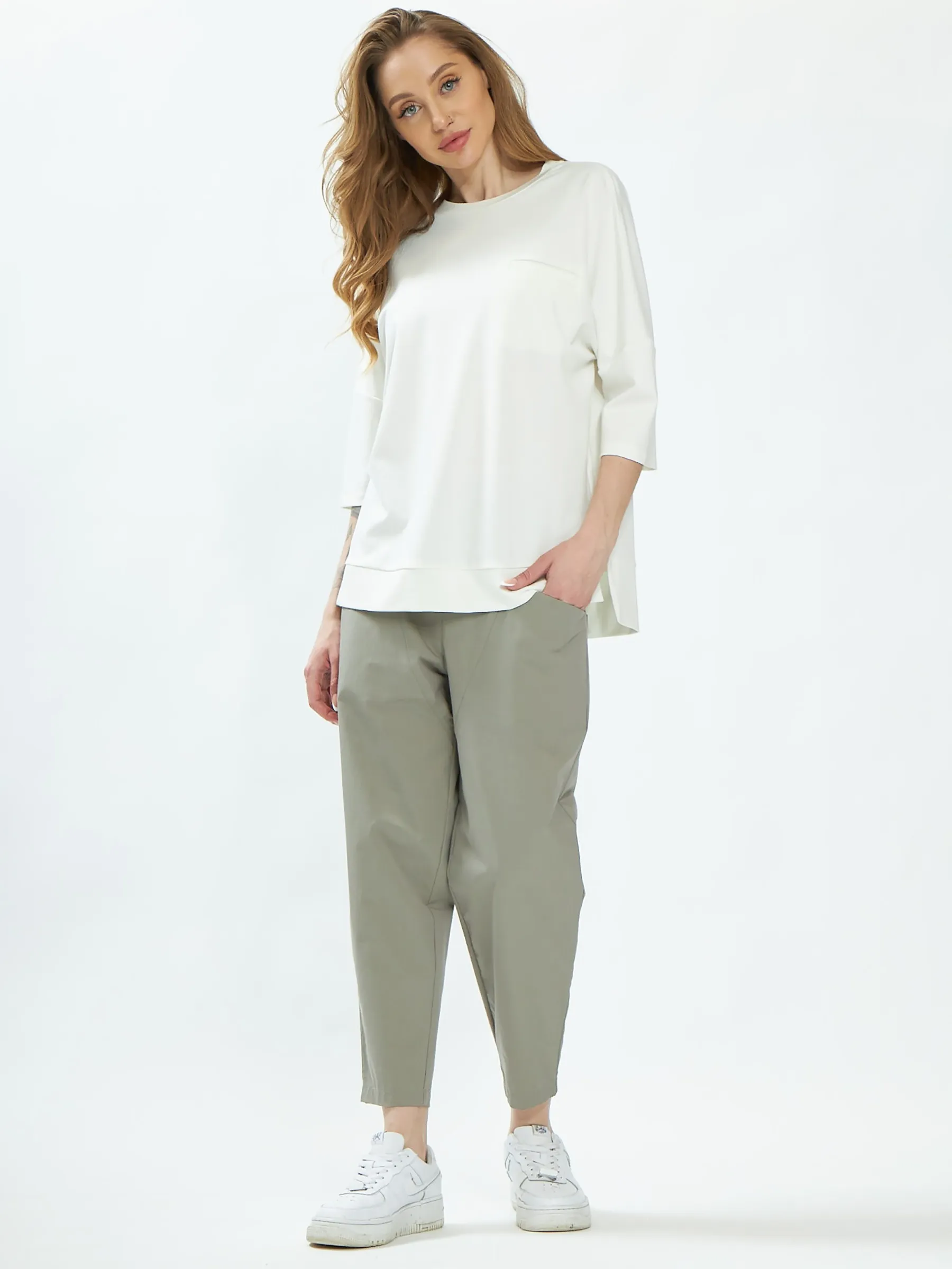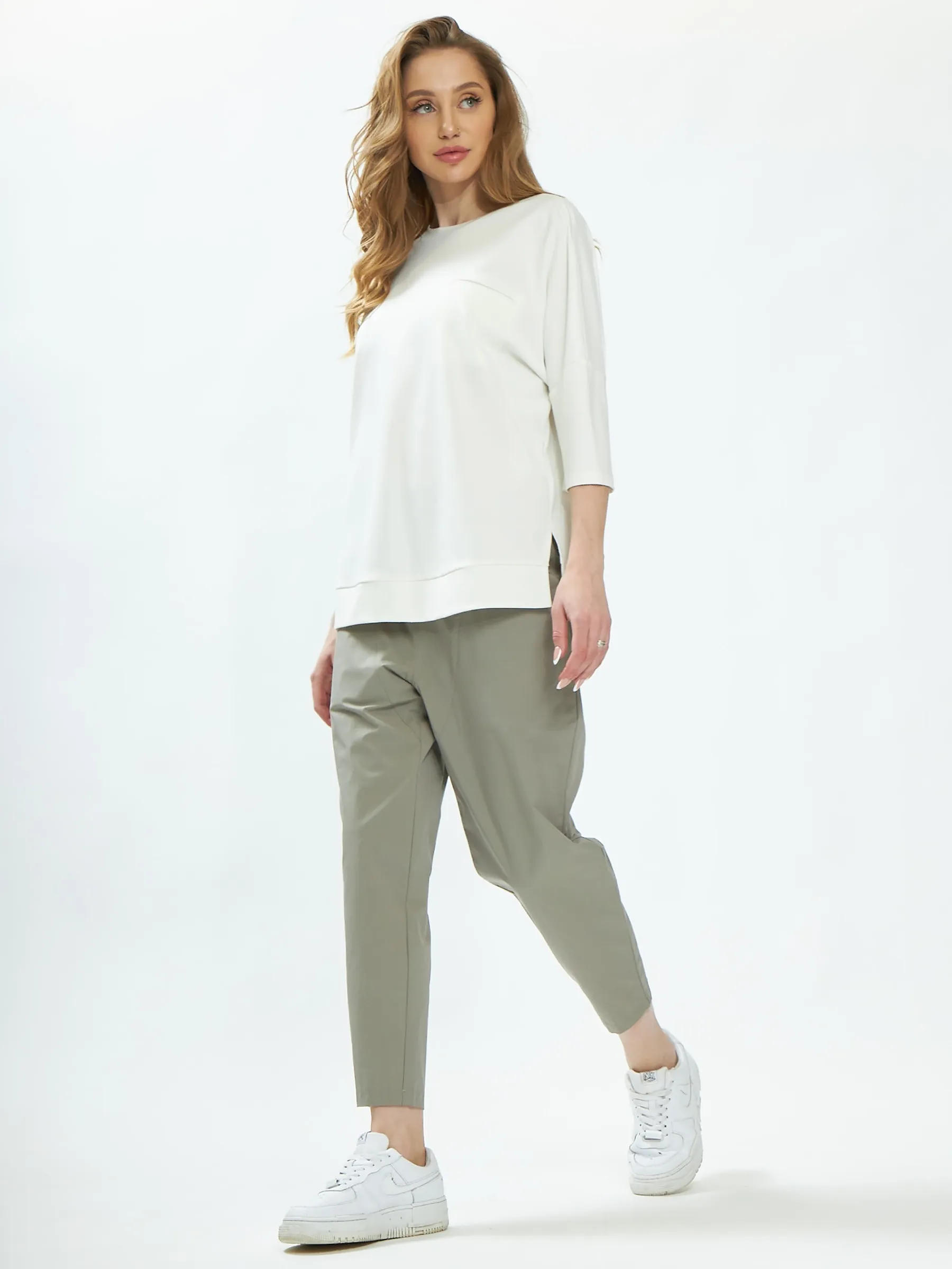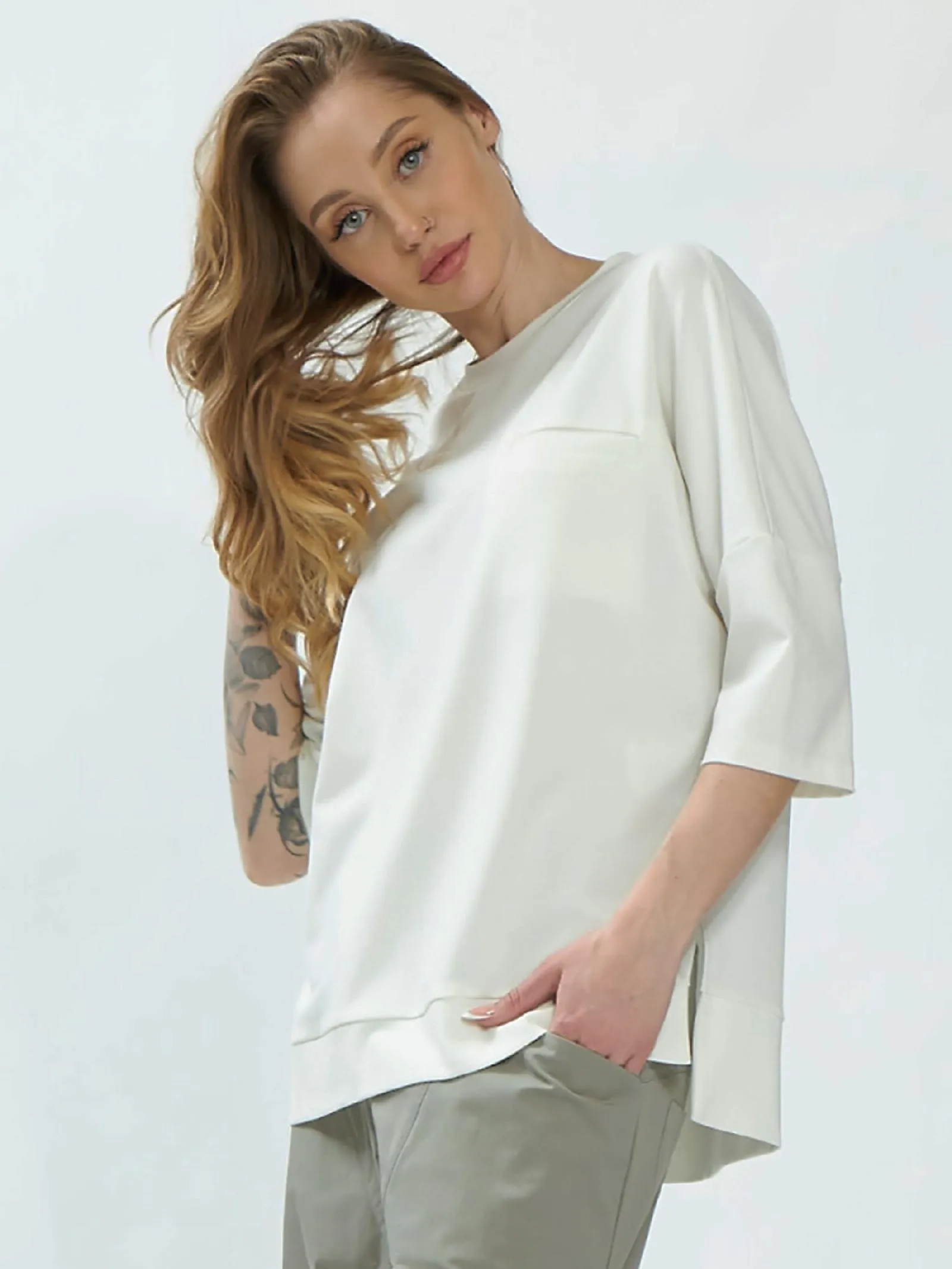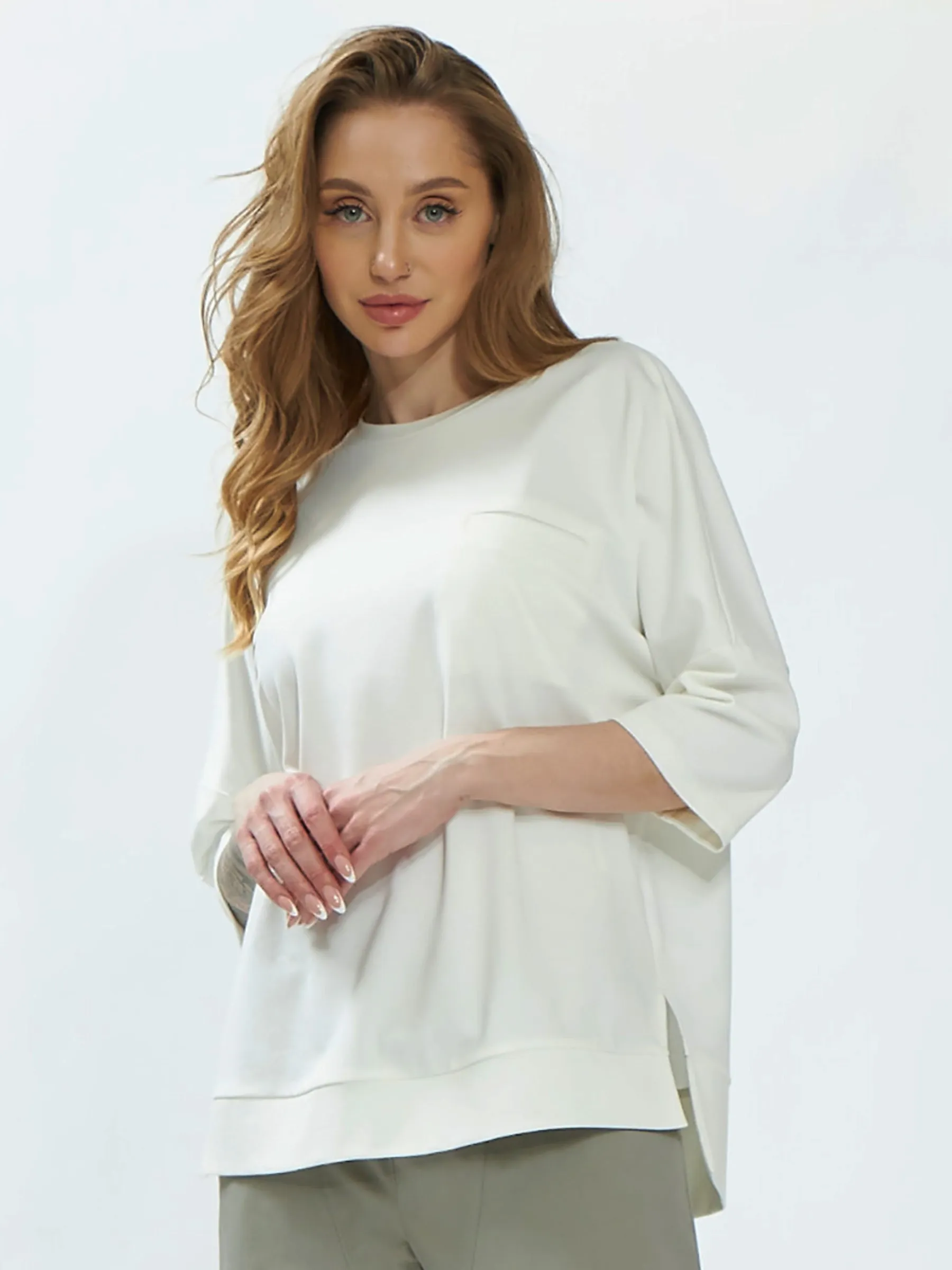 Свободная блуза в молочном оттенке с рукавом 3/4, декоративными разрезами по бокам и стильным карманом на груди. Модель выполнена из мягкой и практичном ткани премиального качества. Подойдет для повседневных сочетаний с брюками или джинсами в стиле кэжуал.