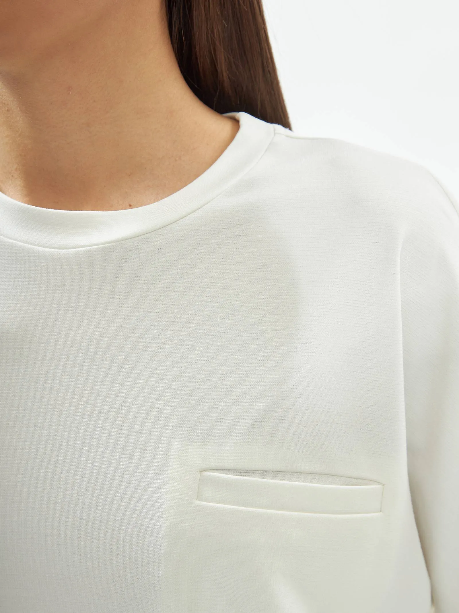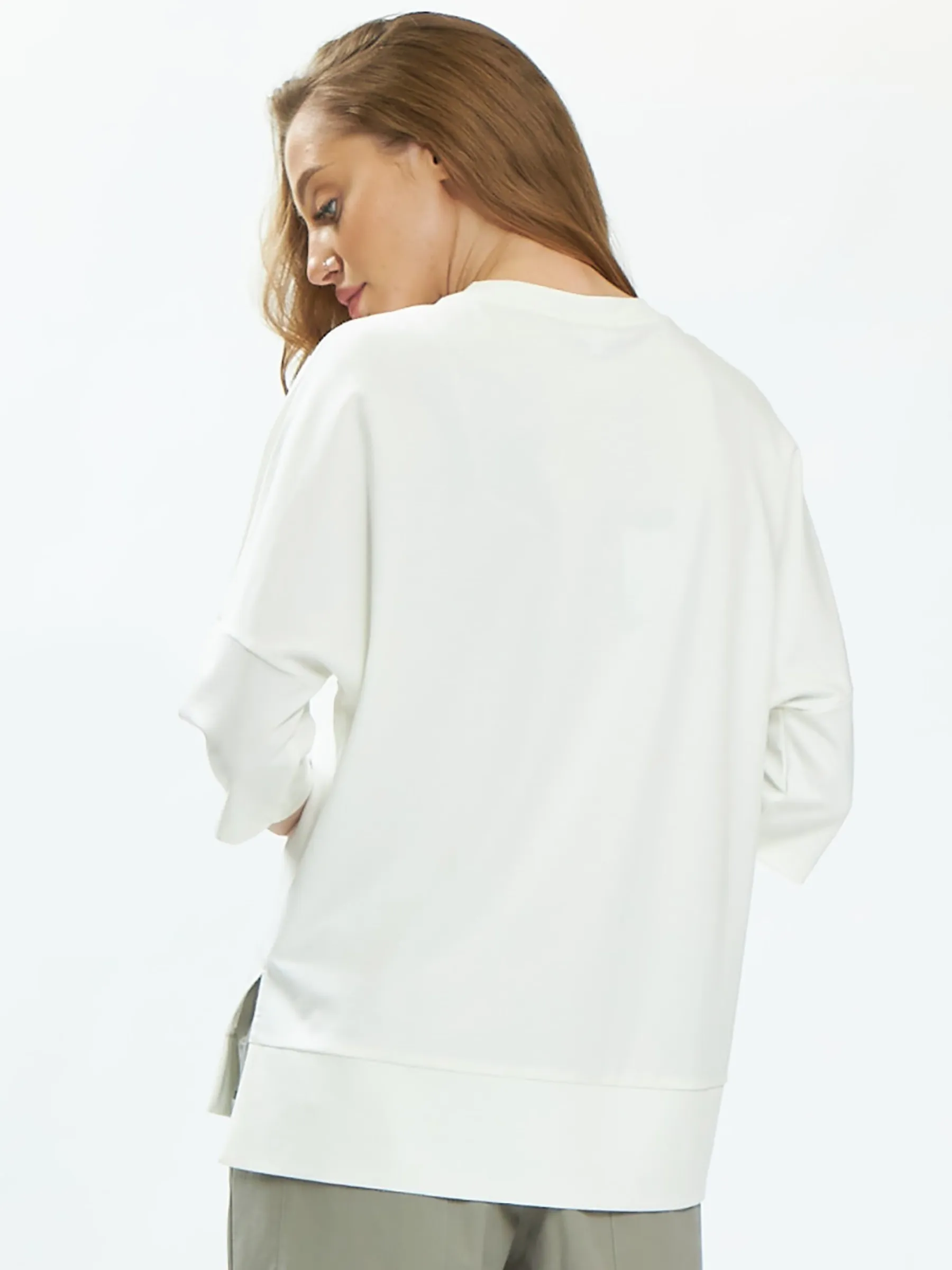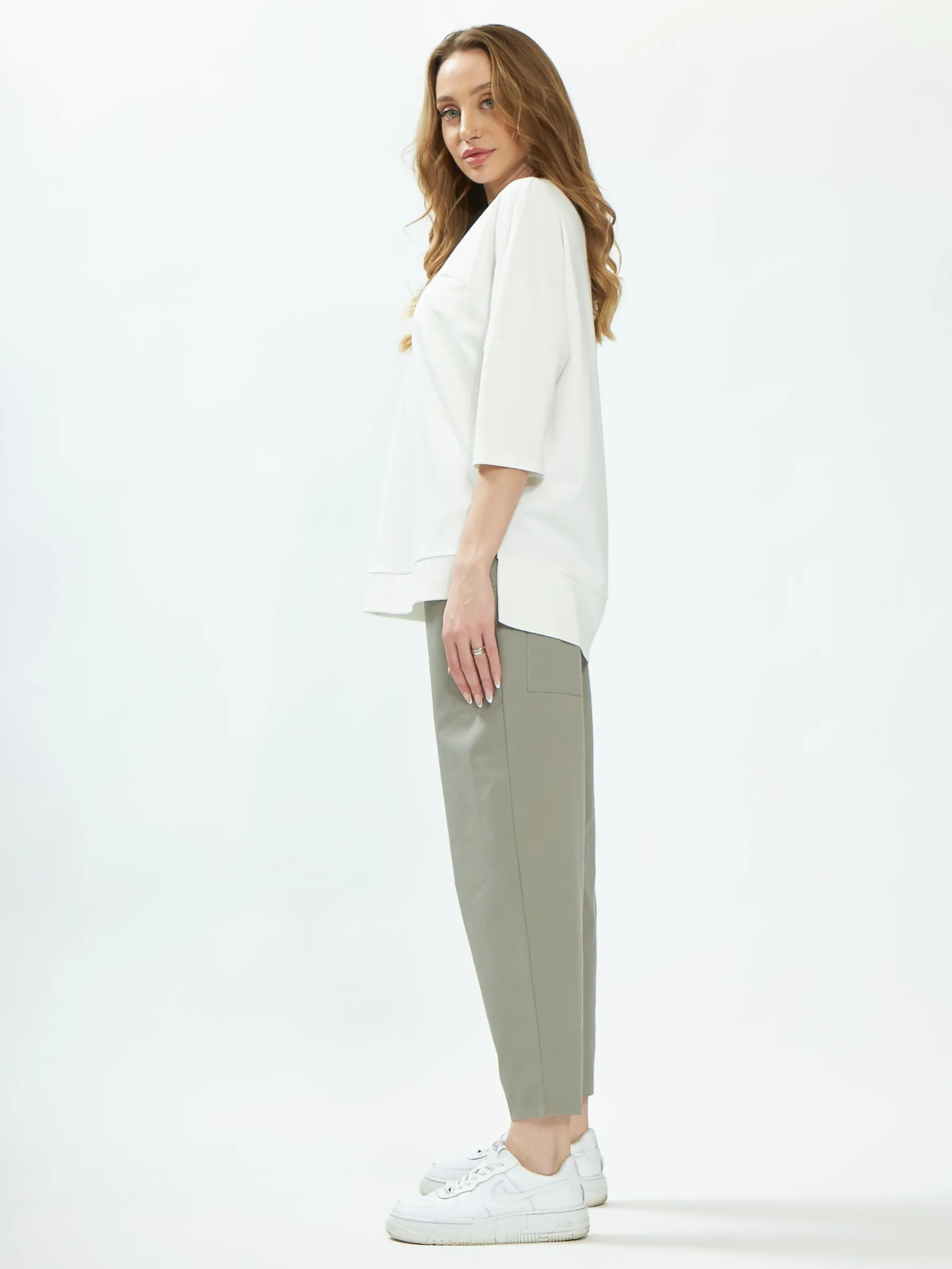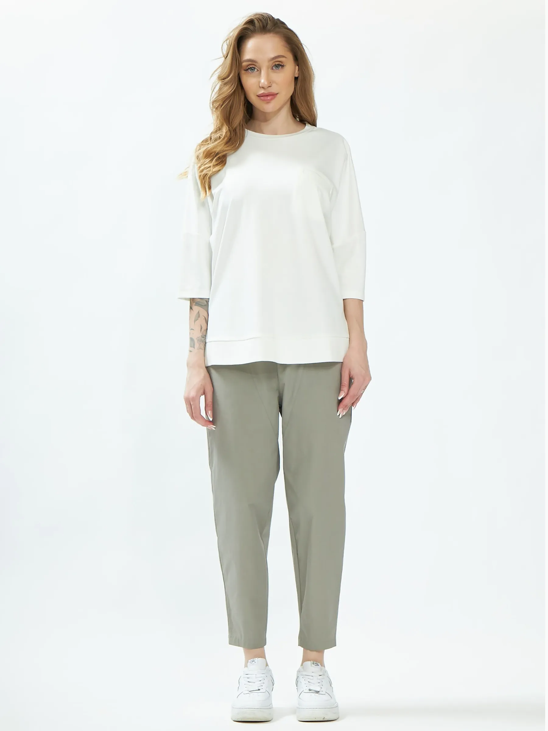 Свободная блуза в молочном оттенке с рукавом 3/4, декоративными разрезами по бокам и стильным карманом на груди. Модель выполнена из мягкой и практичном ткани премиального качества. Подойдет для повседневных сочетаний с брюками или джинсами в стиле кэжуал.