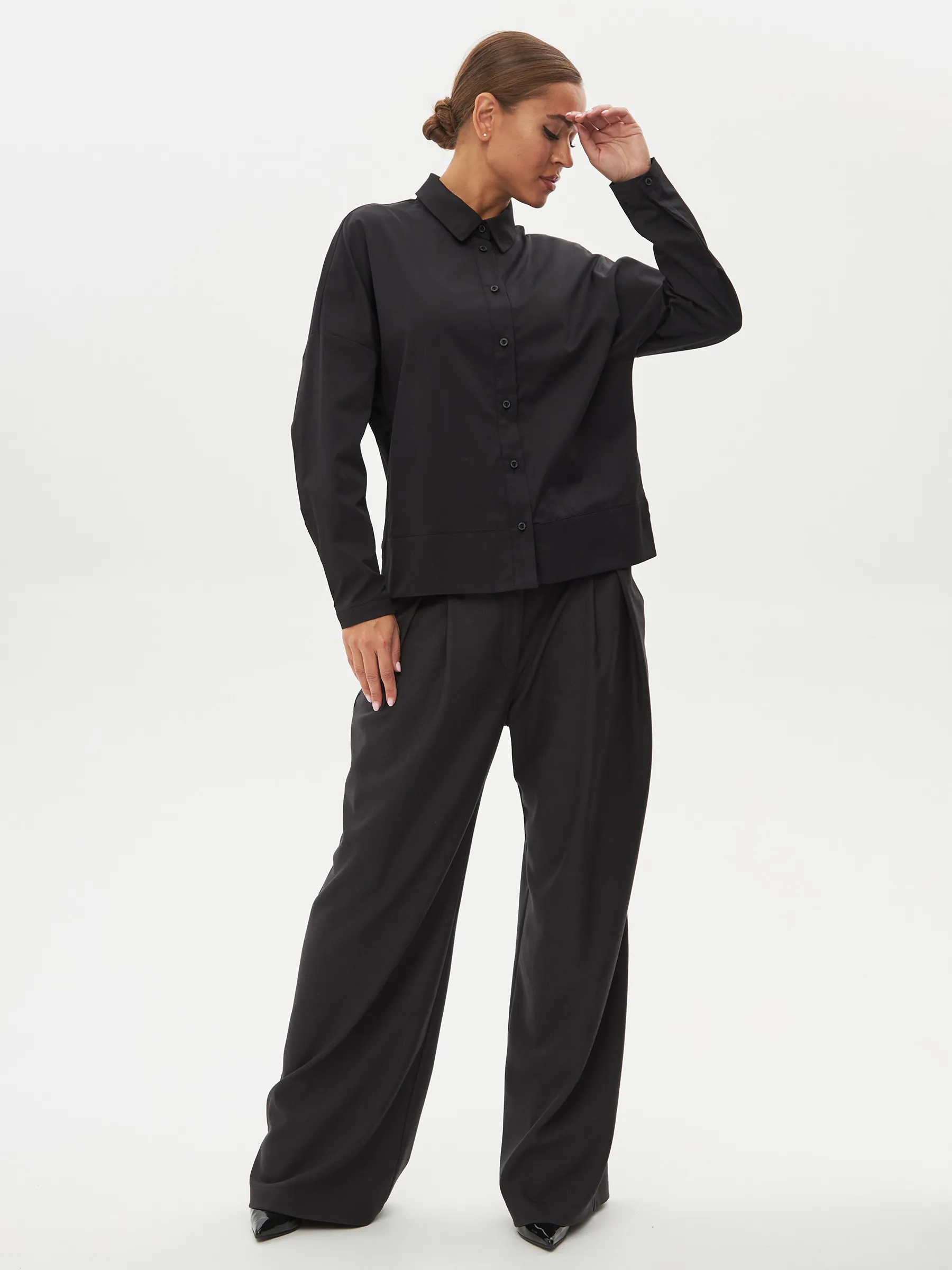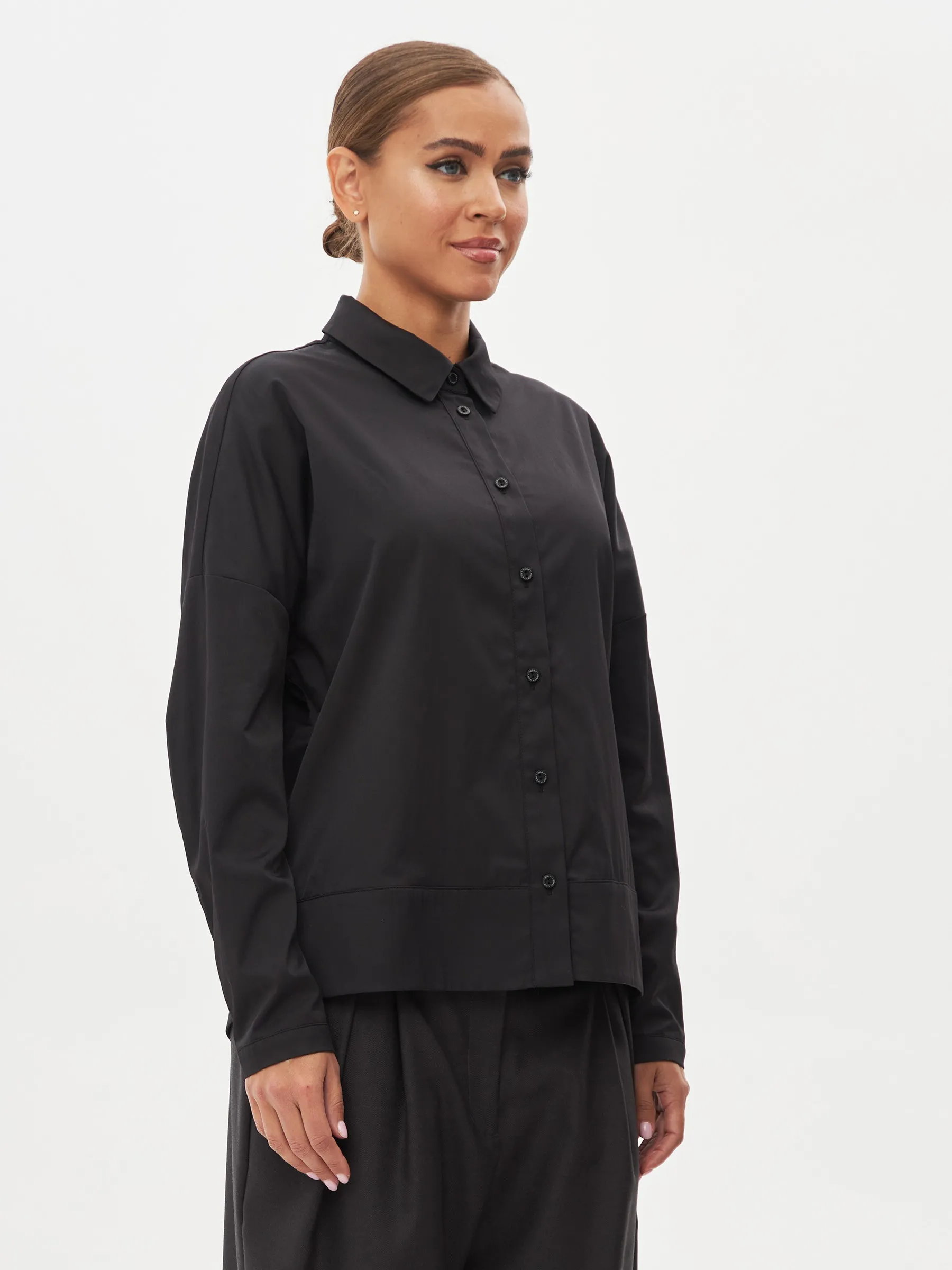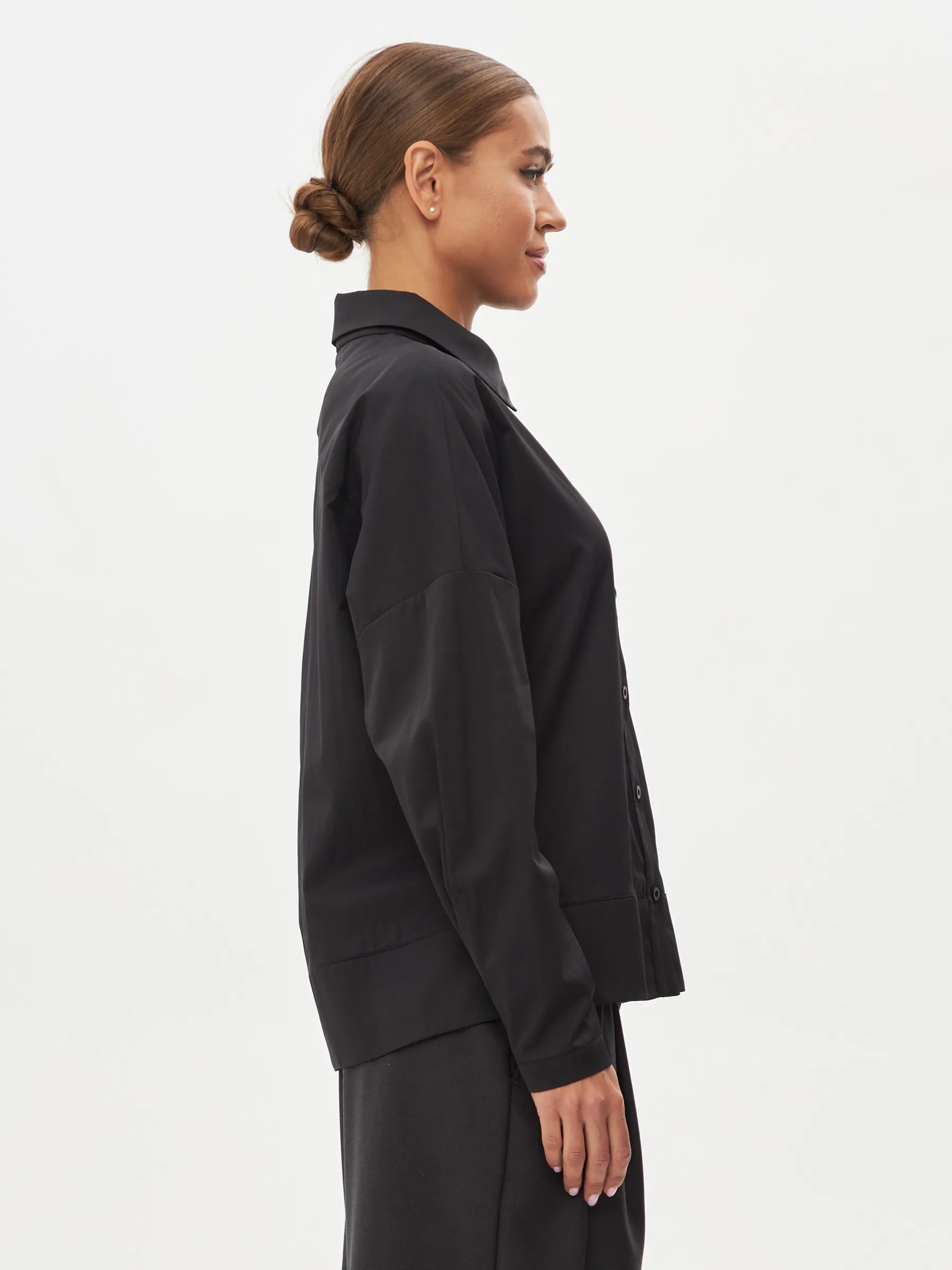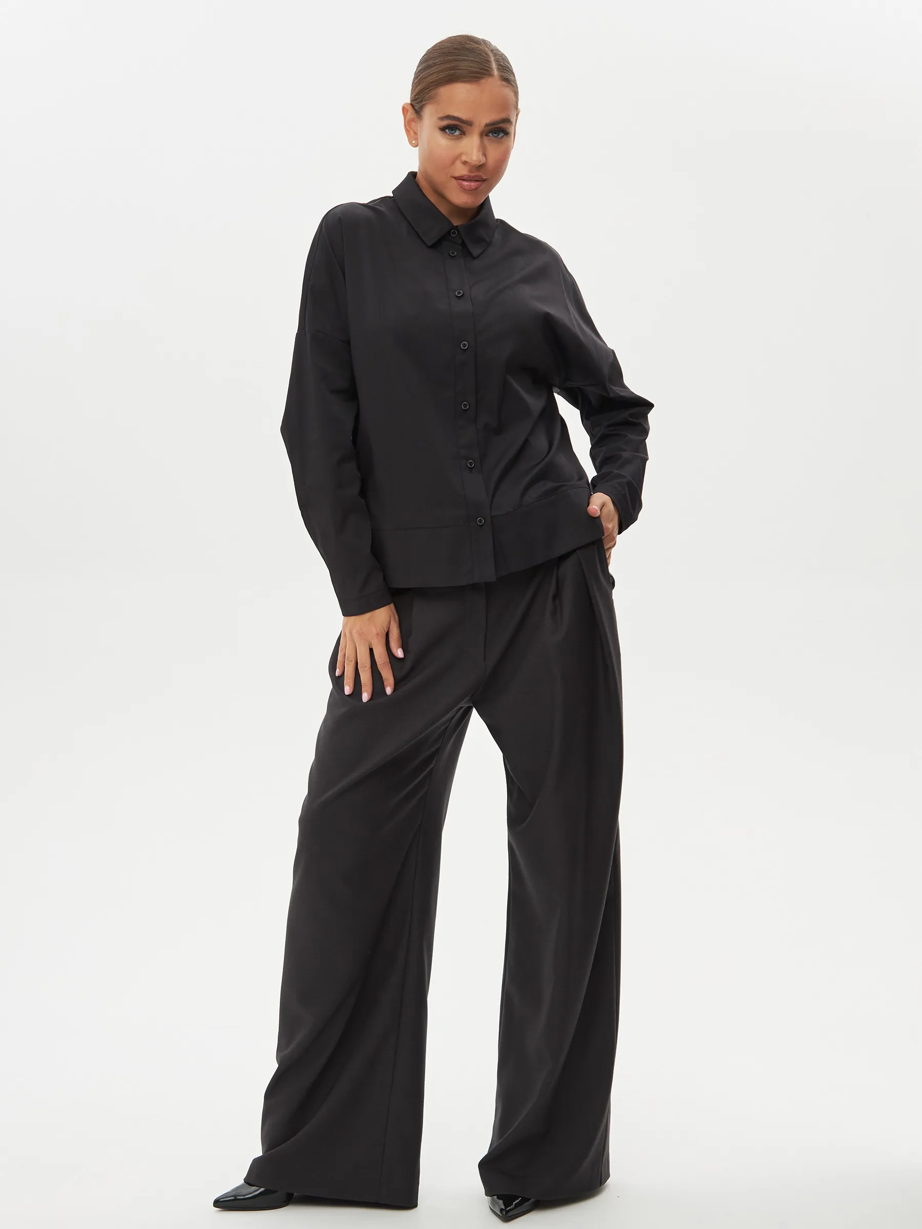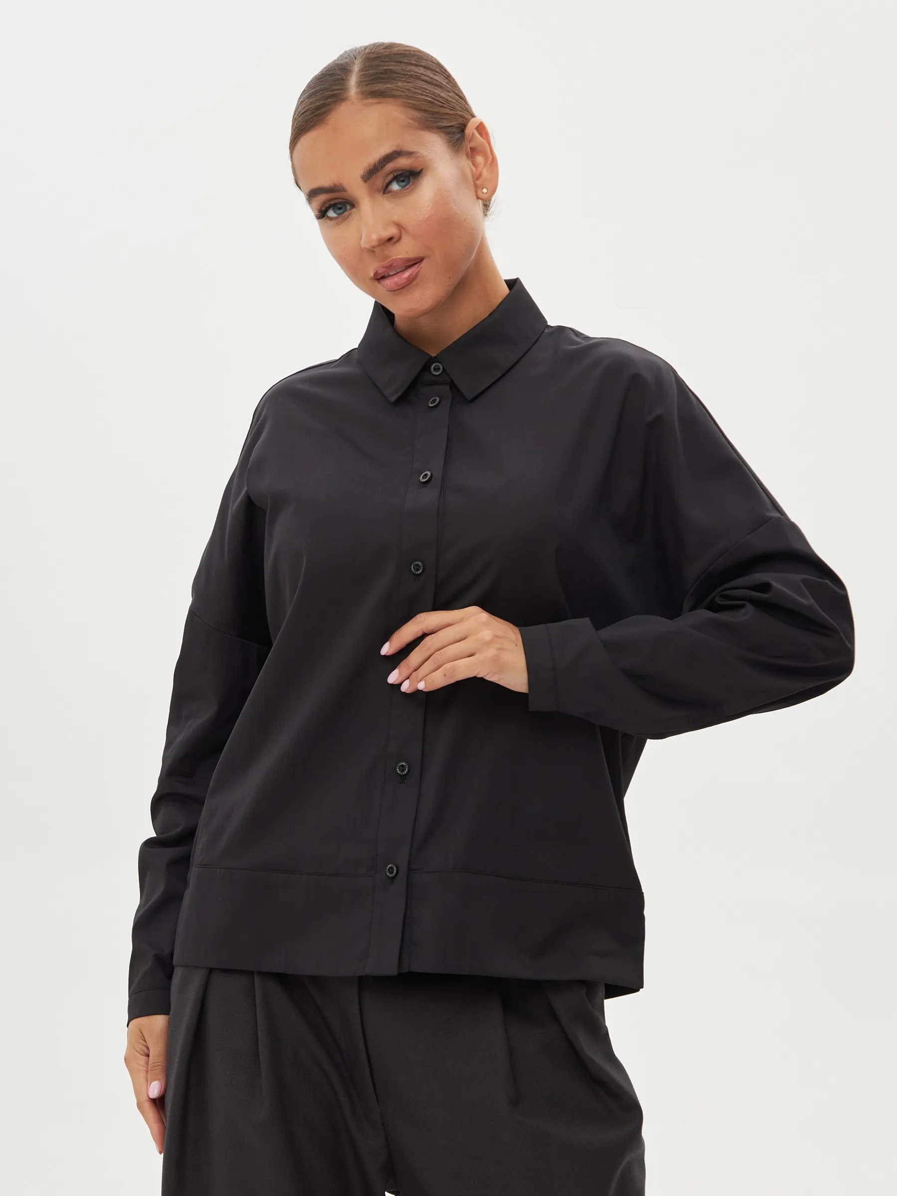 Женская блуза прямого кроя с удобной застежкой на шесть пуговиц по всей длине. Воротник-стойка имеет закругленные концы и застегивается на одну пуговицу, что добавляет аккуратный и элегантный акцент. Спущенные плечи создают расслабленный и современный силуэт, который хорошо смотрится в разных образах. Длинные рукава украшены складками и застегиваются на пуговицы, что обеспечивает практичность и комфорт в носке. По низу блузы расположены боковые разрезы, которые обеспечивают свободу движений и добавляют дополнительный стильный элемент.