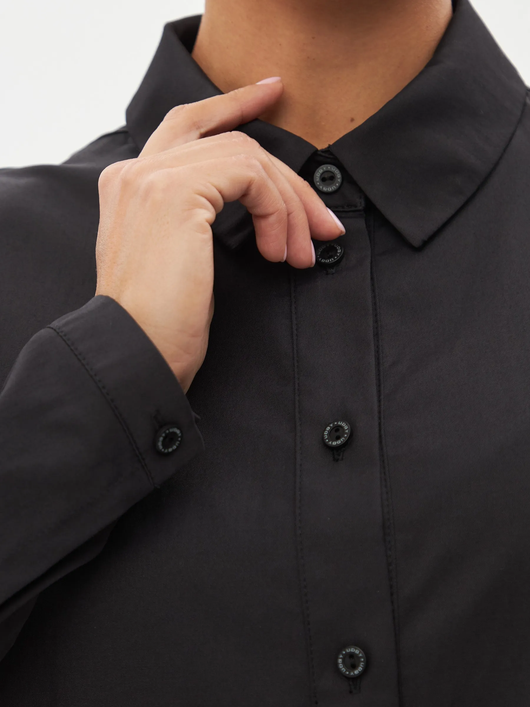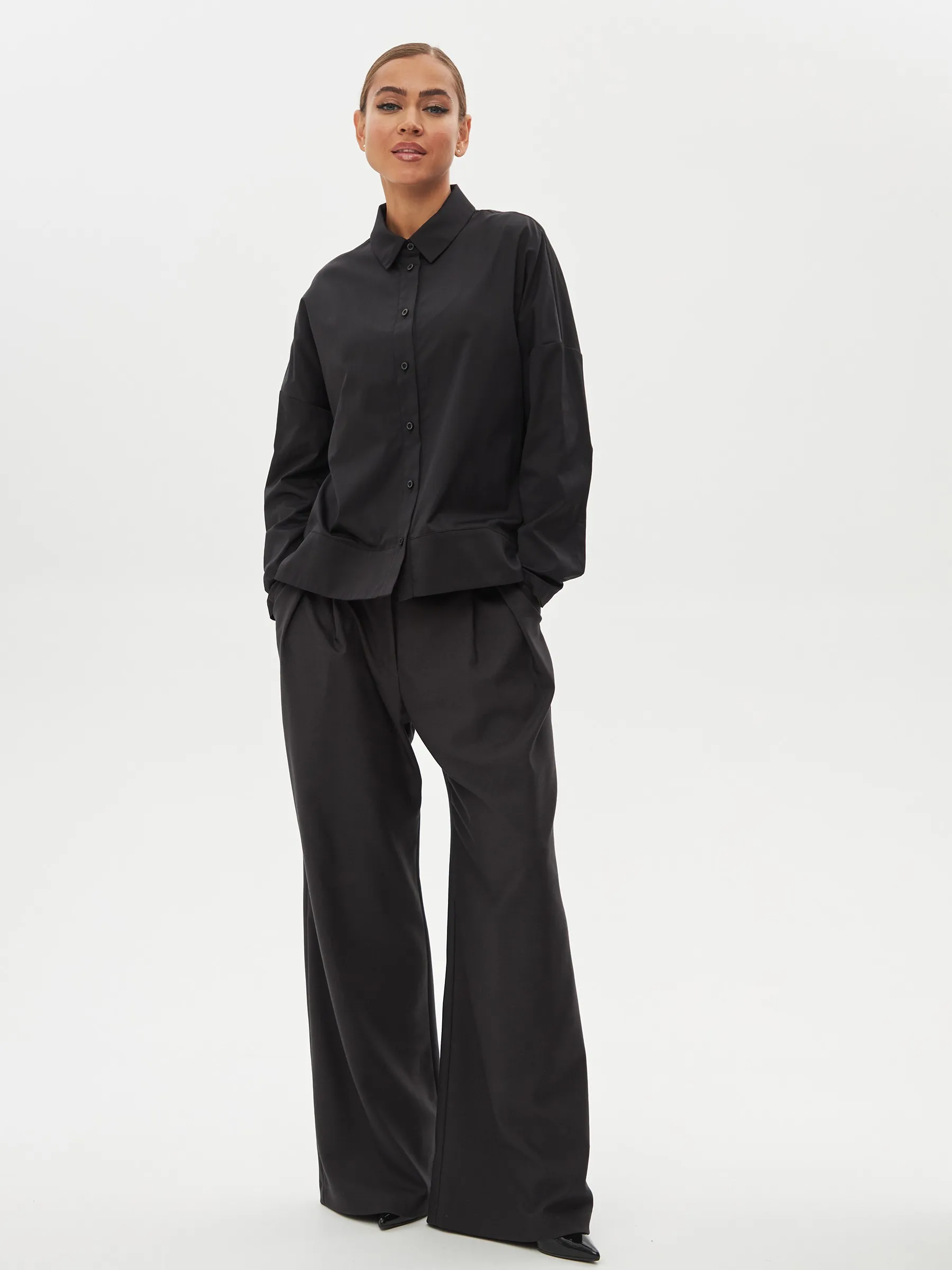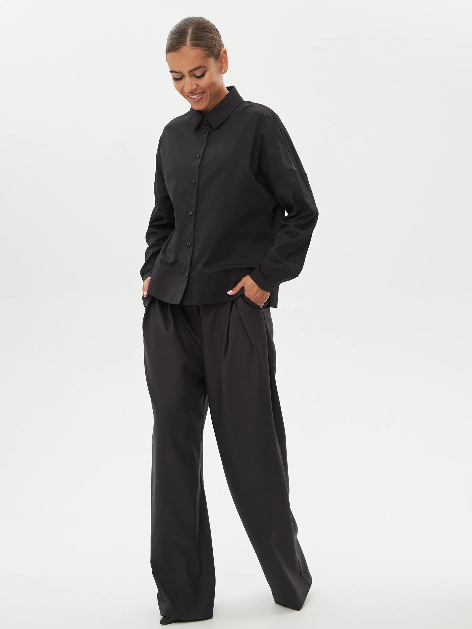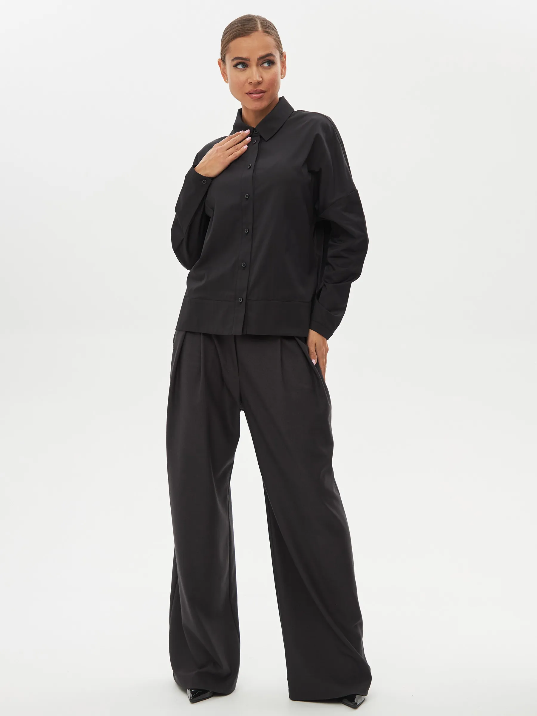 Женская блуза прямого кроя с удобной застежкой на шесть пуговиц по всей длине. Воротник-стойка имеет закругленные концы и застегивается на одну пуговицу, что добавляет аккуратный и элегантный акцент. Спущенные плечи создают расслабленный и современный силуэт, который хорошо смотрится в разных образах. Длинные рукава украшены складками и застегиваются на пуговицы, что обеспечивает практичность и комфорт в носке. По низу блузы расположены боковые разрезы, которые обеспечивают свободу движений и добавляют дополнительный стильный элемент.