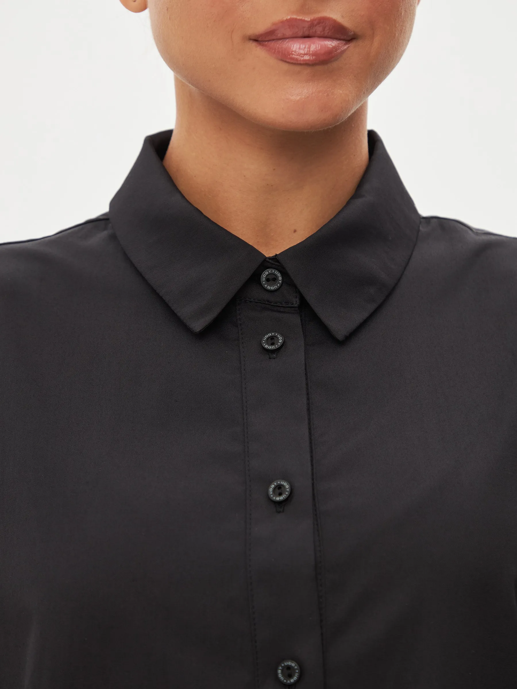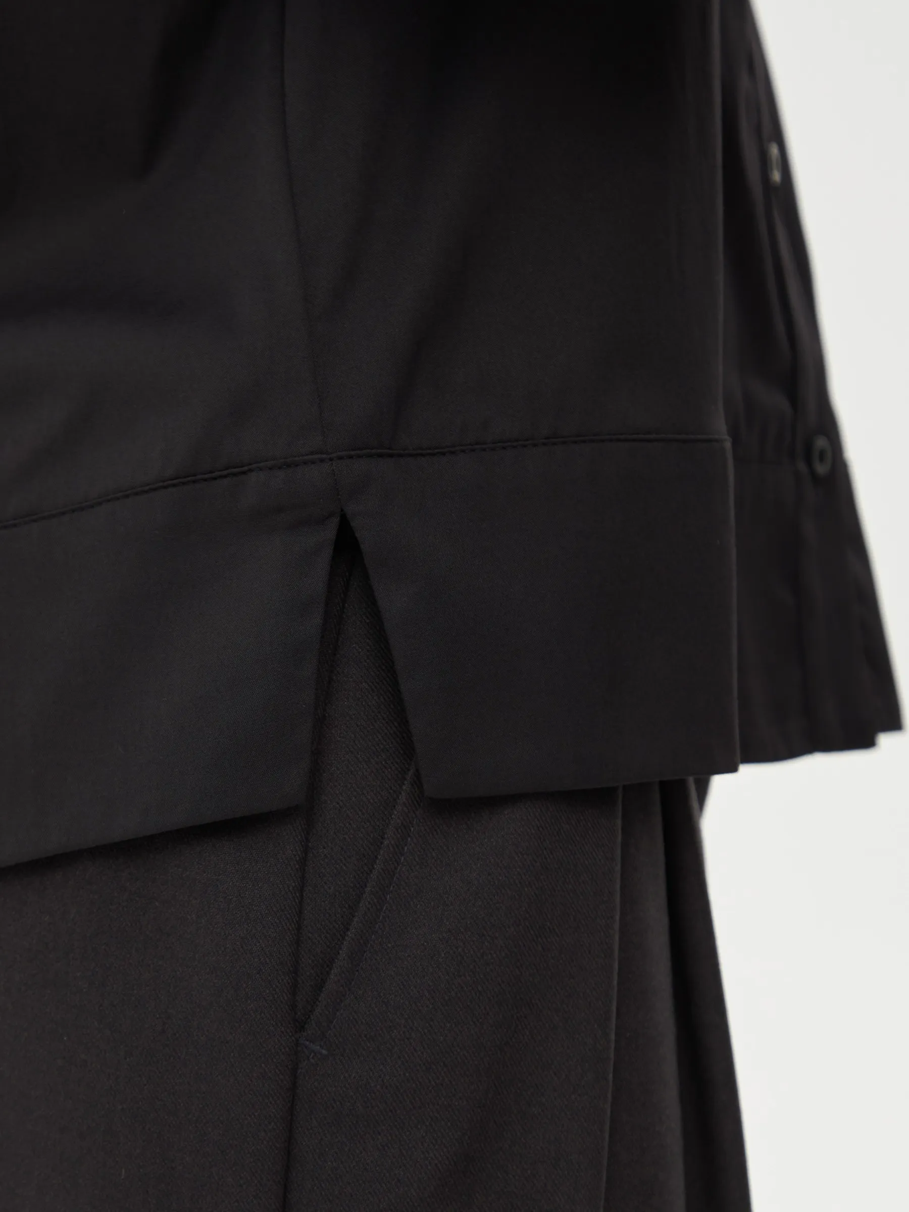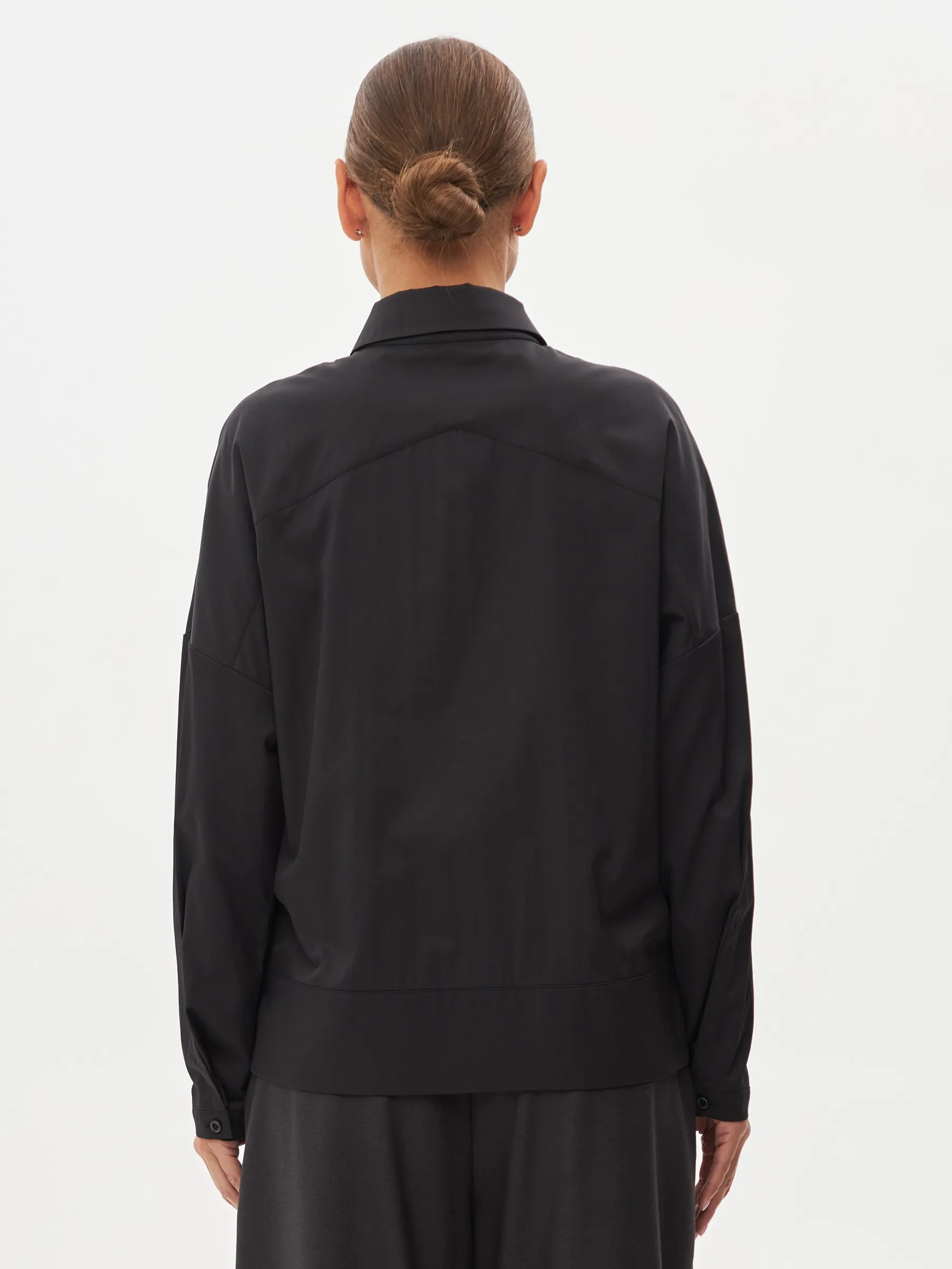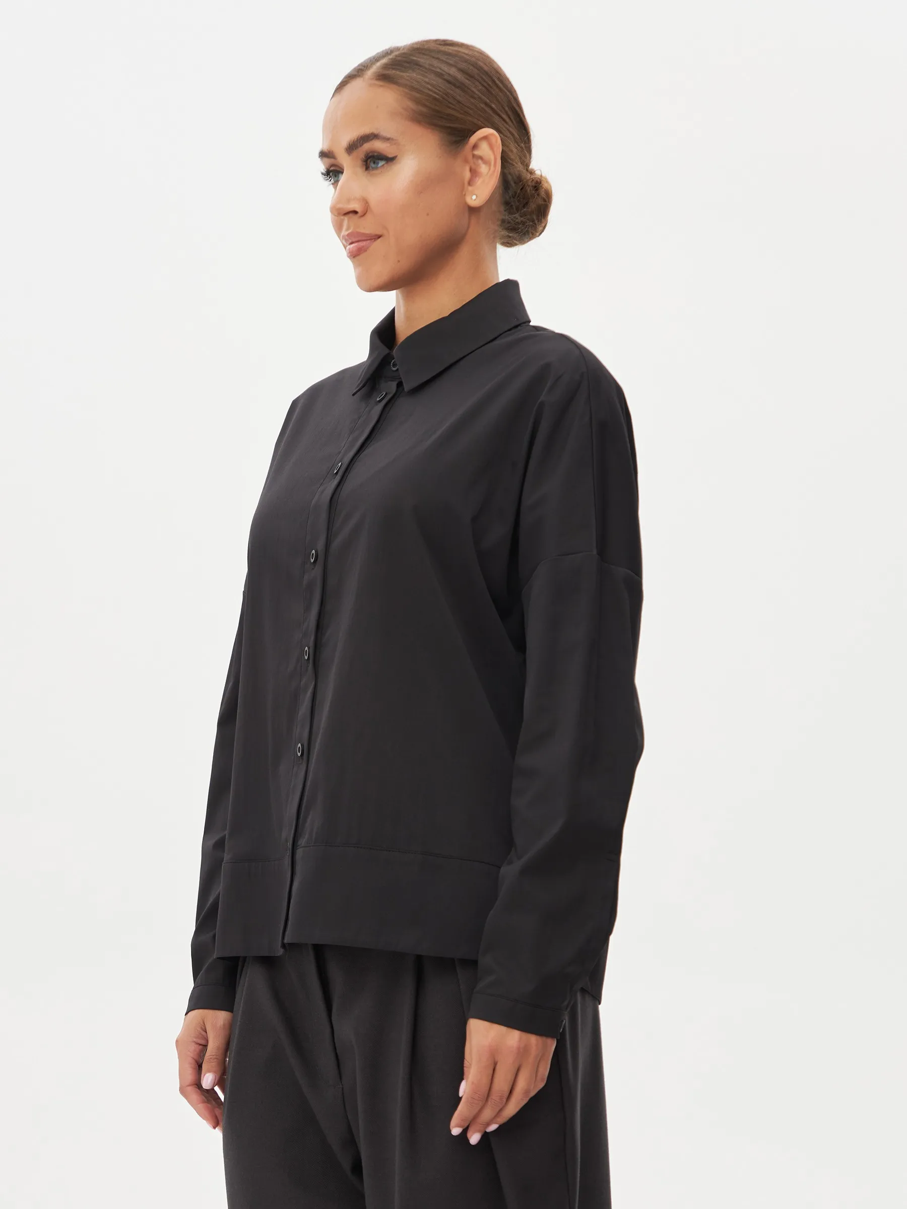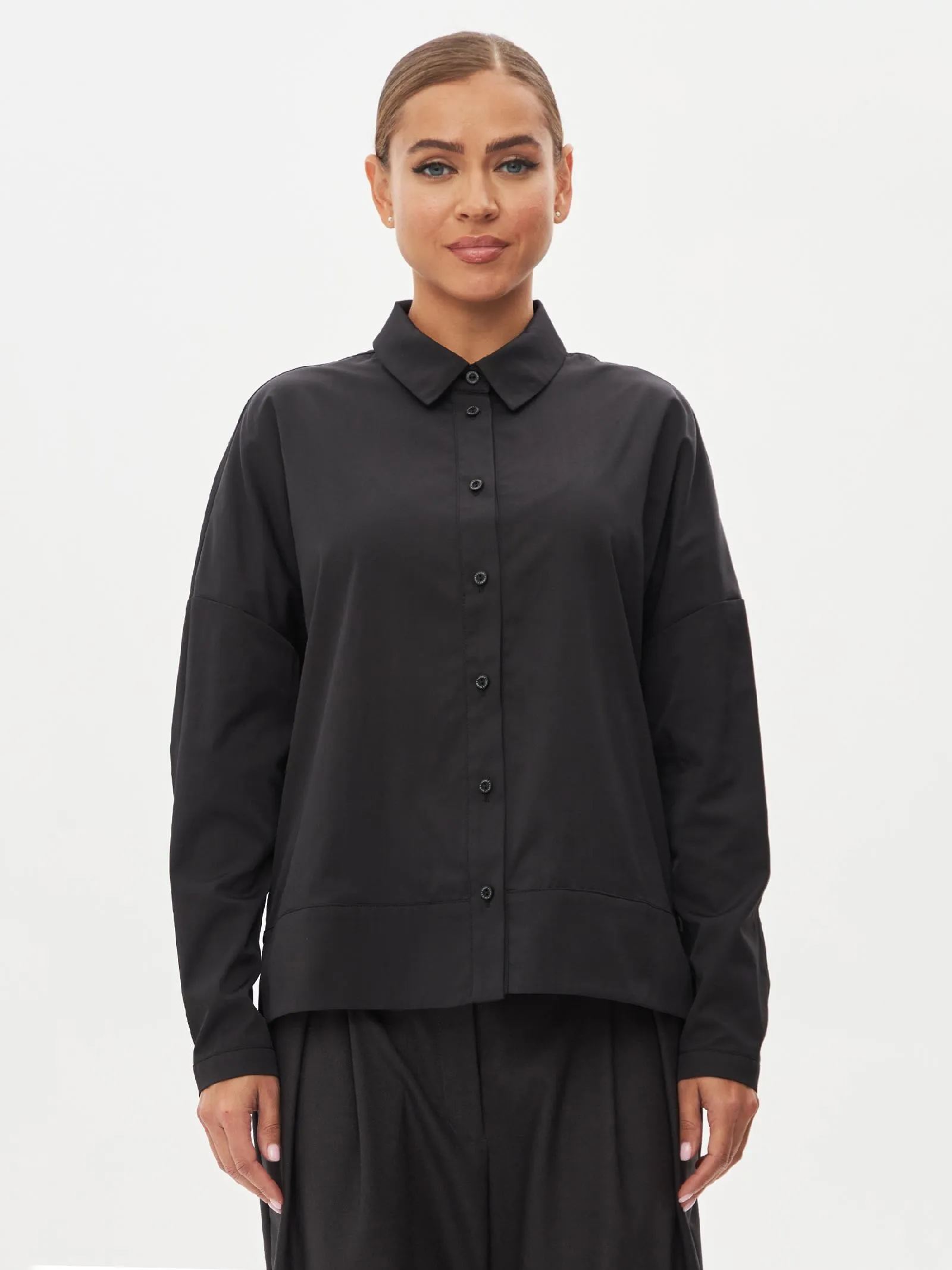 Женская блуза прямого кроя с удобной застежкой на шесть пуговиц по всей длине. Воротник-стойка имеет закругленные концы и застегивается на одну пуговицу, что добавляет аккуратный и элегантный акцент. Спущенные плечи создают расслабленный и современный силуэт, который хорошо смотрится в разных образах. Длинные рукава украшены складками и застегиваются на пуговицы, что обеспечивает практичность и комфорт в носке. По низу блузы расположены боковые разрезы, которые обеспечивают свободу движений и добавляют дополнительный стильный элемент.