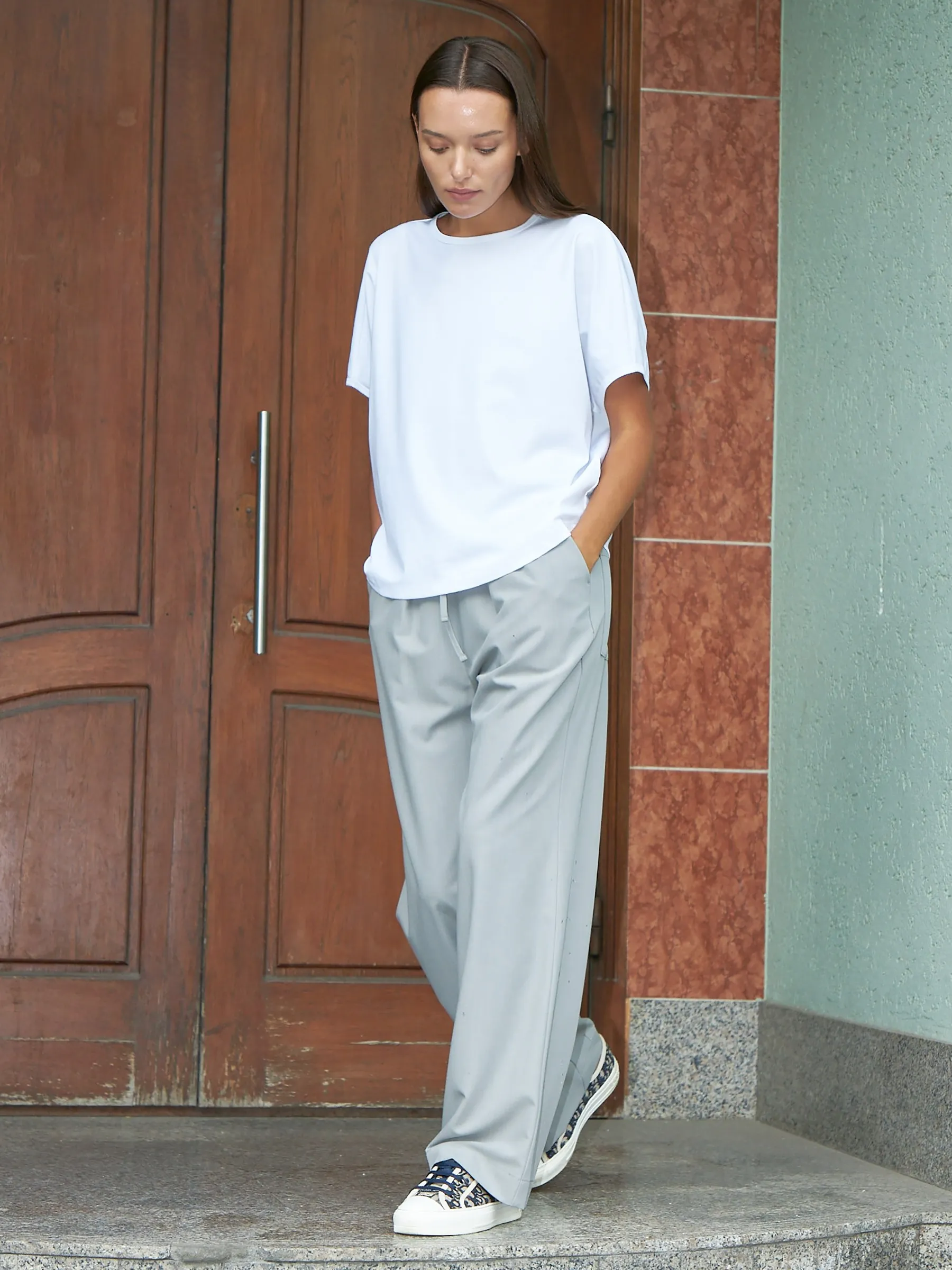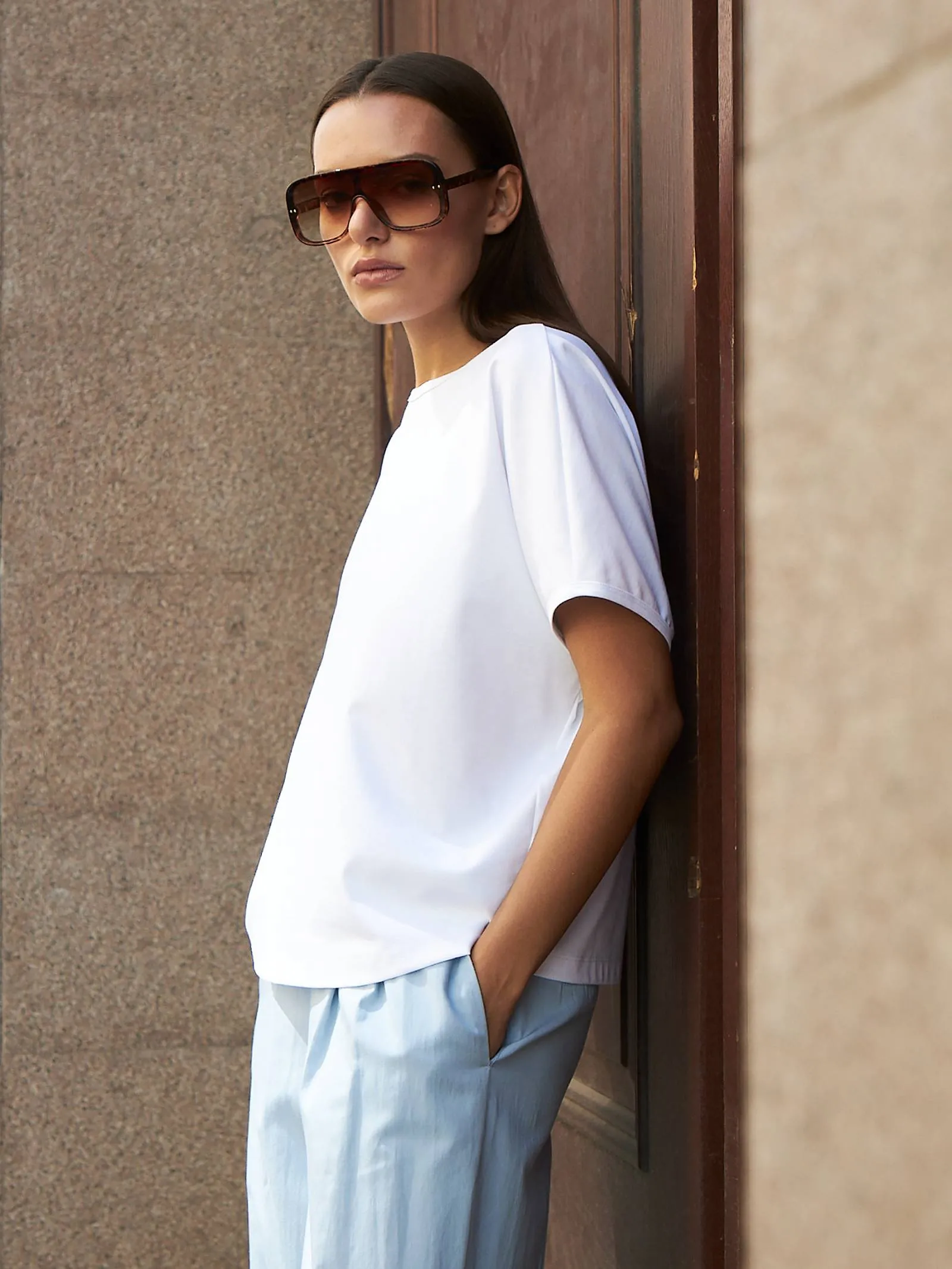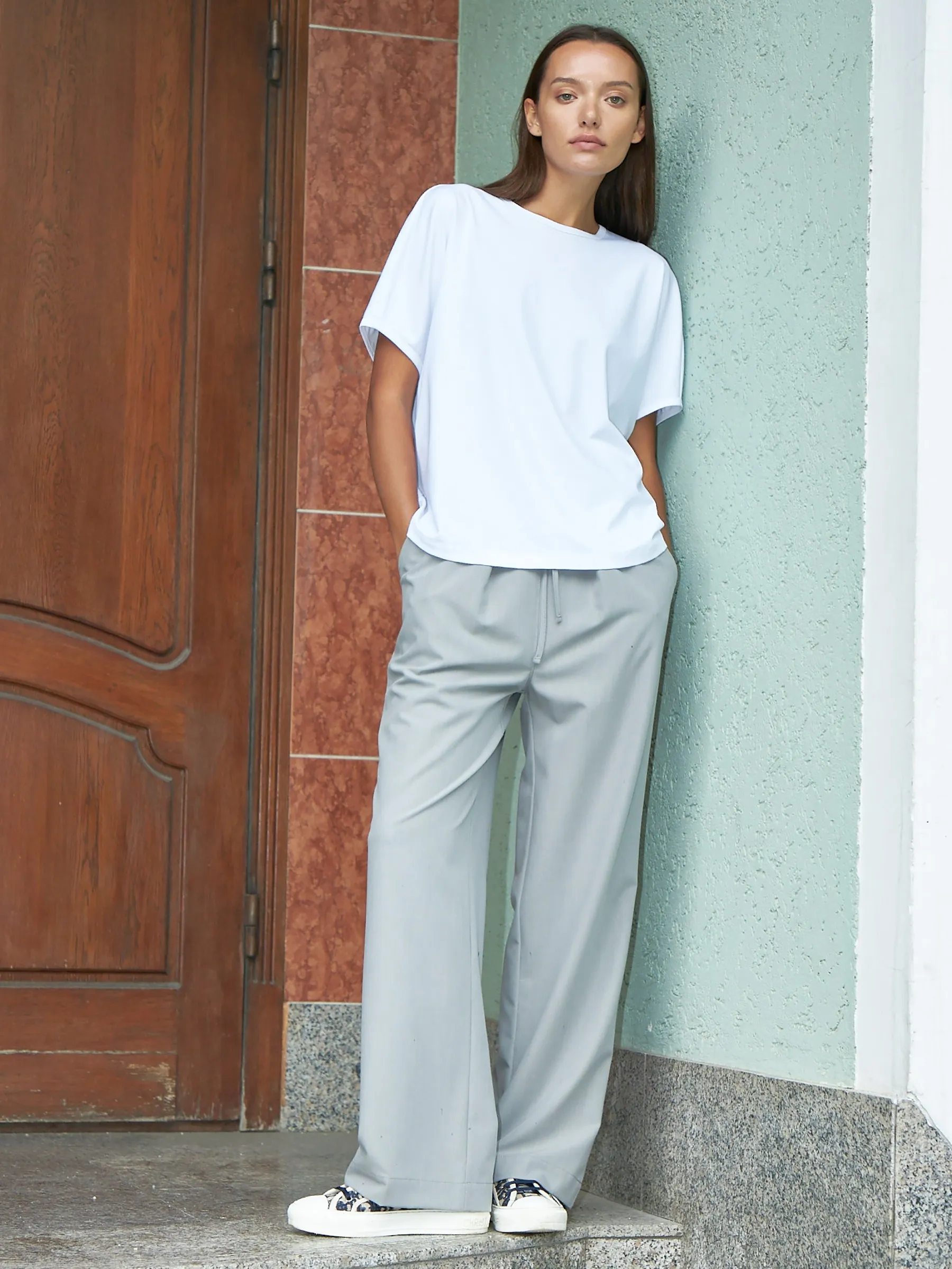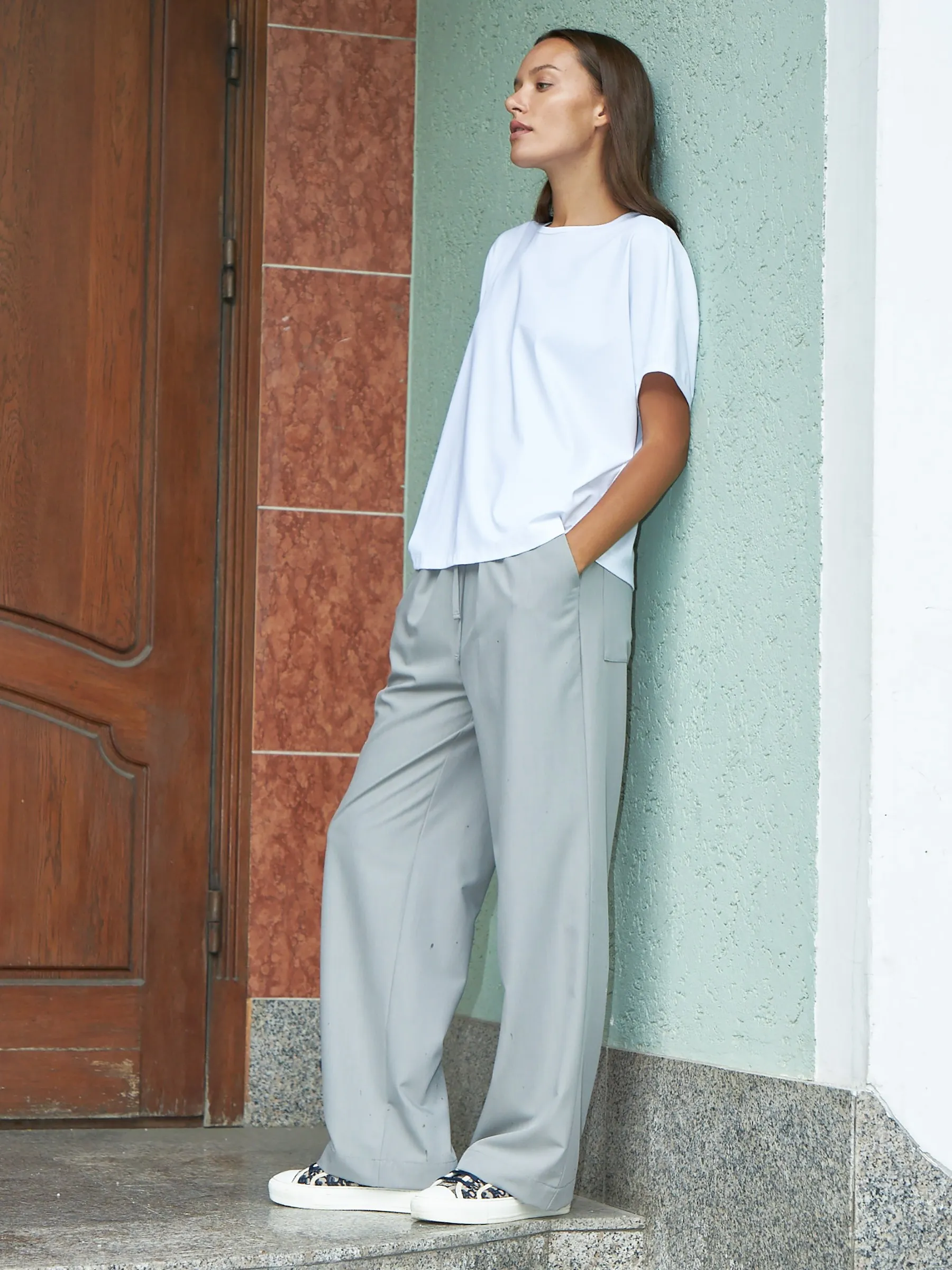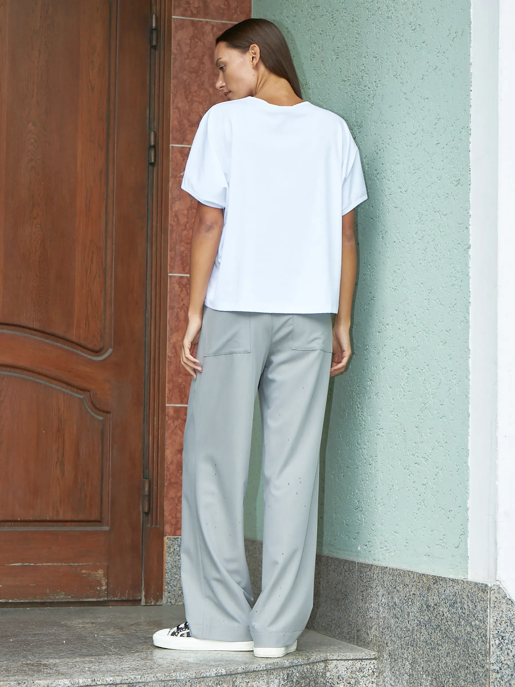 Трикотажная блуза свободного кроя с круглым вырезом и коротким рукавом. Модель выполнена из органического хлопка, практичного нейлона и тянущегося эластана. Блуза подойдет для создания повседневных образов в стиле кэжуал и современной классики в сочетании с базовым или ярким низом.