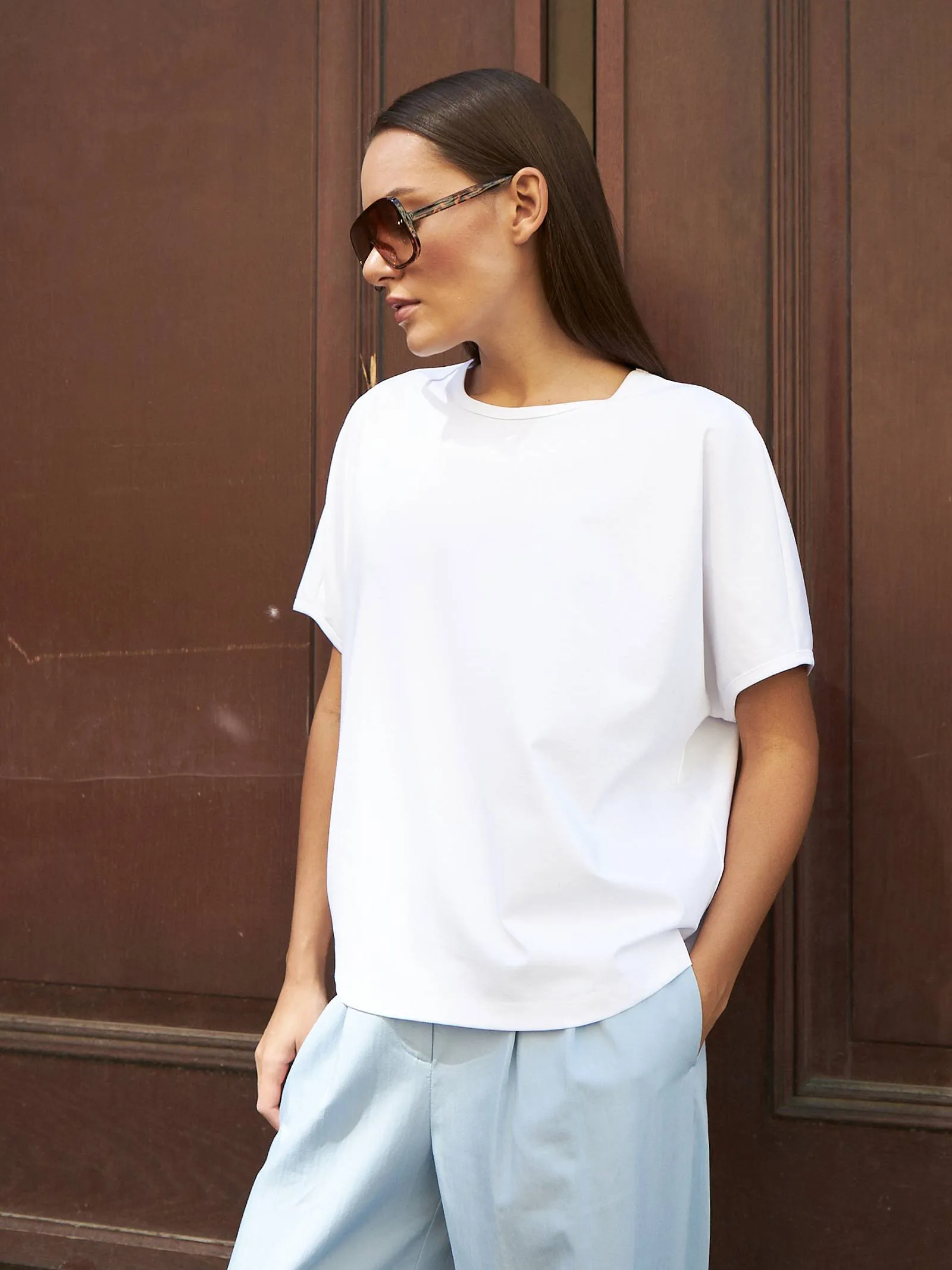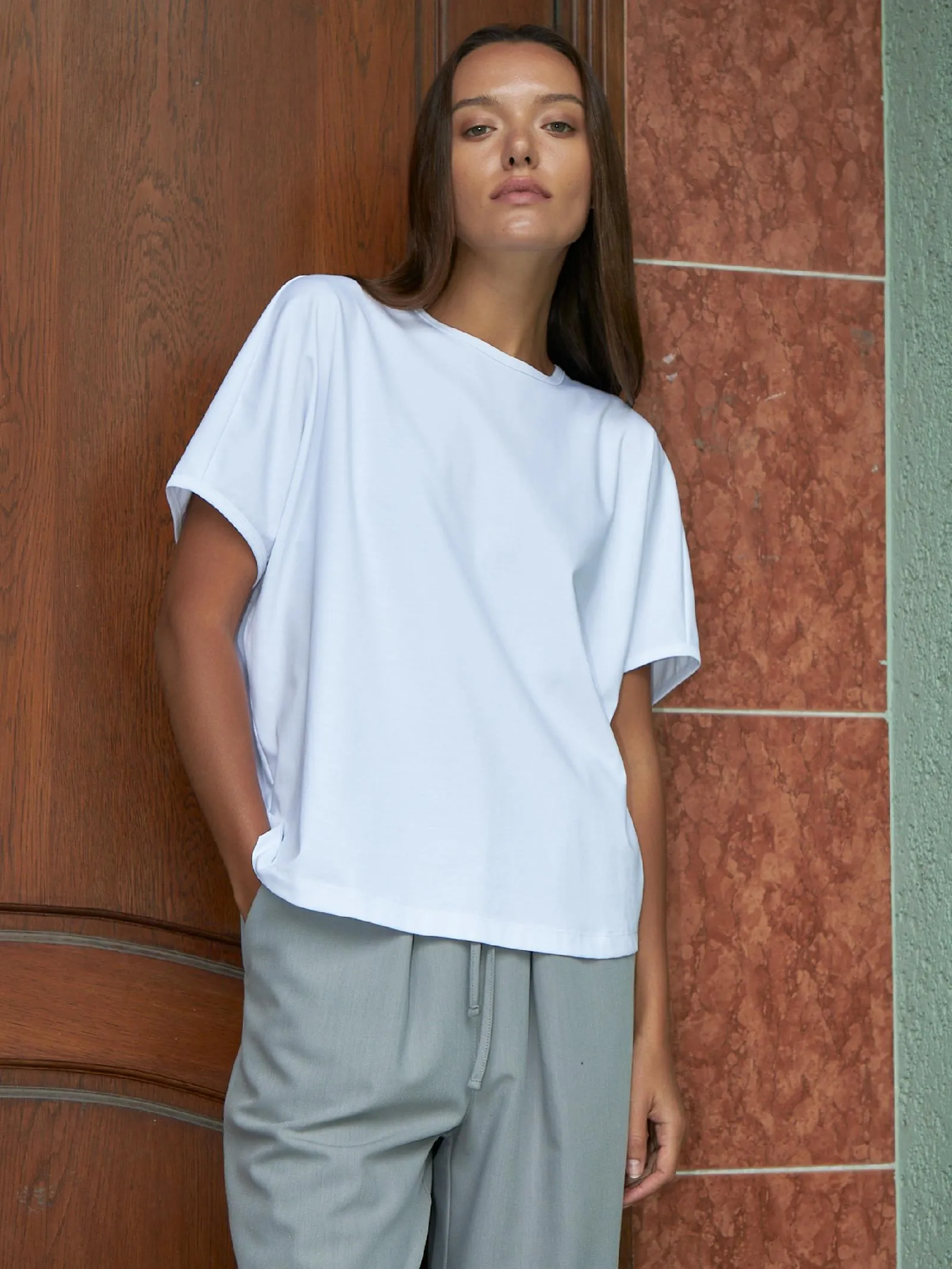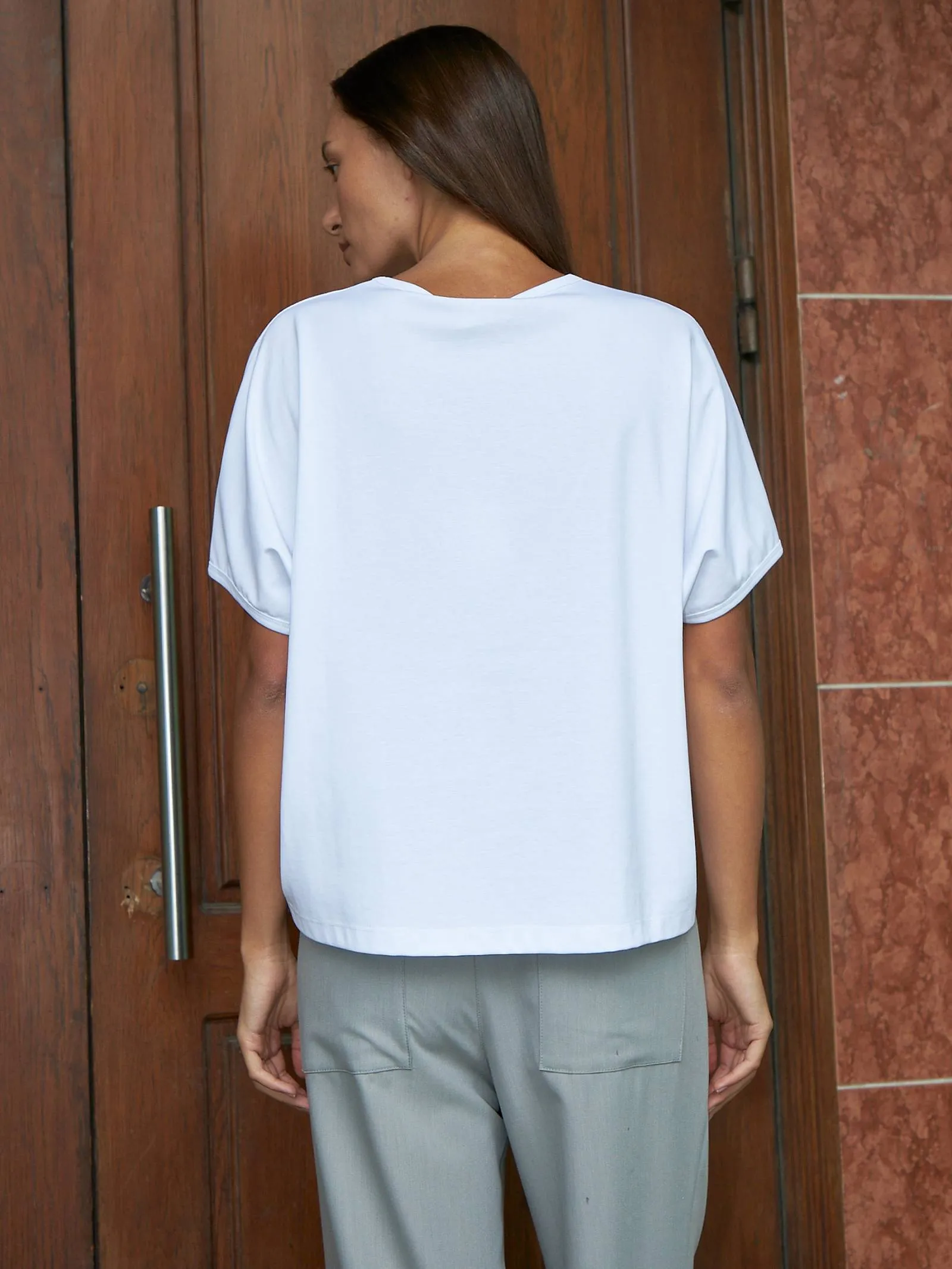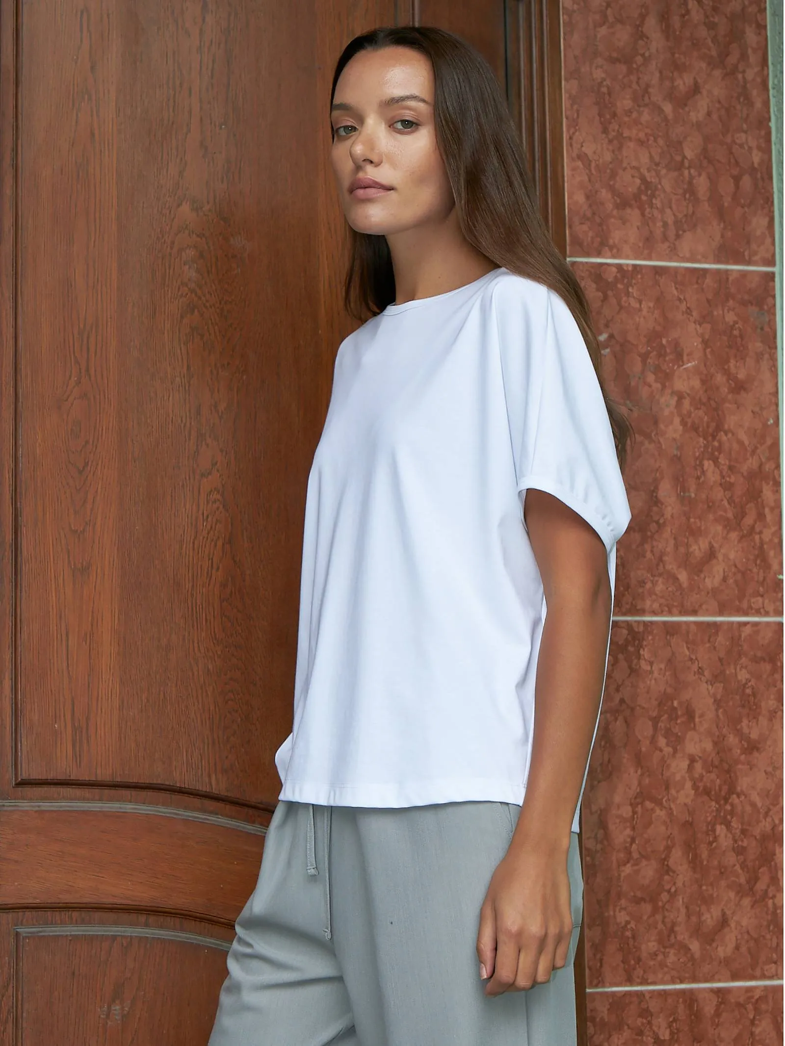 Трикотажная блуза свободного кроя с круглым вырезом и коротким рукавом. Модель выполнена из органического хлопка, практичного нейлона и тянущегося эластана. Блуза подойдет для создания повседневных образов в стиле кэжуал и современной классики в сочетании с базовым или ярким низом.