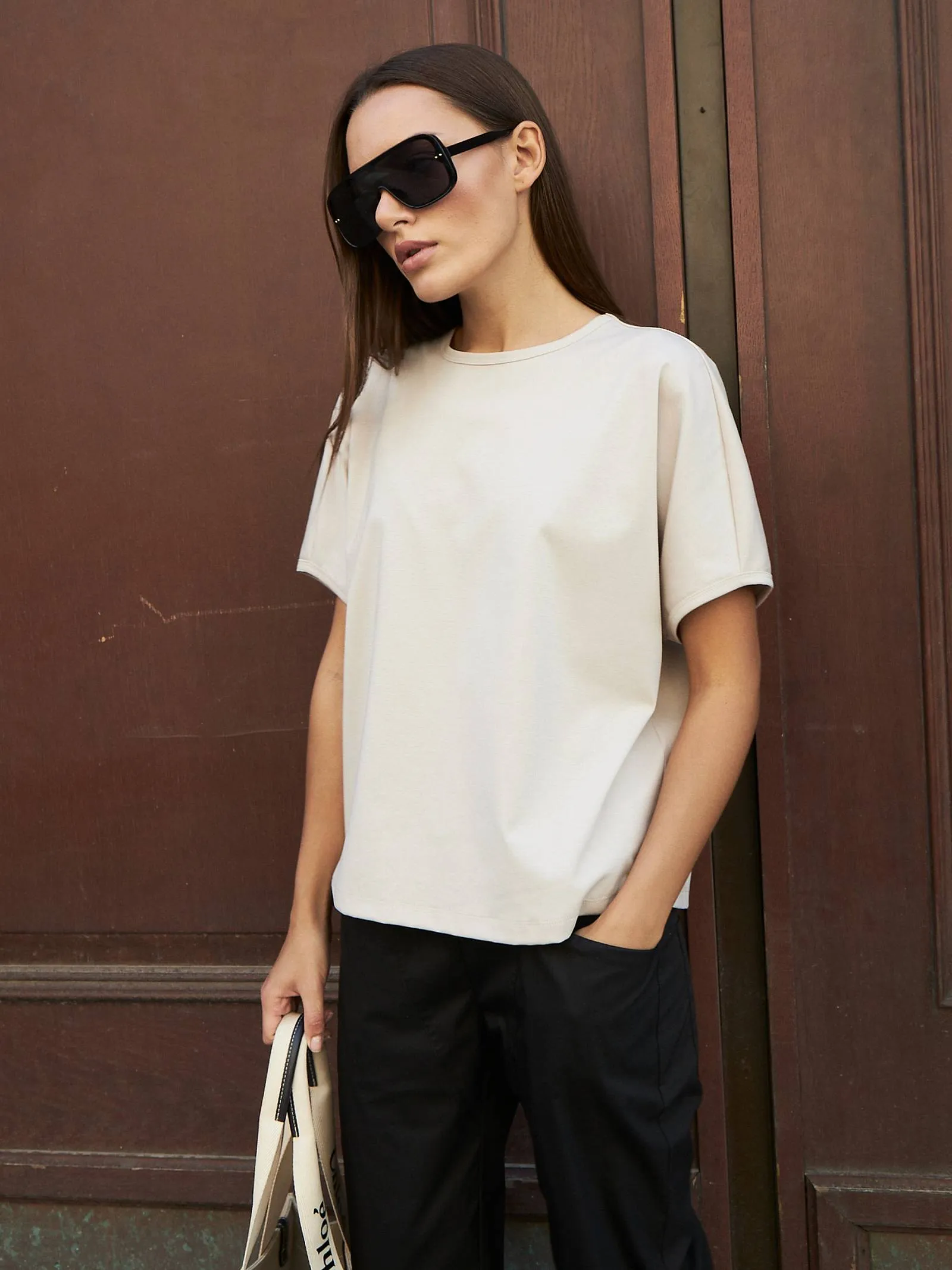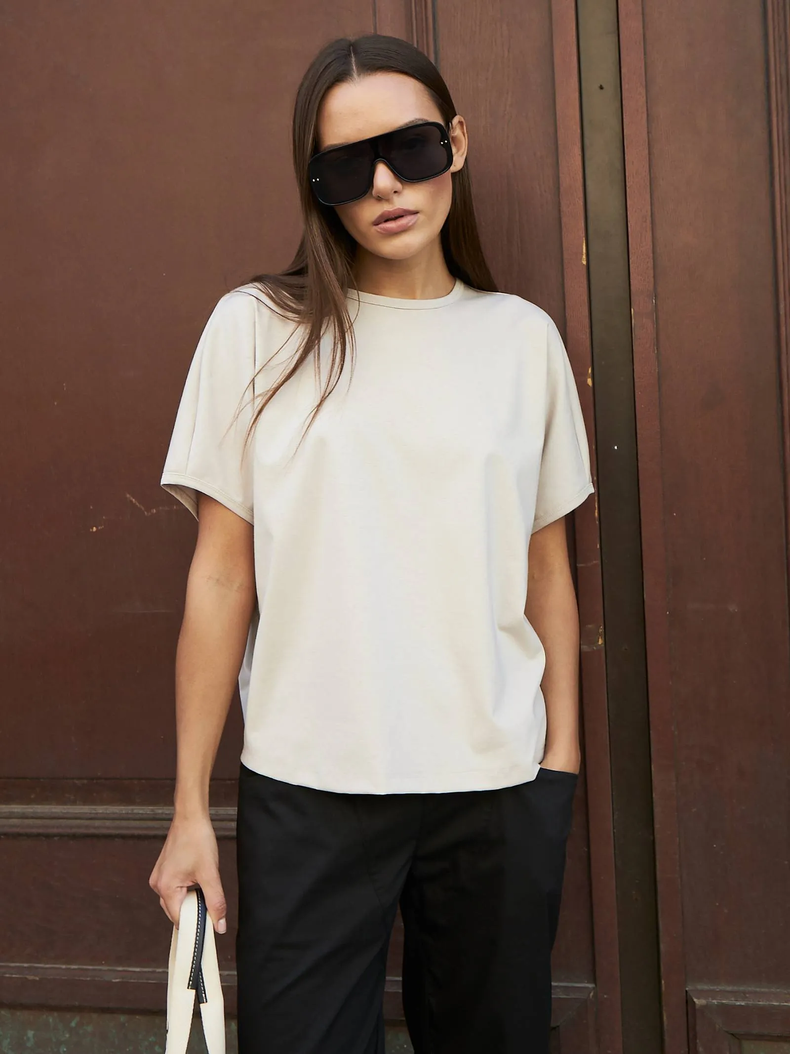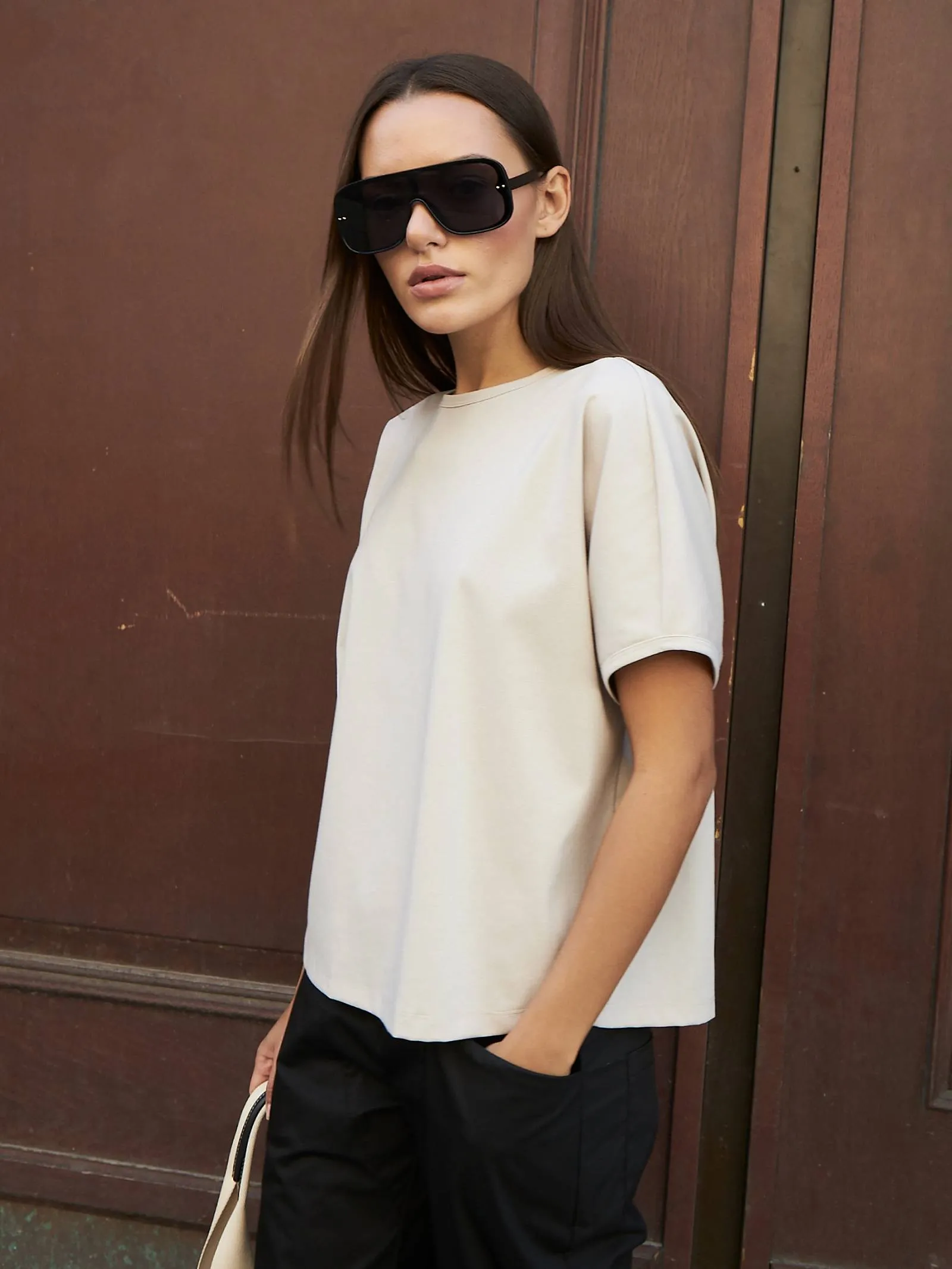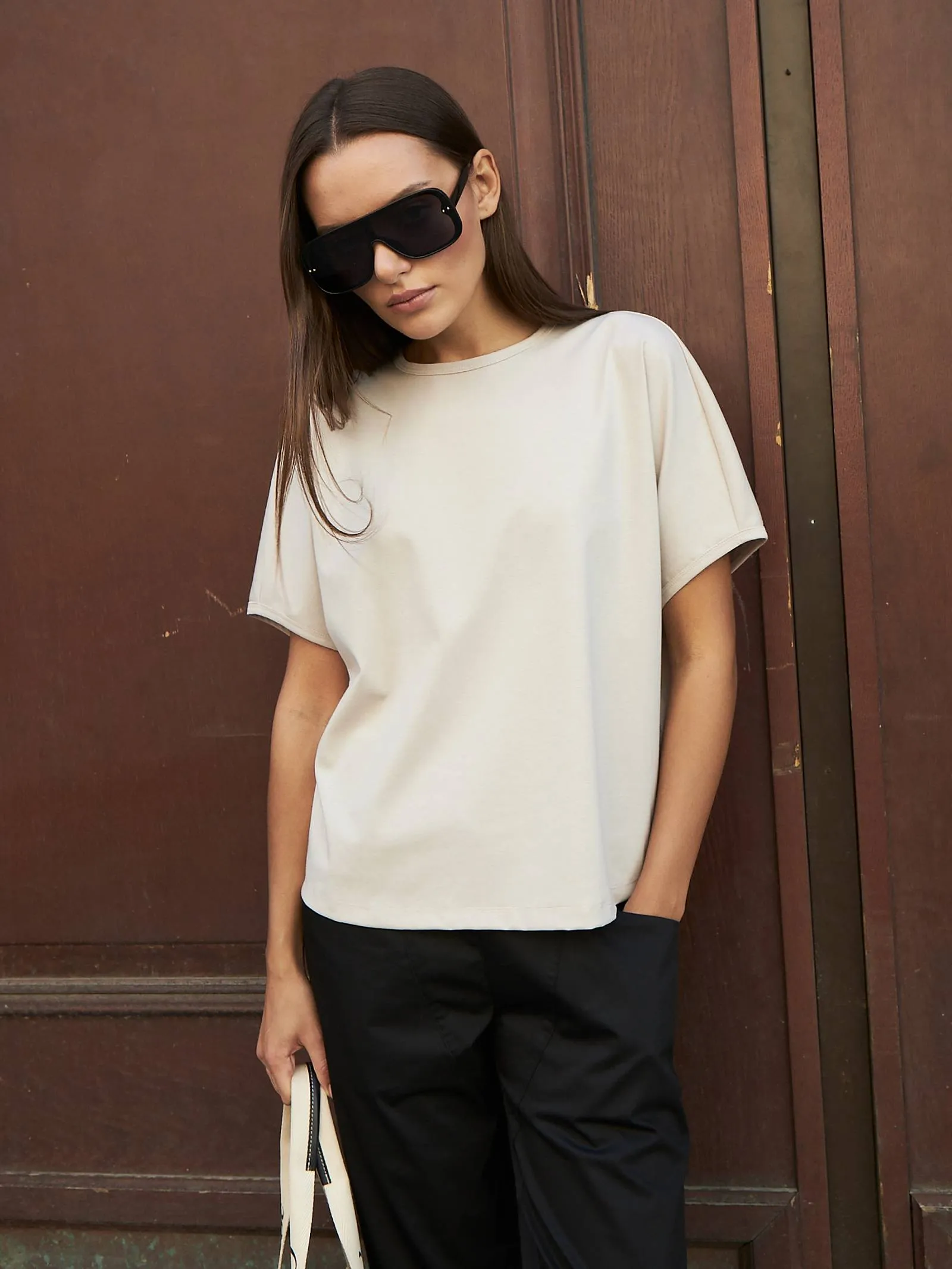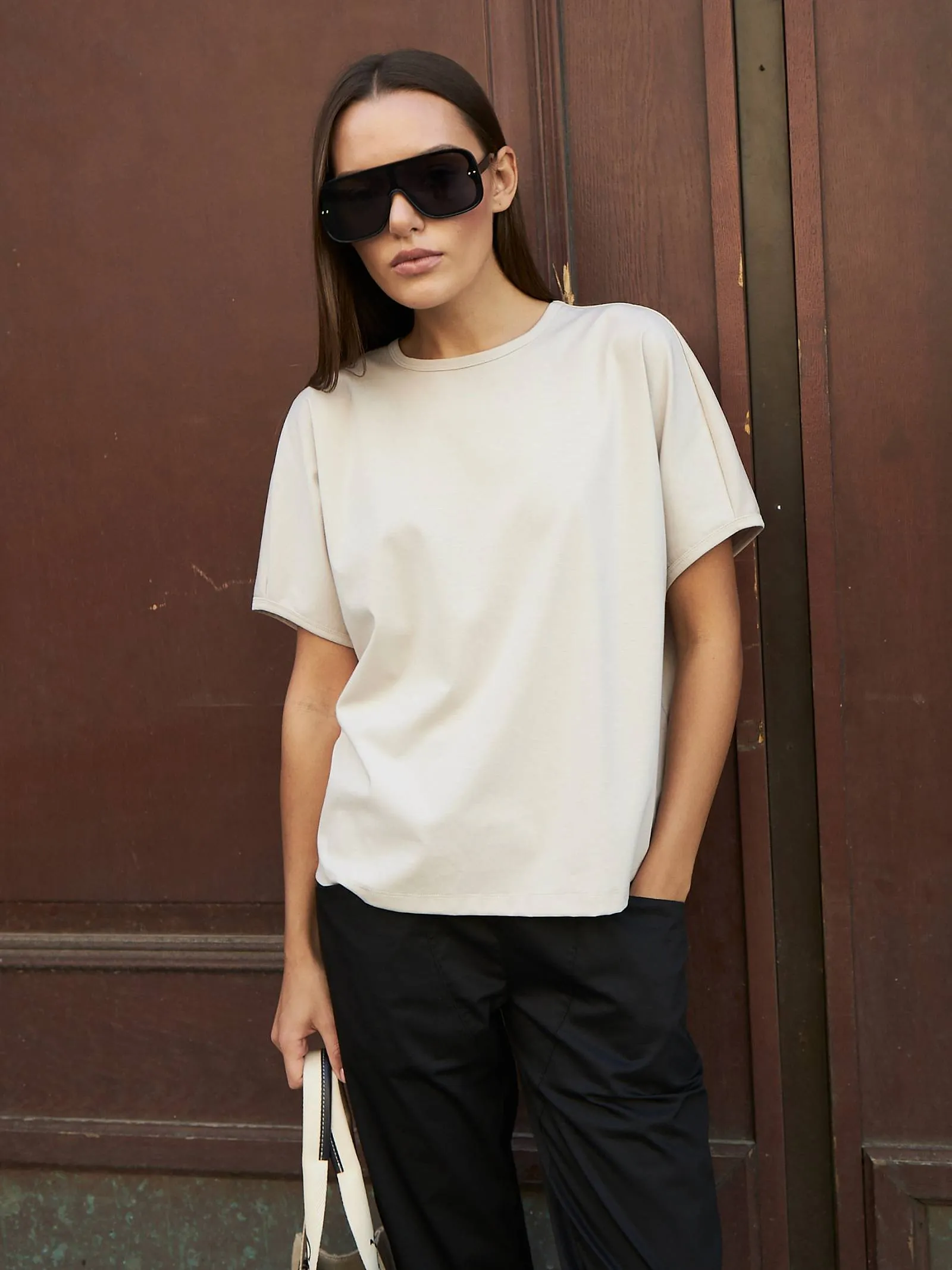 Трикотажная блуза свободного кроя с круглым вырезом и коротким рукавом. Модель выполнена из органического хлопка, практичного нейлона и тянущегося эластана. Блуза подойдет для создания повседневных образов в стиле кэжуал и современной классики в сочетании с базовым или ярким низом.