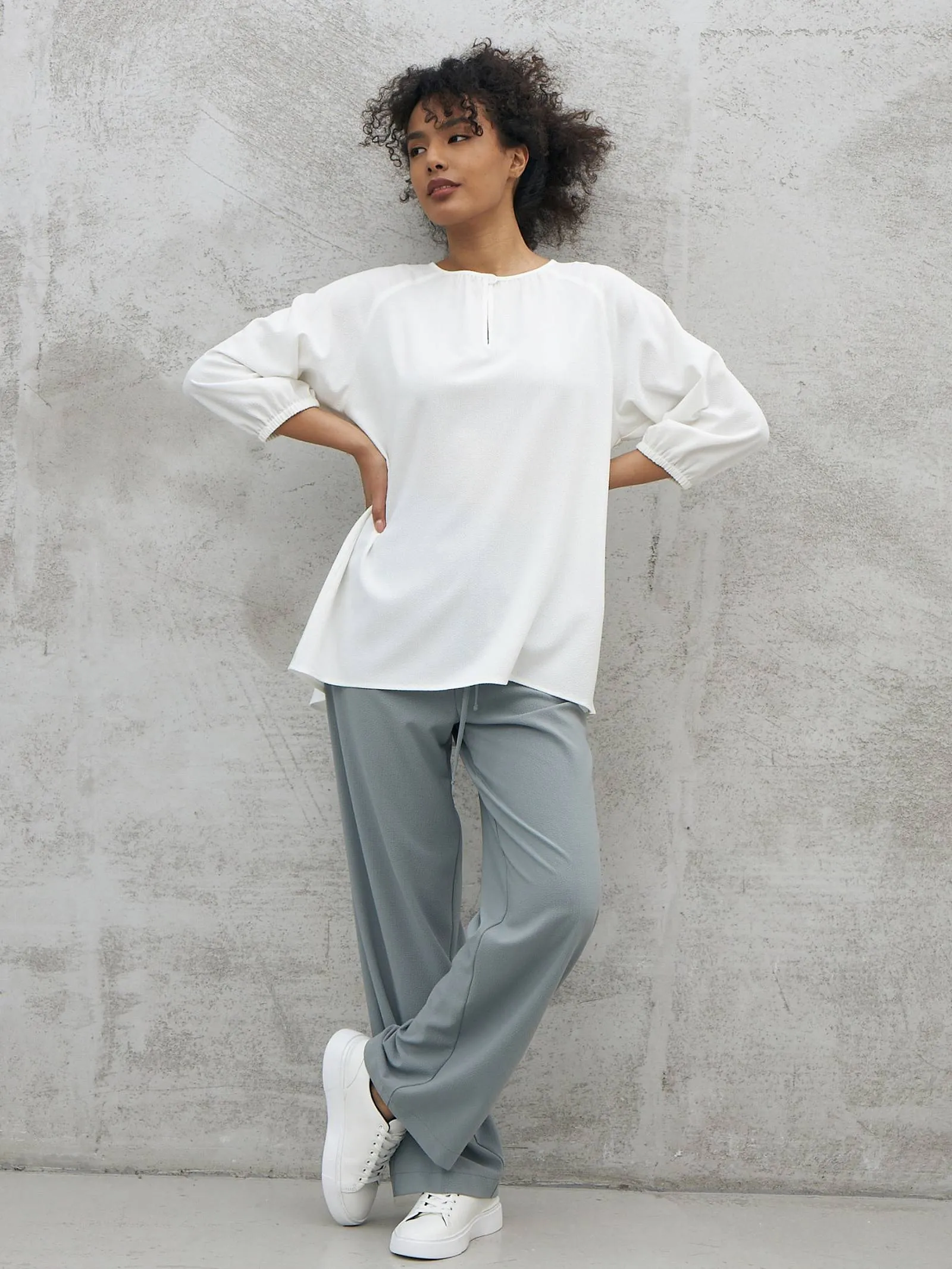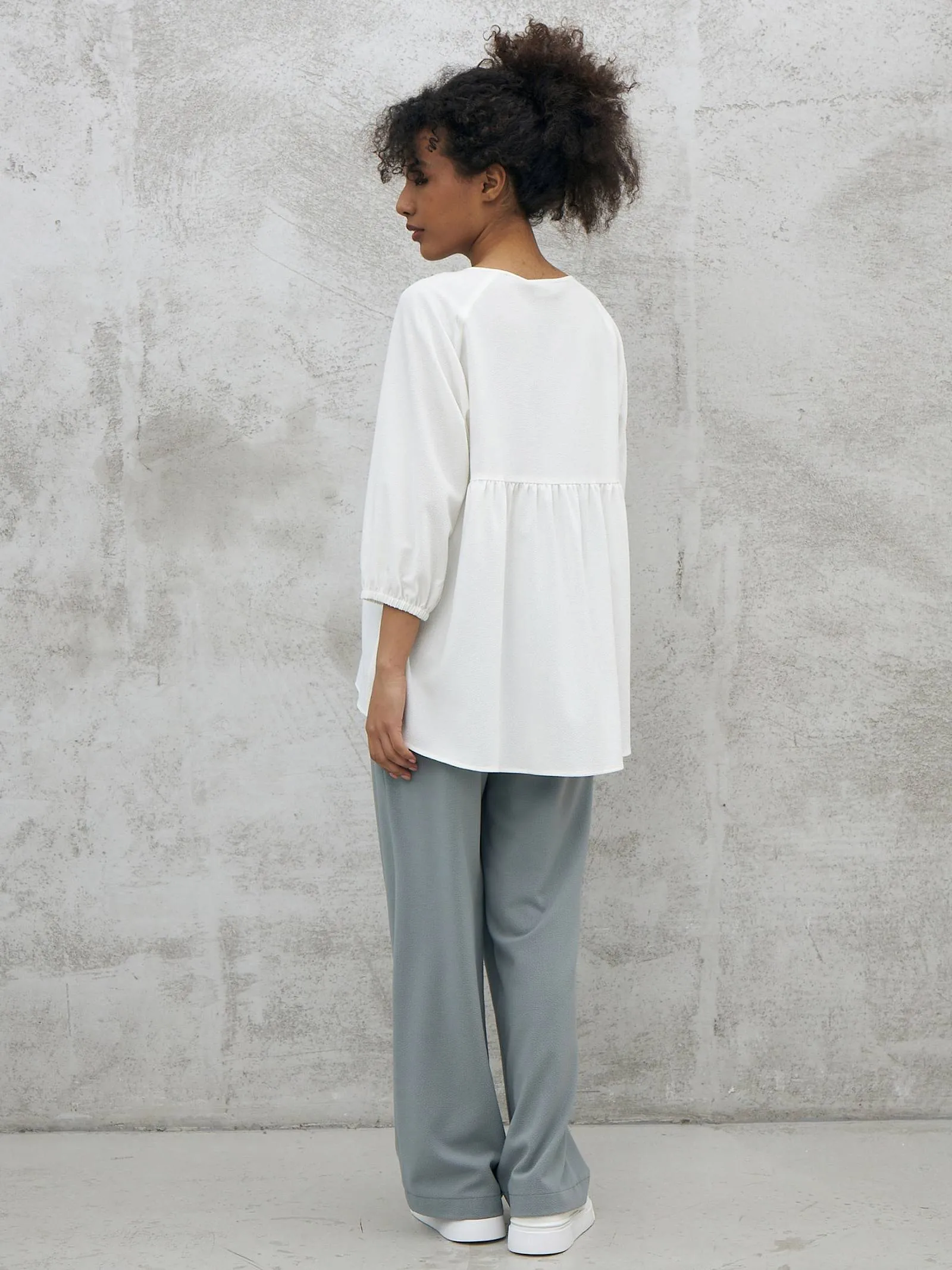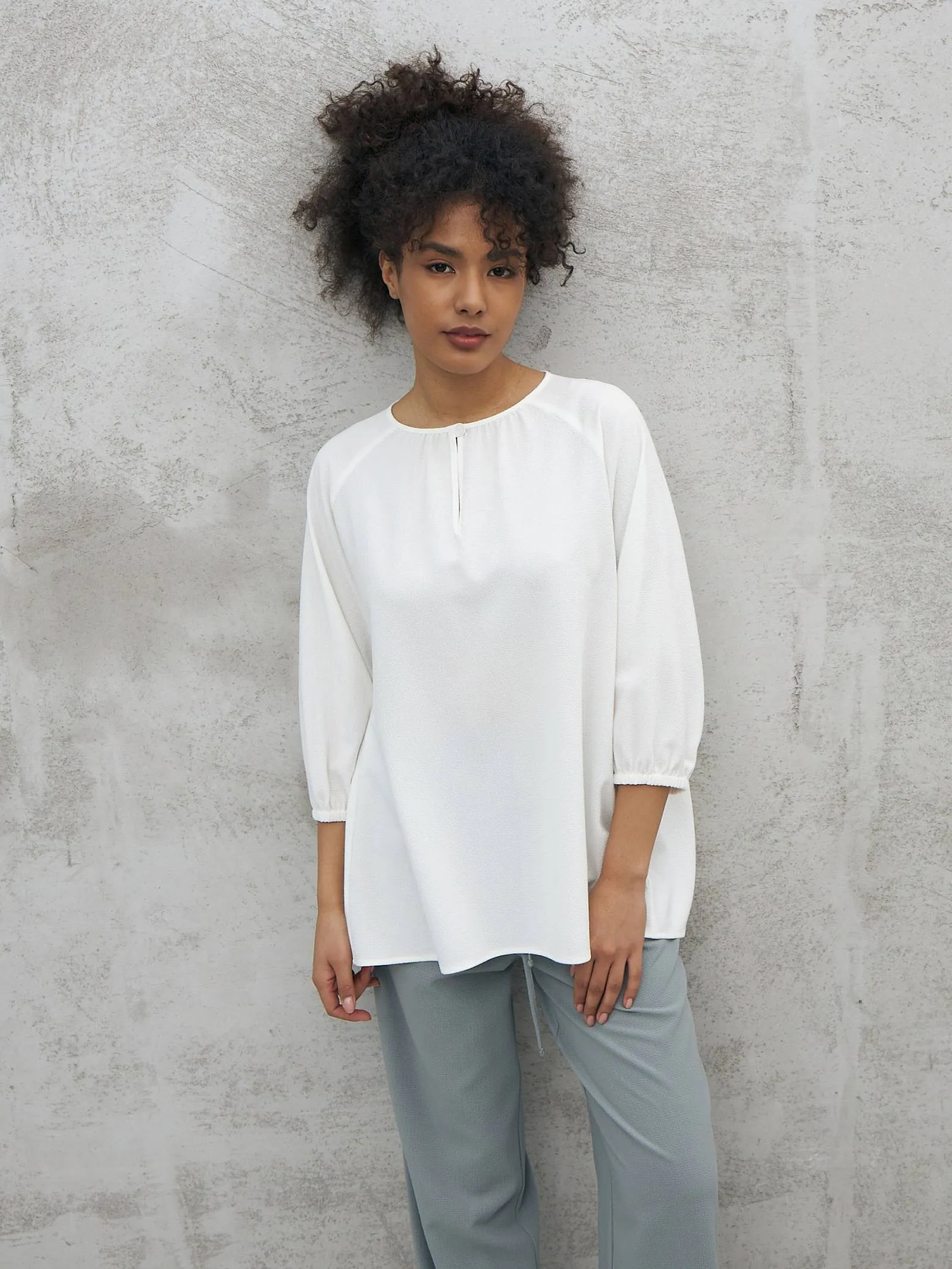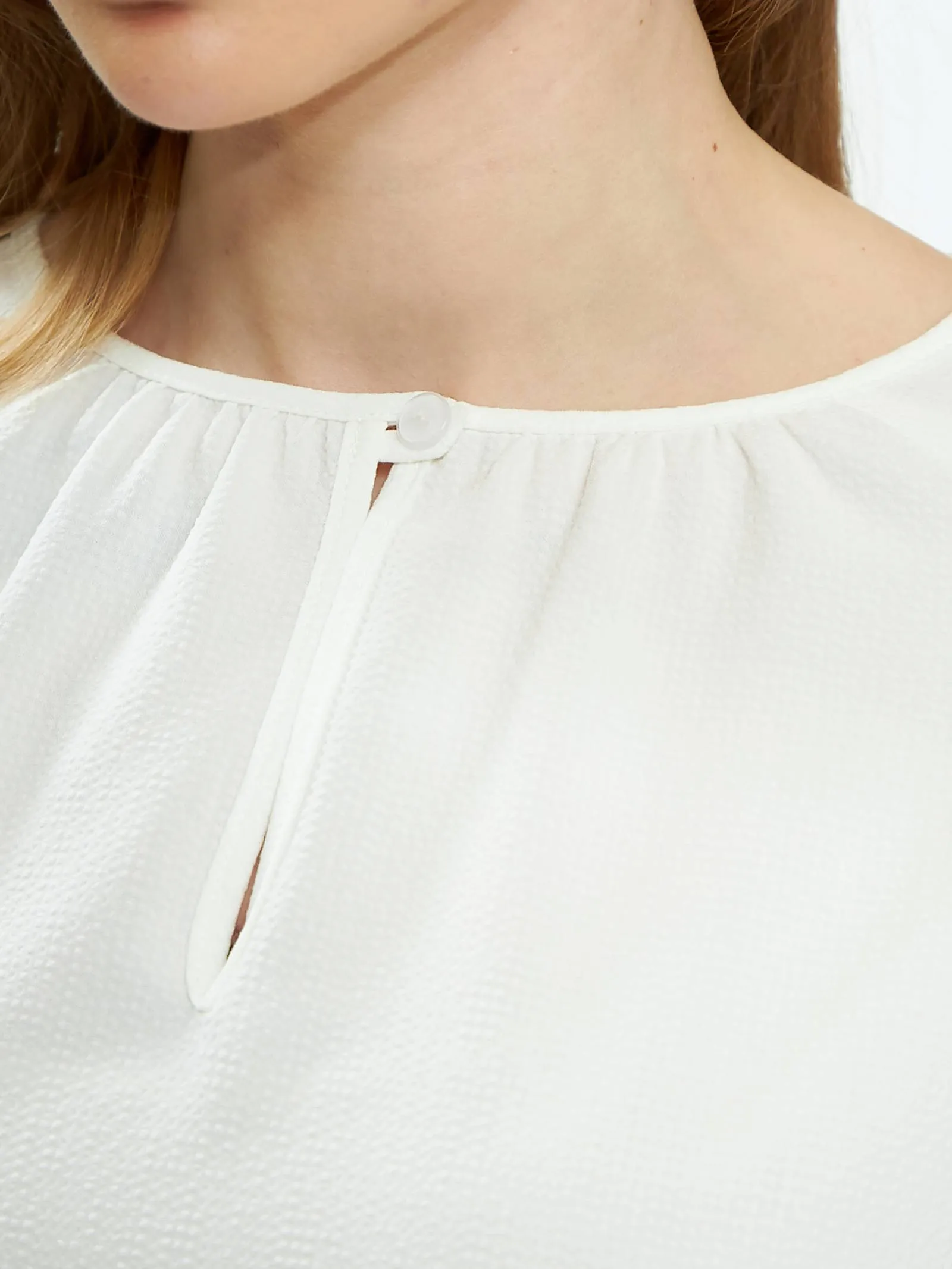 Элегантная блуза с декоративной пуговицей спереди, лёгкими складками, струящейся спинкой и укороченными рукавами на манжетах-резинках. Модель выполнена из прочного полиэстера, нежной вискозы и тянущегося эластана в лаконичном белом цвете. Подойдет для создания деловых сочетаний и образов в стиле кэжуал.