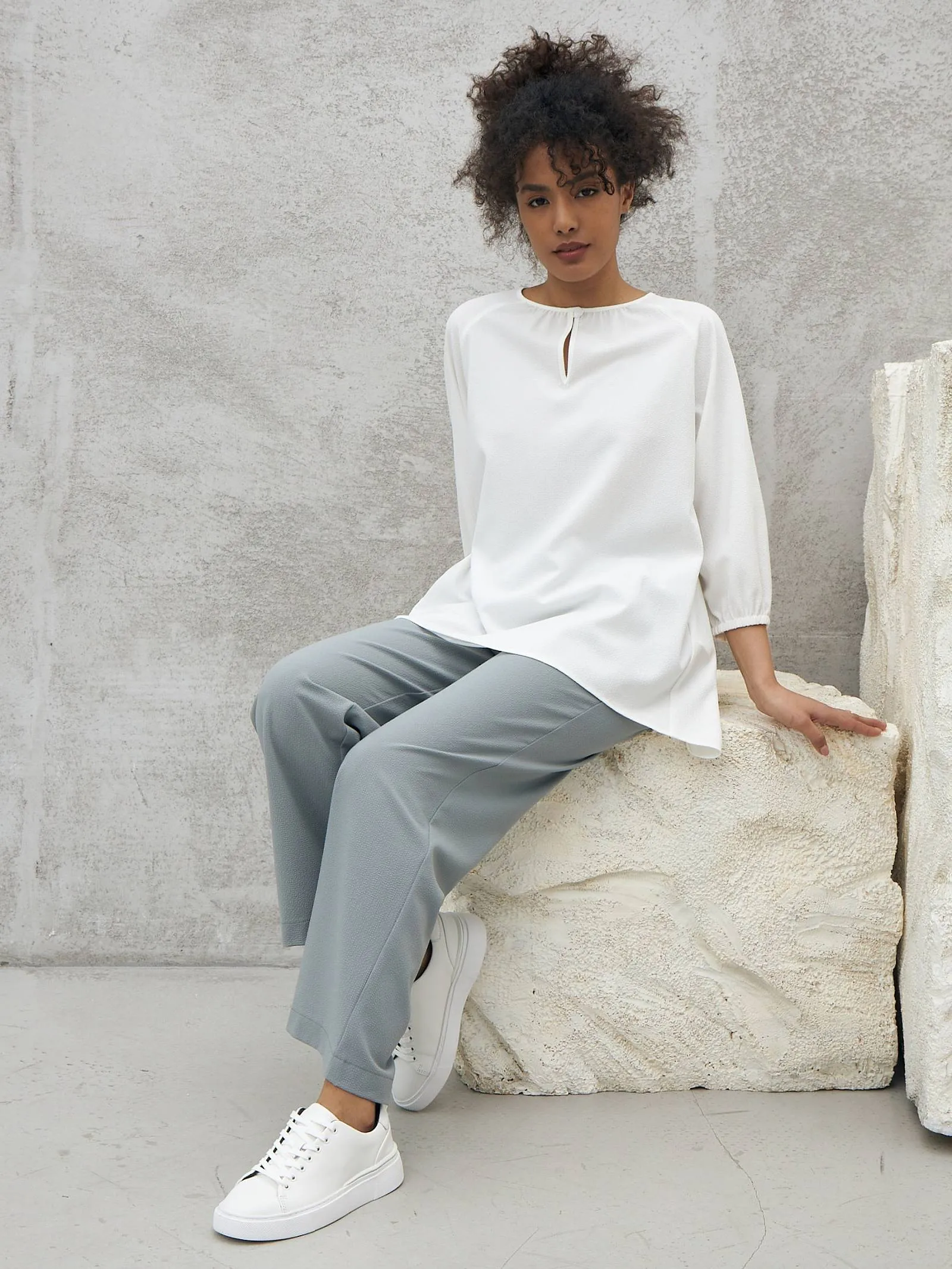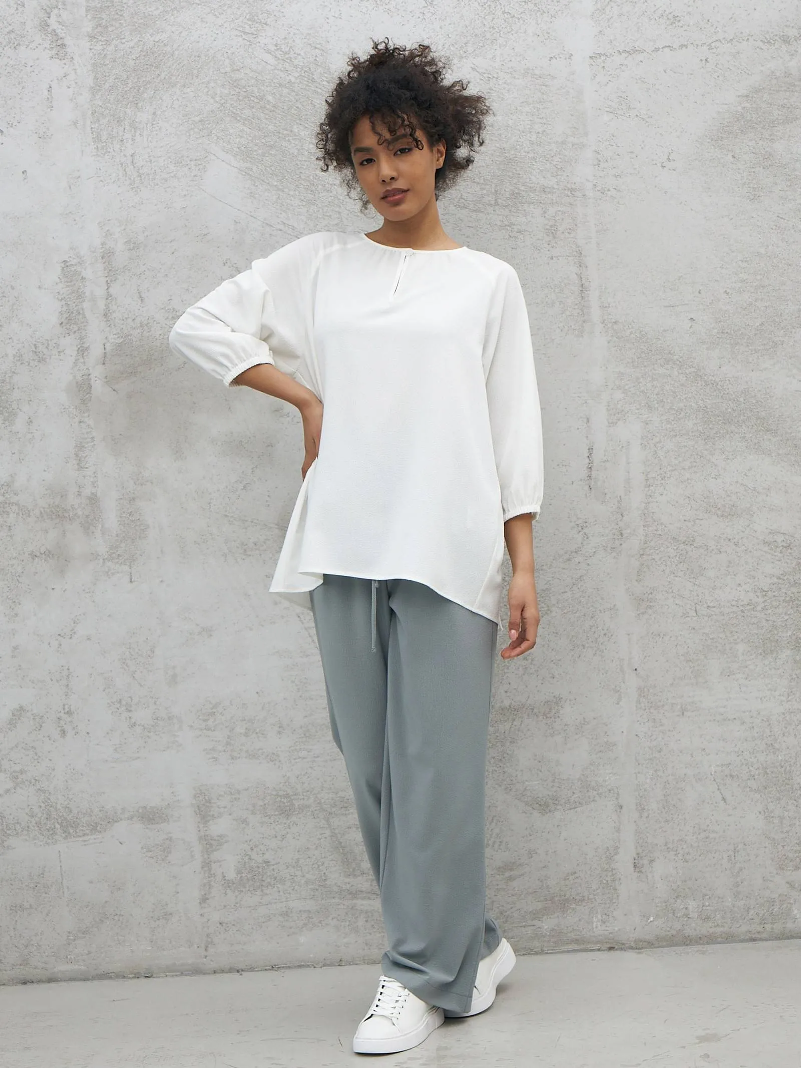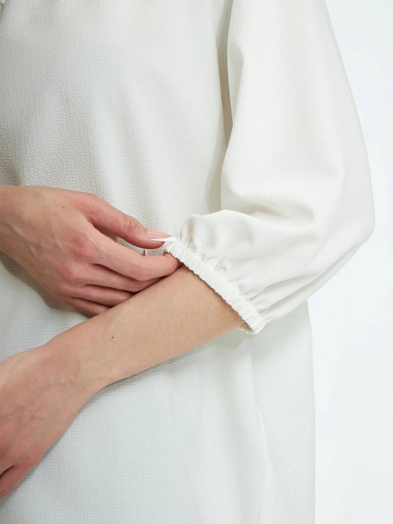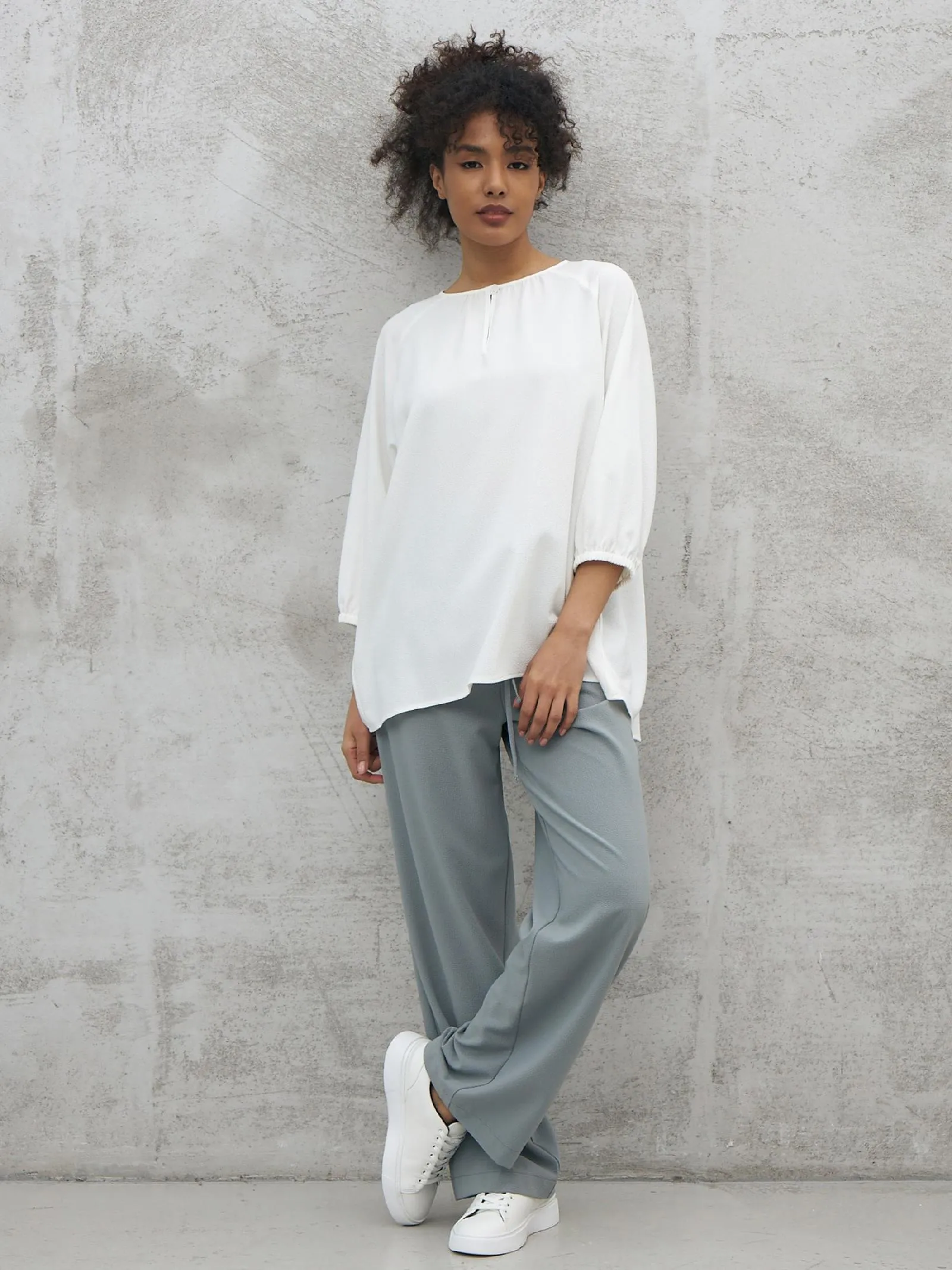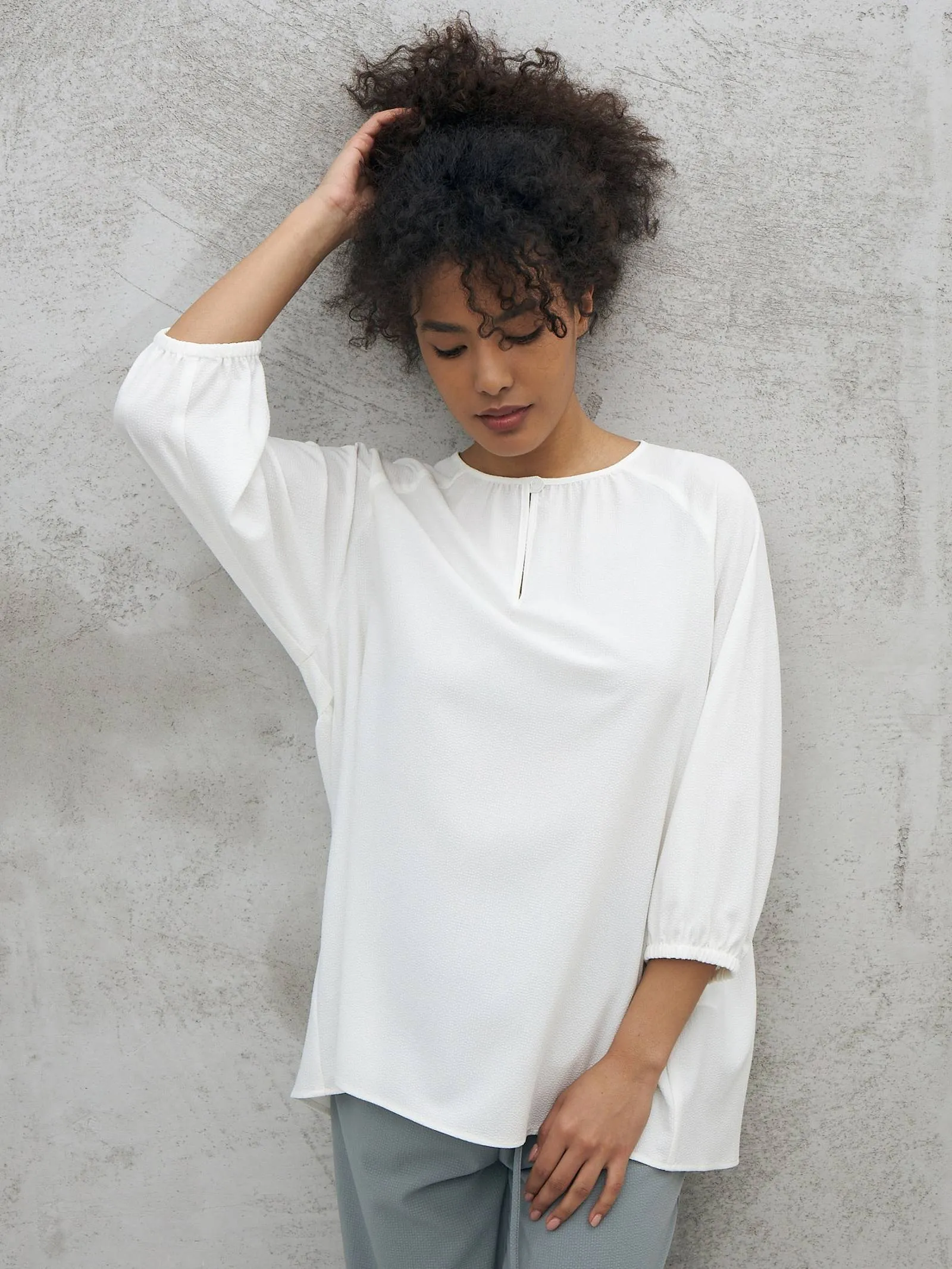 Элегантная блуза с декоративной пуговицей спереди, лёгкими складками, струящейся спинкой и укороченными рукавами на манжетах-резинках. Модель выполнена из прочного полиэстера, нежной вискозы и тянущегося эластана в лаконичном белом цвете. Подойдет для создания деловых сочетаний и образов в стиле кэжуал.