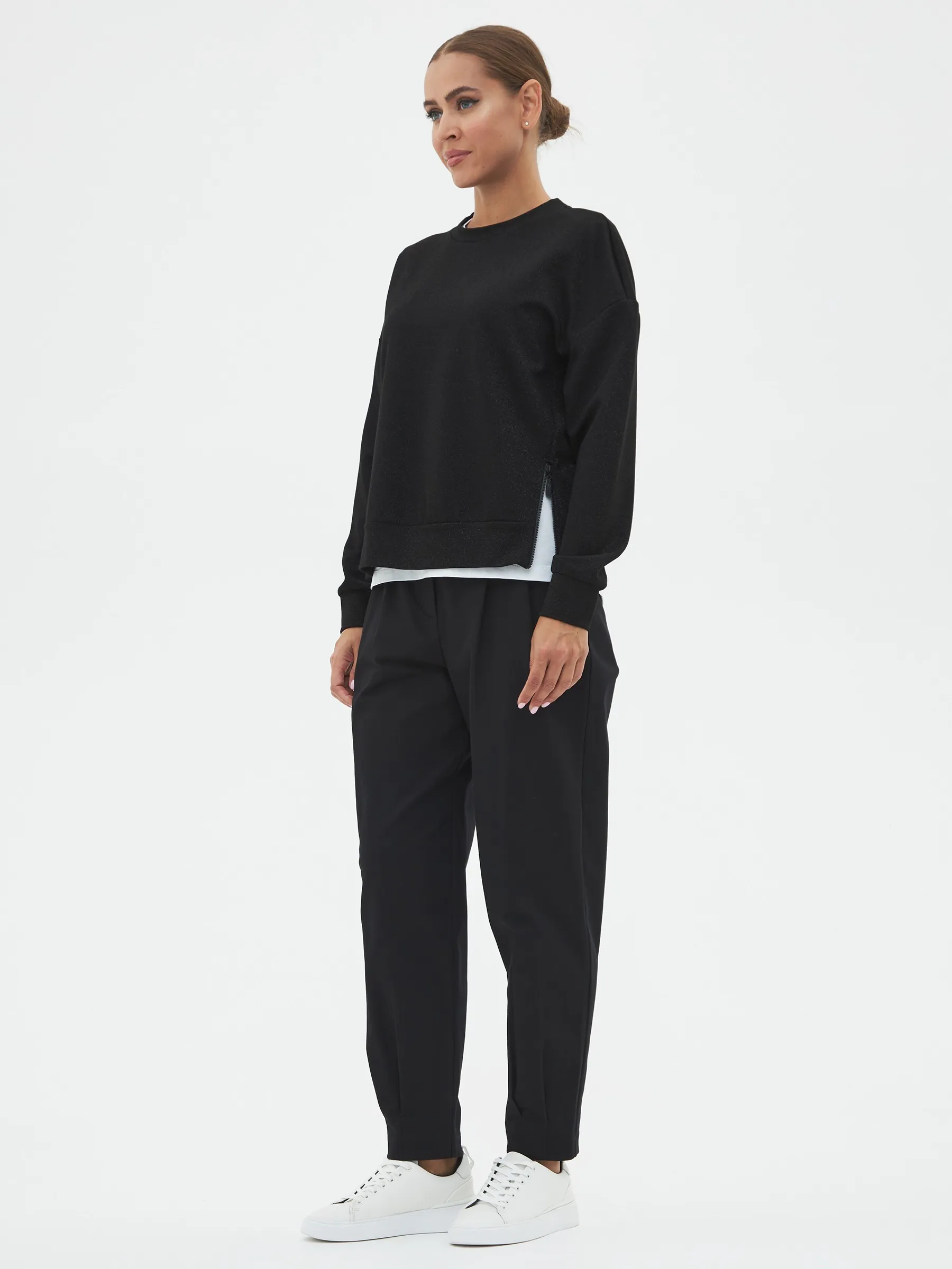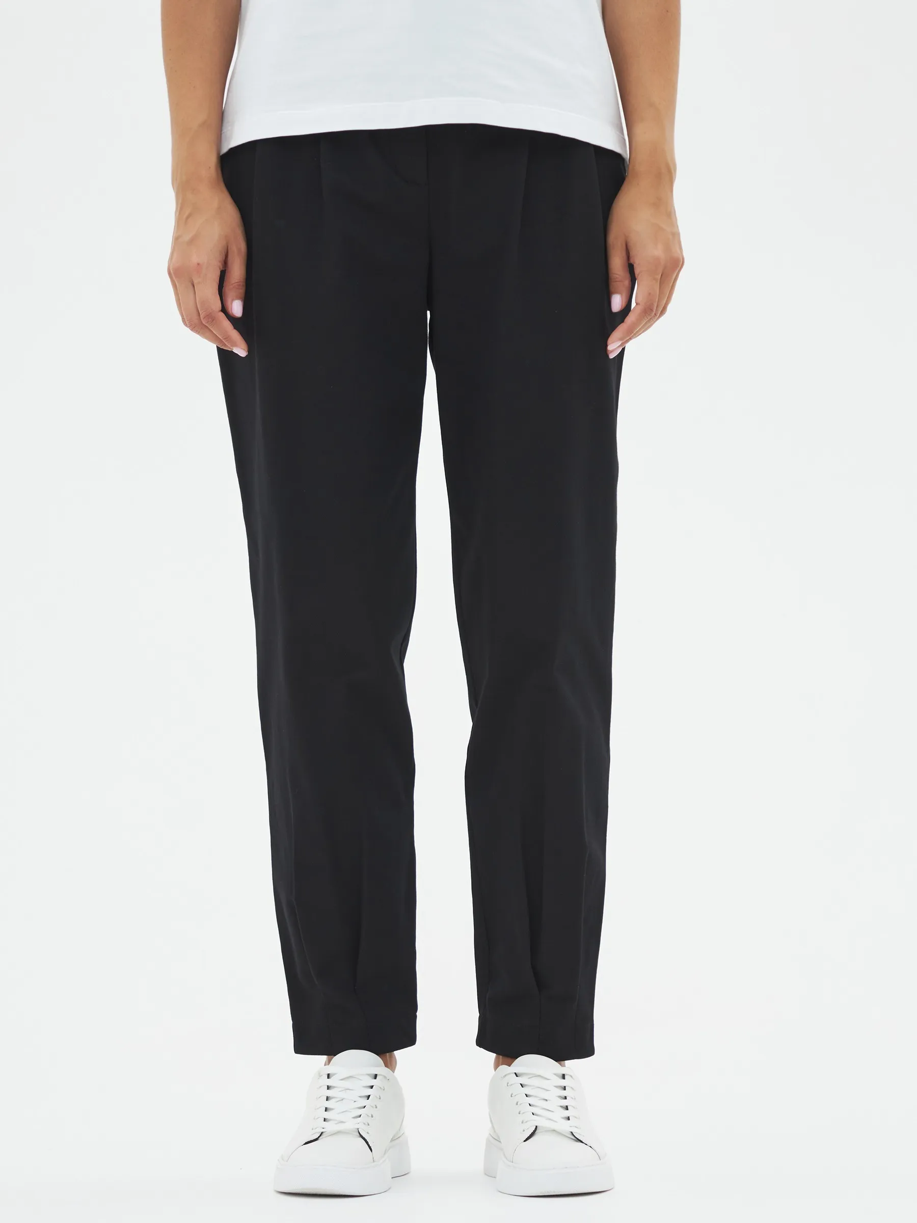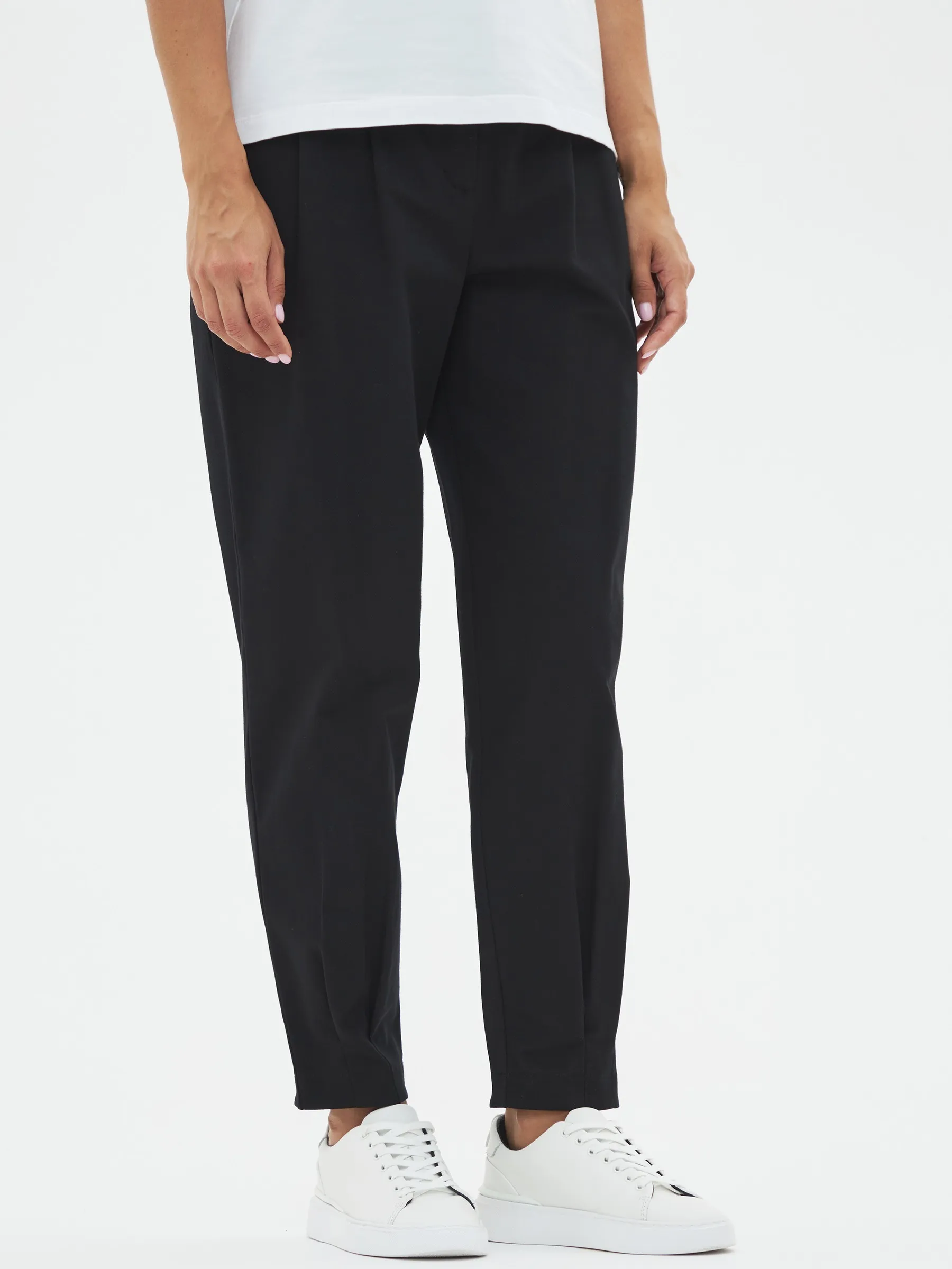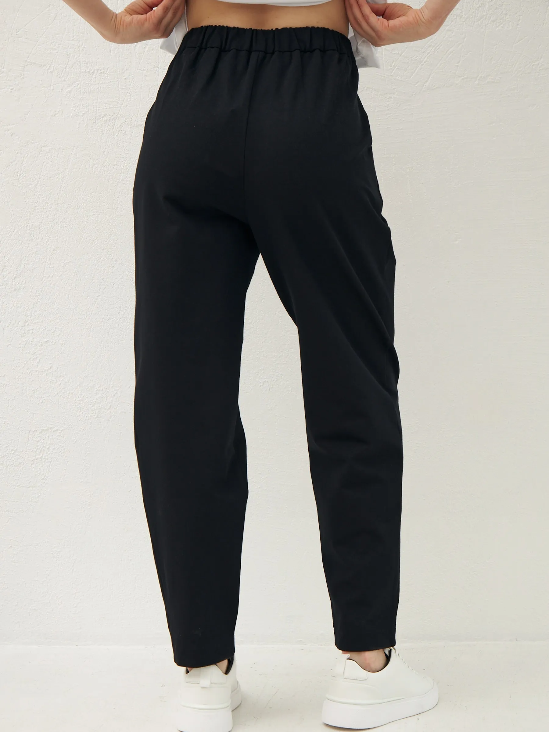 Брюки-бананы с складками спереди, зауженные к низу на эластичной резинке. Модель выполнена из практичной ткани премиального качества, в составе кото-рой мягкий органический хлопок, прочный полиамид и тянущийся эластан. По-дойдет для создания повседневных образов в сочетании с футболками, свитшо-тами и блузами Gezalook by UDGY