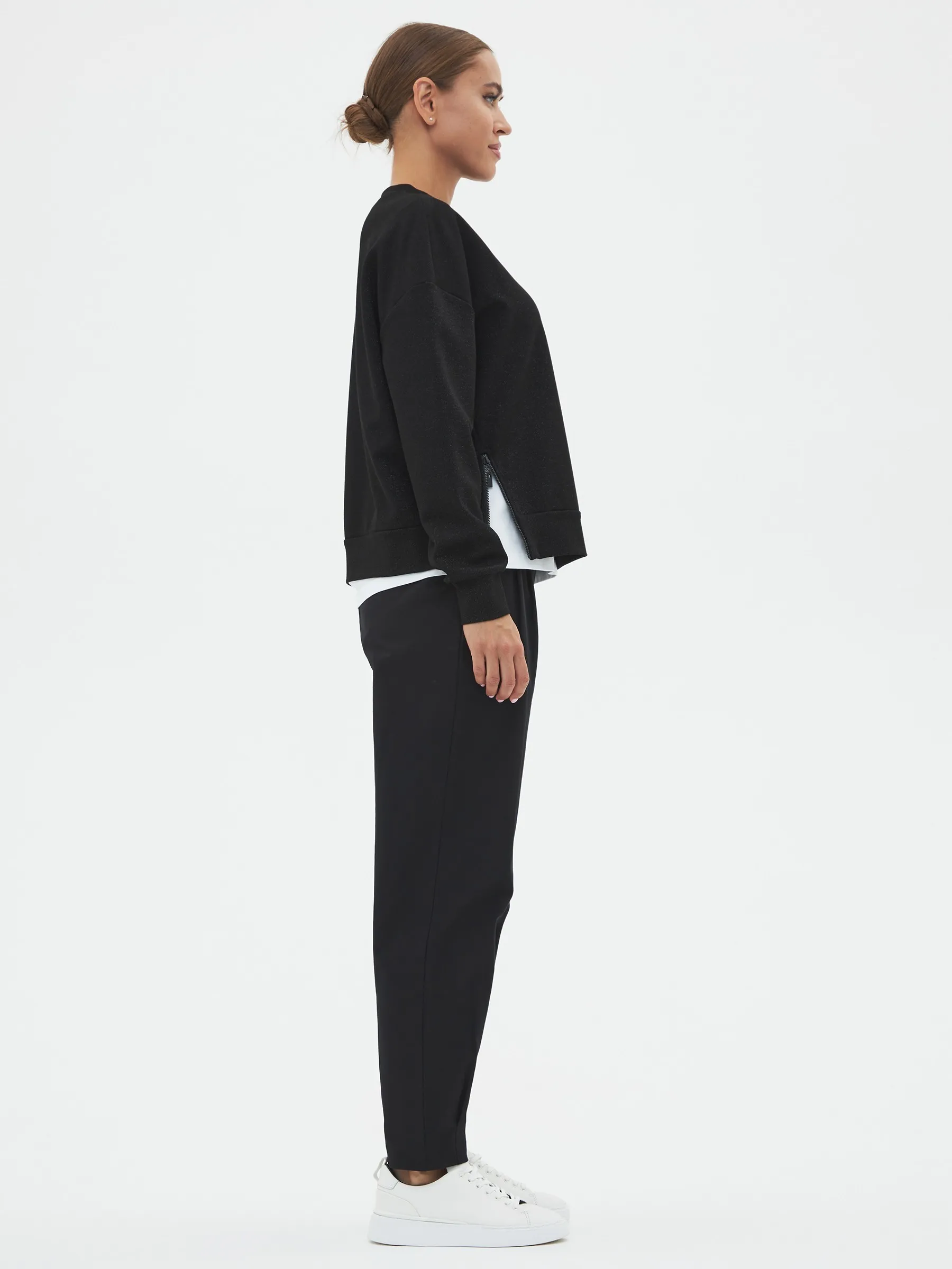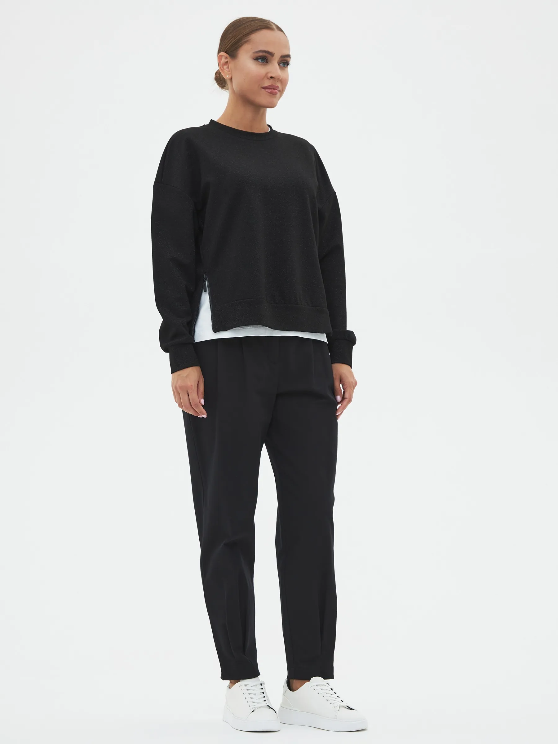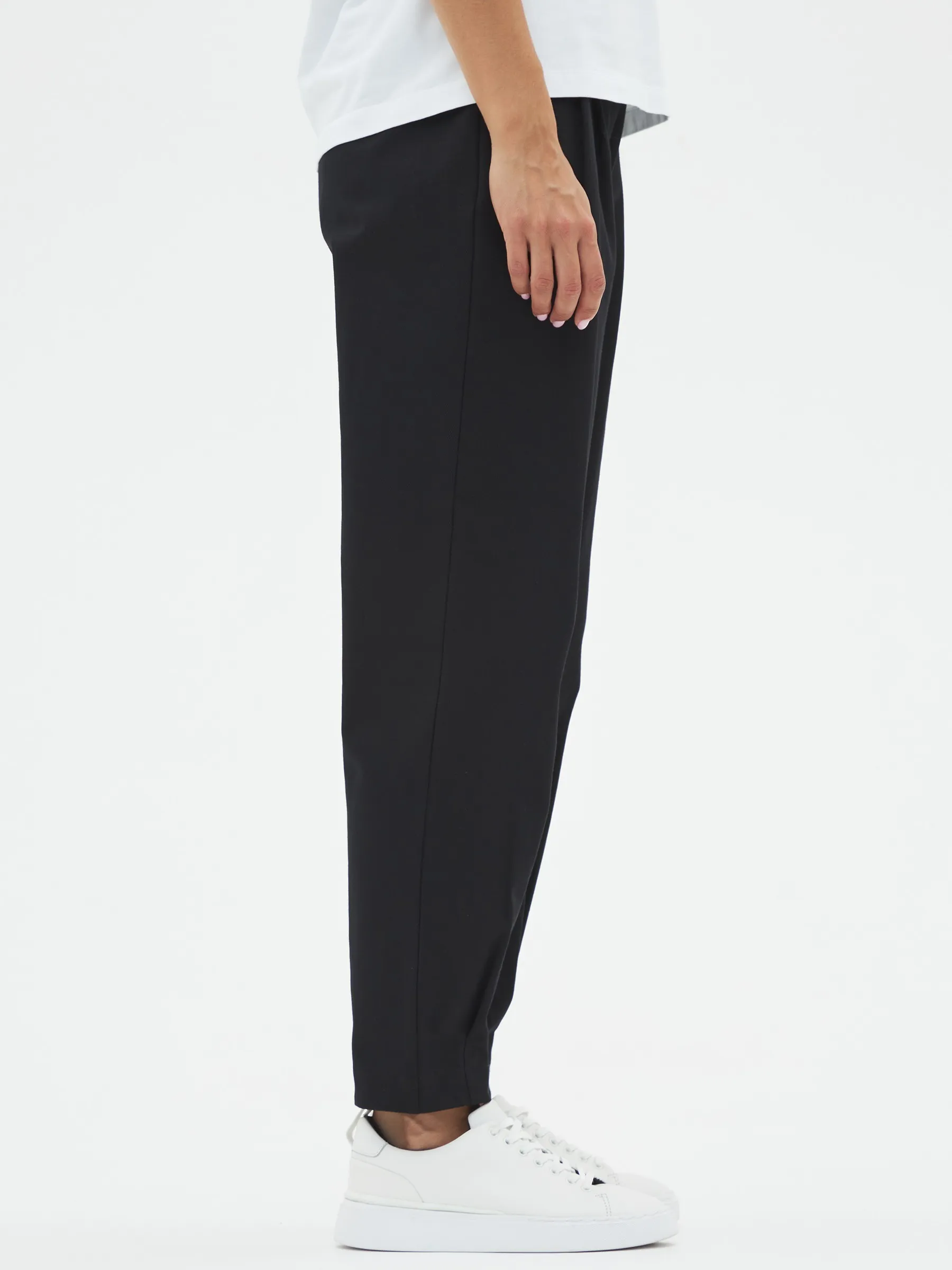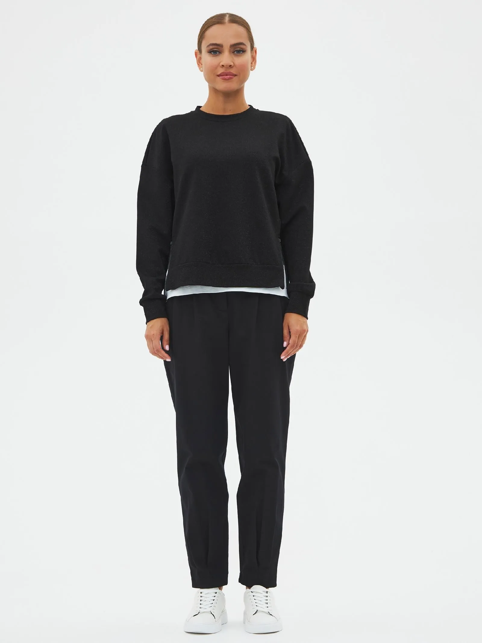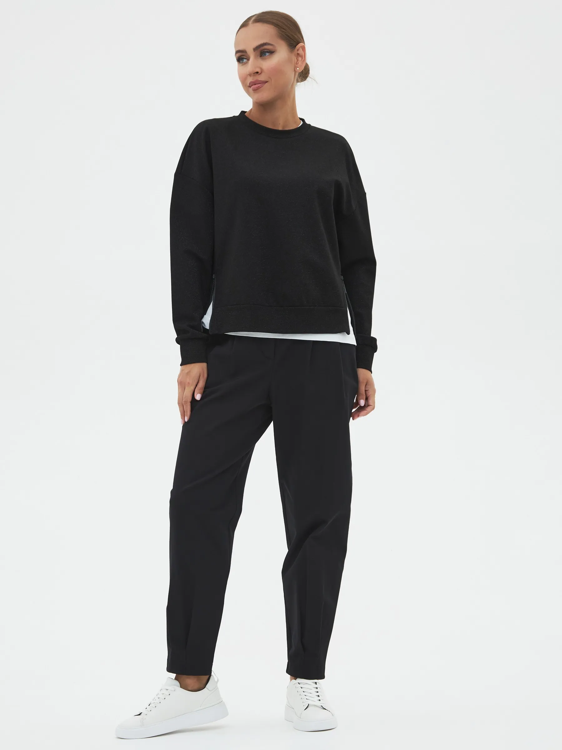 Брюки-бананы с складками спереди, зауженные к низу на эластичной резинке. Модель выполнена из практичной ткани премиального качества, в составе кото-рой мягкий органический хлопок, прочный полиамид и тянущийся эластан. По-дойдет для создания повседневных образов в сочетании с футболками, свитшо-тами и блузами Gezalook by UDGY