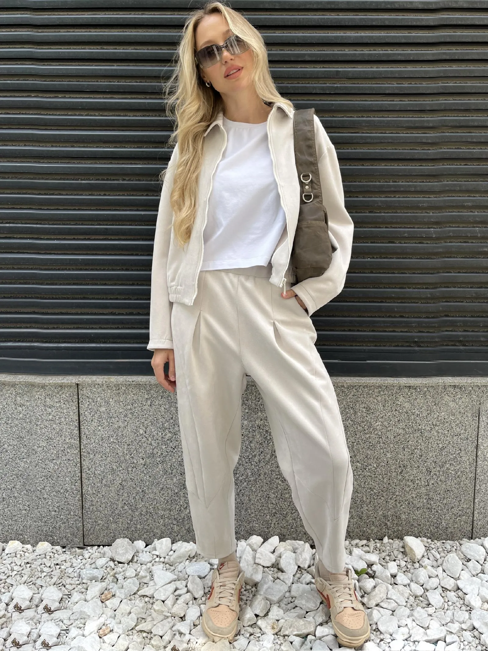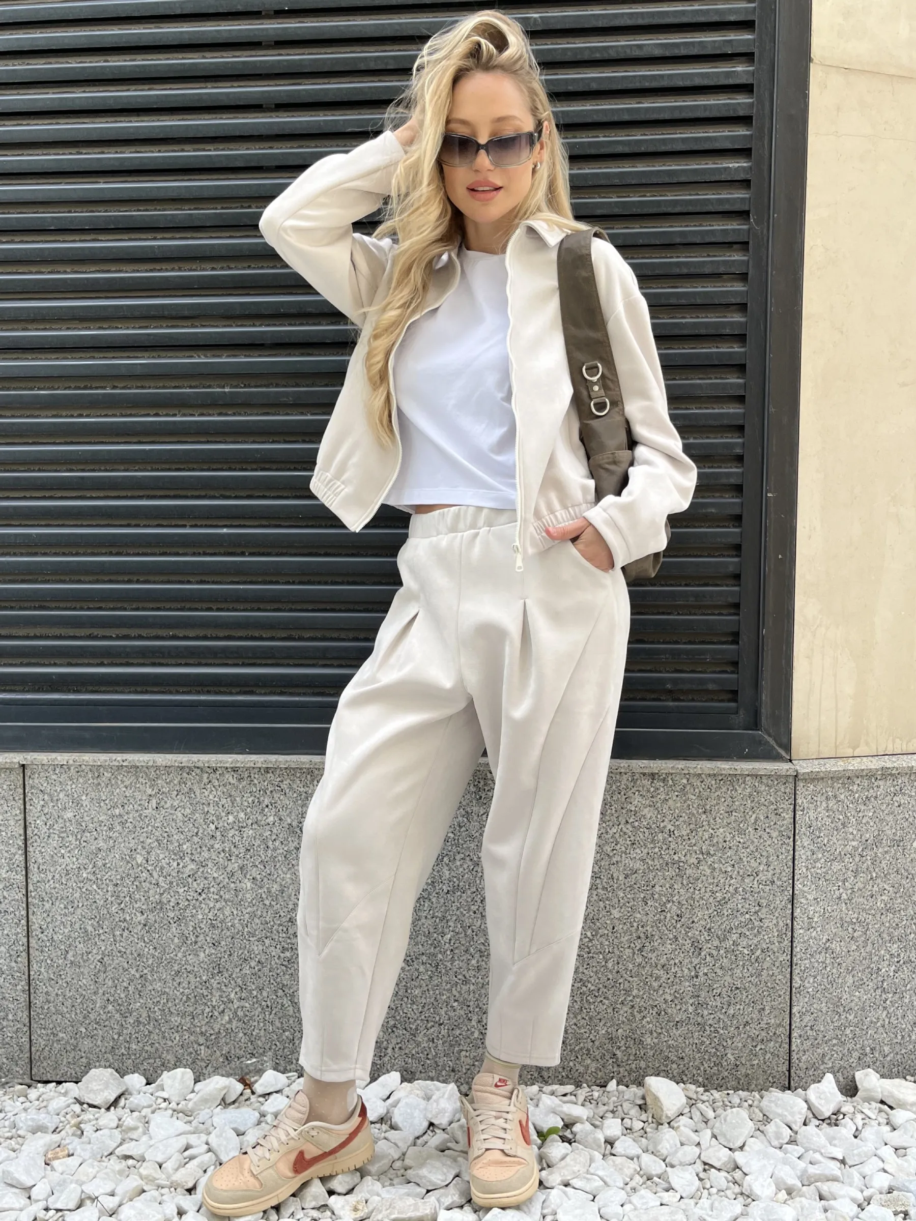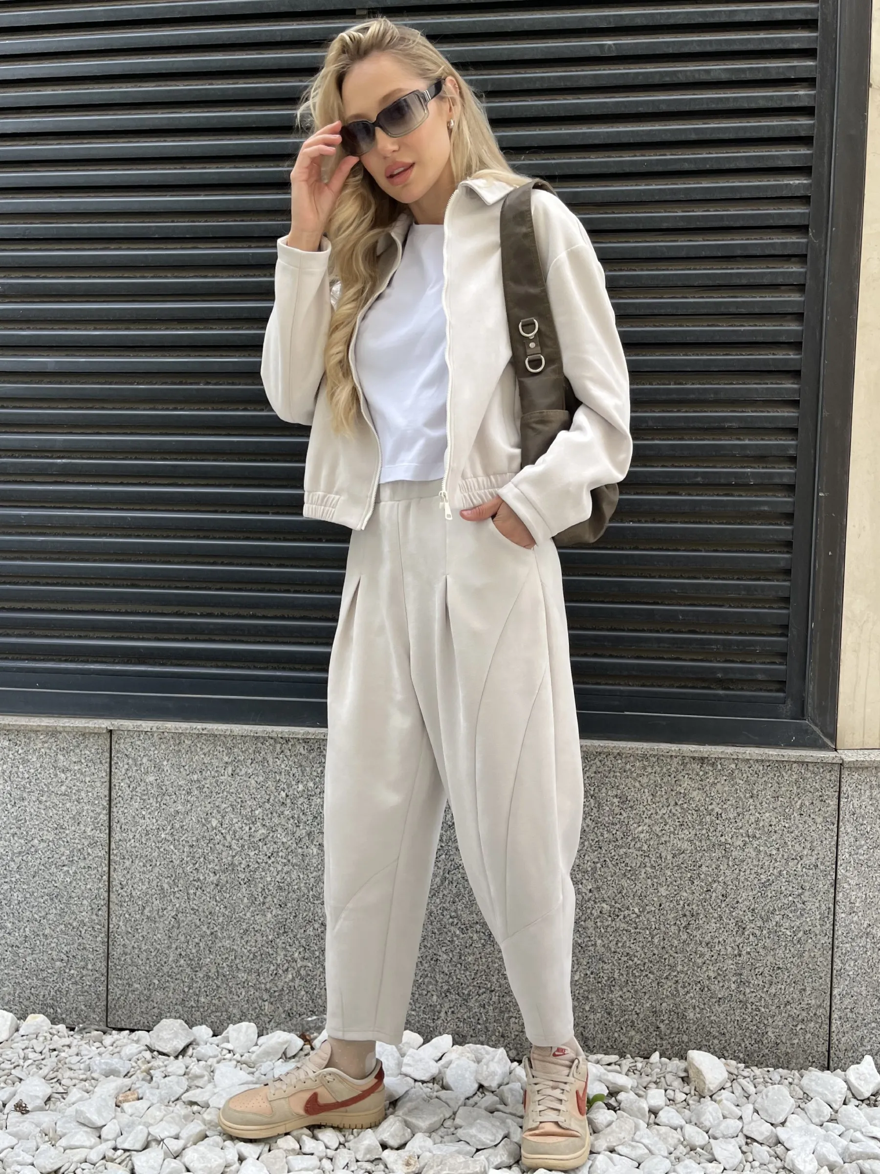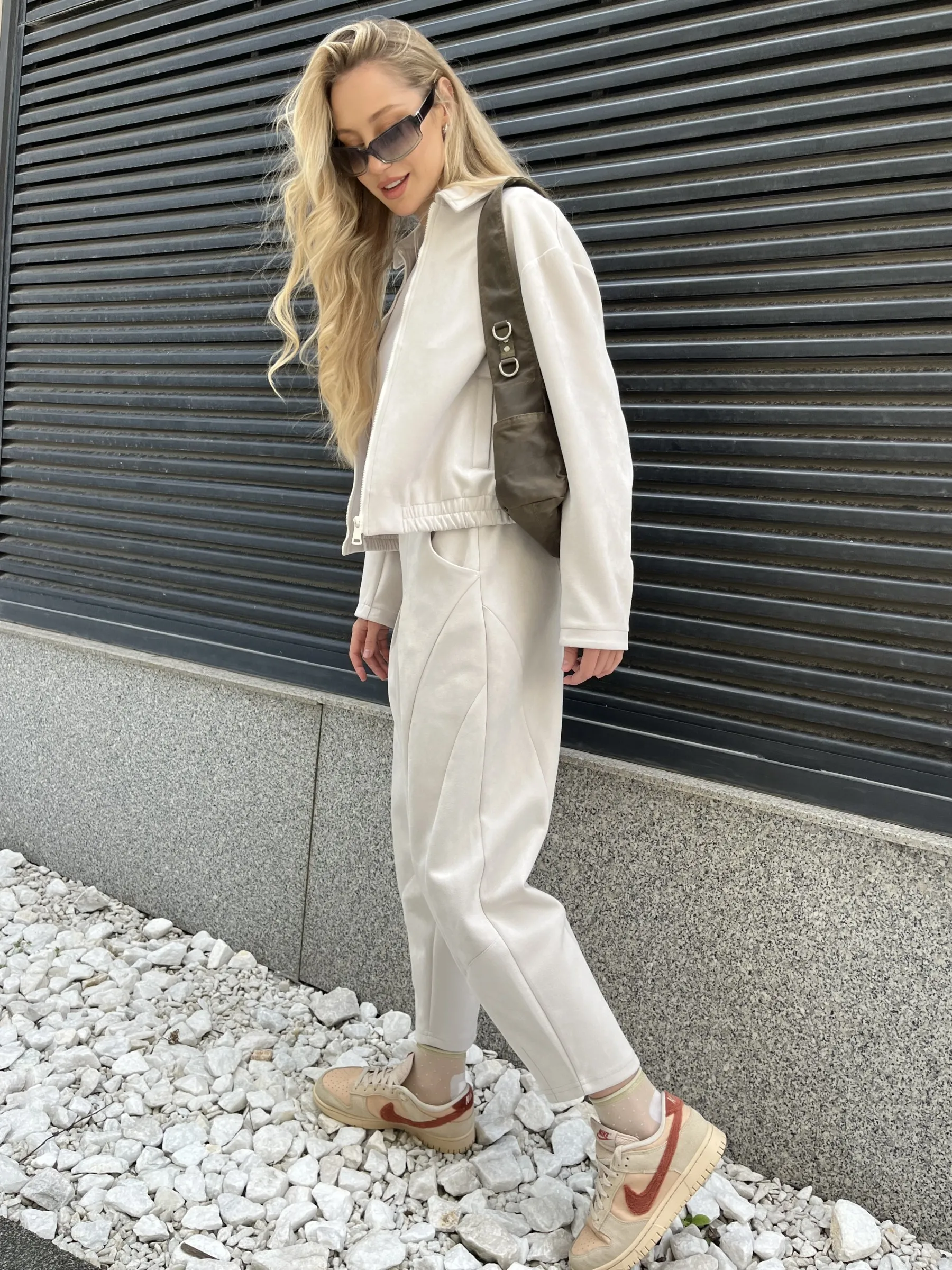 Женские брюки из мягкой замши идеально подчеркивают фигуру благодаря оригинальному крою. Брюки гармонично сочетают в себе стиль и комфорт. Спереди есть фигурные вставки, которые придают образу утонченность, а карманы добавляют практичности и легкости. Изюминкой дизайна являются бантовые складки по верхнему краю, мягко подчеркивающие талию, и вытачки на нижней части, которые придают брюкам изысканный силуэт. Пояс выполнен с эластичной резинкой: спереди – гладкий и собранный, сзади – комфортно тянется, обеспечивая идеальную посадку. Эти брюки подойдут для любого события, создавая образ, который восхищает с первого взгляда.