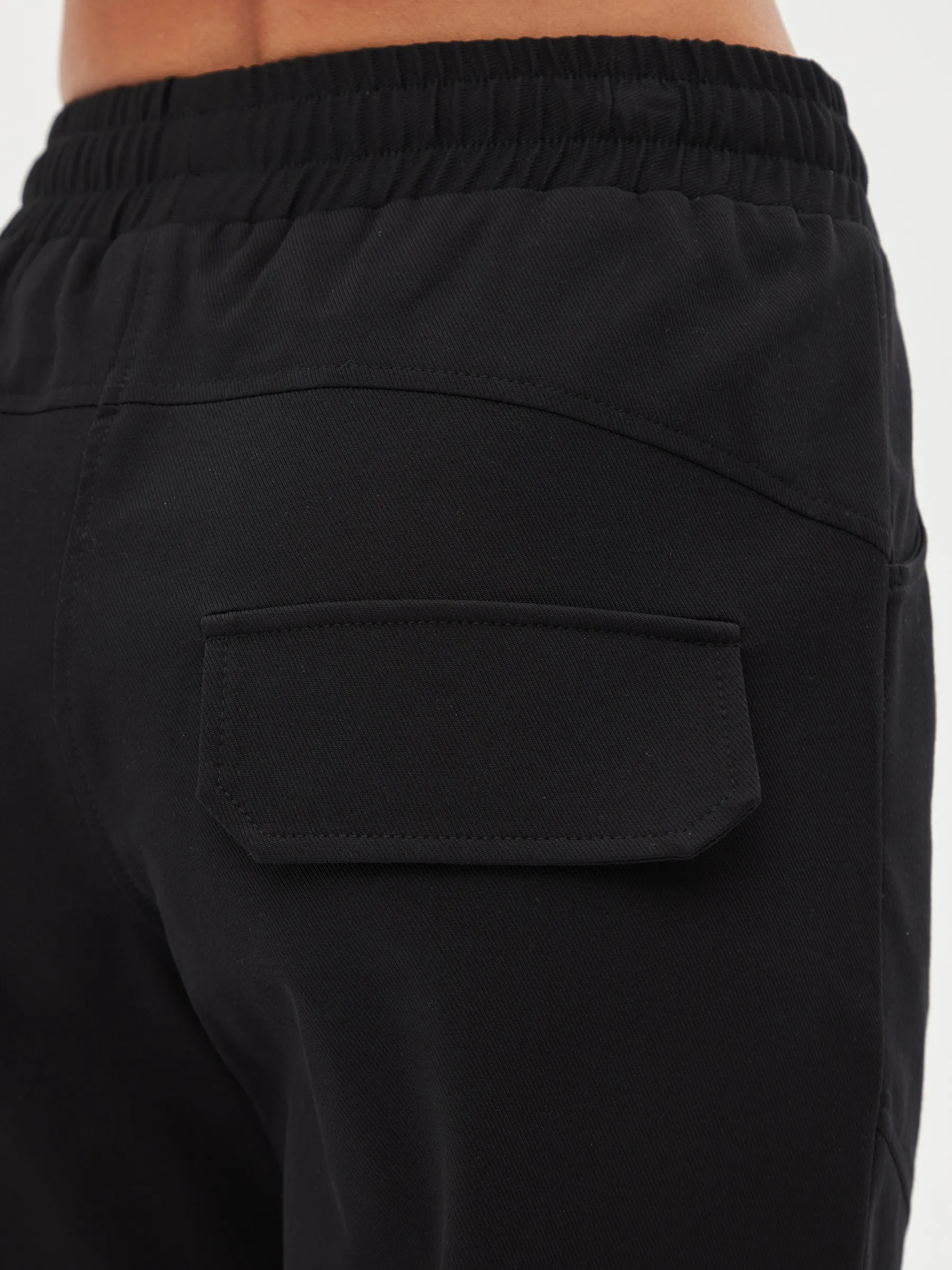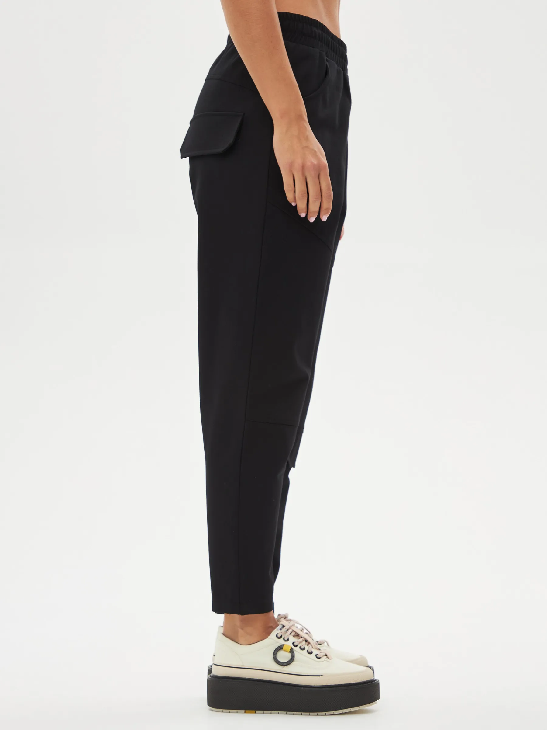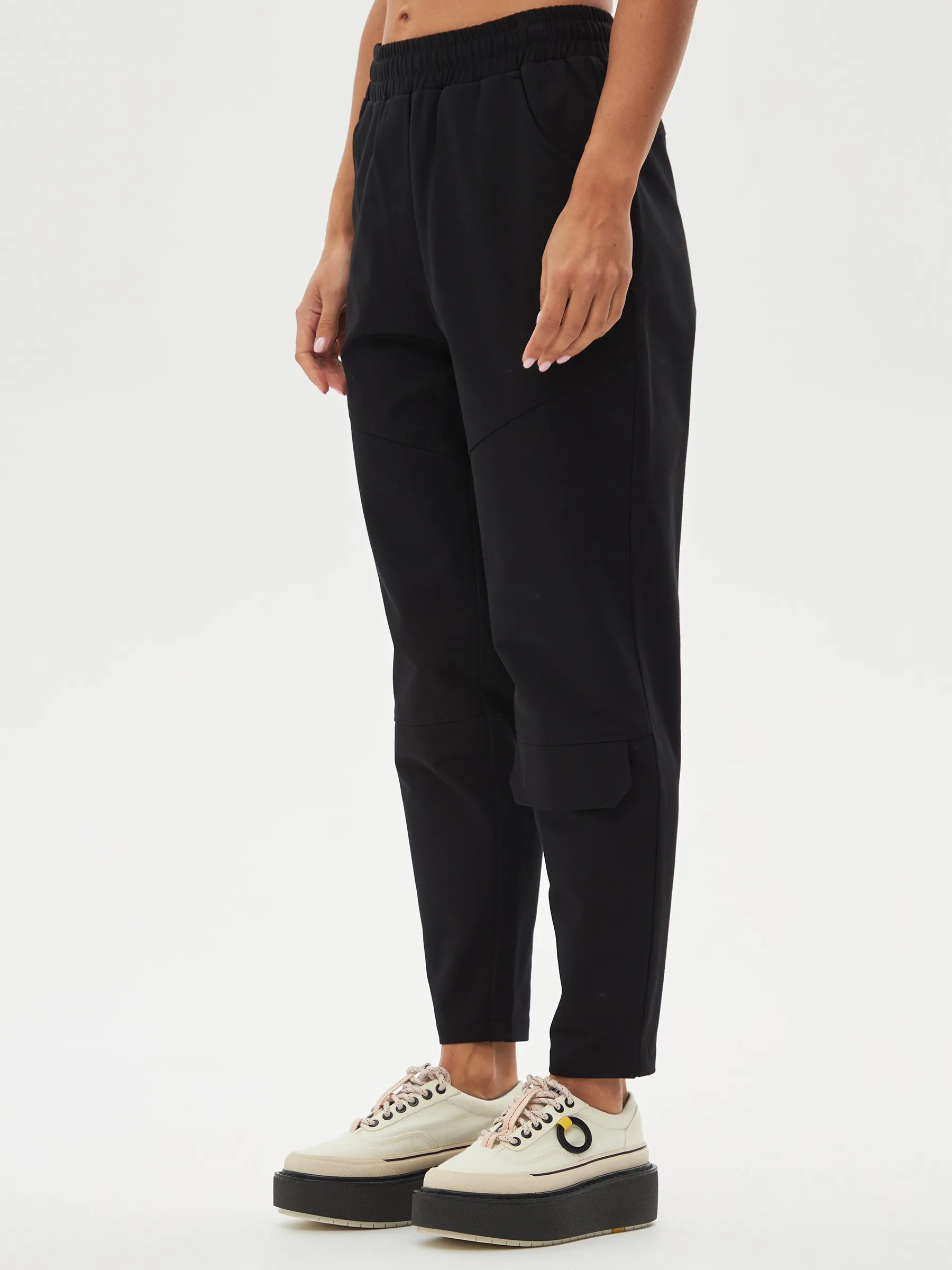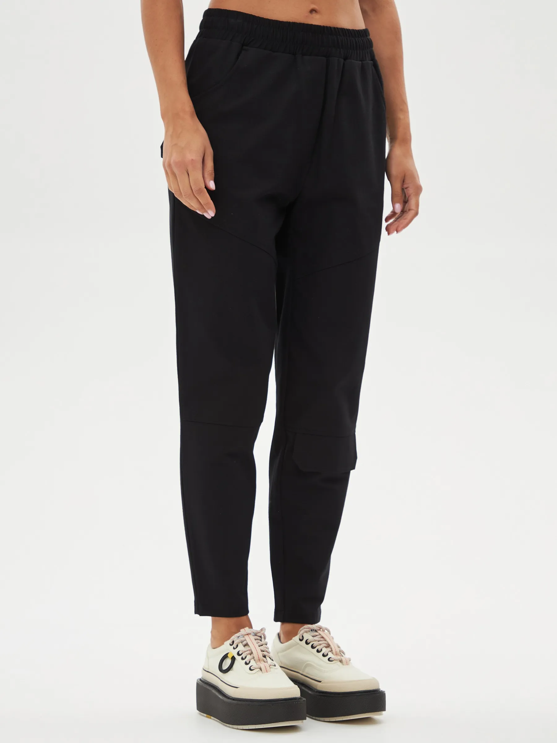 Черные зауженные книзу брюки на эластичной резинке с декоративными швами, боковыми и накладными карманами. Модель выполнена из практичной ткани премиального качества, в составе которой мягкий органический хлопок, прочный полиамид и тянущийся эластан. Подойдет для создания кэжуал образов и сочетаний в стиле современной классики.