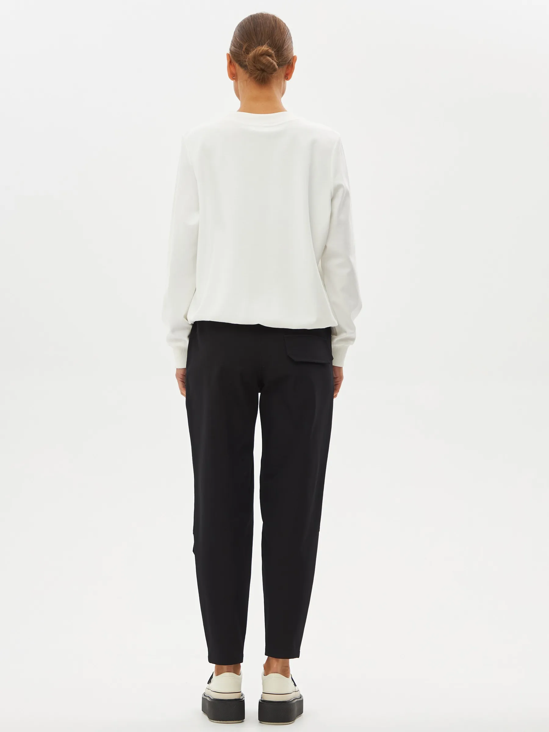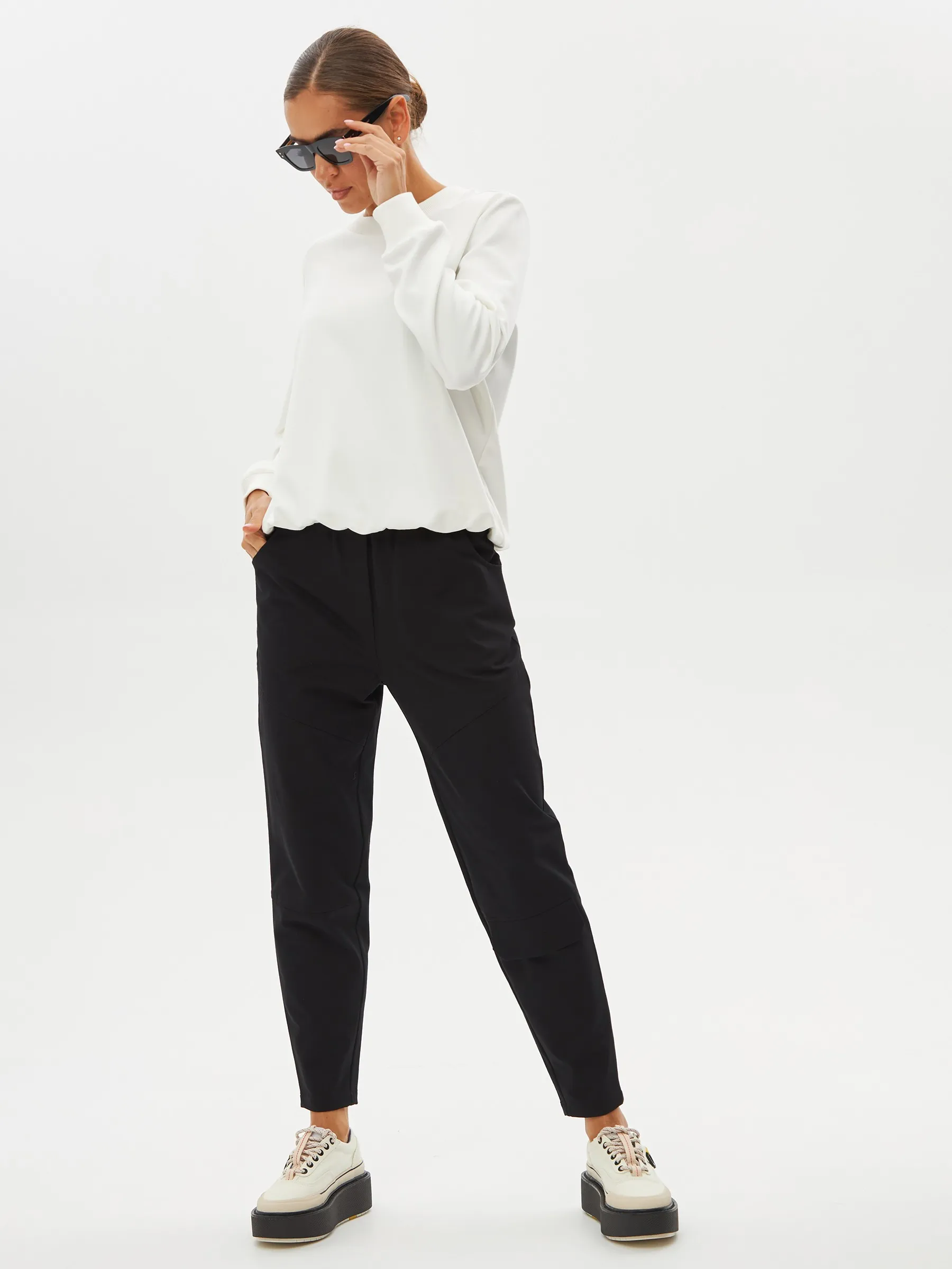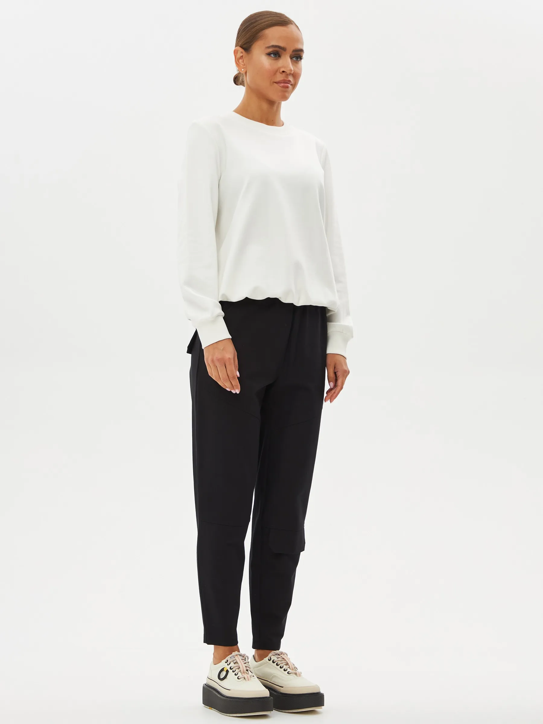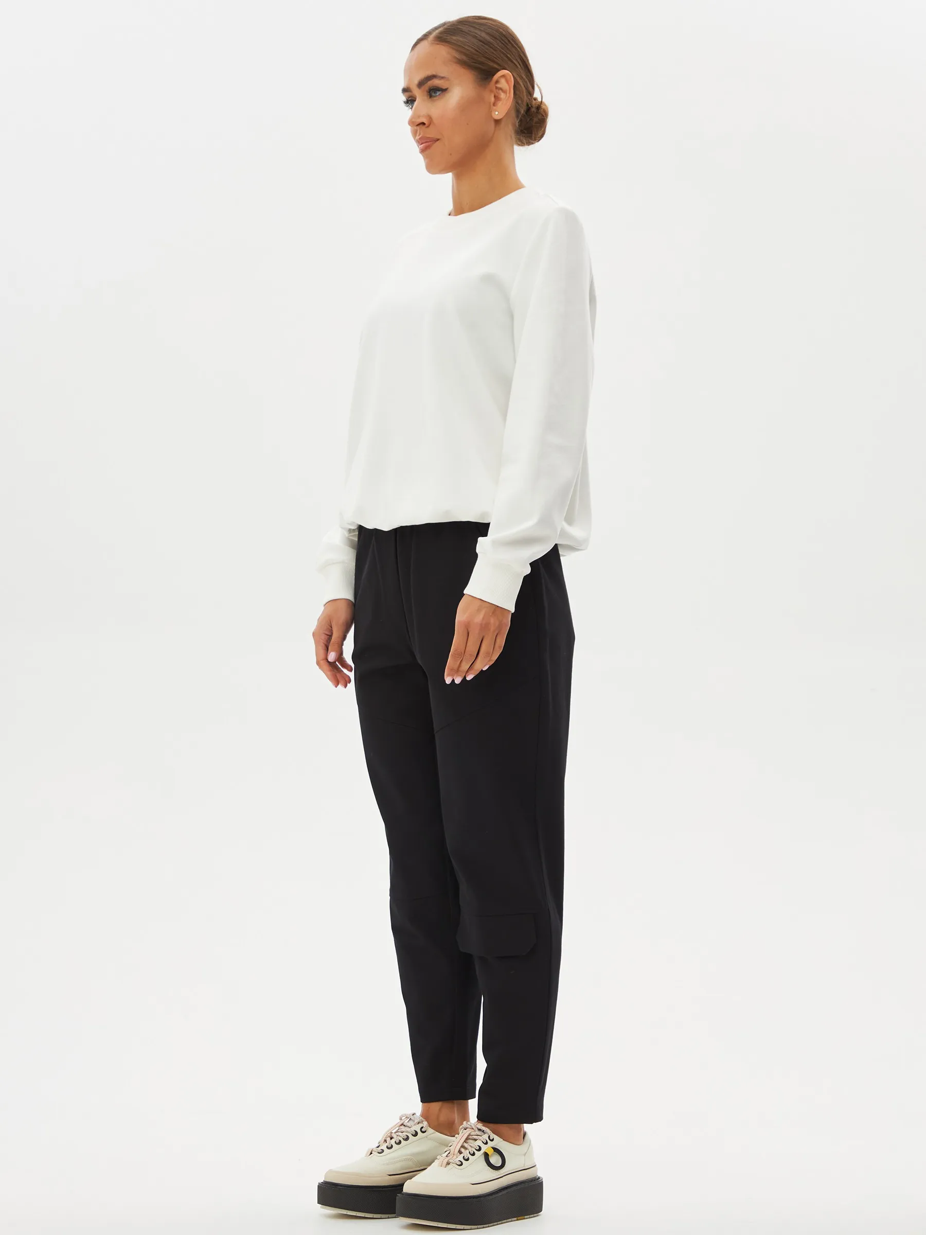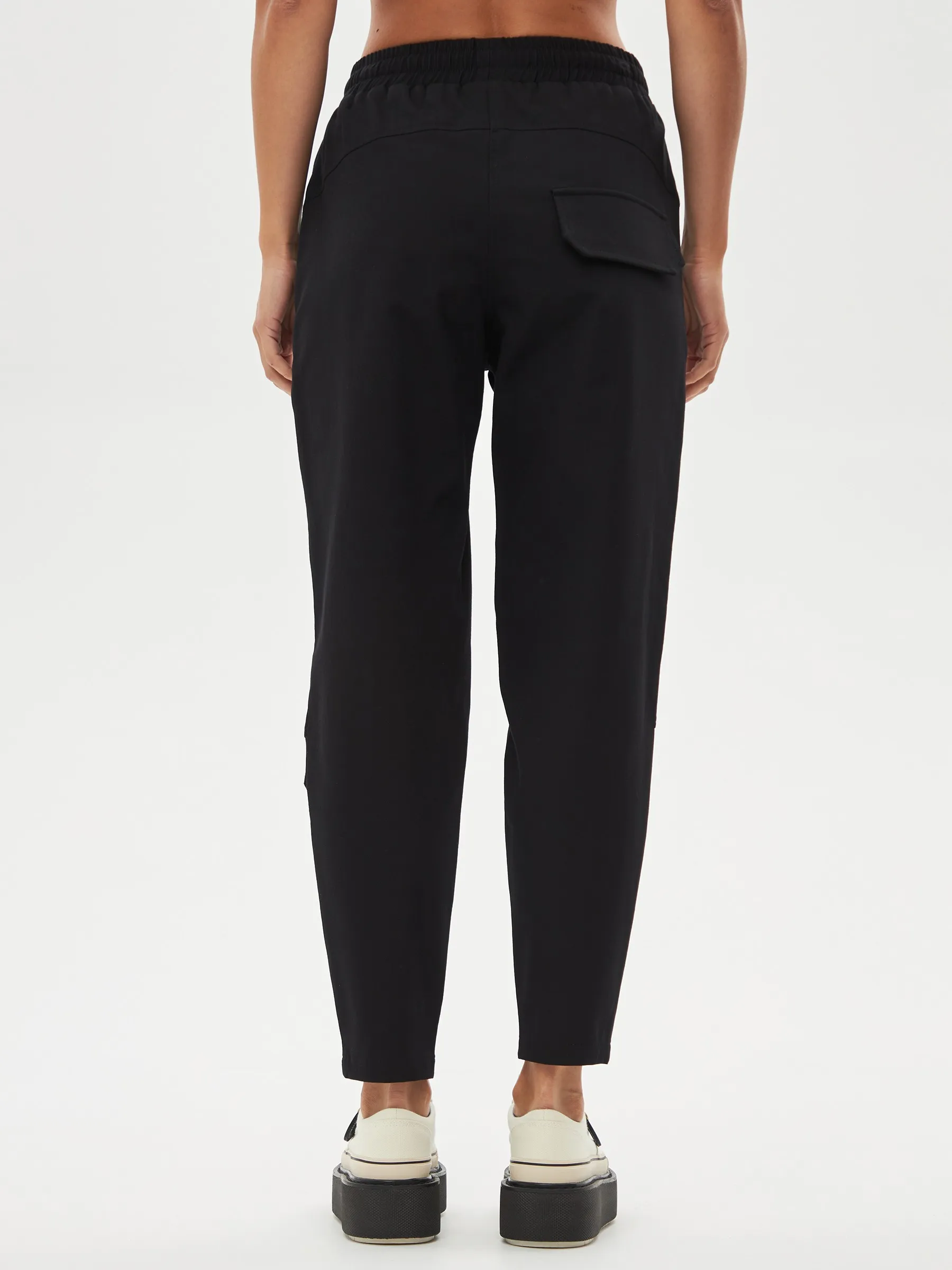 Черные зауженные книзу брюки на эластичной резинке с декоративными швами, боковыми и накладными карманами. Модель выполнена из практичной ткани премиального качества, в составе которой мягкий органический хлопок, прочный полиамид и тянущийся эластан. Подойдет для создания кэжуал образов и сочетаний в стиле современной классики.