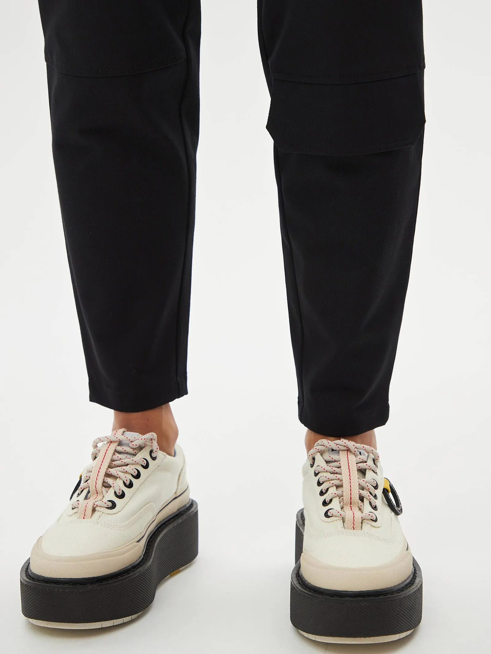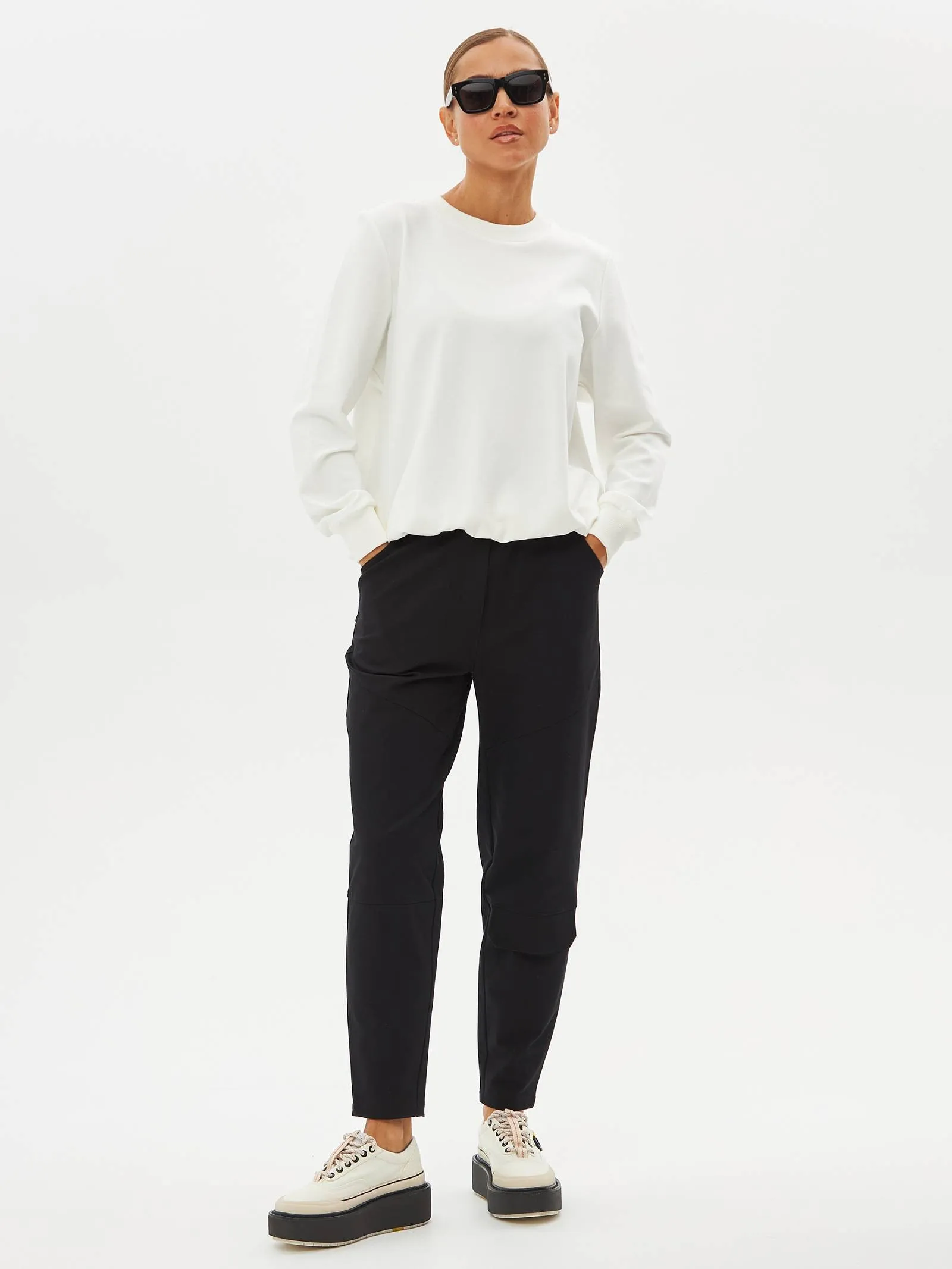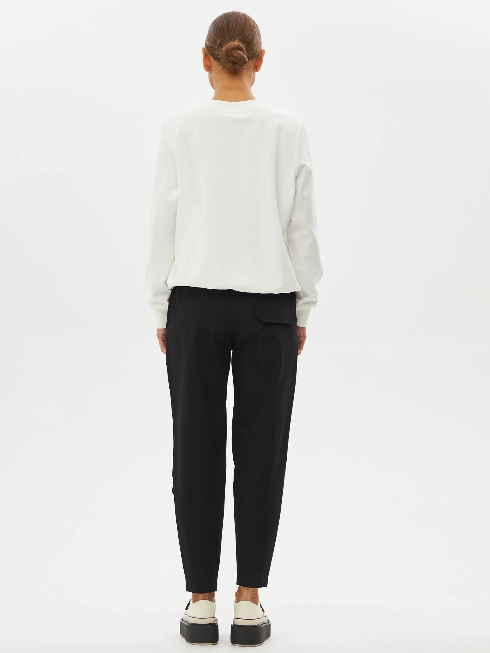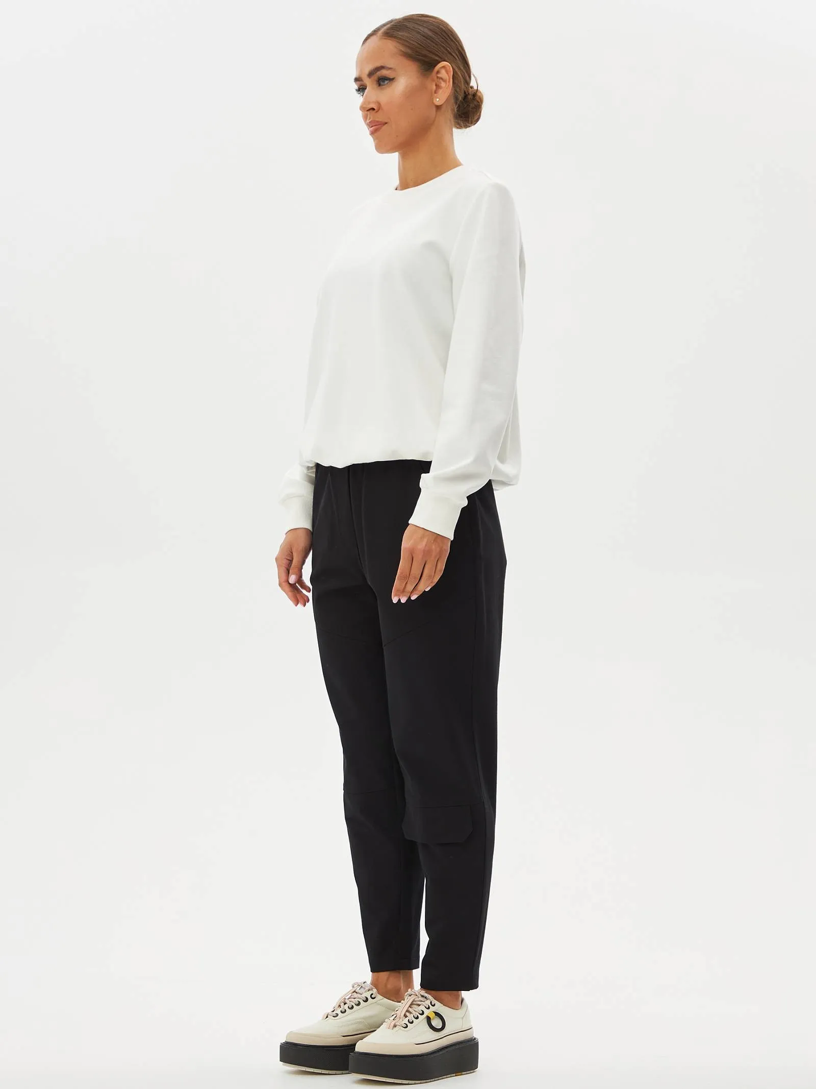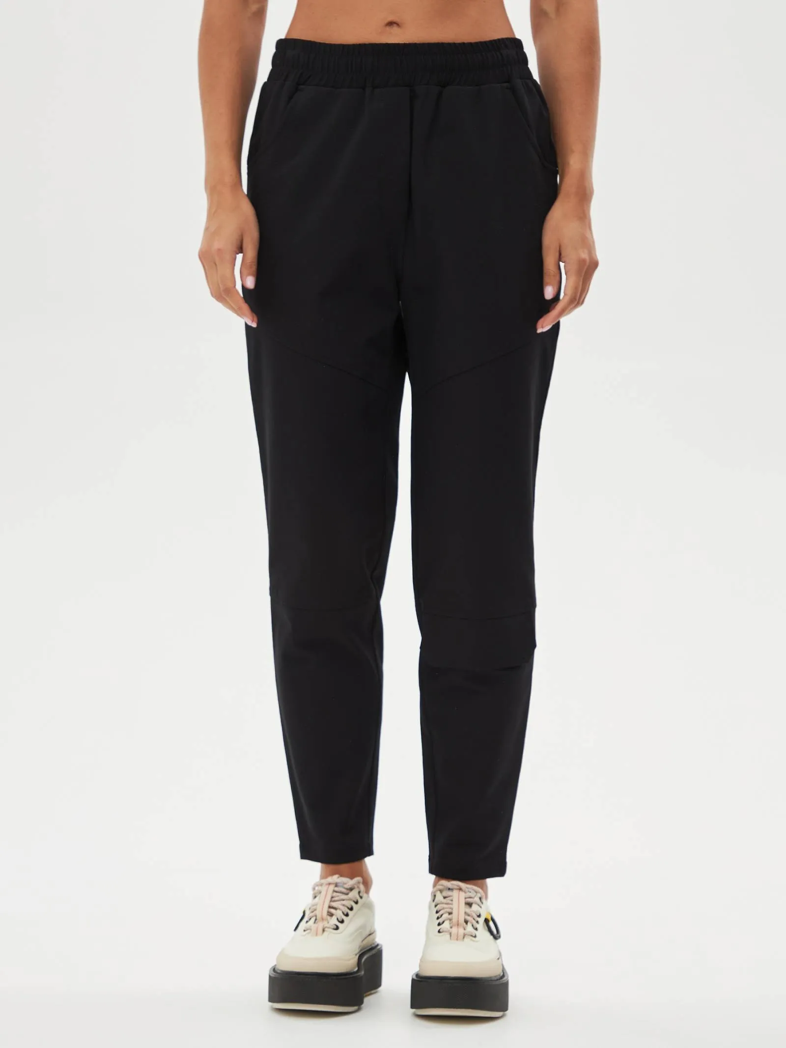 Черные зауженные книзу брюки на эластичной резинке с декоративными швами, боковыми и накладными карманами. Модель выполнена из практичной ткани премиального качества, в составе которой мягкий органический хлопок, прочный полиамид и тянущийся эластан. Подойдет для создания кэжуал образов и сочетаний в стиле современной классики.