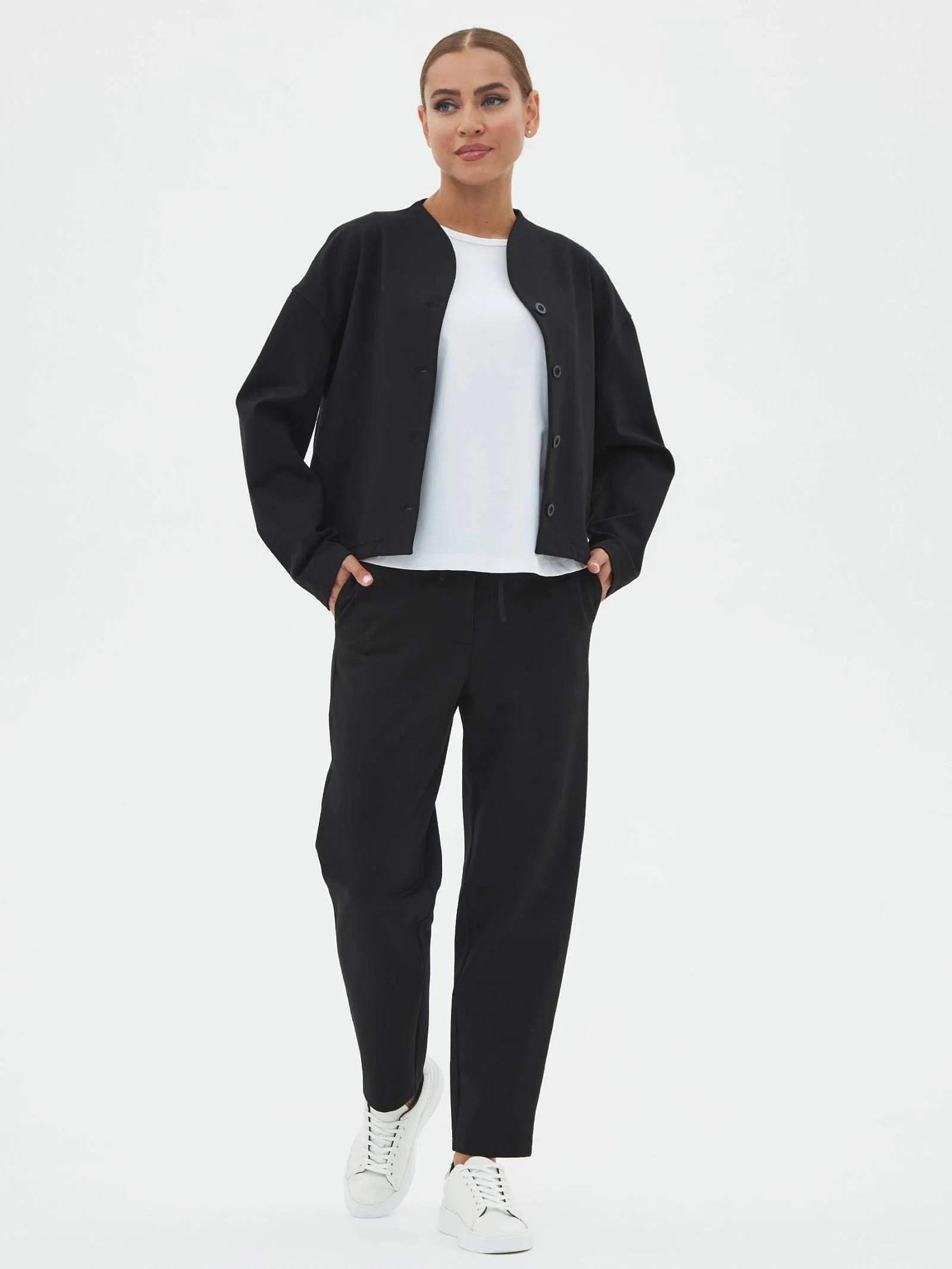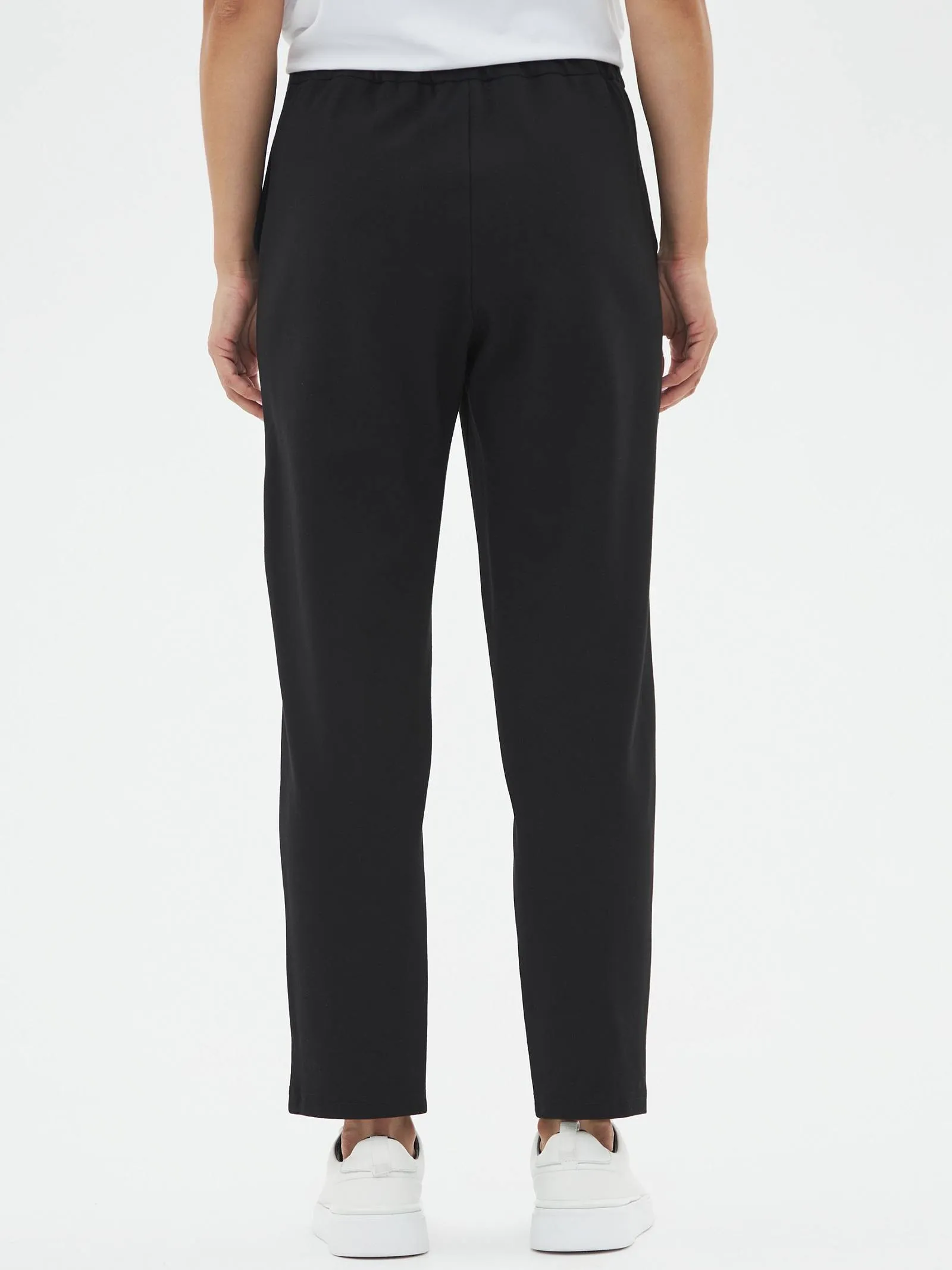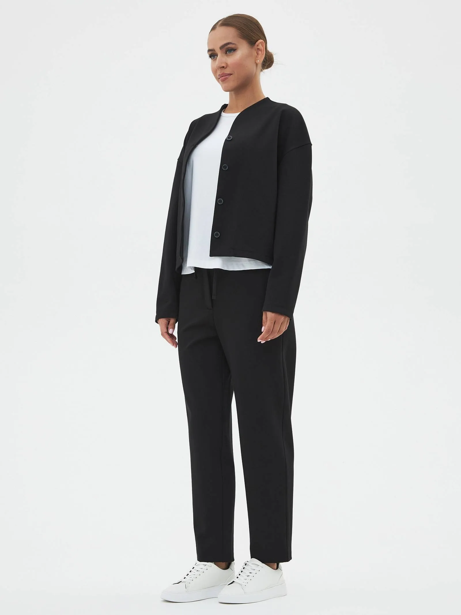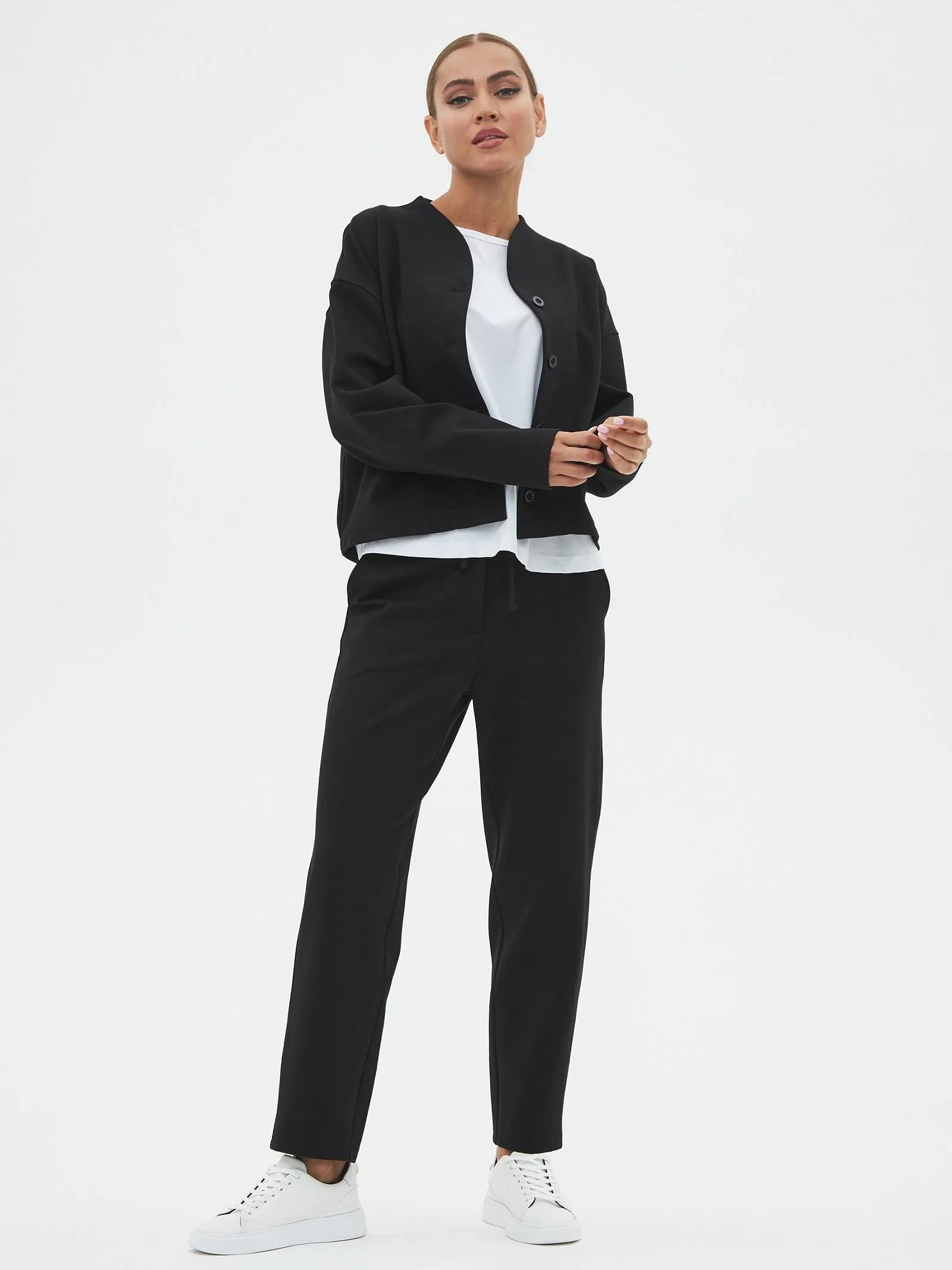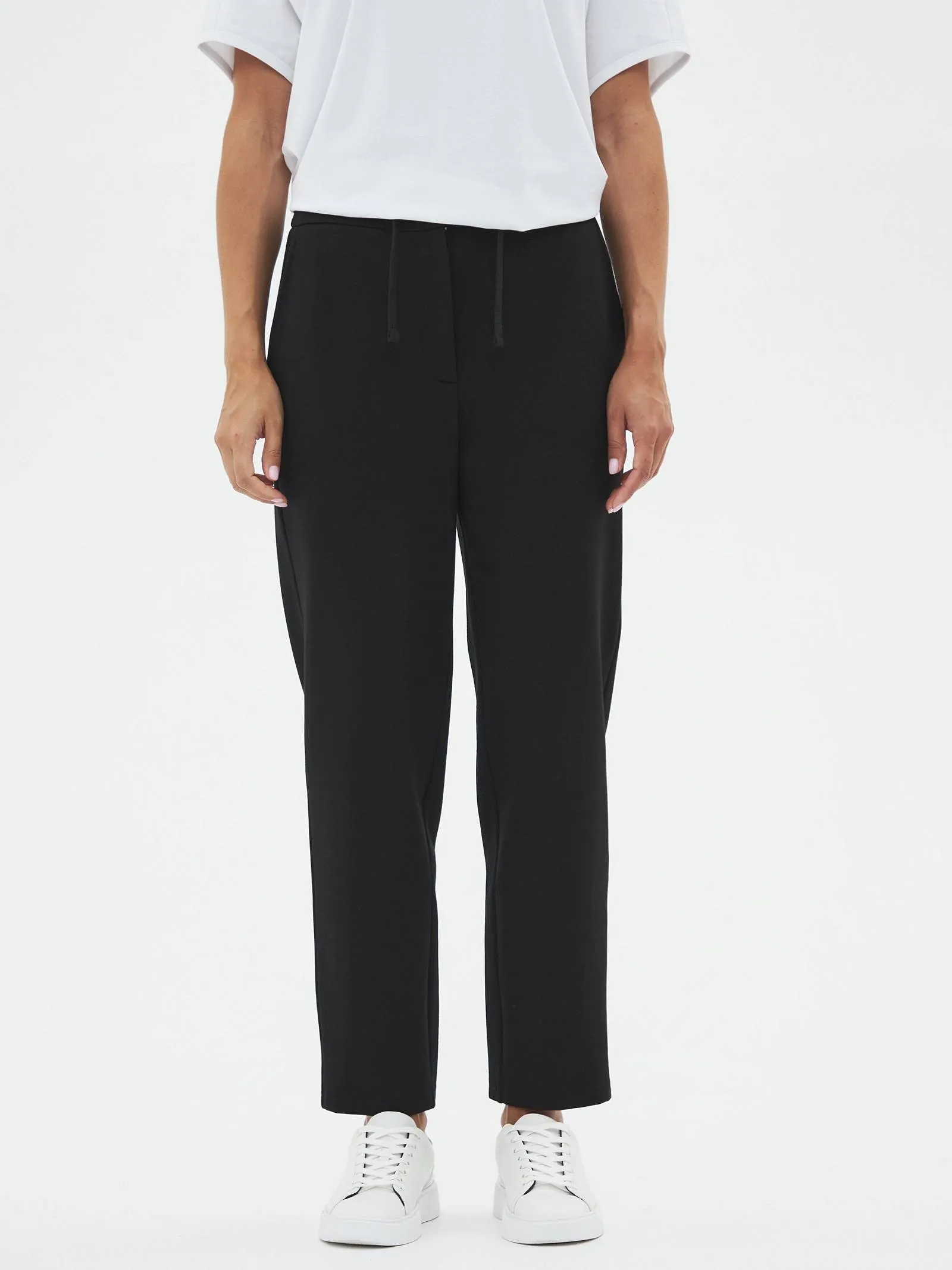 Трикотажные женские брюки созданы для максимального комфорта и стиля. Слегка зауженные к низу, они удачно подчеркивают фигуру, а их длина делает их идеальными для повседневной носки. Застегиваются на одну пуговицу и молнию, обеспечивая надежную фиксацию. Особенностью является пояс с регулируемой шириной, спереди дополнены шнурком, который крепится на эластичную резинку с внутренней стороны, что добавляет удобства в посадке. Задняя часть пояса также выполнена на эластичной резинке для дополнительного комфорта и гибкости. Эти брюки идеально подойдут для динамичного дня, сочетаются как с повседневной, так и с более элегантной одеждой.