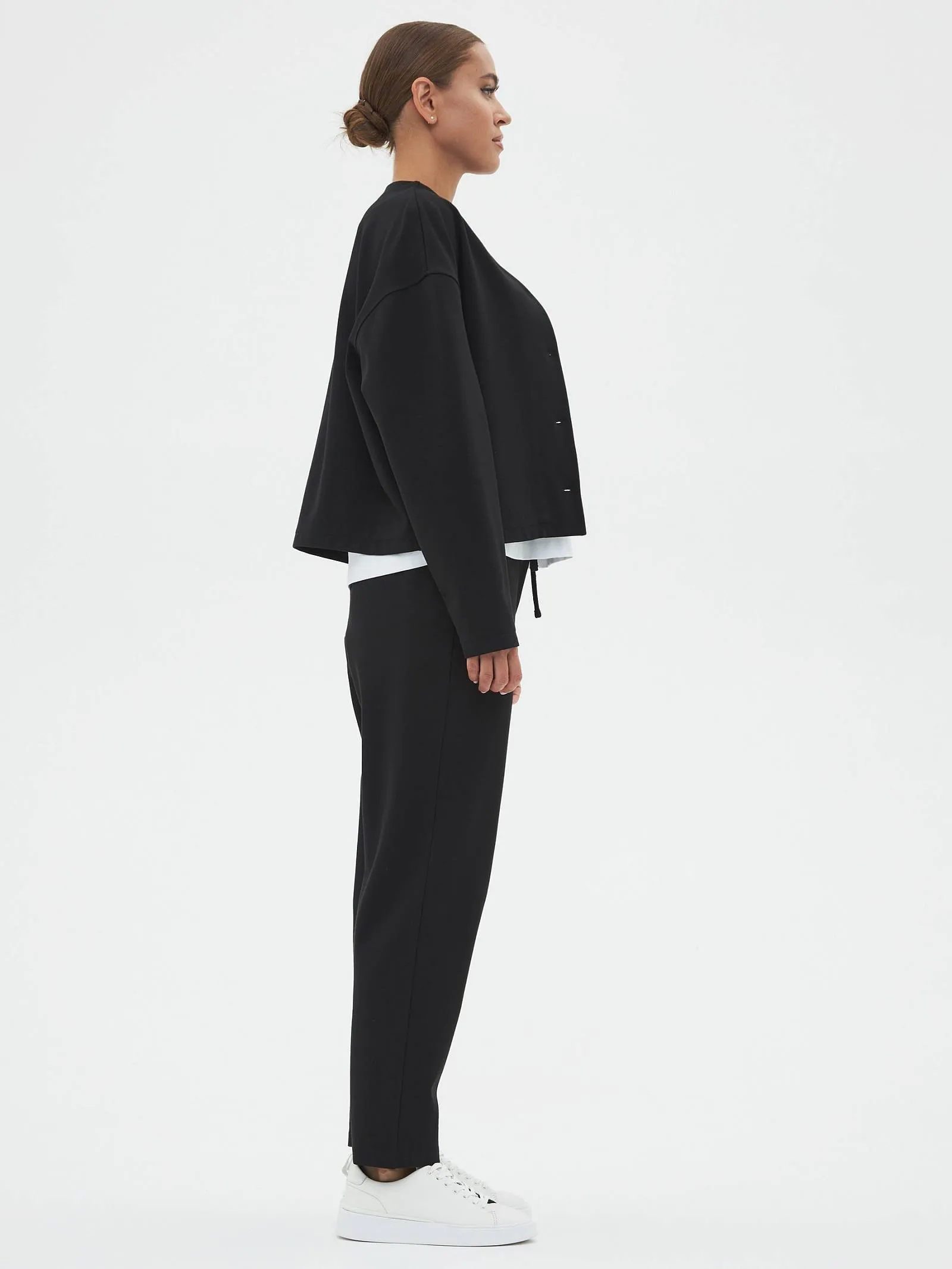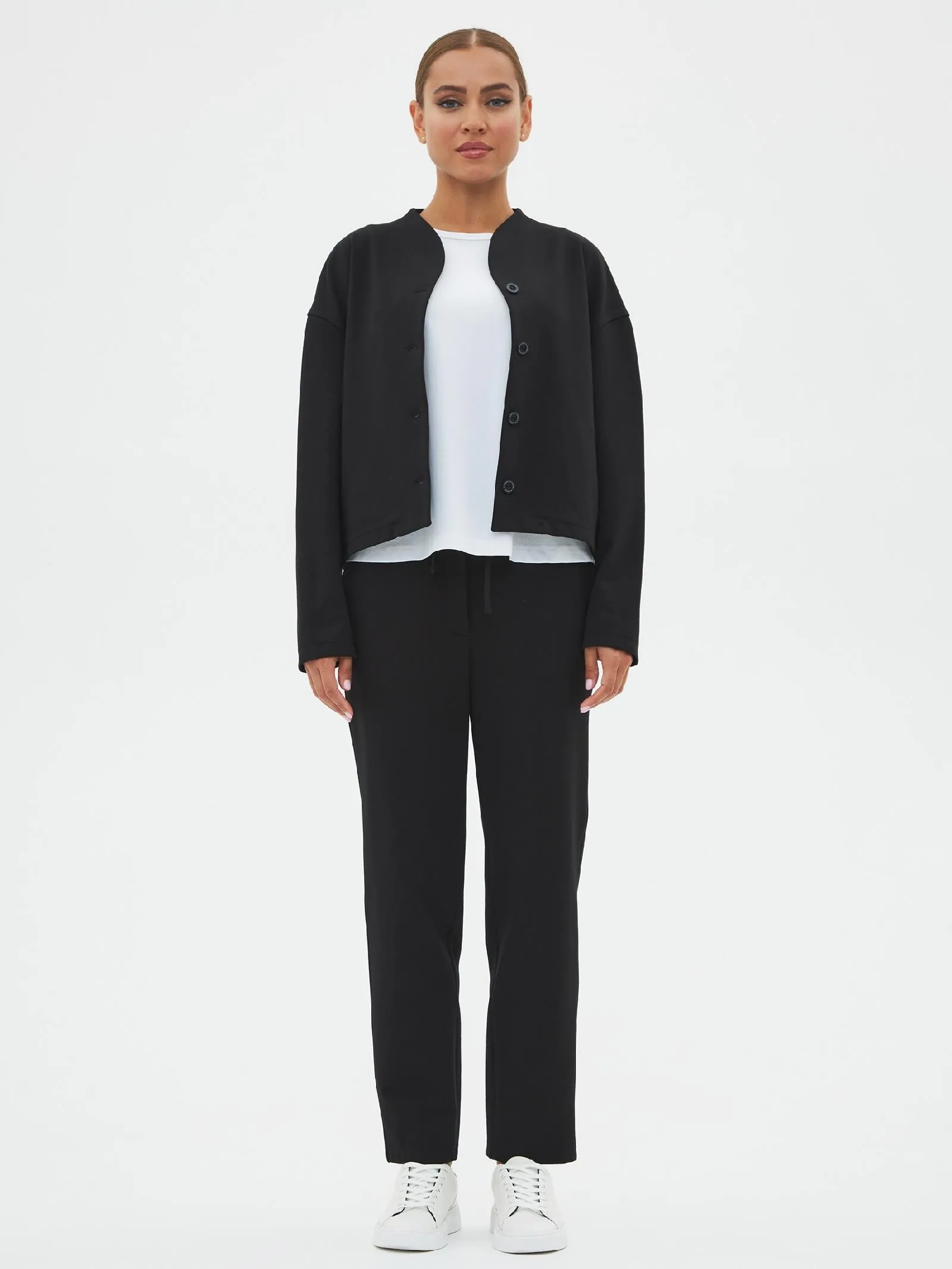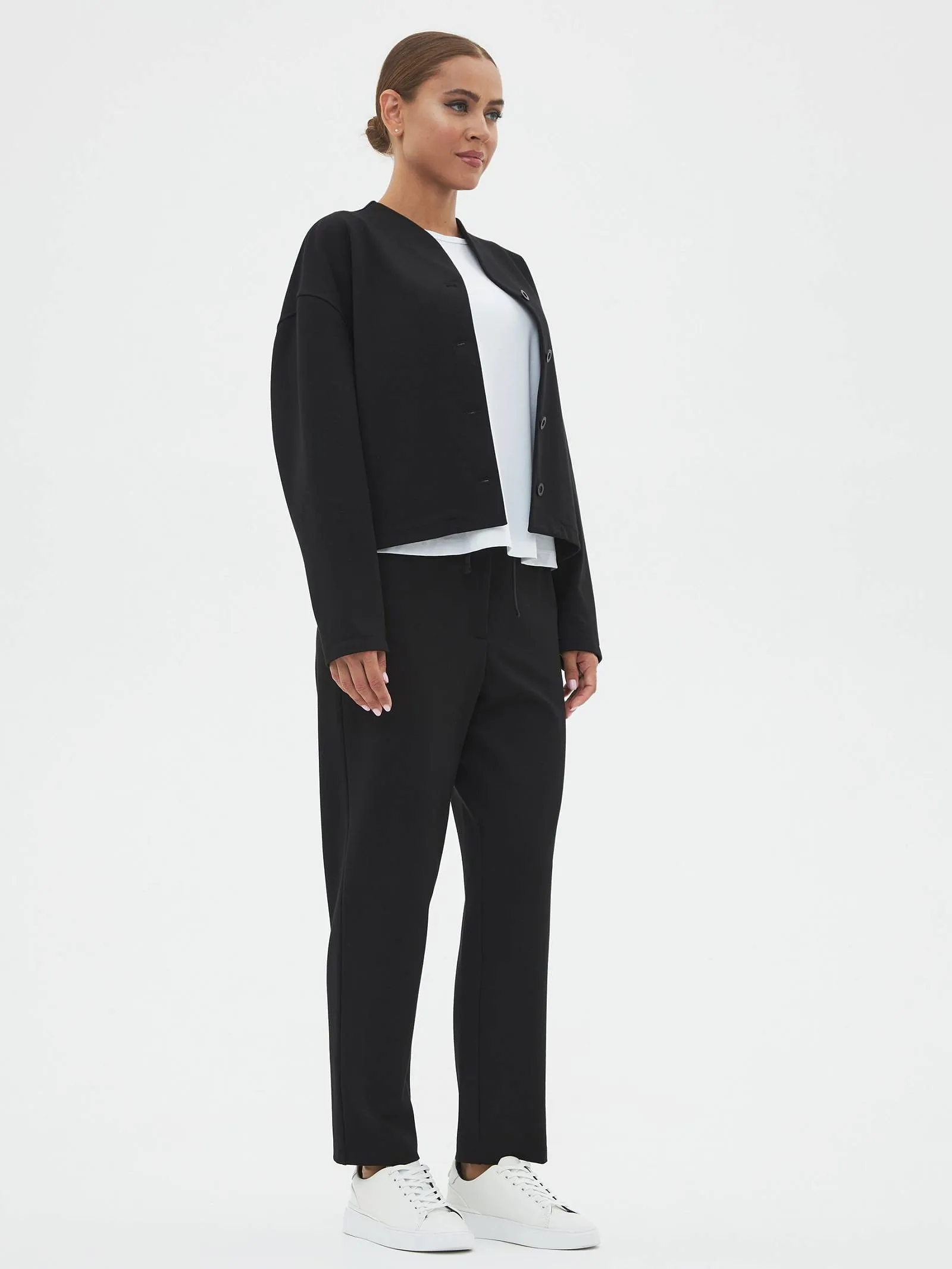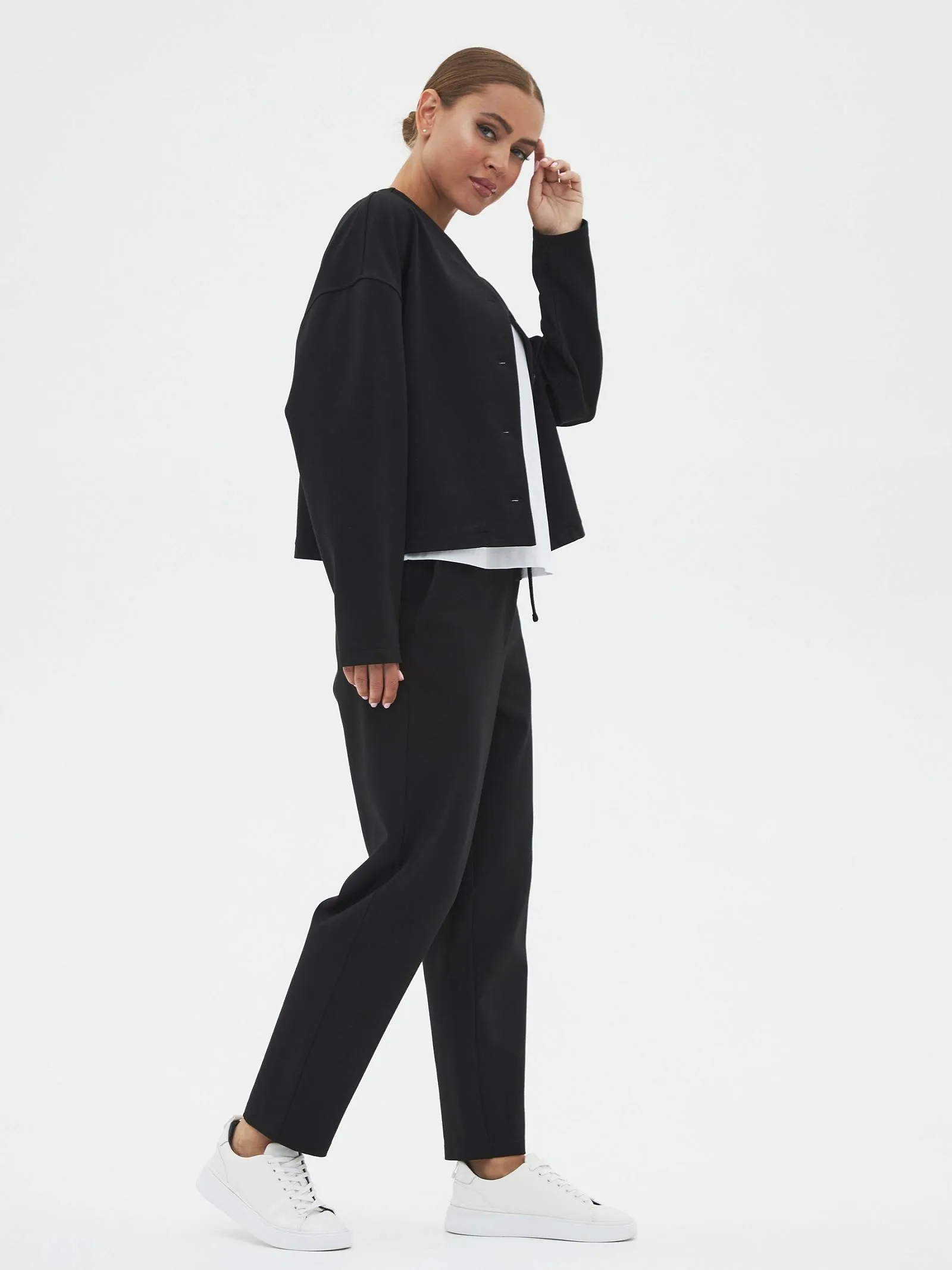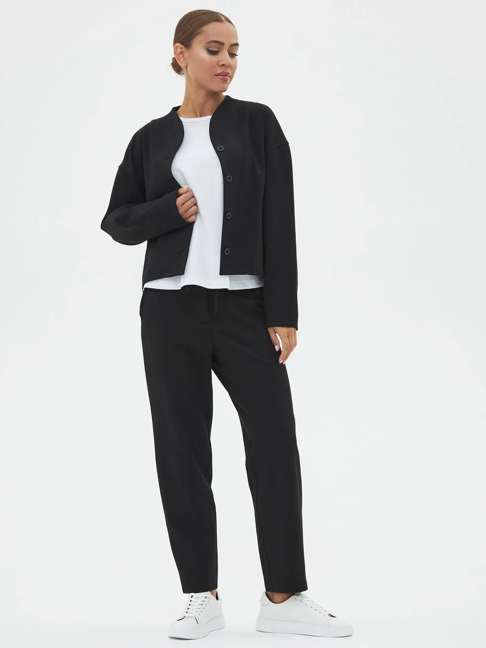 Трикотажные женские брюки созданы для максимального комфорта и стиля. Слегка зауженные к низу, они удачно подчеркивают фигуру, а их длина делает их идеальными для повседневной носки. Застегиваются на одну пуговицу и молнию, обеспечивая надежную фиксацию. Особенностью является пояс с регулируемой шириной, спереди дополнены шнурком, который крепится на эластичную резинку с внутренней стороны, что добавляет удобства в посадке. Задняя часть пояса также выполнена на эластичной резинке для дополнительного комфорта и гибкости. Эти брюки идеально подойдут для динамичного дня, сочетаются как с повседневной, так и с более элегантной одеждой.