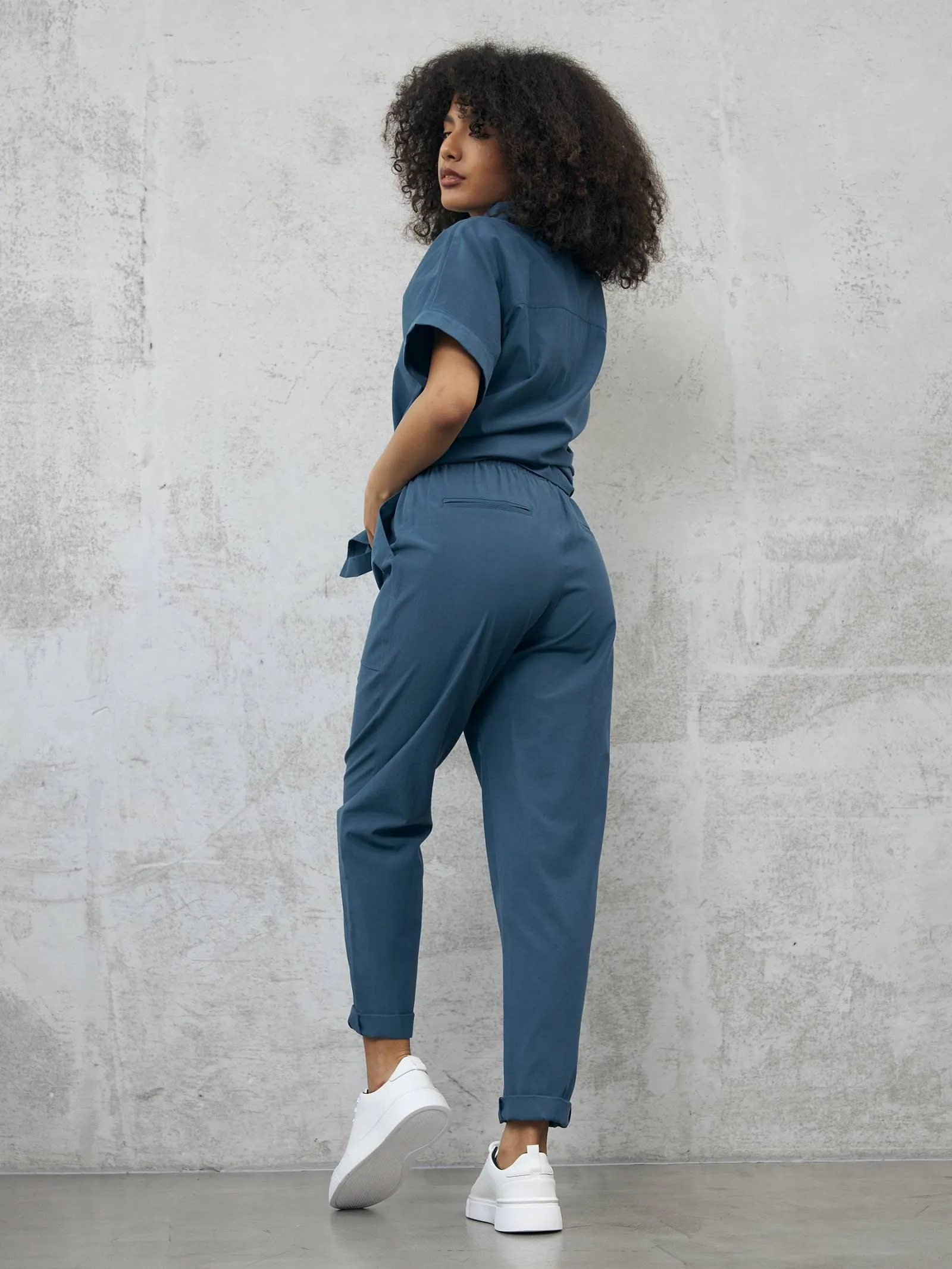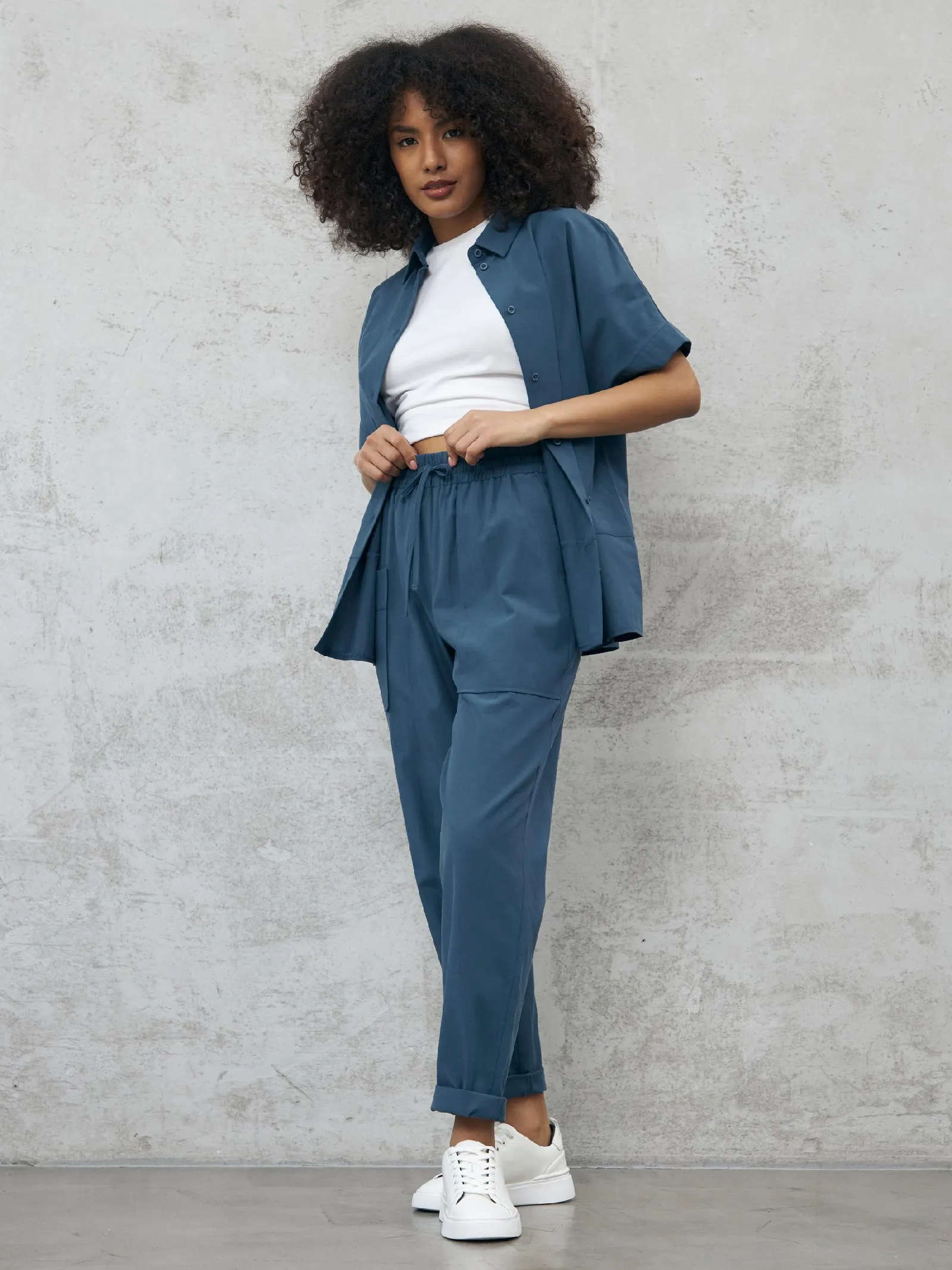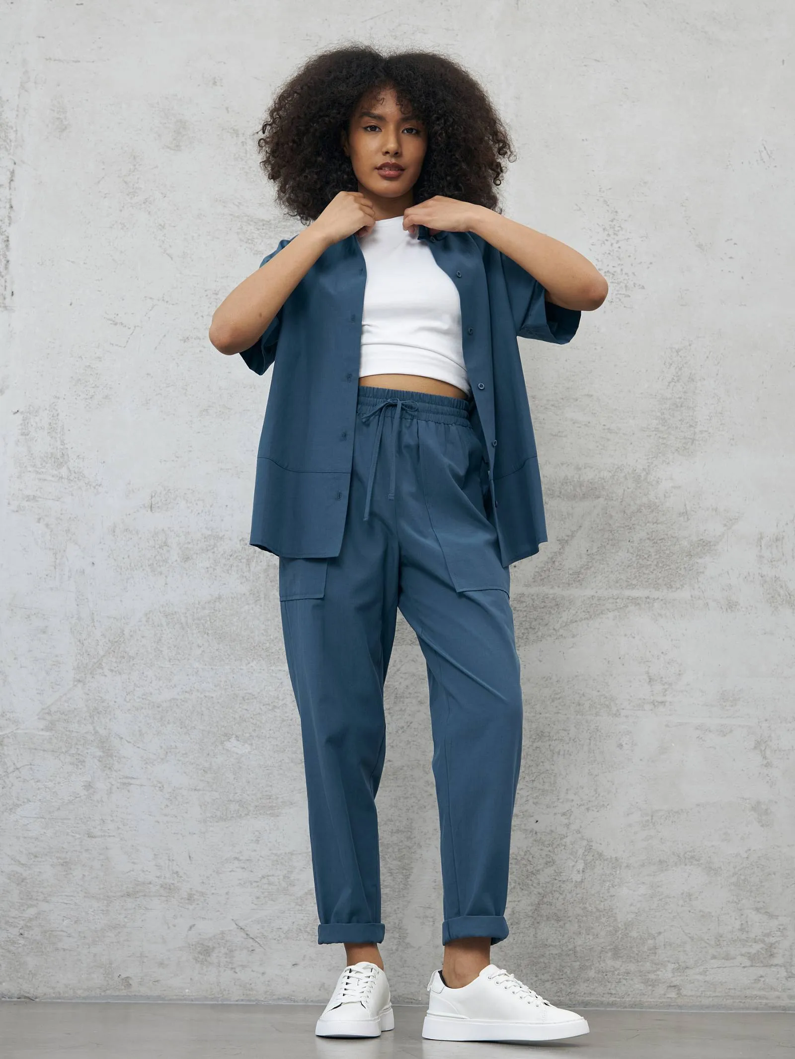 Свободные брюки на резинке с возможностью регулирования по фигуре и оригинально оформленными карманами. Модель выполнена из натуральных материалов: дышащего льна и мягкого хлопка в морском оттенке. Подойдет для создания расслабленном образов в спортивном и повседневном стилях. Отлично смотрится в комплекте с блузой-рубашкой в том же цвете.