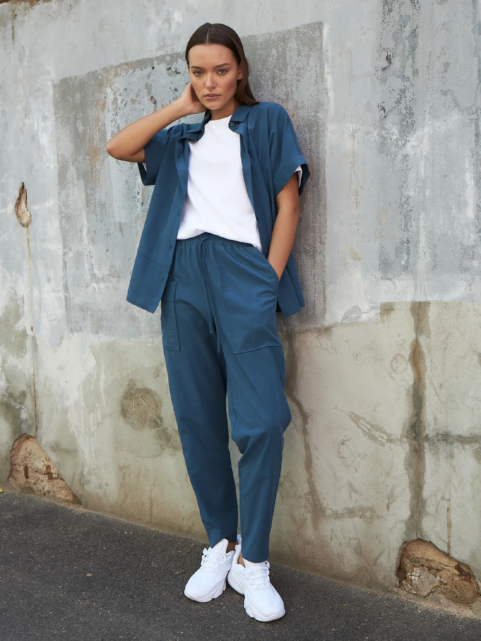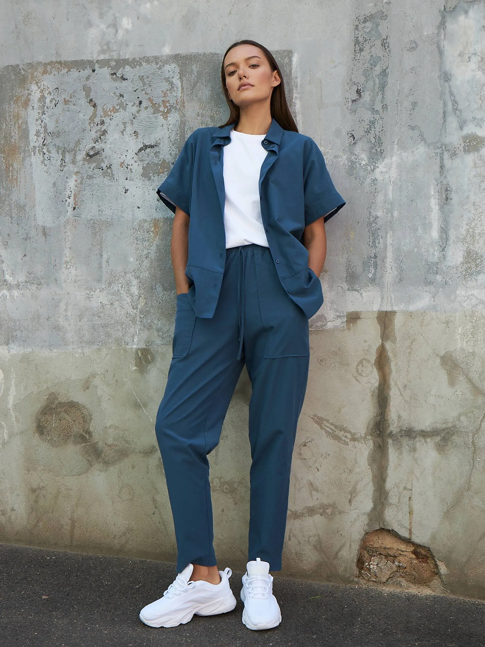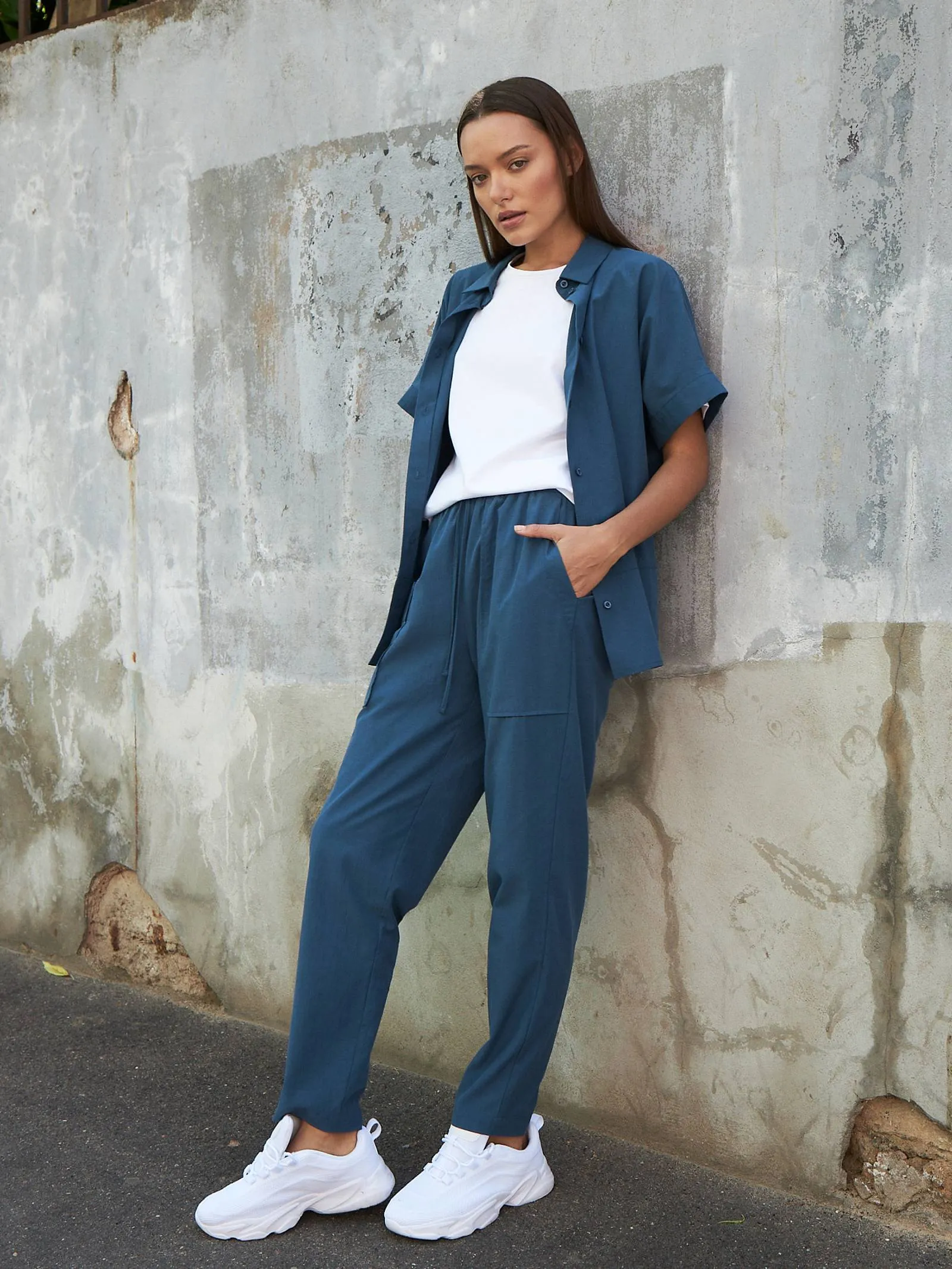 Свободные брюки на резинке с возможностью регулирования по фигуре и оригинально оформленными карманами. Модель выполнена из натуральных материалов: дышащего льна и мягкого хлопка в морском оттенке. Подойдет для создания расслабленном образов в спортивном и повседневном стилях. Отлично смотрится в комплекте с блузой-рубашкой в том же цвете.
