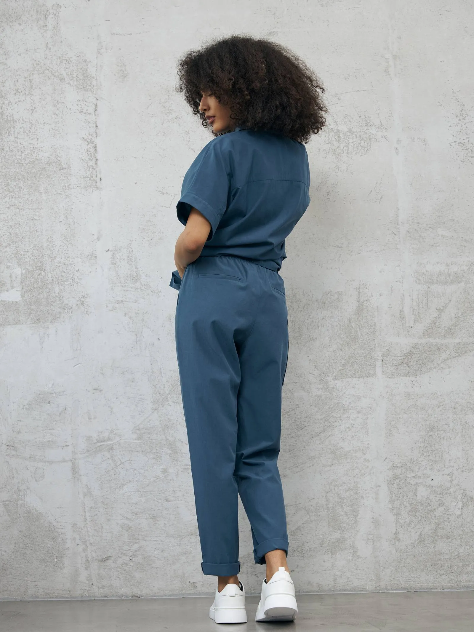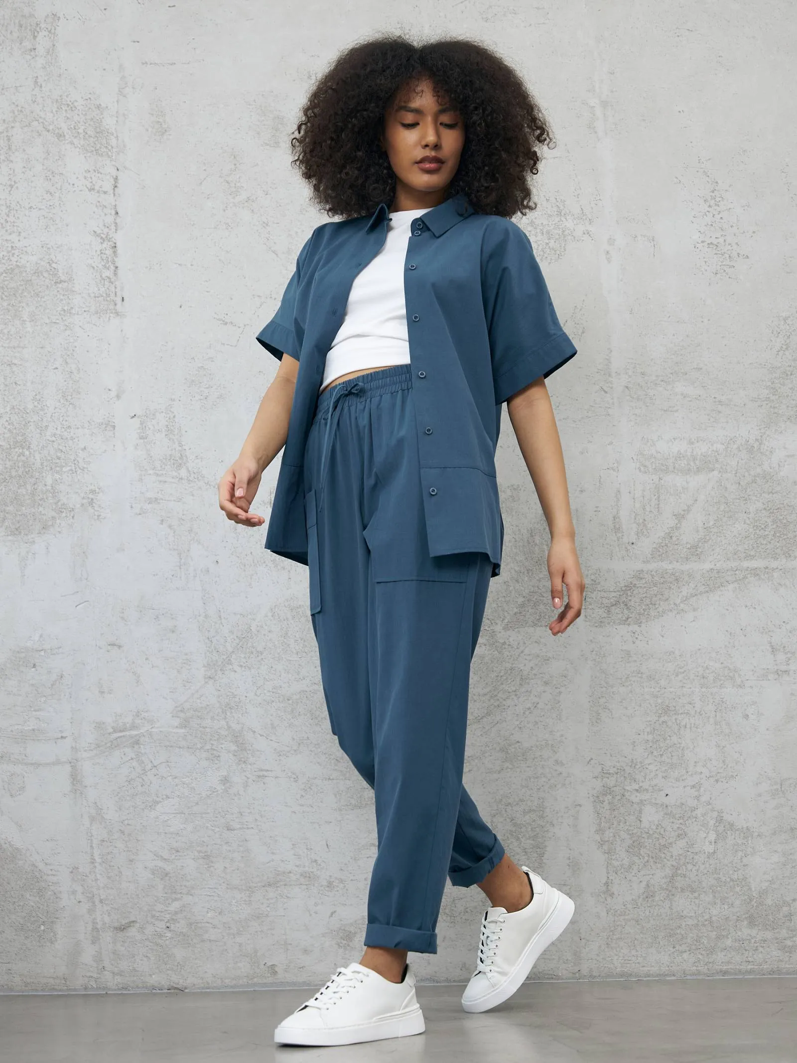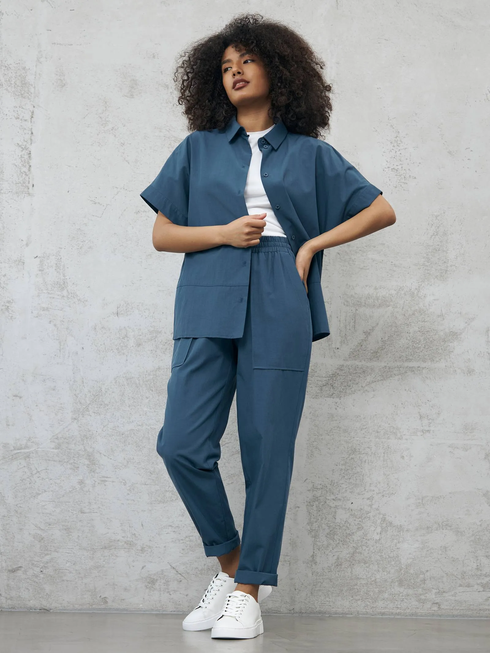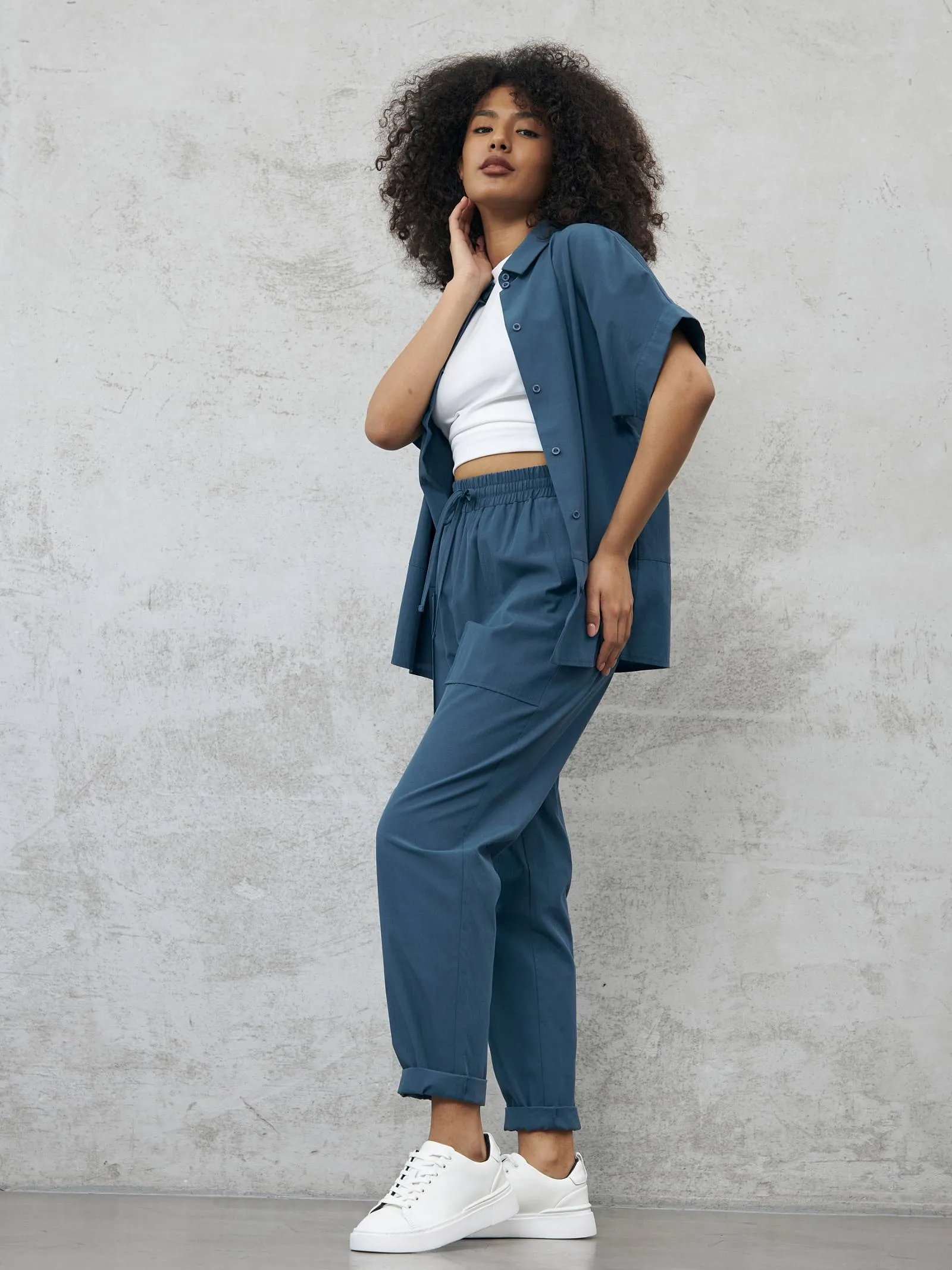 Свободные брюки на резинке с возможностью регулирования по фигуре и оригинально оформленными карманами. Модель выполнена из натуральных материалов: дышащего льна и мягкого хлопка в морском оттенке. Подойдет для создания расслабленном образов в спортивном и повседневном стилях. Отлично смотрится в комплекте с блузой-рубашкой в том же цвете.