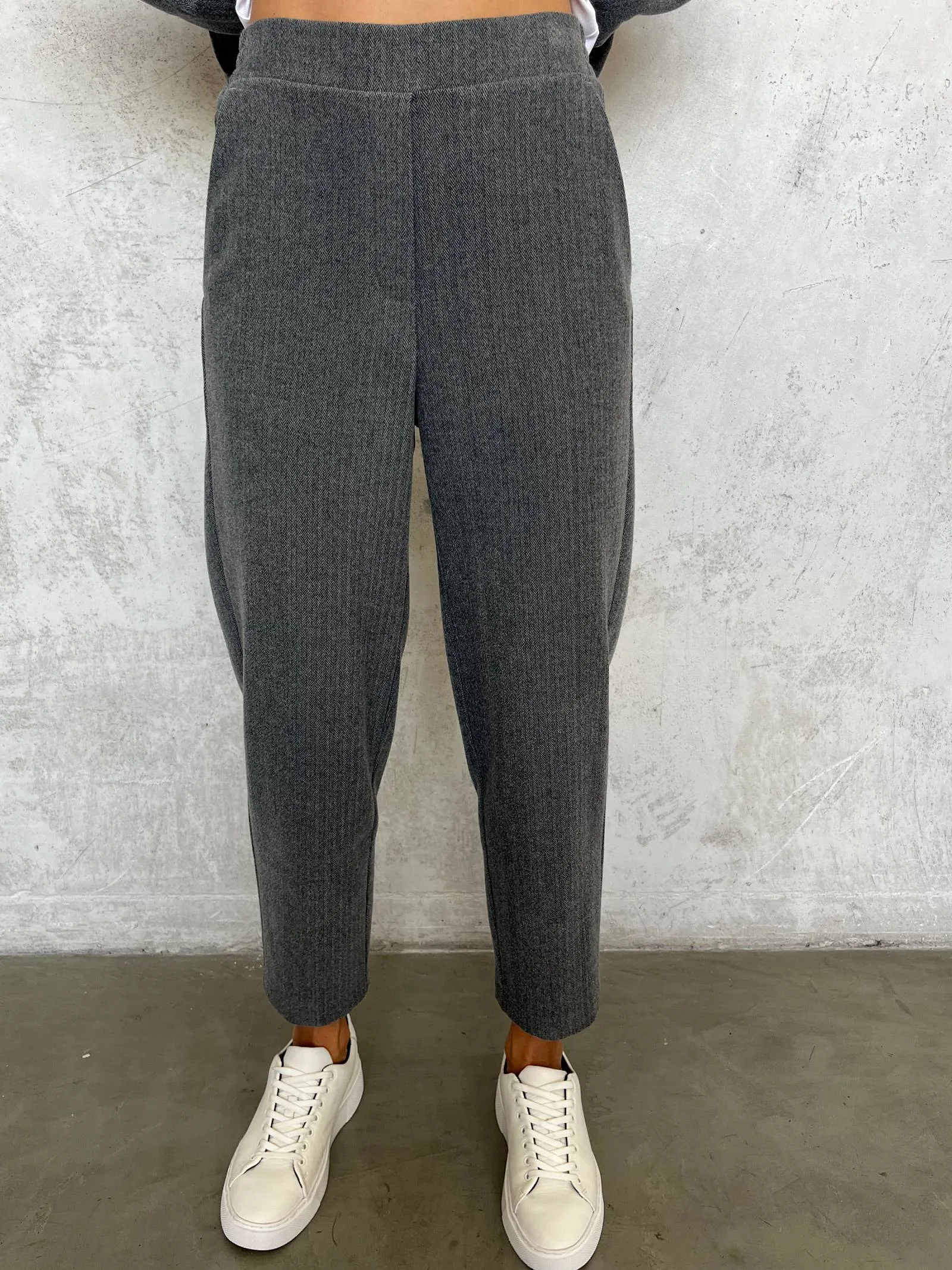 Укороченные брюки-бананы про комфорт и мягкую архитектуру силуэта. Лёгкое расширение к бедру и аккуратное сужение к низу создают расслабленную, современную линию. Пояс на резинке обеспечивает удобную посадку, карманы добавляют практичности.