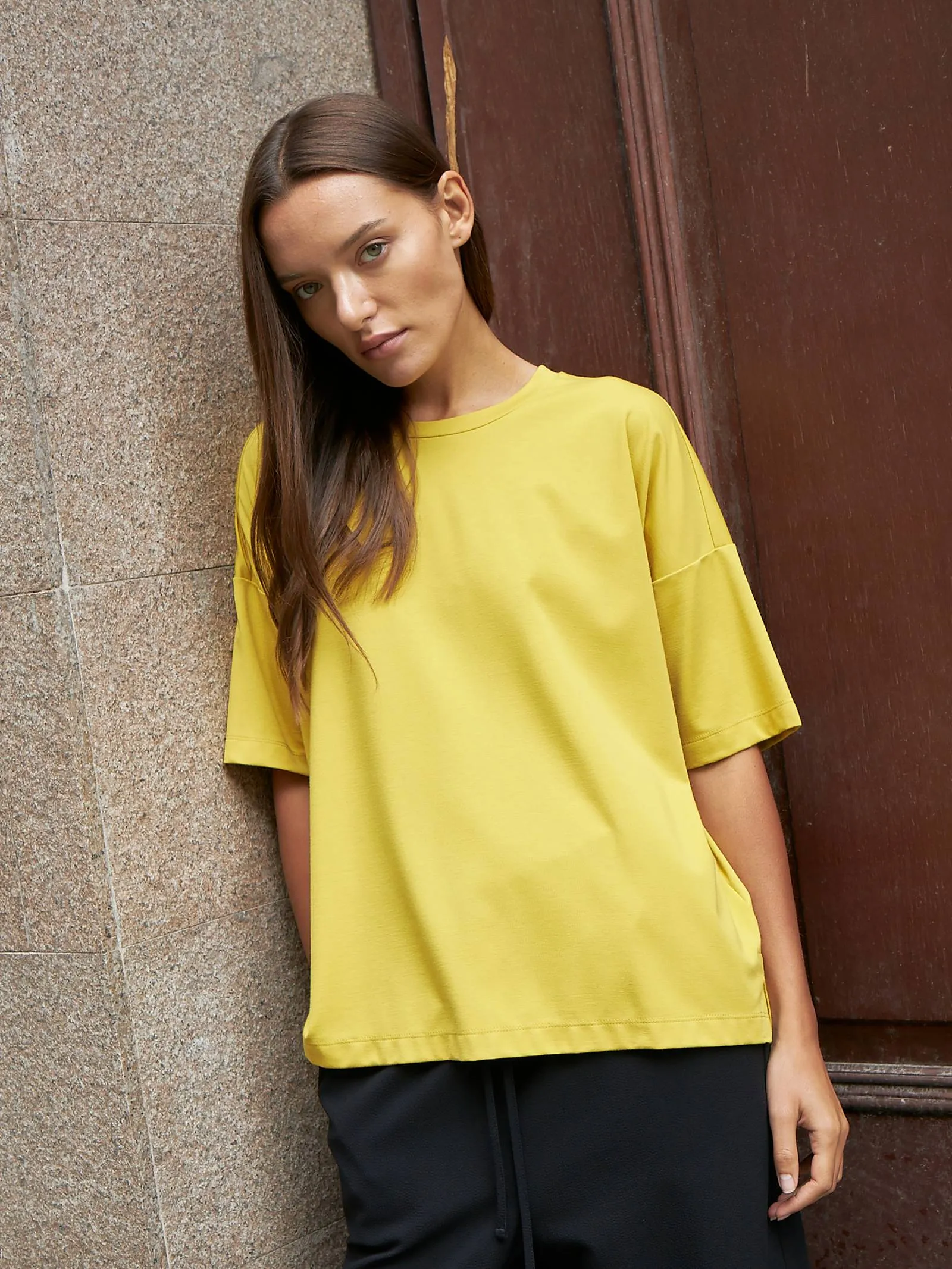 Базовая оверсайз футболка с круглым вырезом, удлиненной спинкой и боковыми разрезами. Модель выполнена в светлых оттенках из мягкой и практичной ткани, в составе которой органический хлопок, прочный нейлон и тянущейся эластан. Подойдет для создания базовых образов в сочетании с брюками или юбками в спортивном и повседневном стилях.