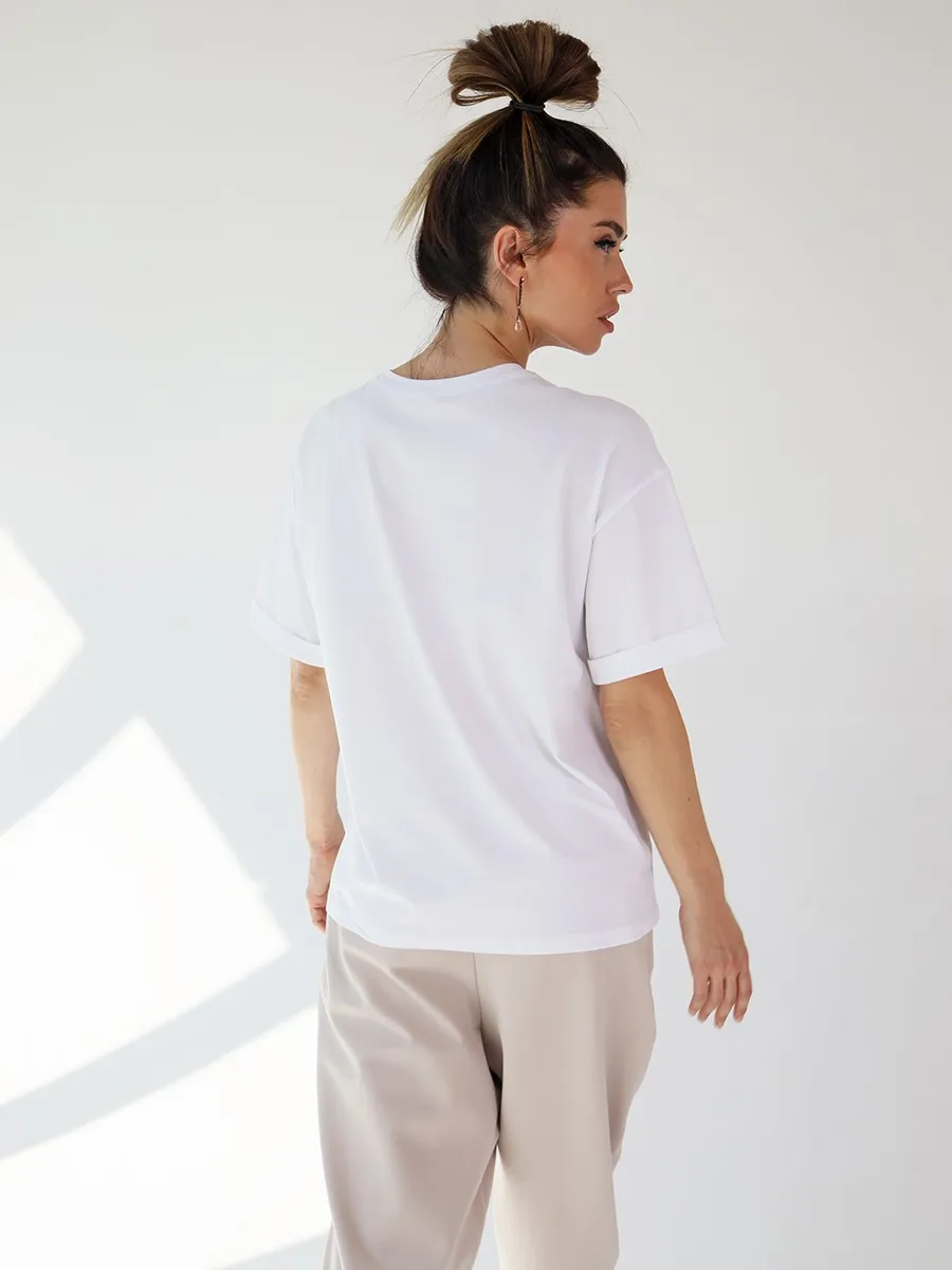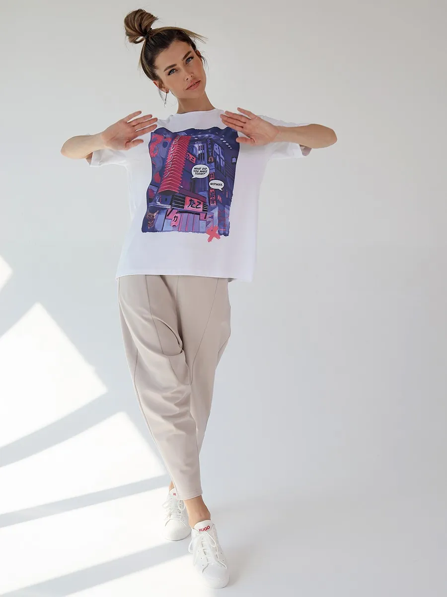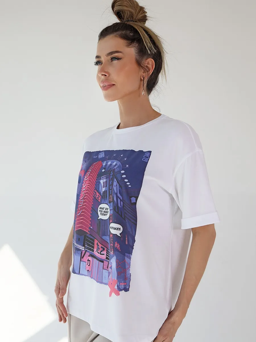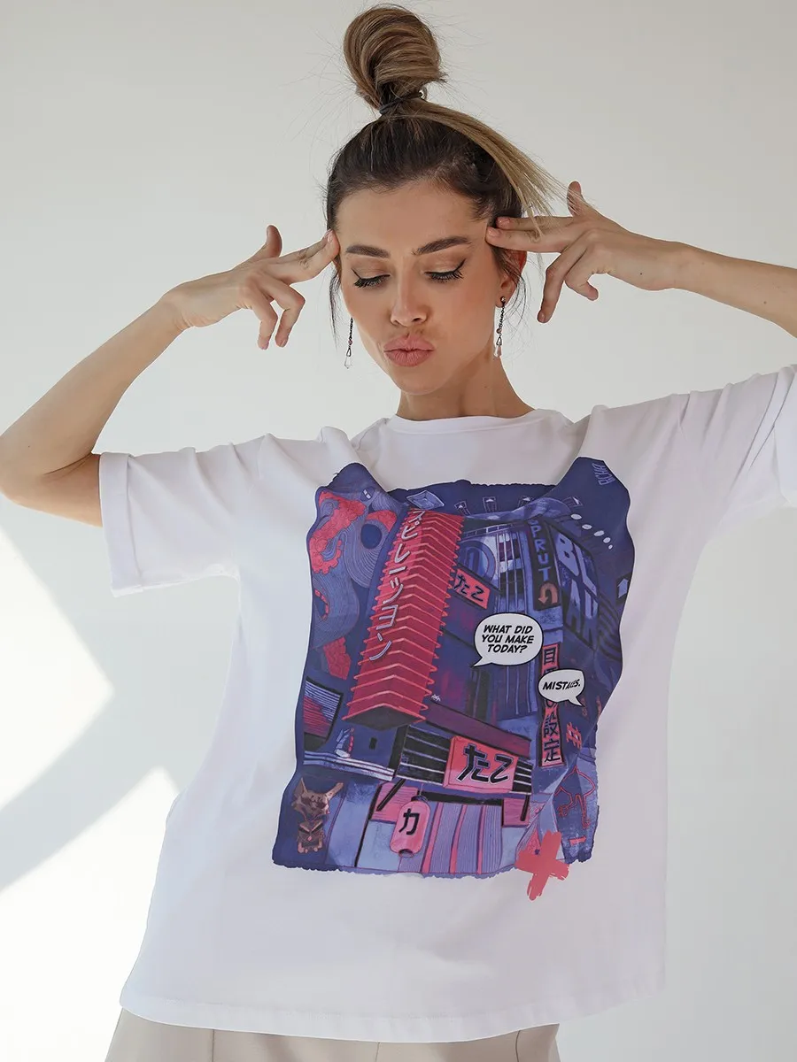 Футболка oversize с уникальным принтом. Изделие выполнено из ткани премиального качества с эффектом "антипиллинг". Отлично смотрится с шортами или комфортными брюками.