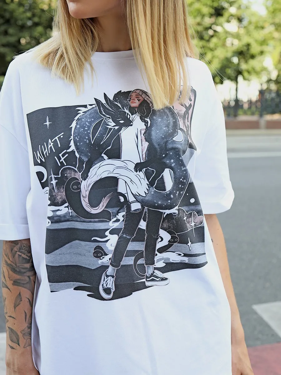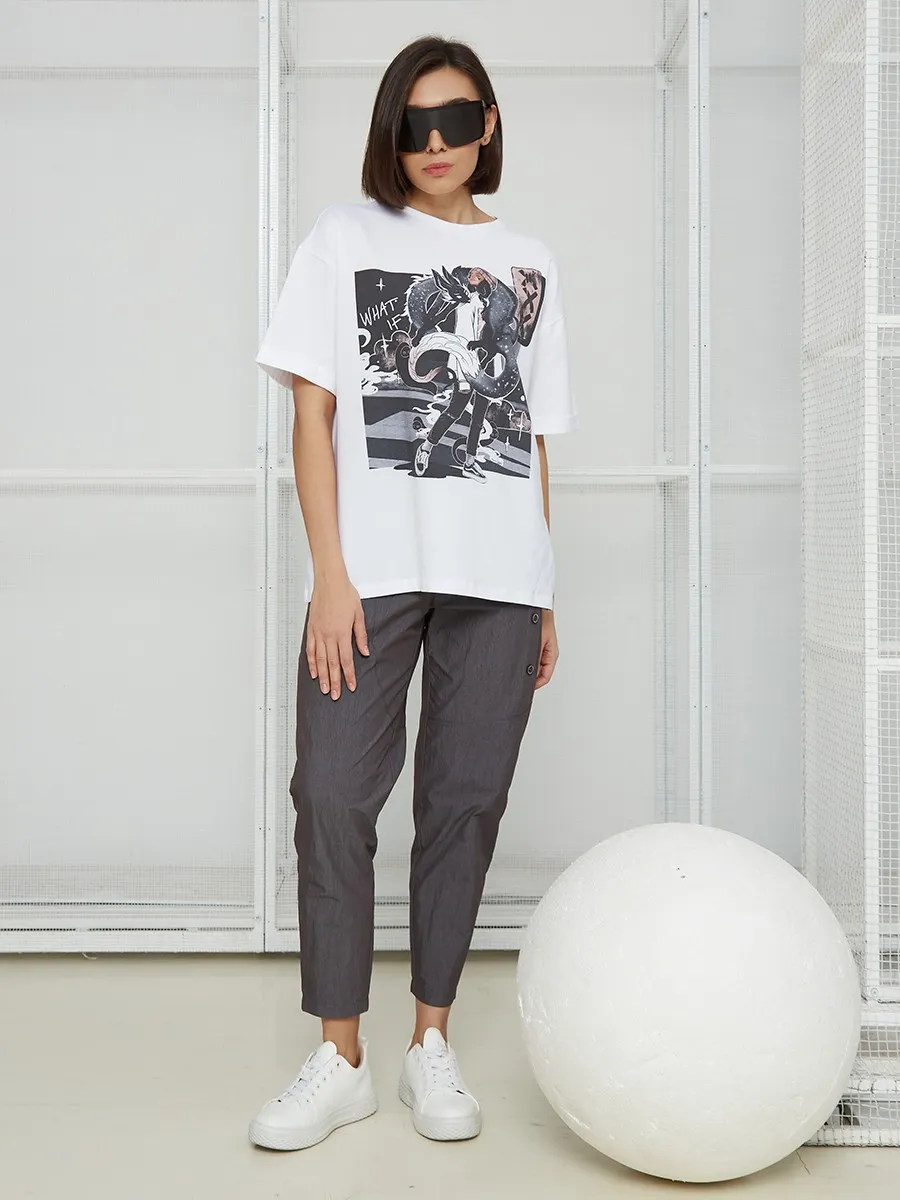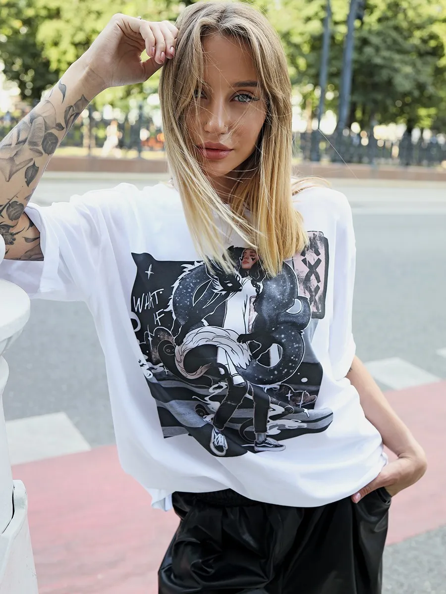 Футболка oversize с уникальным принтом. Изделие выполнено из ткани премиального качества с эффектом "антипиллинг". Отлично смотрится с шортами или комфортными брюками.