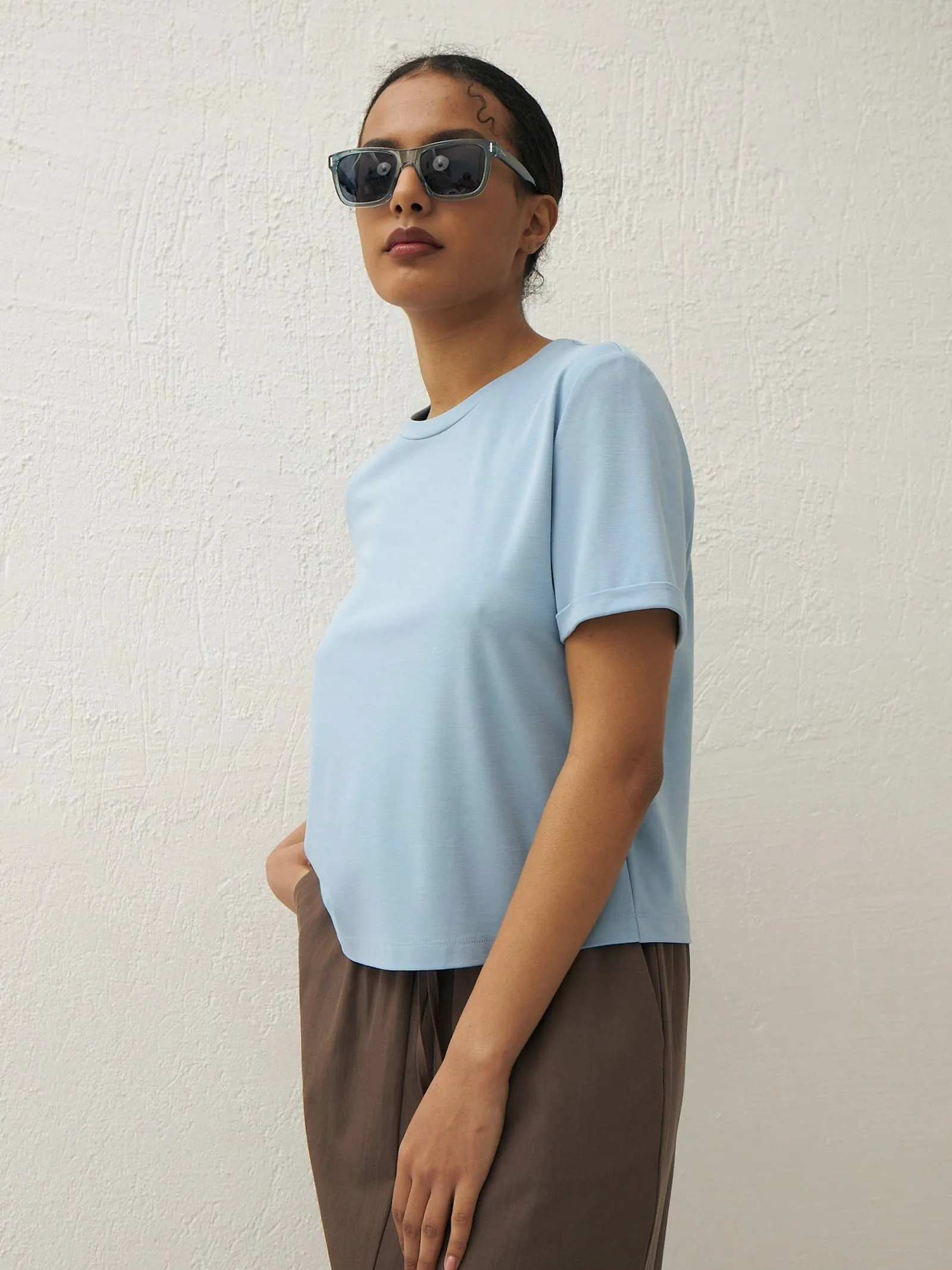 Комфортная футболка свободного кроя с круглым вырезом и коротким рукавом. Модель выполнена из органического хлопка, прочного нейлона и тянущегося эластана в пастельном оттенке. Футболка подойдет для создания базовых образов в сочетании с сарафанами, стильными брюками и юбками Gezalook by UDGY.