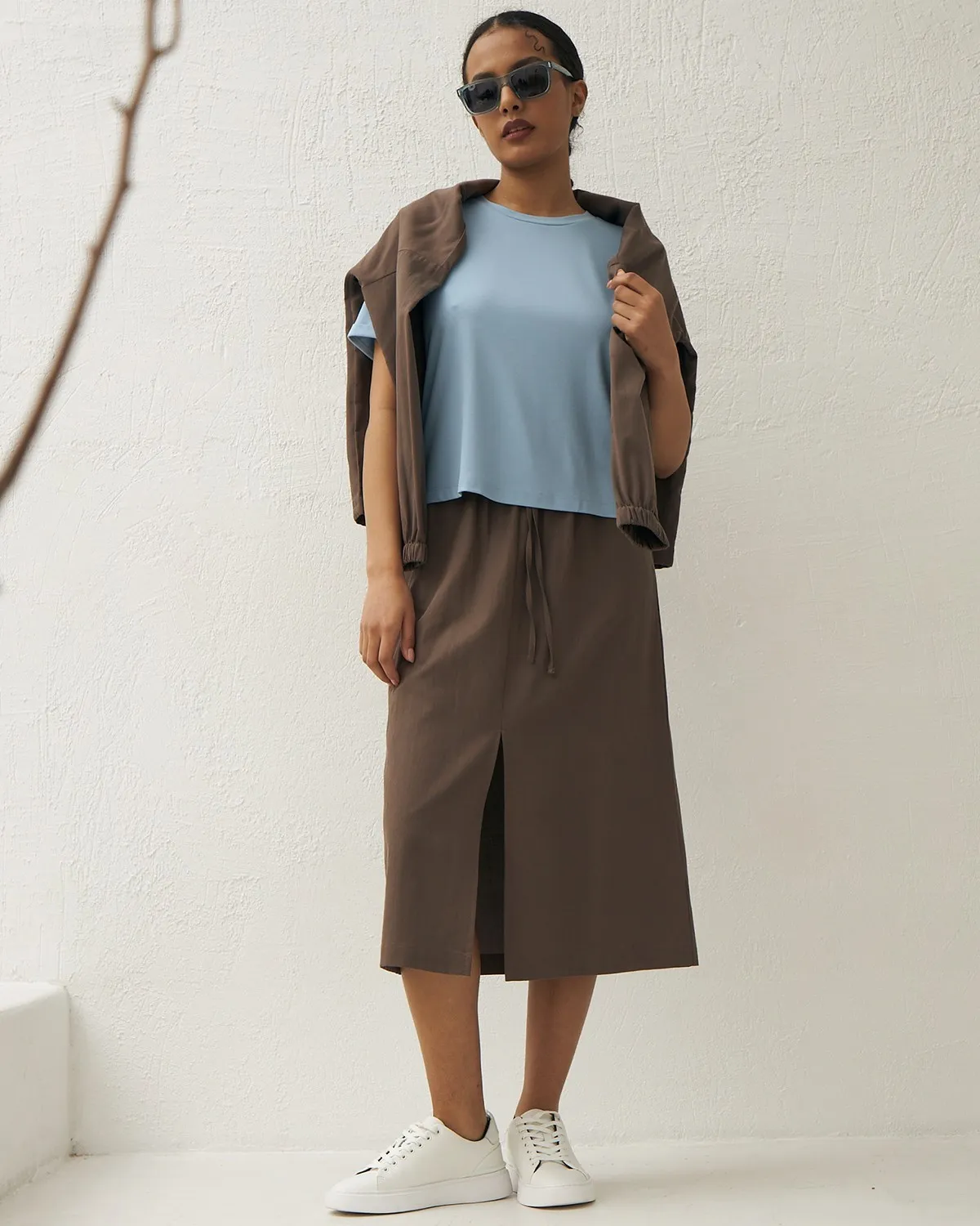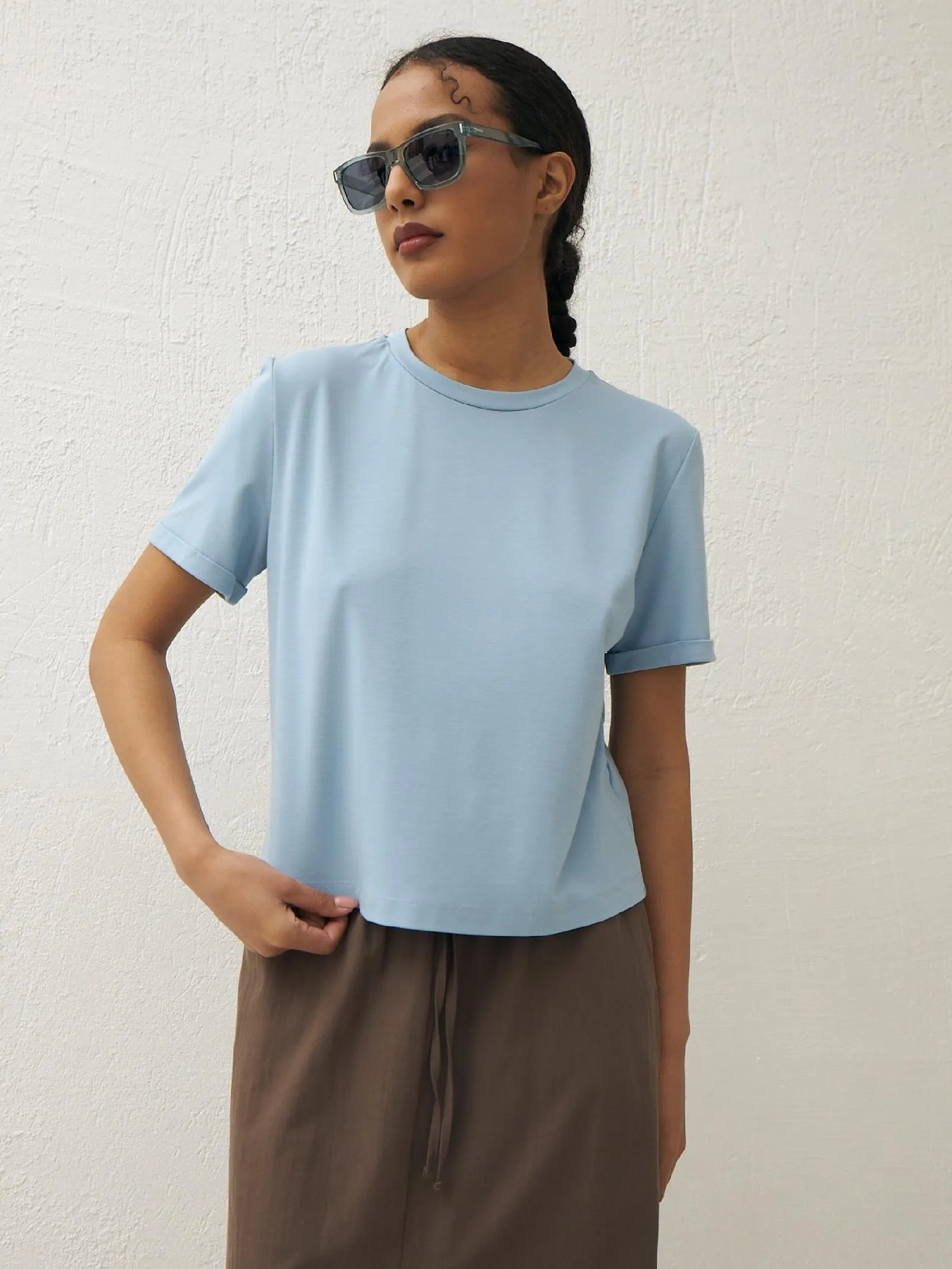 Комфортная футболка свободного кроя с круглым вырезом и коротким рукавом. Модель выполнена из органического хлопка, прочного нейлона и тянущегося эластана в пастельном оттенке. Футболка подойдет для создания базовых образов в сочетании с сарафанами, стильными брюками и юбками Gezalook by UDGY.