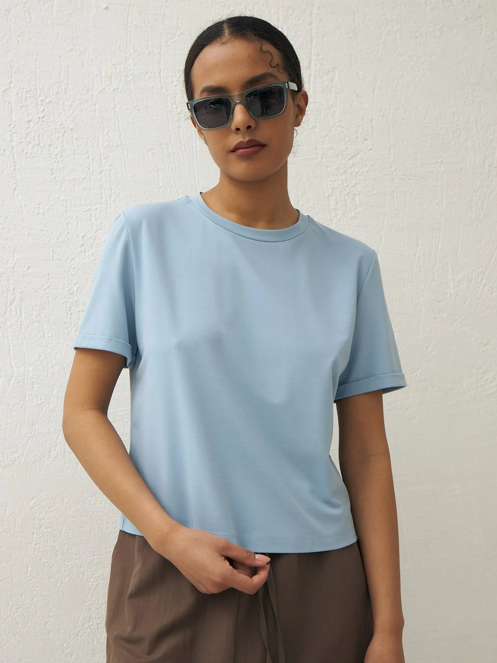 Комфортная футболка свободного кроя с круглым вырезом и коротким рукавом. Модель выполнена из органического хлопка, прочного нейлона и тянущегося эластана в пастельном оттенке. Футболка подойдет для создания базовых образов в сочетании с сарафанами, стильными брюками и юбками Gezalook by UDGY.