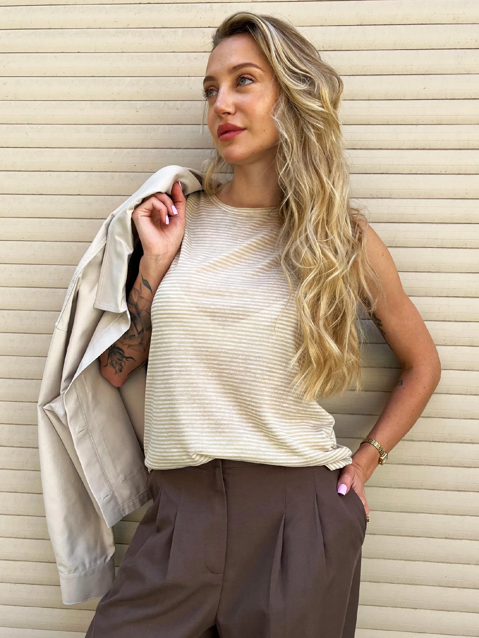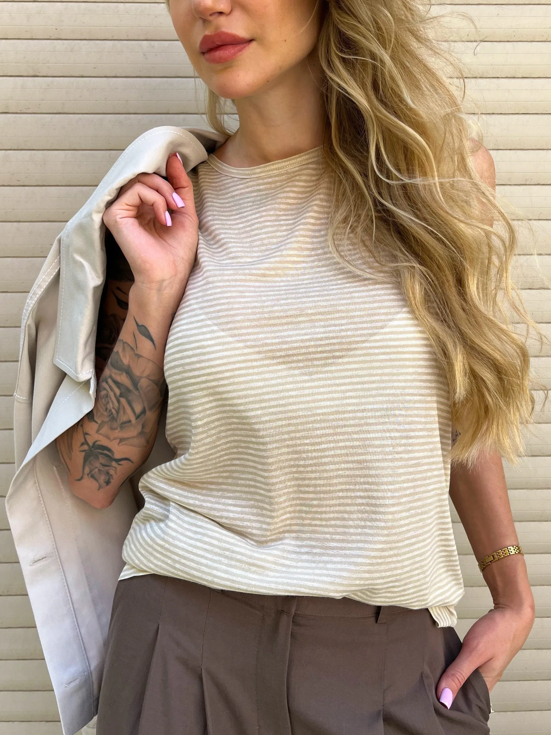 Свободный топ без рукавов с круглым вырезом. Модель выполнена из нежной и прочной струящейся ткани, в составе которой дышащий модал и износостойкий полиэстер. Топ подойдет для создания спортивных и повседневных образов в сочетании с брюками и юбками. В прохладную погоду наверху можно надеть блузу-рубашку или жакет.