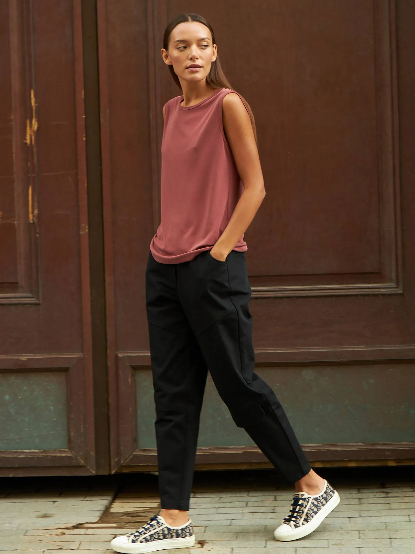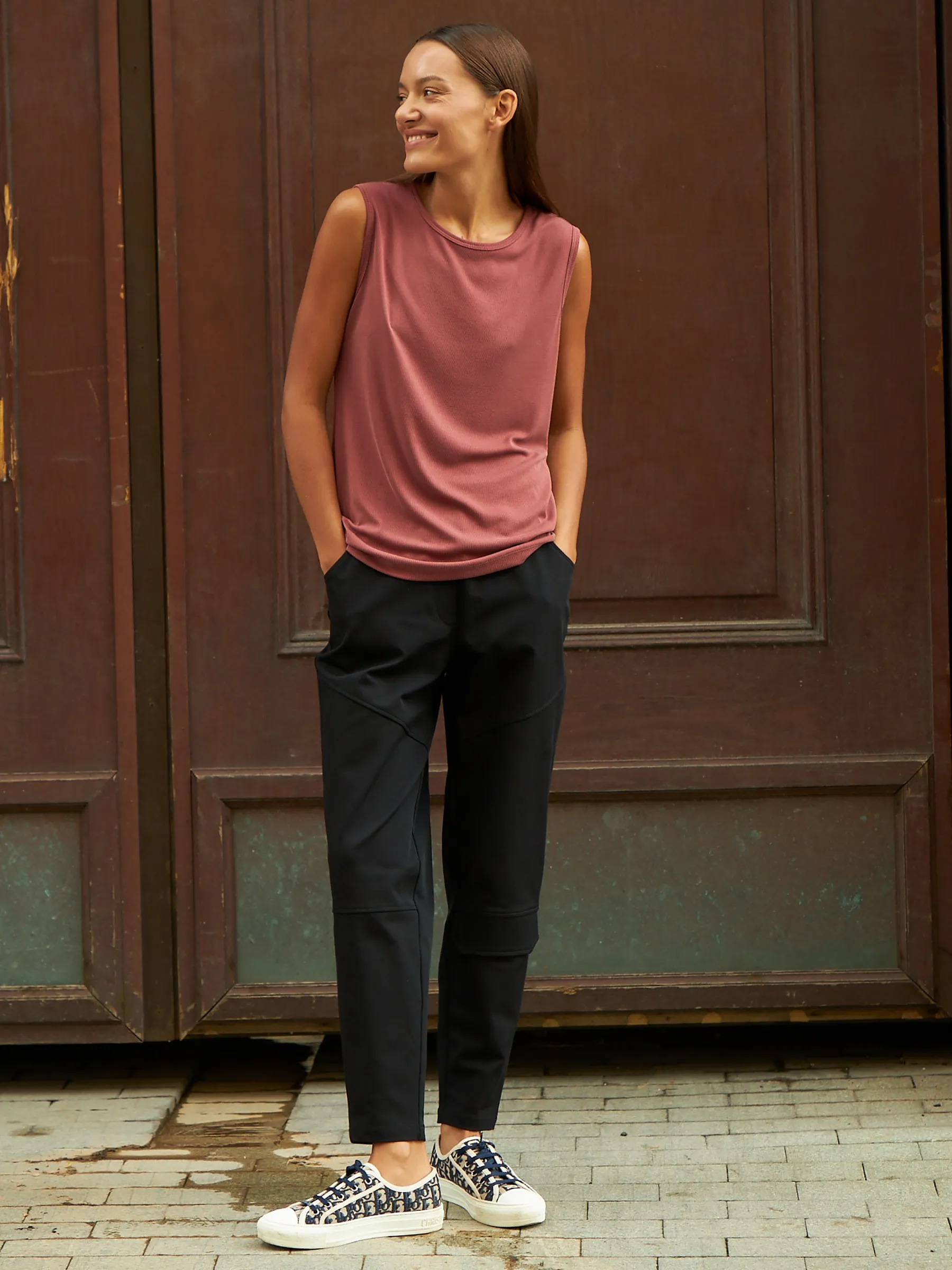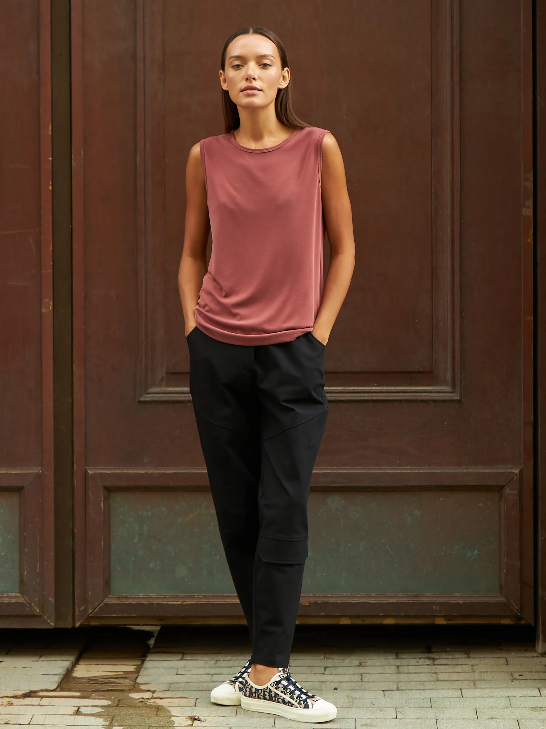 Свободный топ без рукавов с круглым вырезом. Модель выполнена из нежной и прочной струящейся ткани, в составе которой дышащий модал и износостойкий полиэстер. Топ подойдет для создания спортивных и повседневных образов в сочетании с брюками и юбками. В прохладную погоду наверху можно надеть блузу-рубашку или жакет.