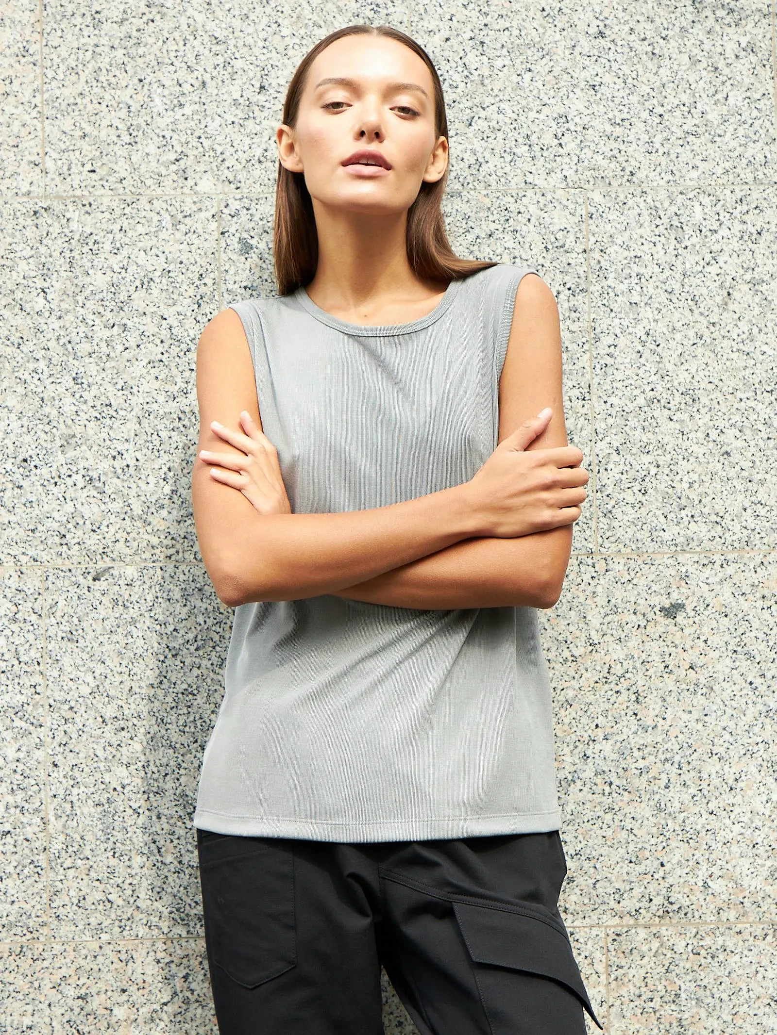 Свободный топ без рукавов с круглым вырезом. Модель выполнена из нежной и прочной струящейся ткани, в составе которой дышащий модал и износостойкий полиэстер. Топ подойдет для создания спортивных и повседневных образов в сочетании с брюками и юбками. В прохладную погоду наверху можно надеть блузу-рубашку или жакет.