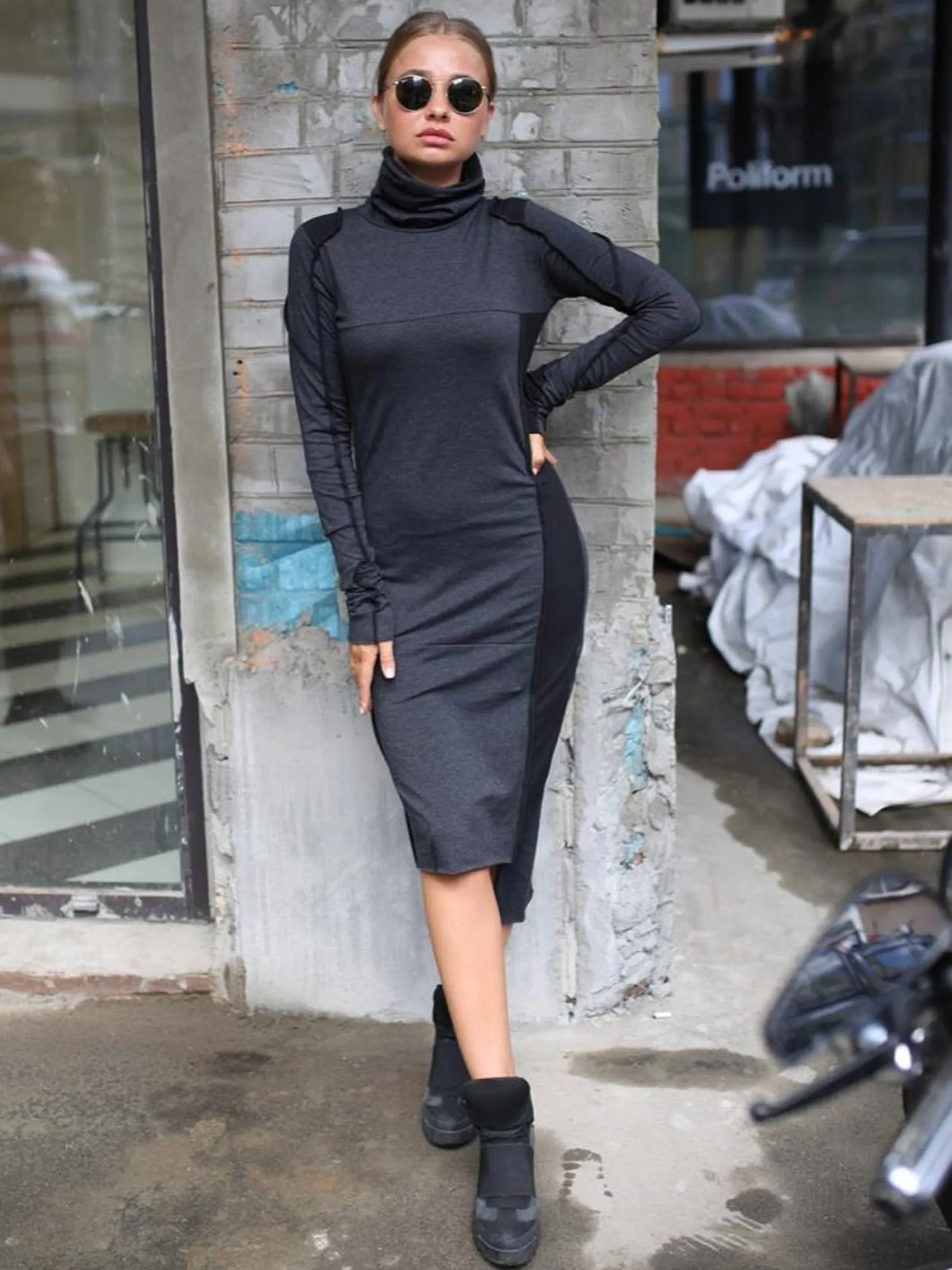 Облегающее комбинированное платье станет стильным решением для повседневного гардероба. Модель отличается оригинальным дизайном: длина подола варьируется спереди и сзади, создавая эффект динамичности и лёгкости. Вертикальный воротник аккуратно ложится вокруг шеи мягкими складками, добавляя образу элегантности. Контрастные вставки на рукавах и боковых сторонах из чёрного материала эффектно подчёркивают основу из серого цвета, делая платье универсальным для разных случаев. Сочетайте эту модель с высокими ботинками и вместительной сумкой для создания завершённого стильного лука.