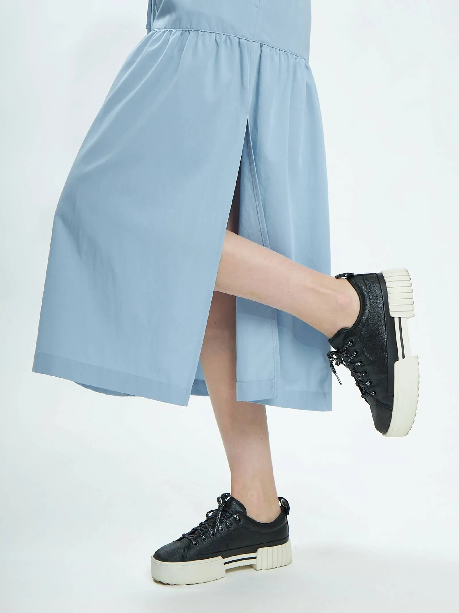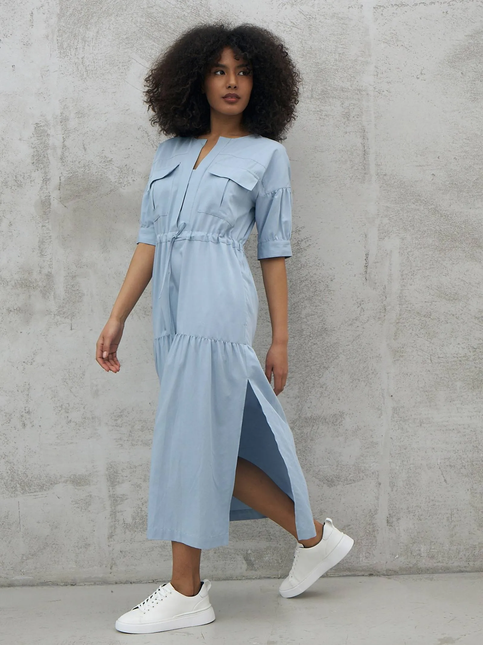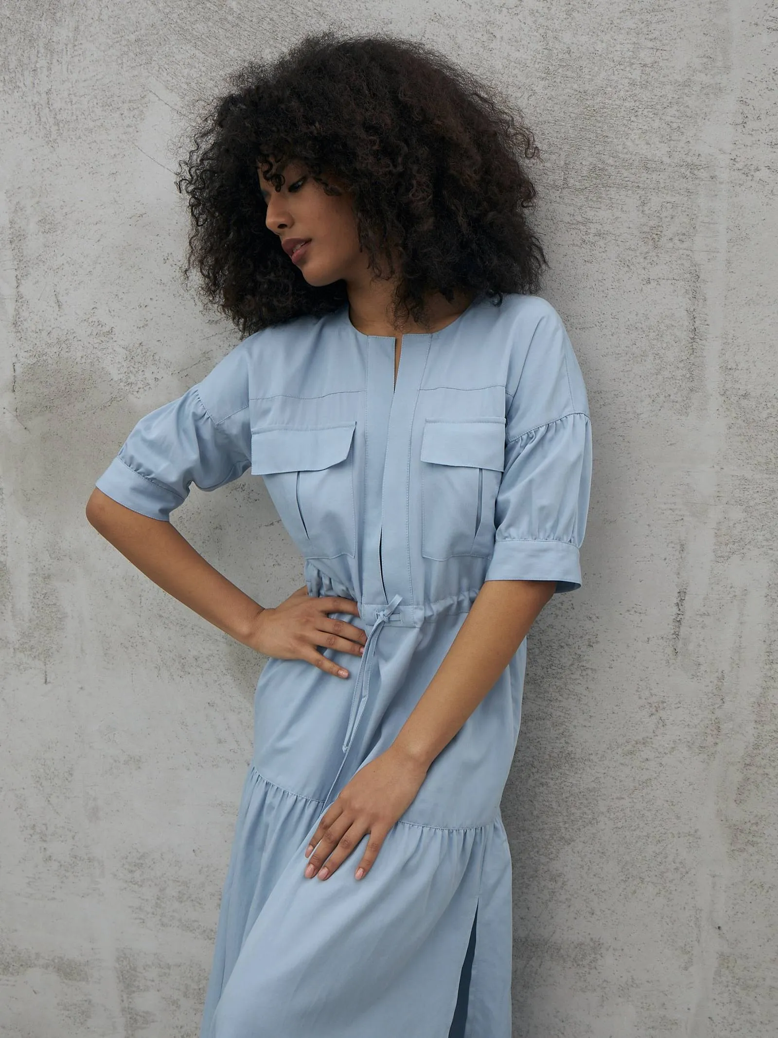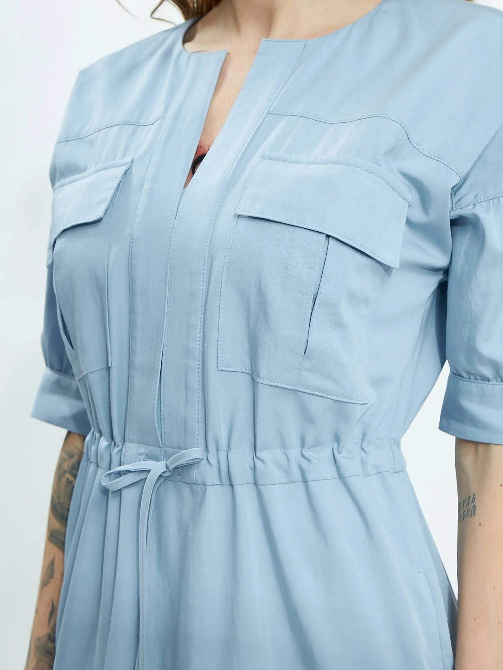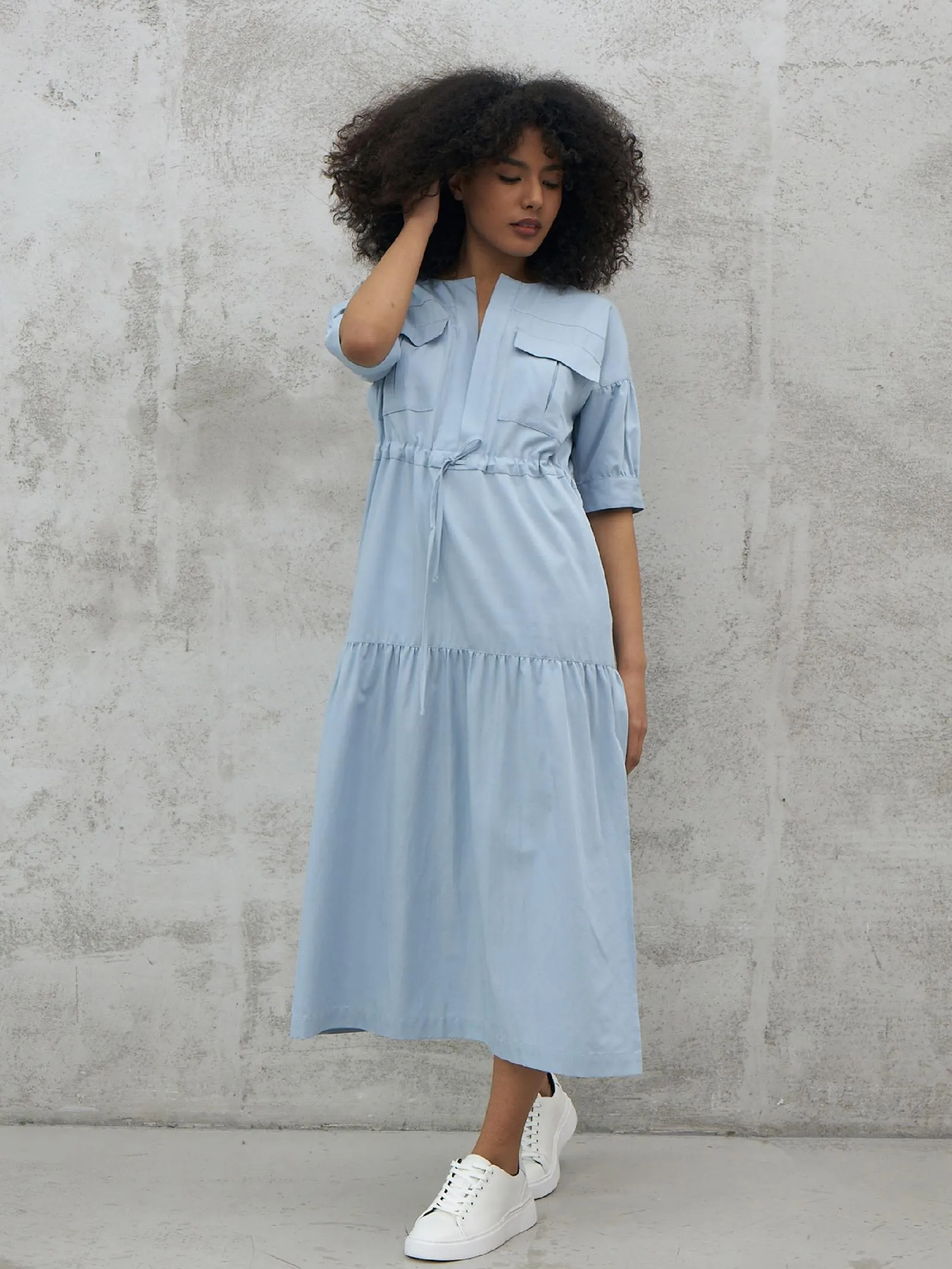 Голубое платье длины миди с геометрическим вырезом, оригинальными накладными карманами на груди, коротким рукавом с манжетами и вшитым шнурком на талии с возможностью регулирования. Модель с нежными сборками и декоративными строчками выполнена из органических и натуральных материалов — мягкого хлопка и шелковистого тенселя.