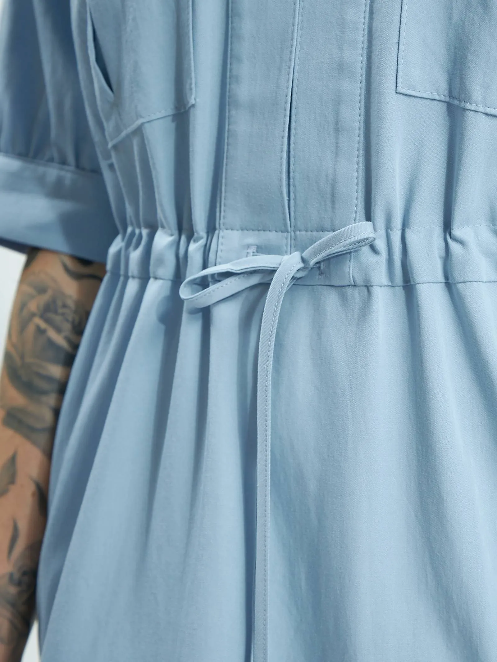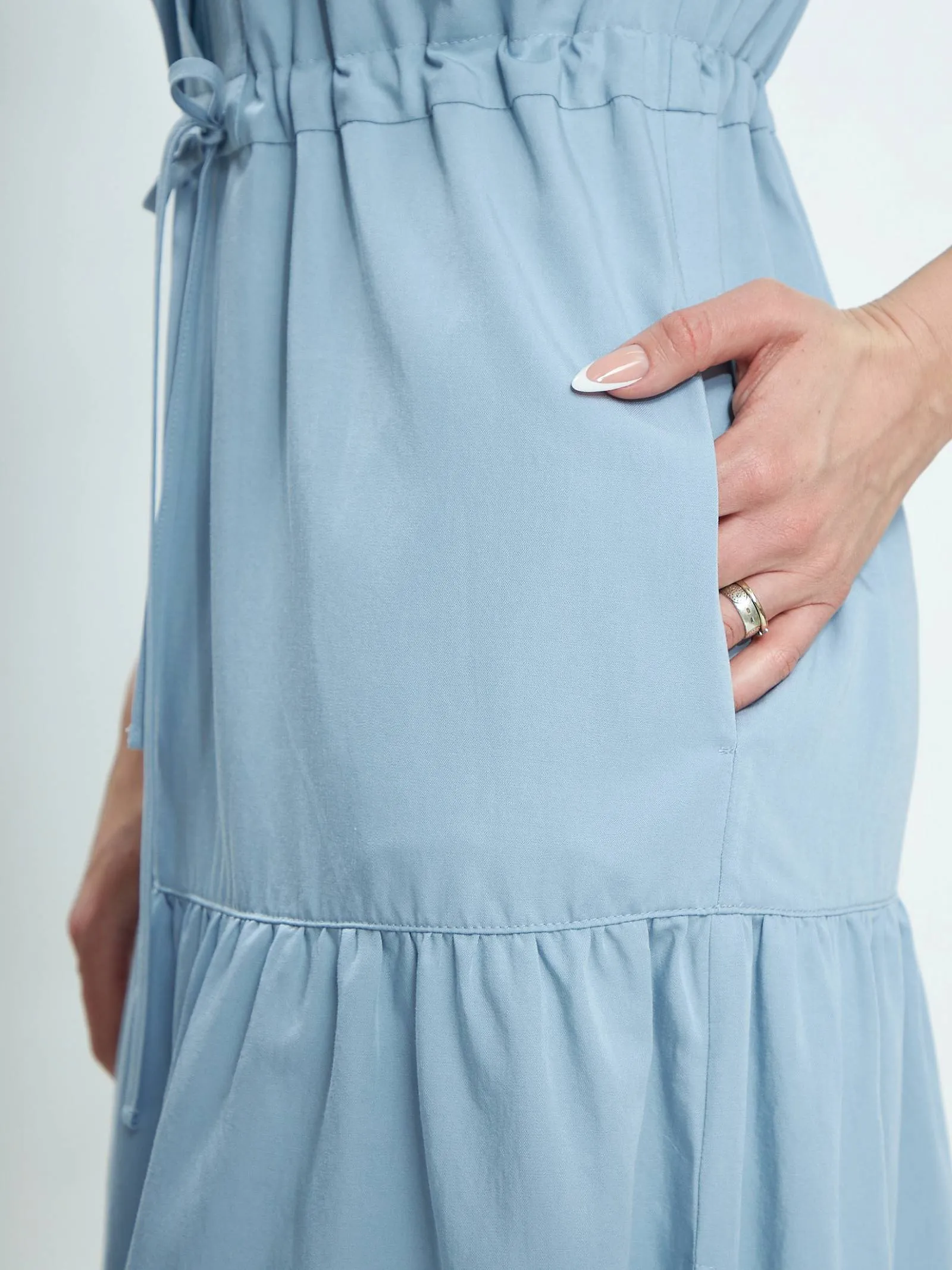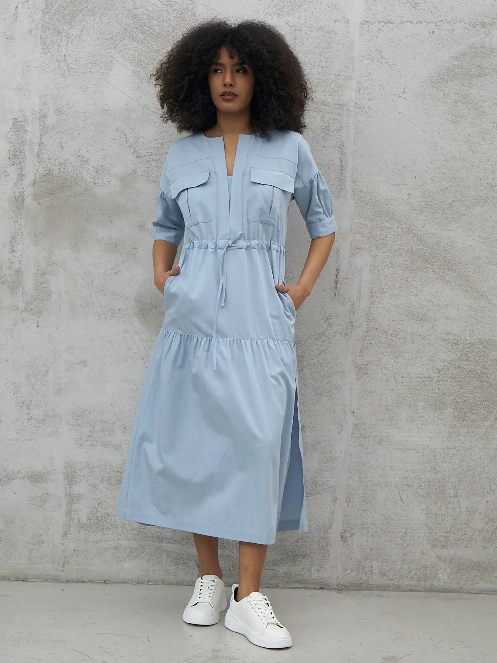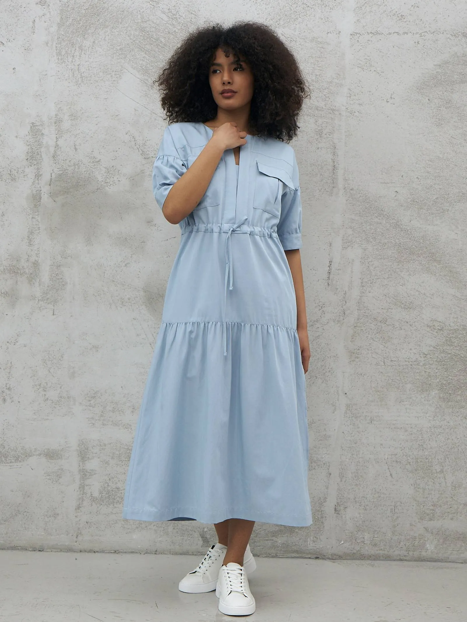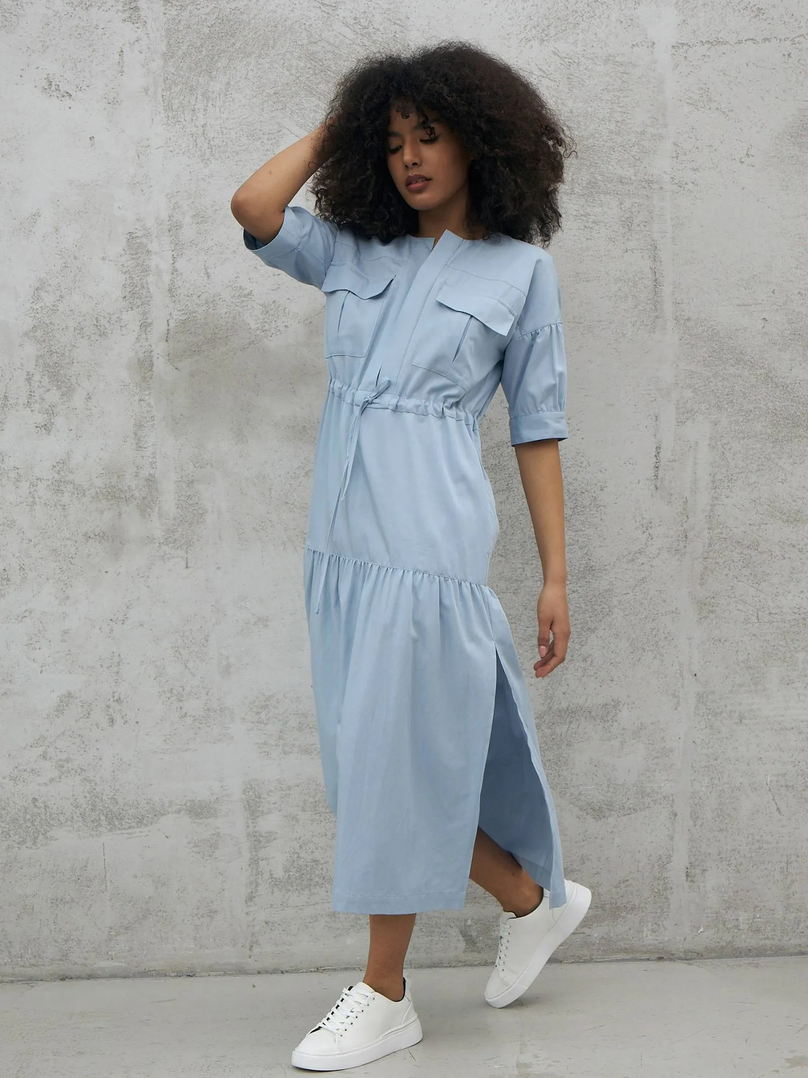 Голубое платье длины миди с геометрическим вырезом, оригинальными накладными карманами на груди, коротким рукавом с манжетами и вшитым шнурком на талии с возможностью регулирования. Модель с нежными сборками и декоративными строчками выполнена из органических и натуральных материалов — мягкого хлопка и шелковистого тенселя.