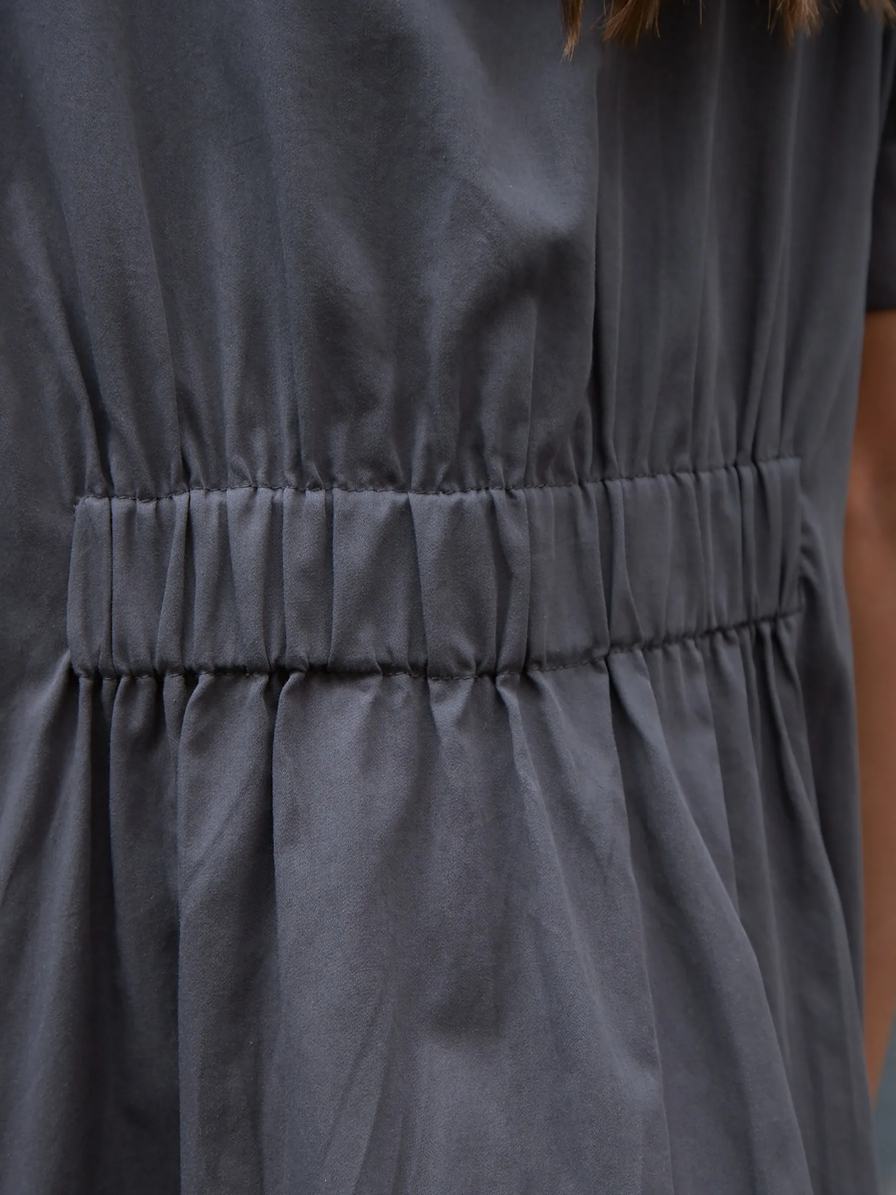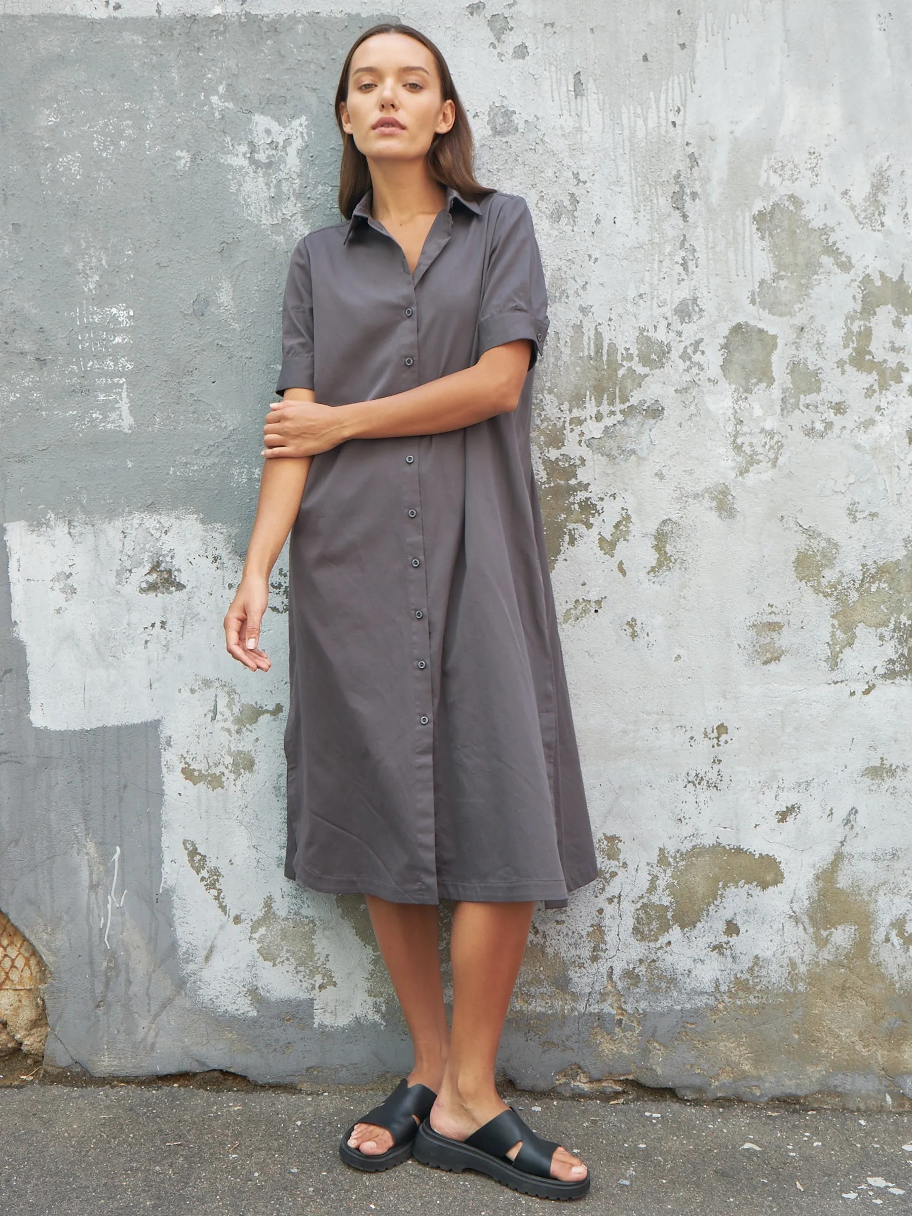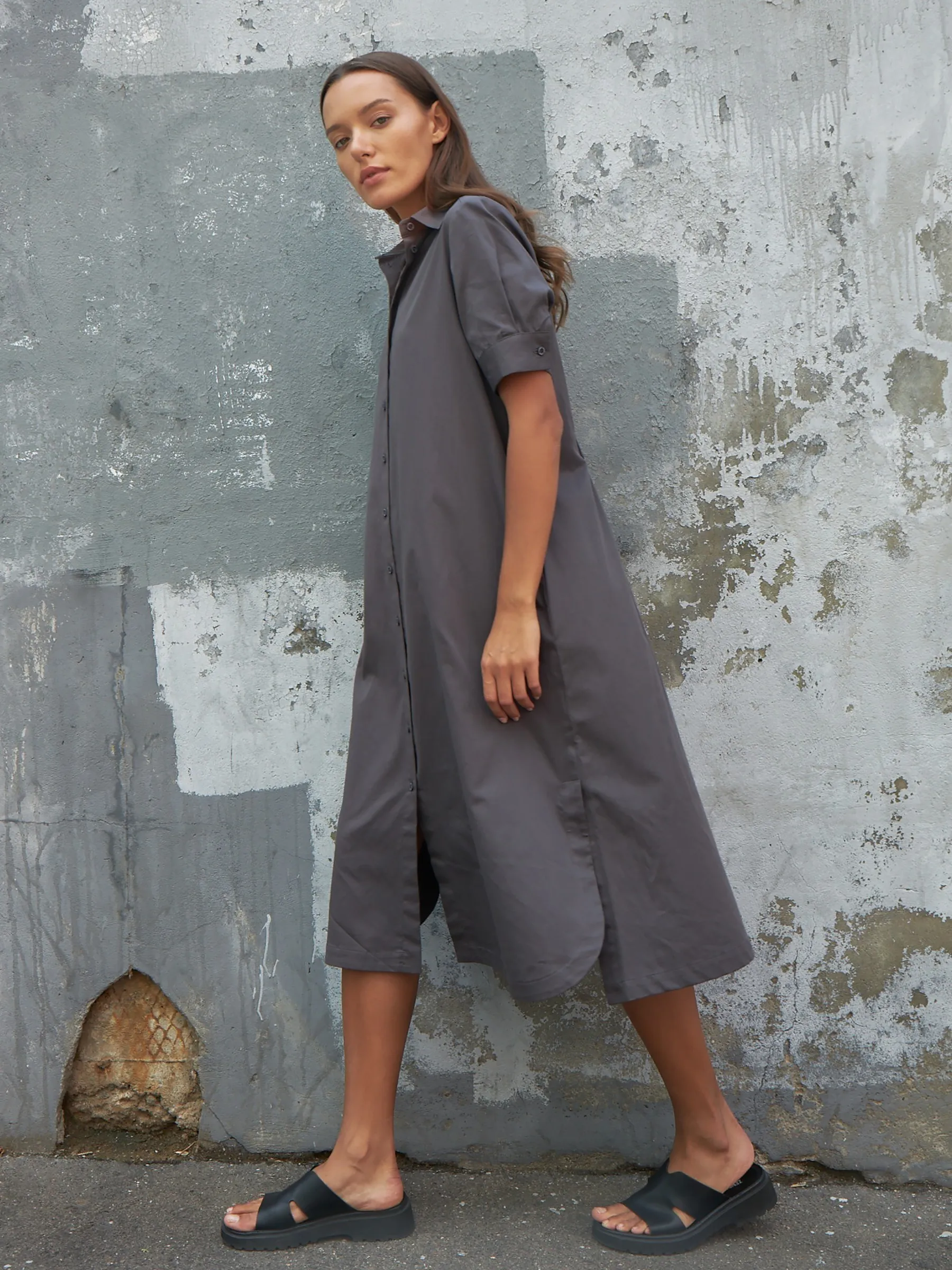 Миди платье на фирменных пуговицах с классическим воротником, короткими рукавами фонариками, незаметными карманами, декоративно оформленной спинкой и съемным поясом в комплекте. Модель выполнена из 100% органического хлопка с дышащим эффектом в лаконичном чёрном цвете. Подойдет для создания демисезонних образов в повседневном стиле.
