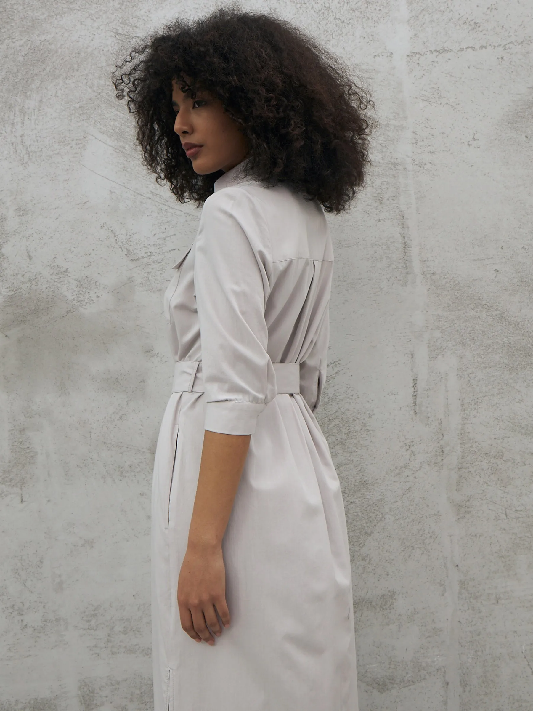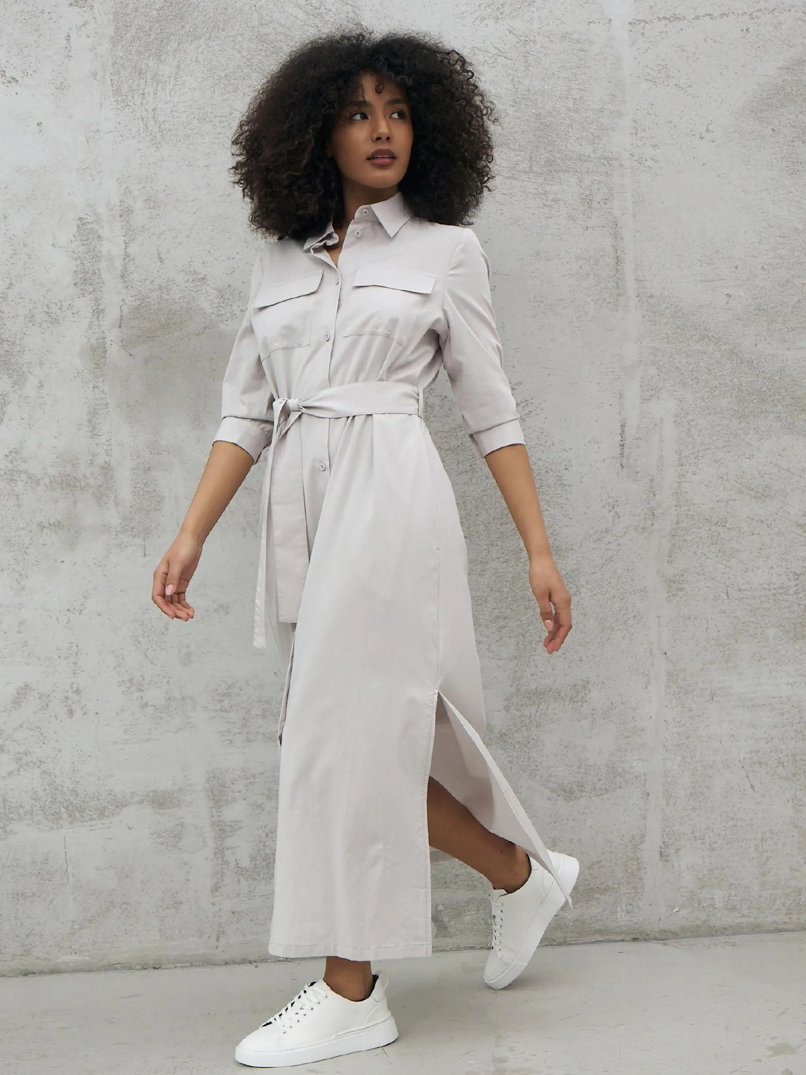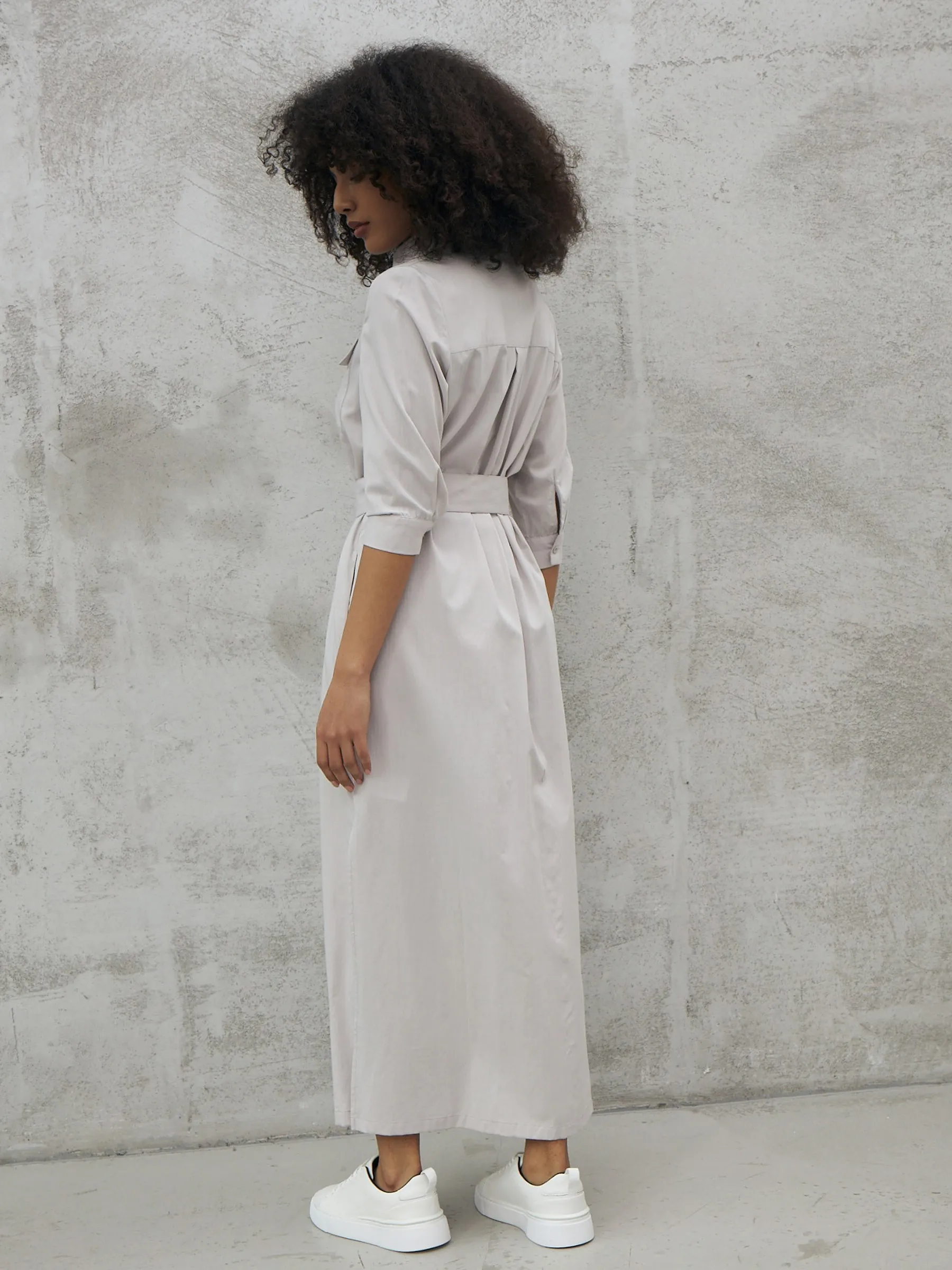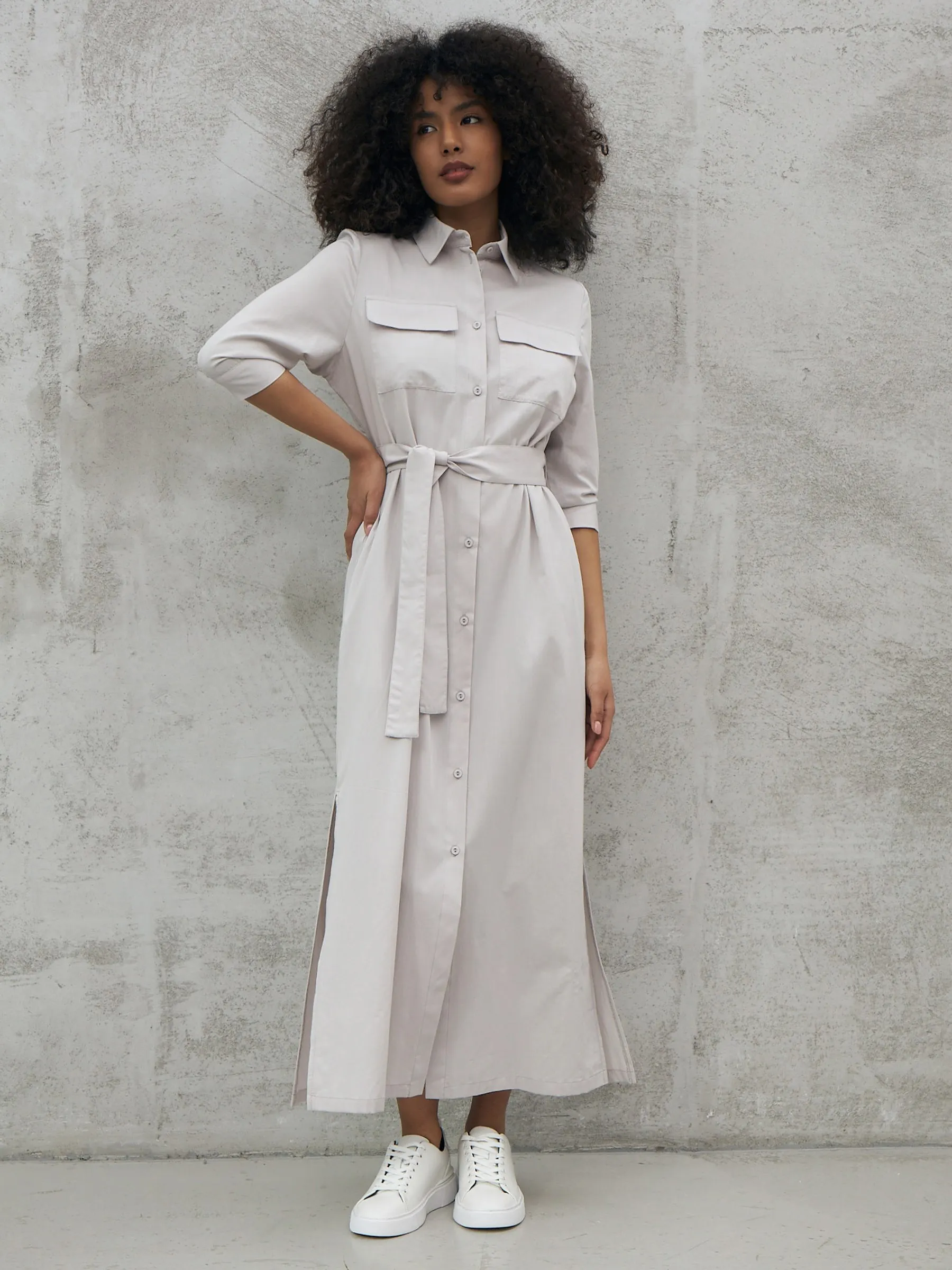 Миди платье на пуговицах с поясом, классическим воротником, акцентными карманами на груди и укороченными рукавами на манжетах. Модель выполнена из 100% экологических материалов: дышащего хлопка и мягкой вискозы в светло-сером оттенке. Подойдет для создания демисезонних образов в стиле кэжуал.