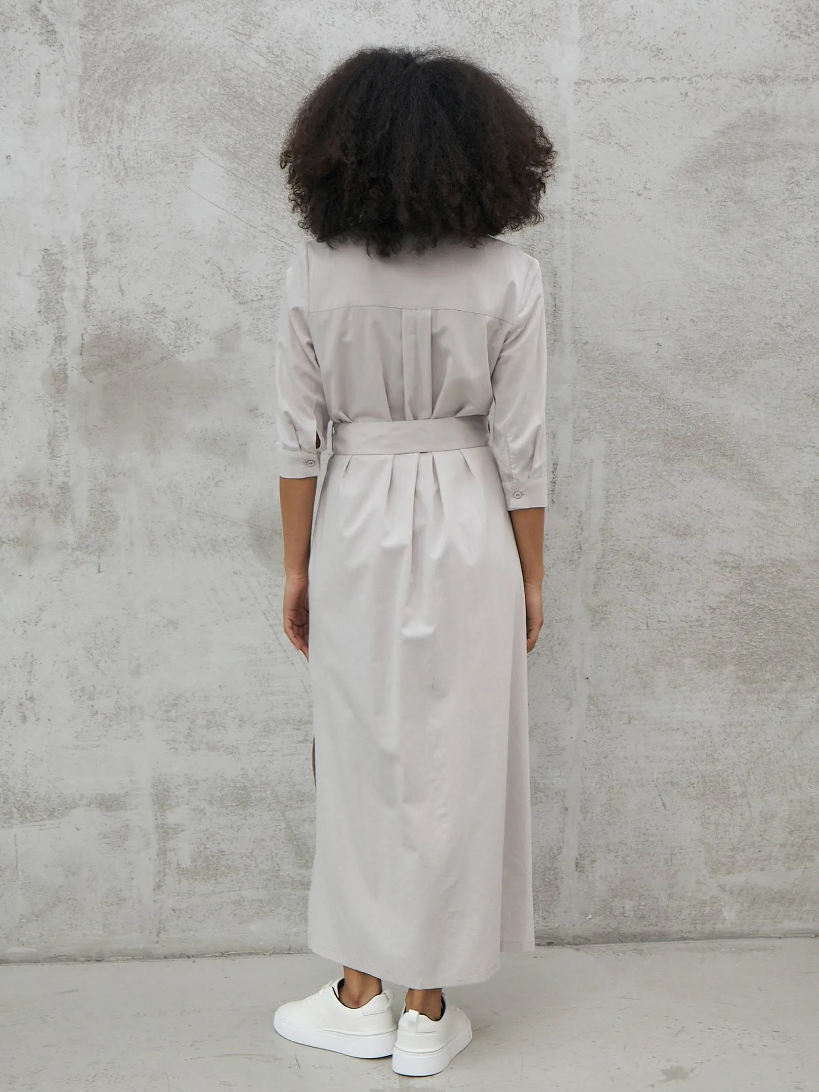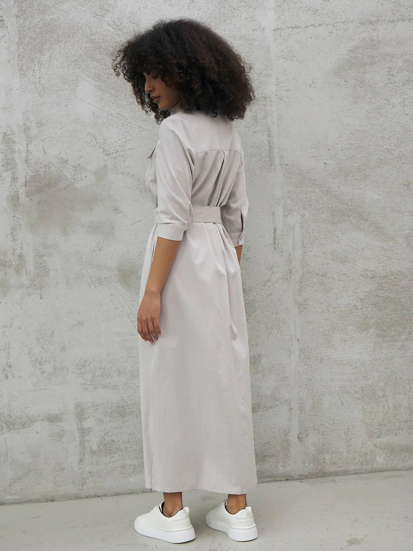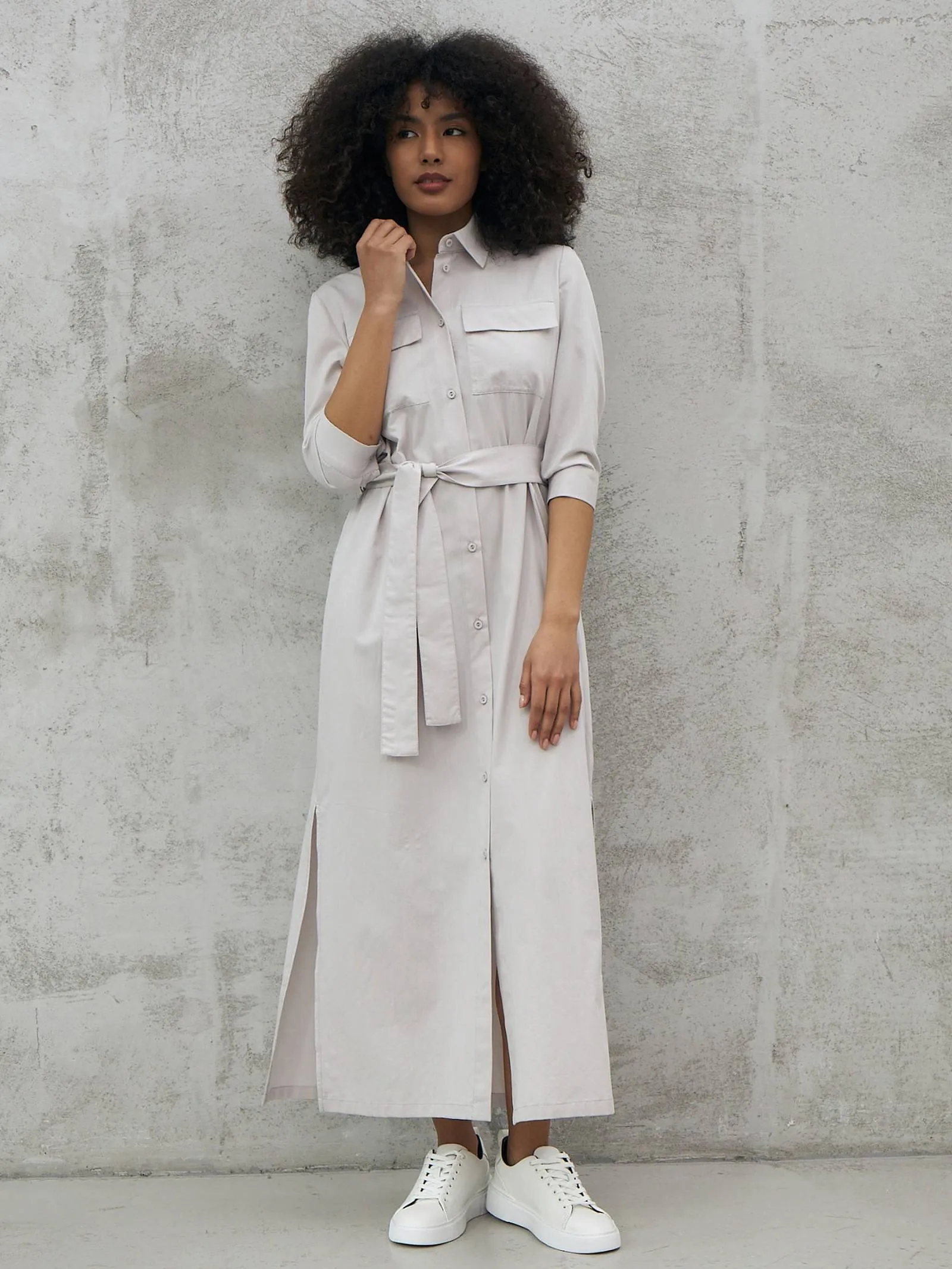 Миди платье на пуговицах с поясом, классическим воротником, акцентными карманами на груди и укороченными рукавами на манжетах. Модель выполнена из 100% экологических материалов: дышащего хлопка и мягкой вискозы в светло-сером оттенке. Подойдет для создания демисезонних образов в стиле кэжуал.