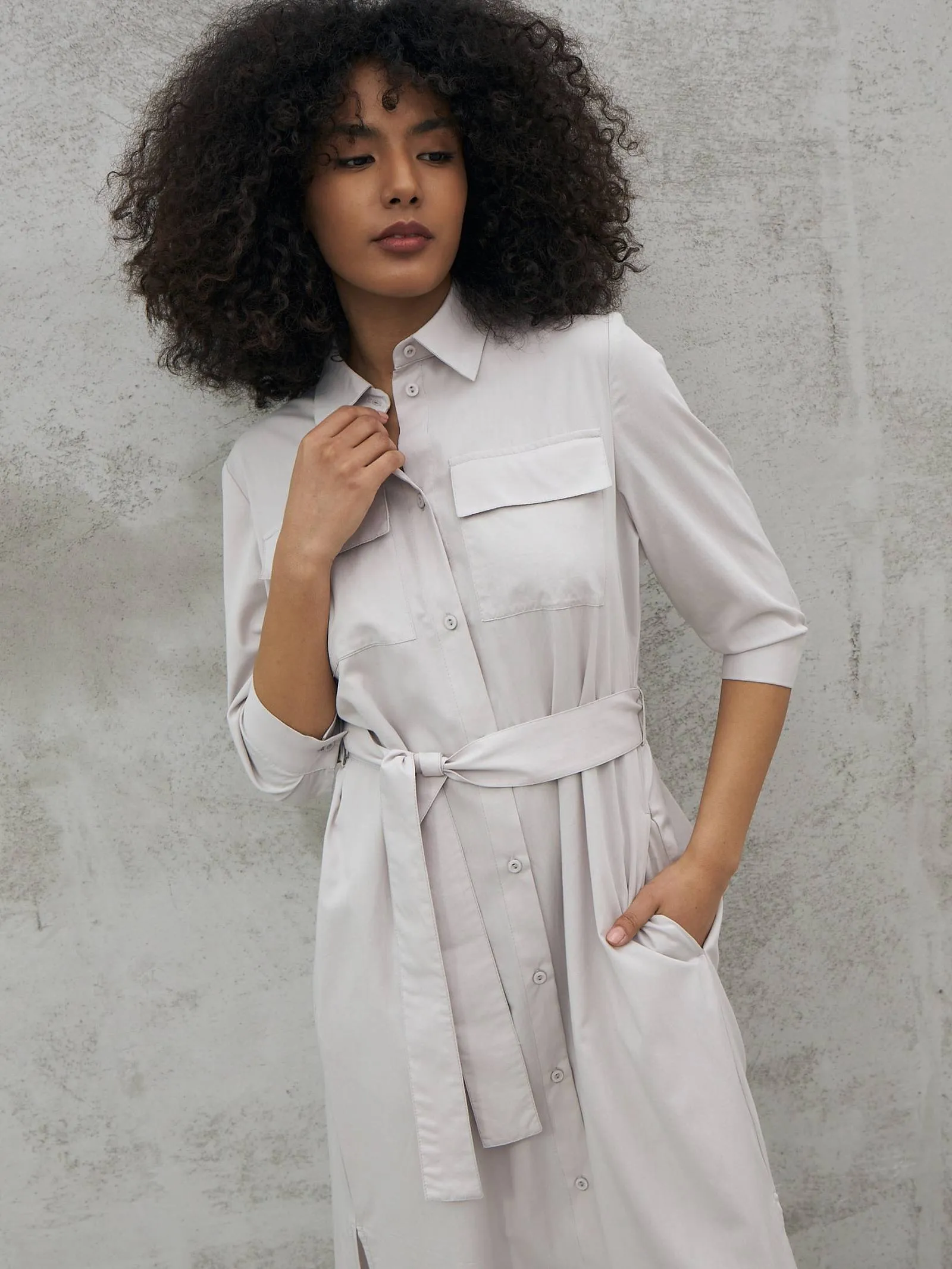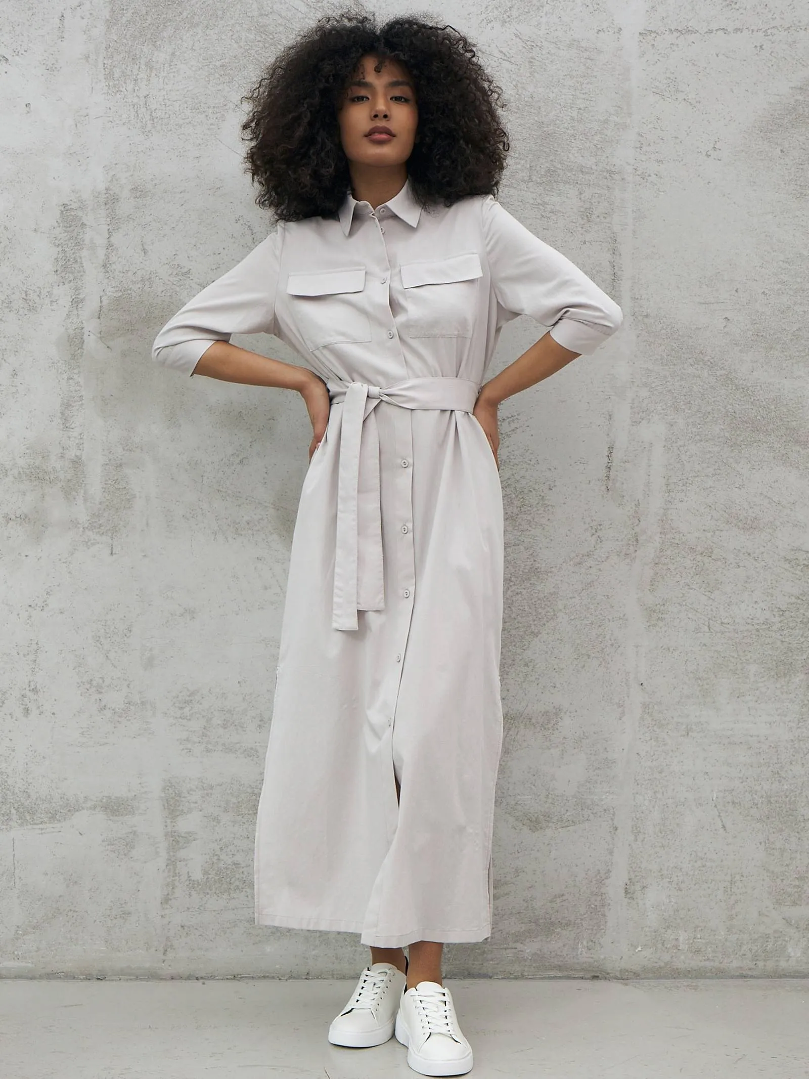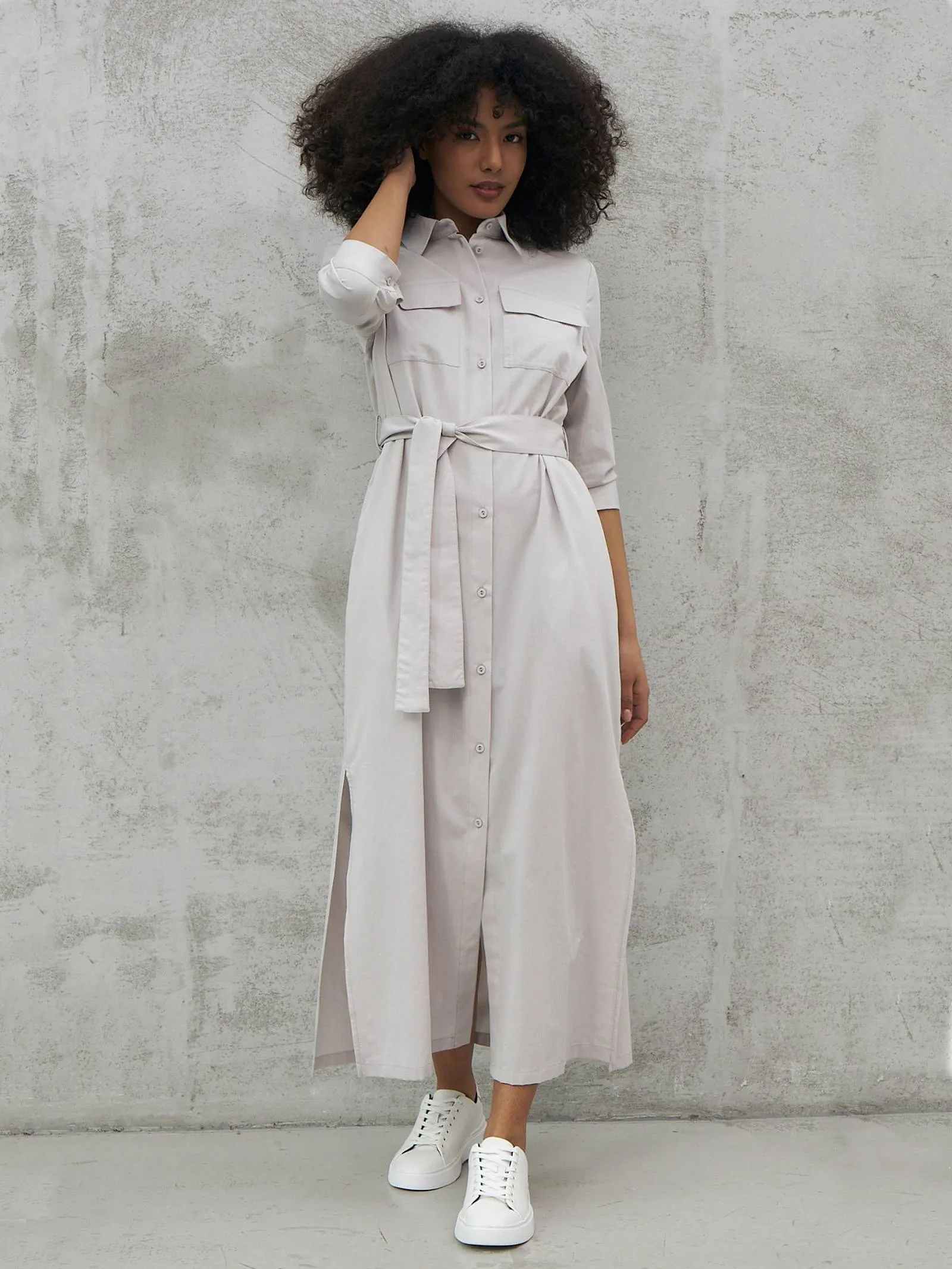 Миди платье на пуговицах с поясом, классическим воротником, акцентными карманами на груди и укороченными рукавами на манжетах. Модель выполнена из 100% экологических материалов: дышащего хлопка и мягкой вискозы в светло-сером оттенке. Подойдет для создания демисезонних образов в стиле кэжуал.
