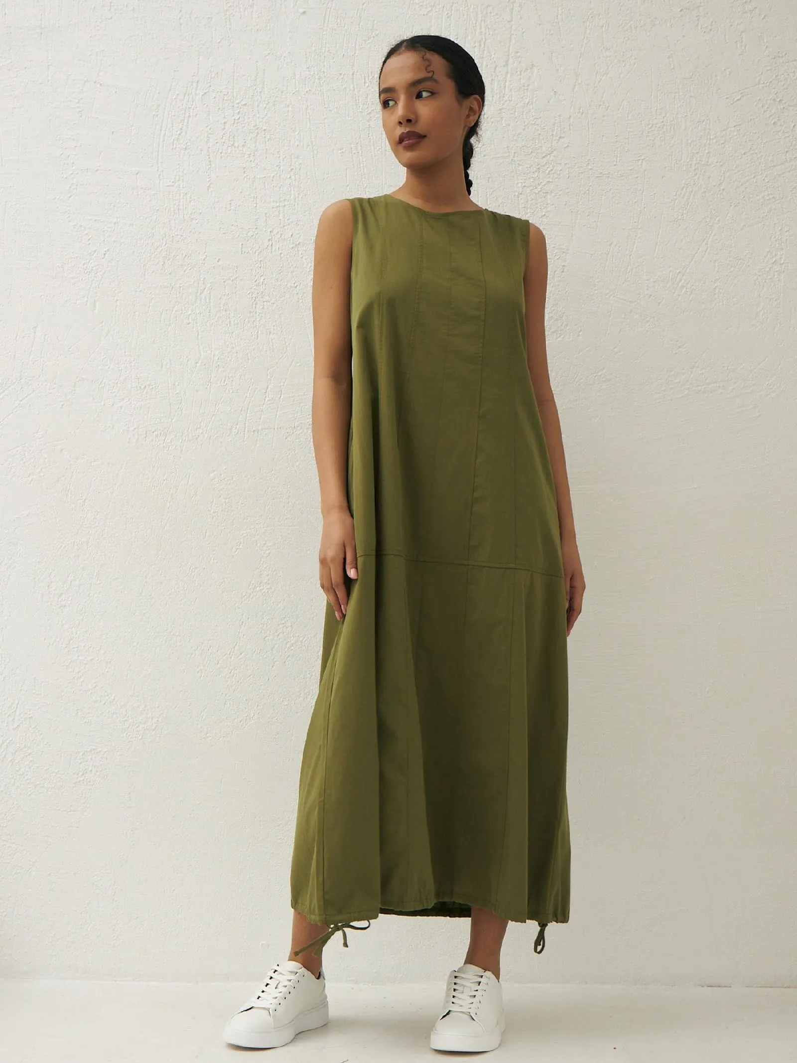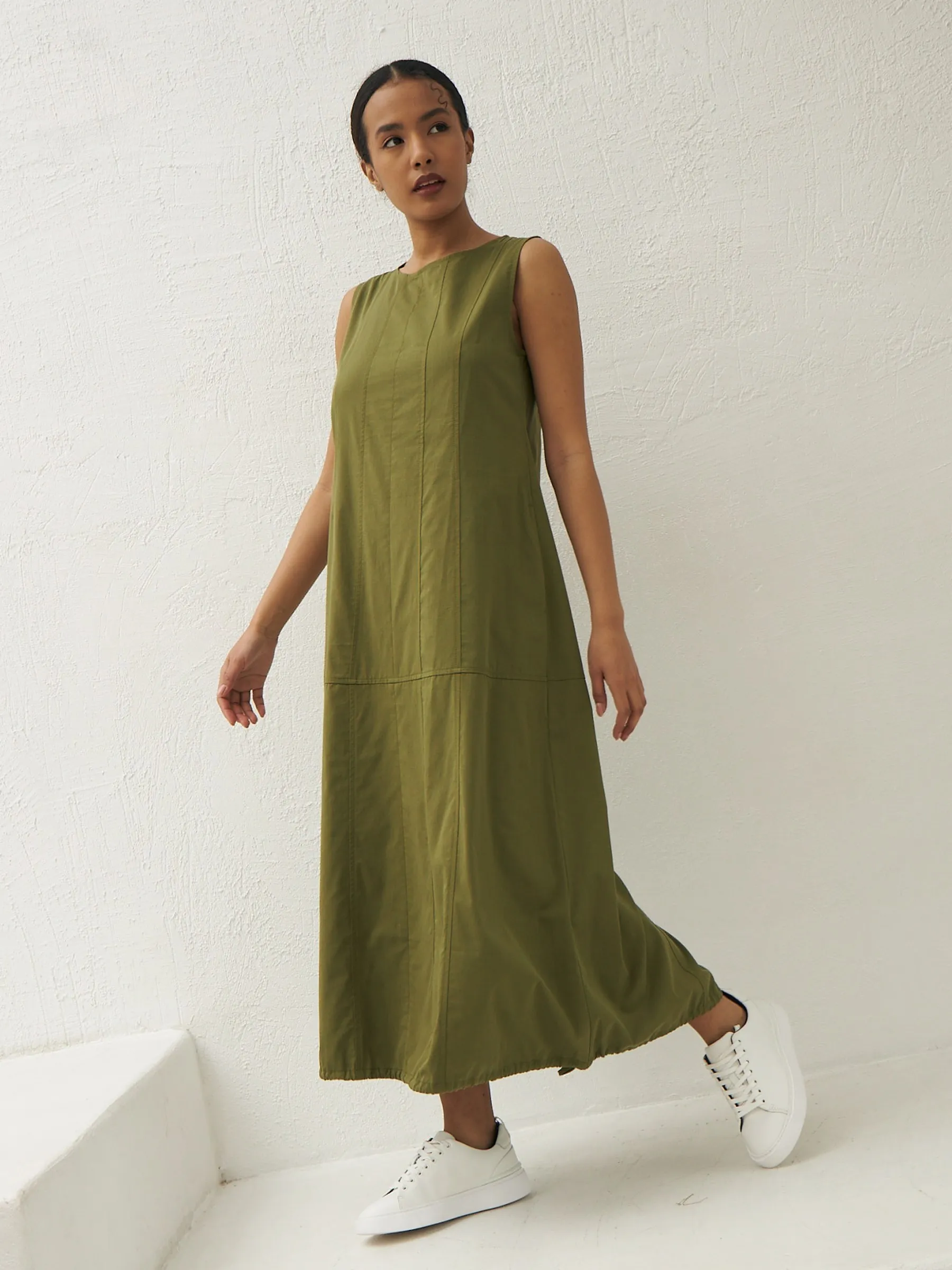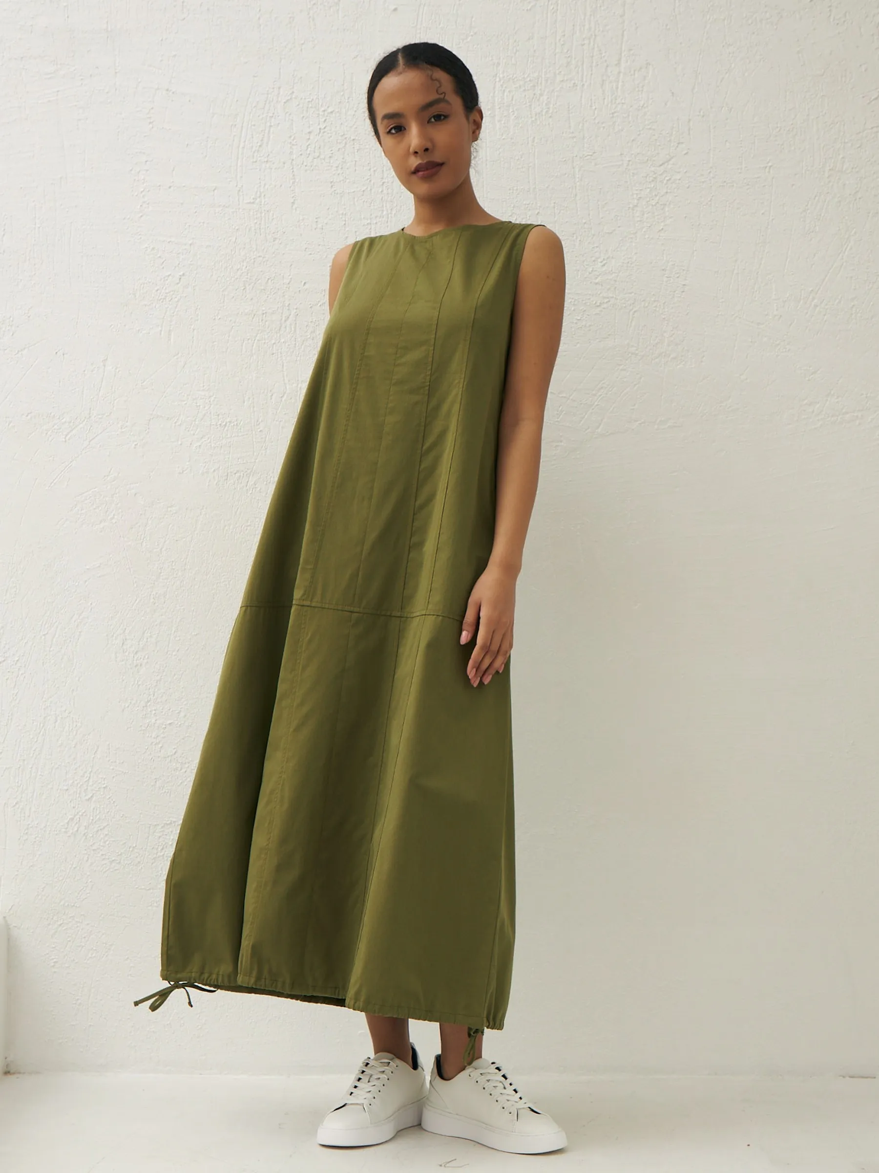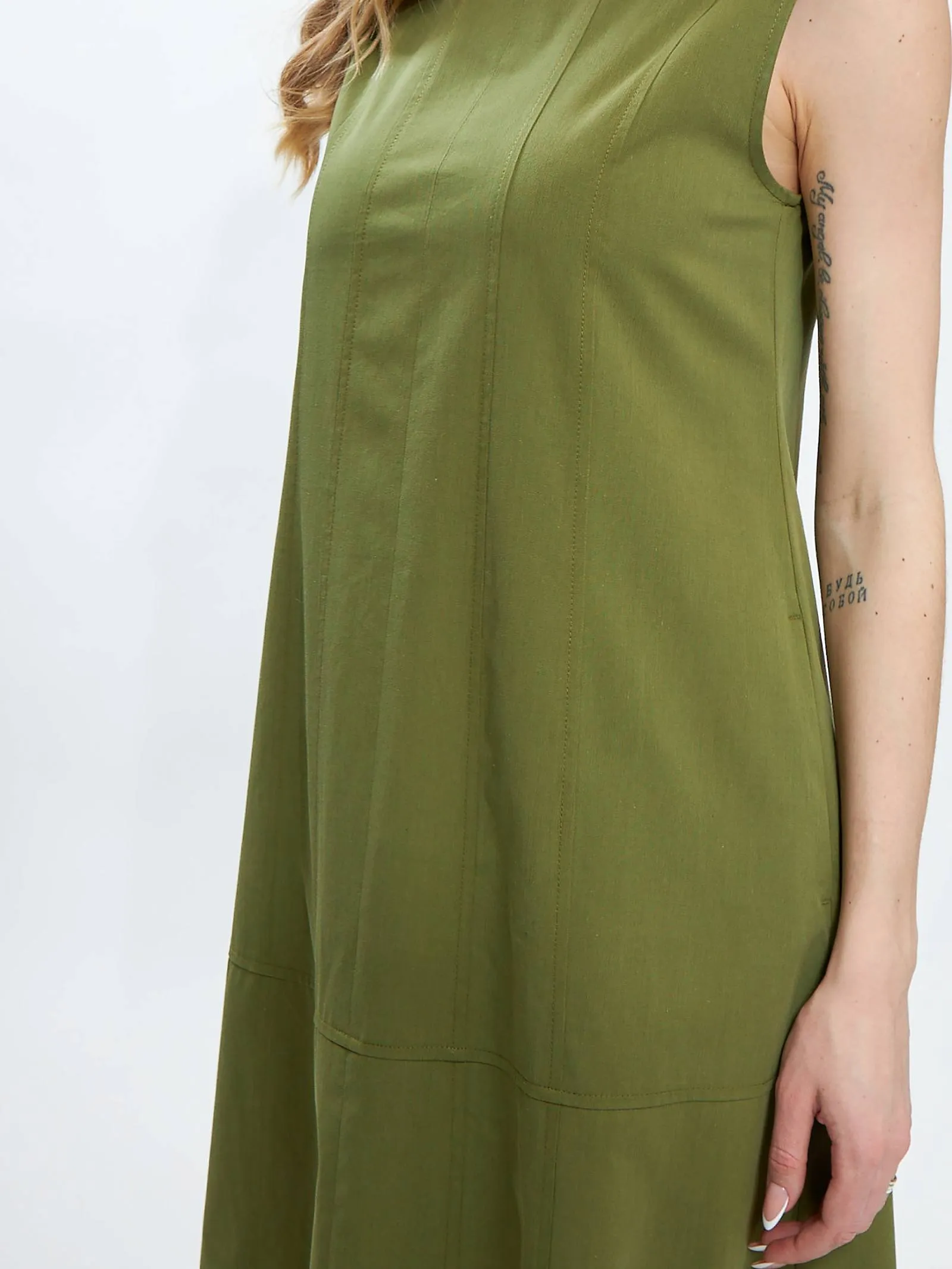 Платье травянистого оттенка без рукавов с декоративными строчками и оригинальными резинками на подоле с возможностью регулирования. Модель выполнена в свободном крое из натуральной вискозы и дышащего хлопка, которые приятны к телу в теплую погоду. Подойдет для весенне-осеннего сезона и летних образов.
