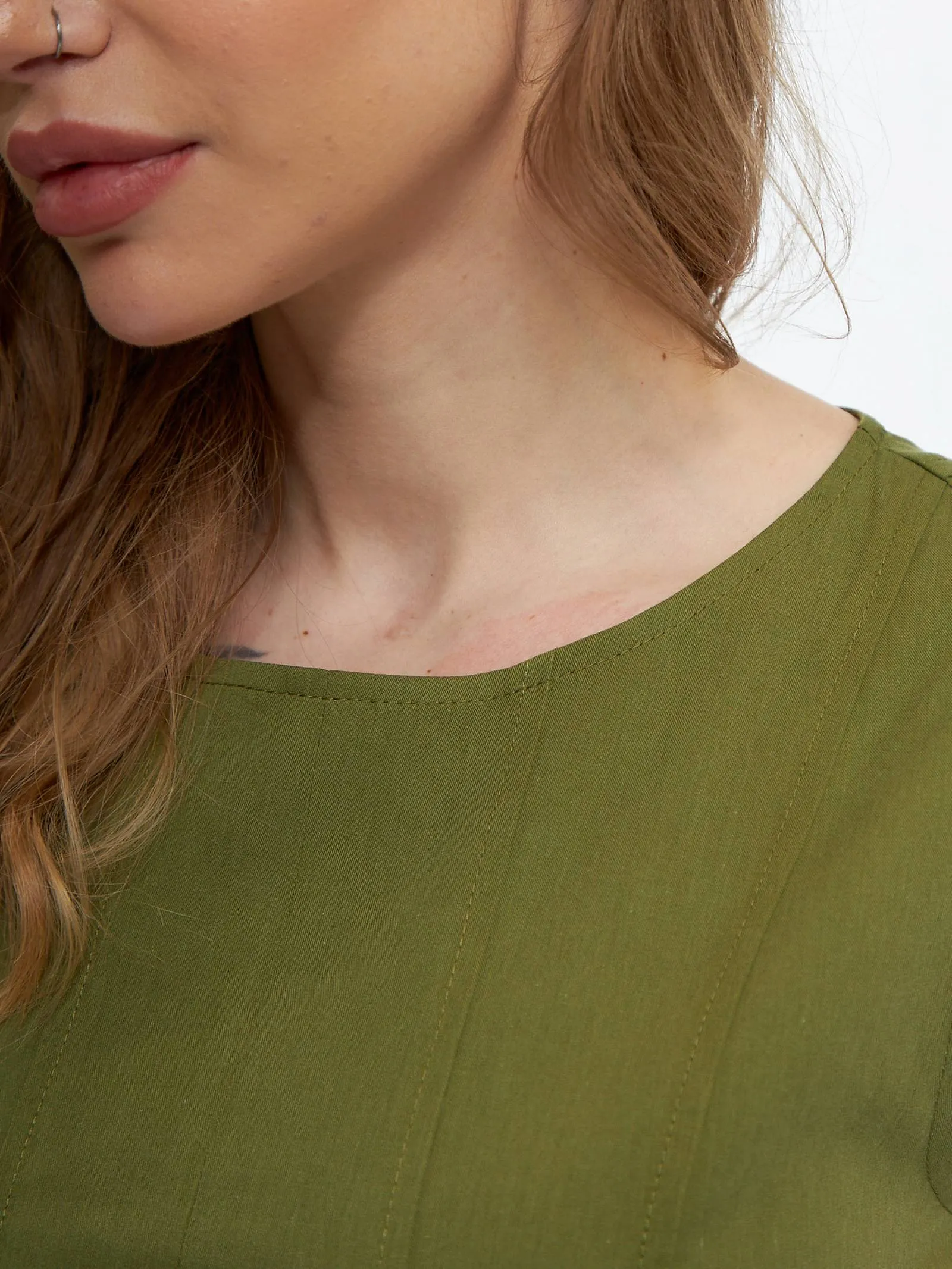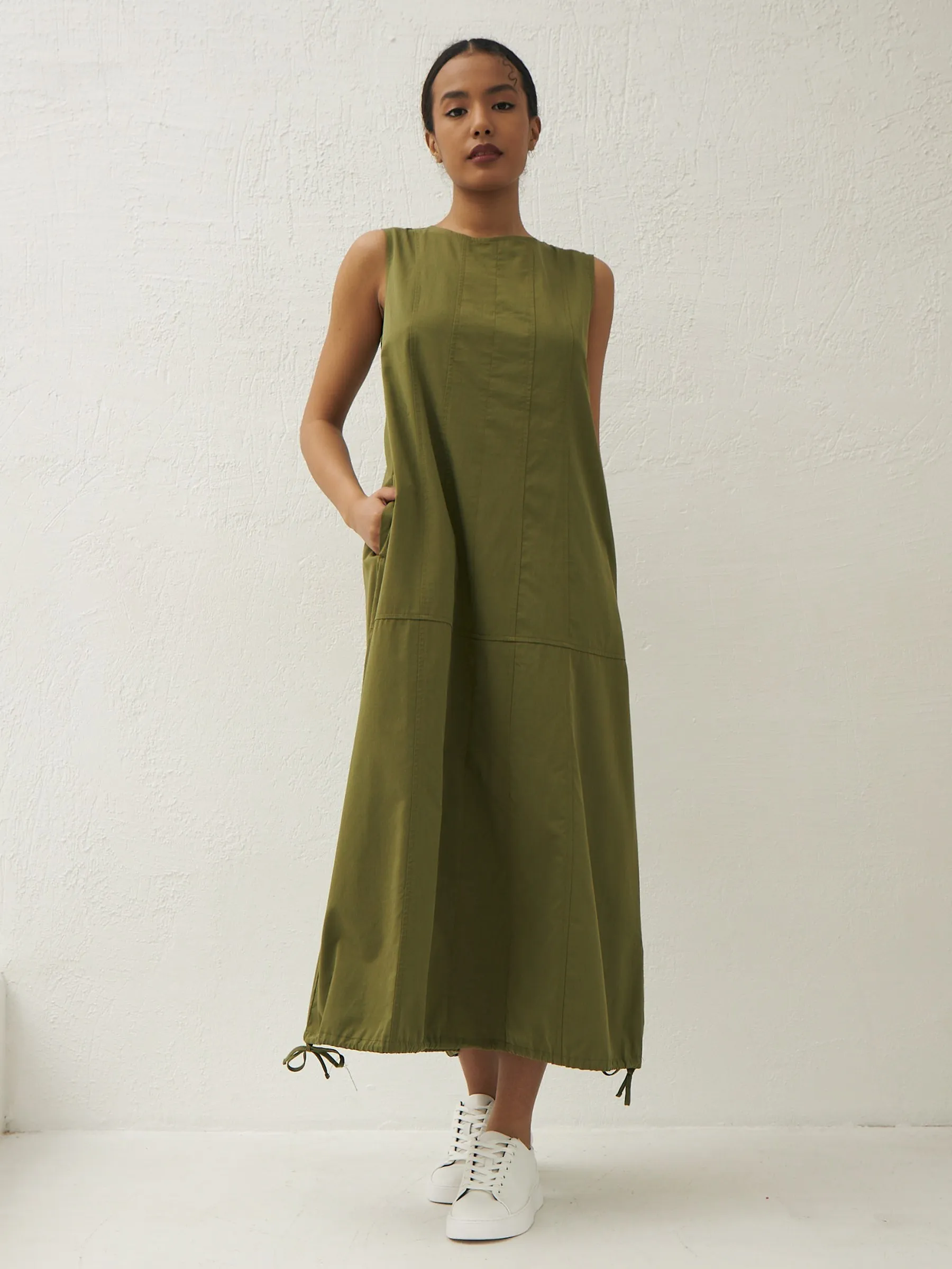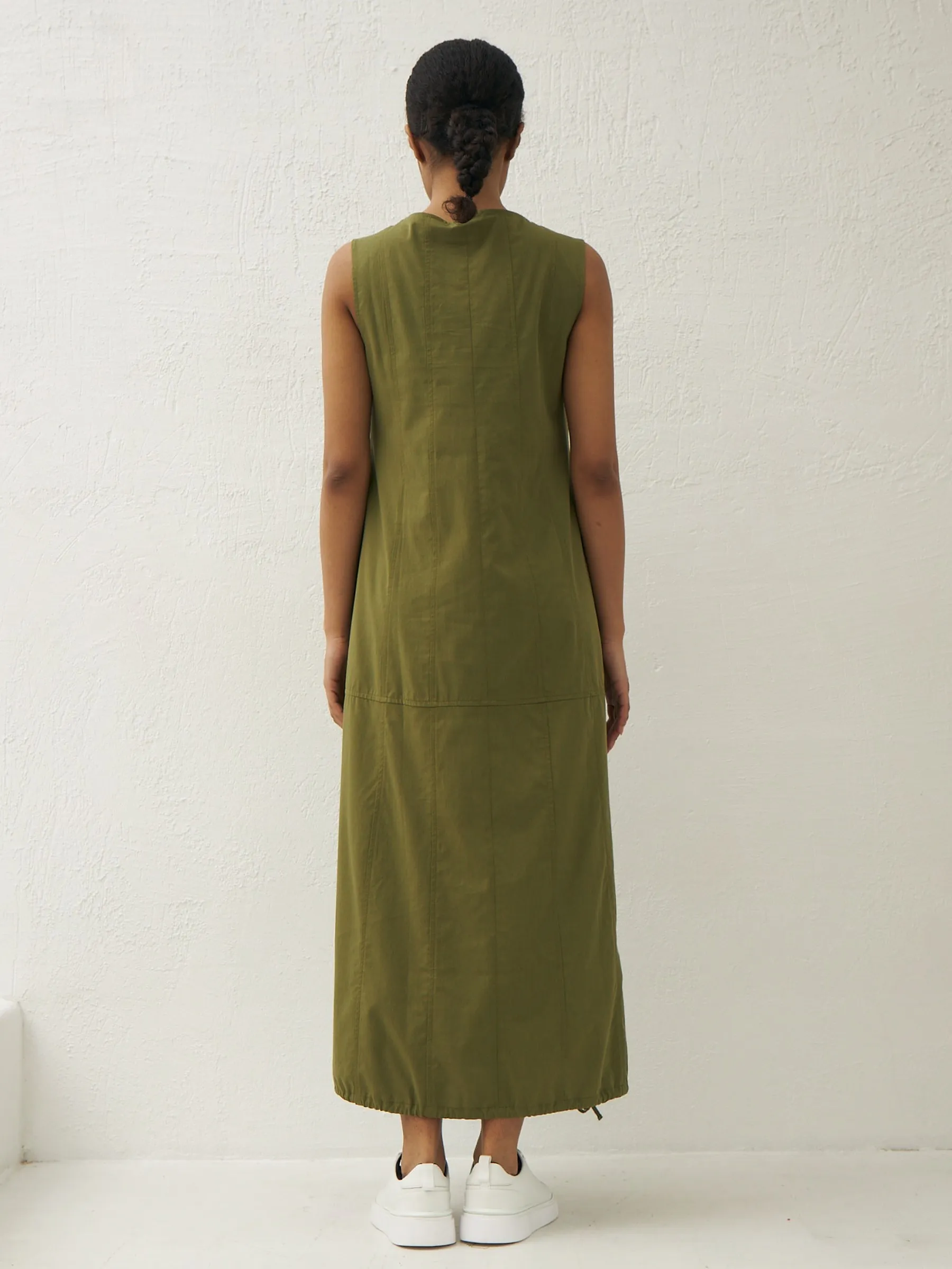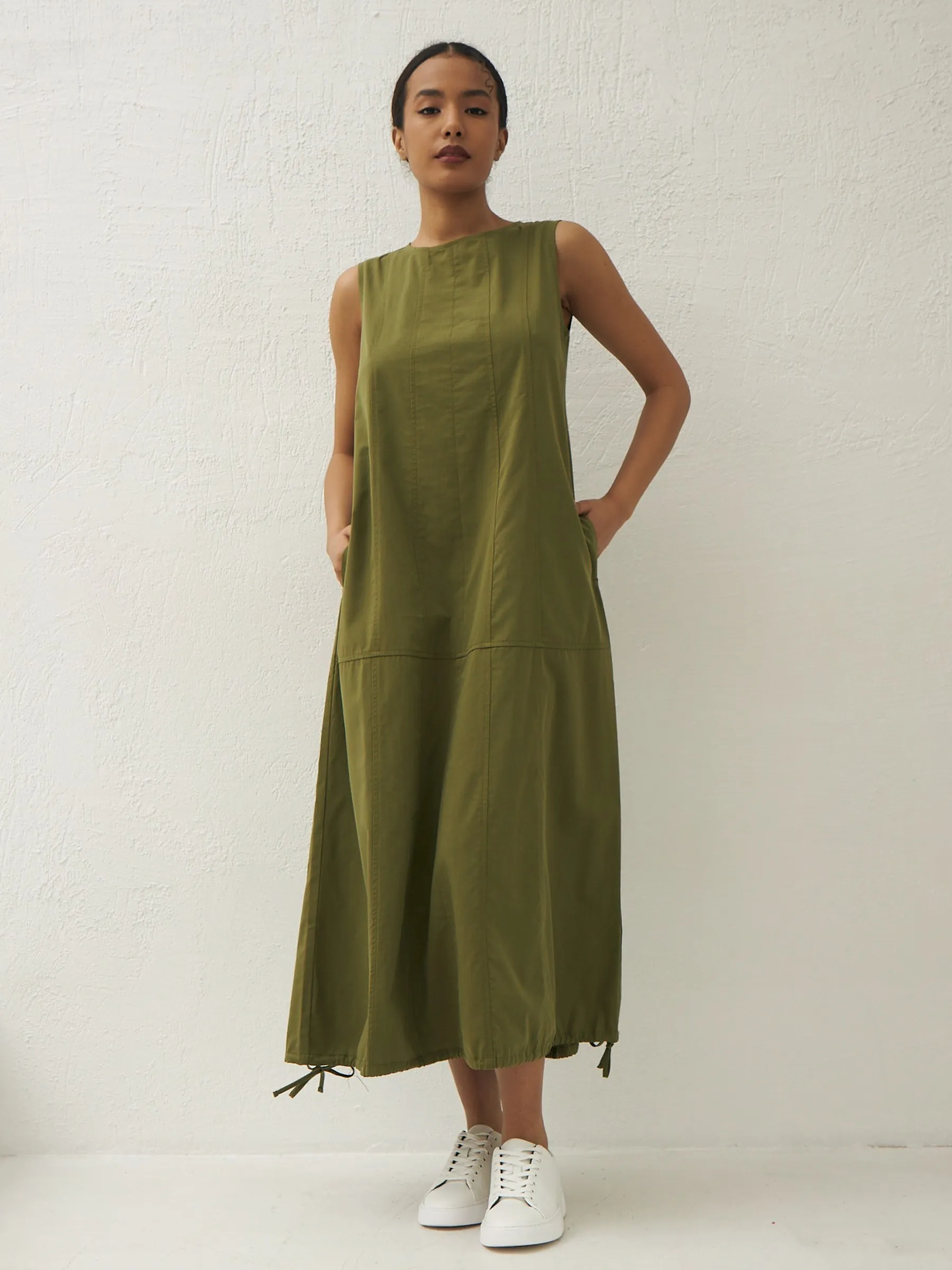 Платье травянистого оттенка без рукавов с декоративными строчками и оригинальными резинками на подоле с возможностью регулирования. Модель выполнена в свободном крое из натуральной вискозы и дышащего хлопка, которые приятны к телу в теплую погоду. Подойдет для весенне-осеннего сезона и летних образов.
