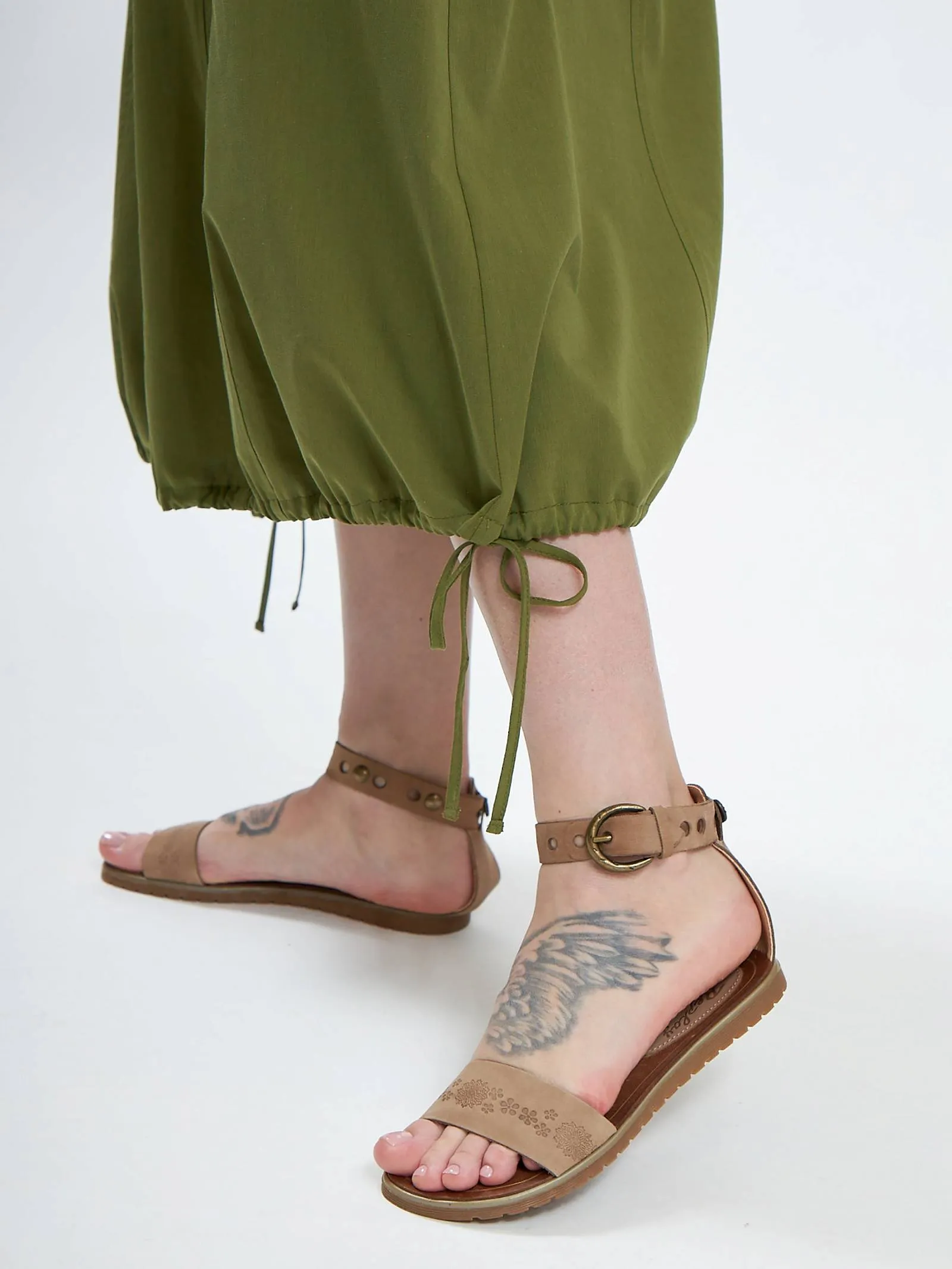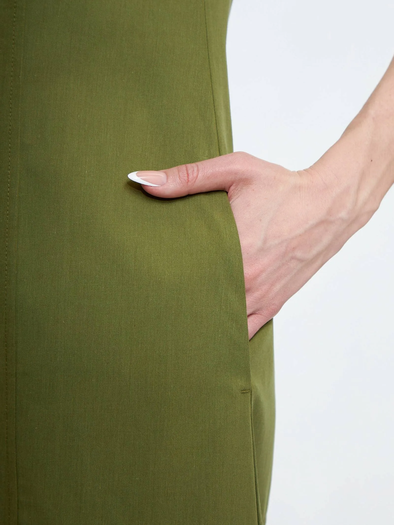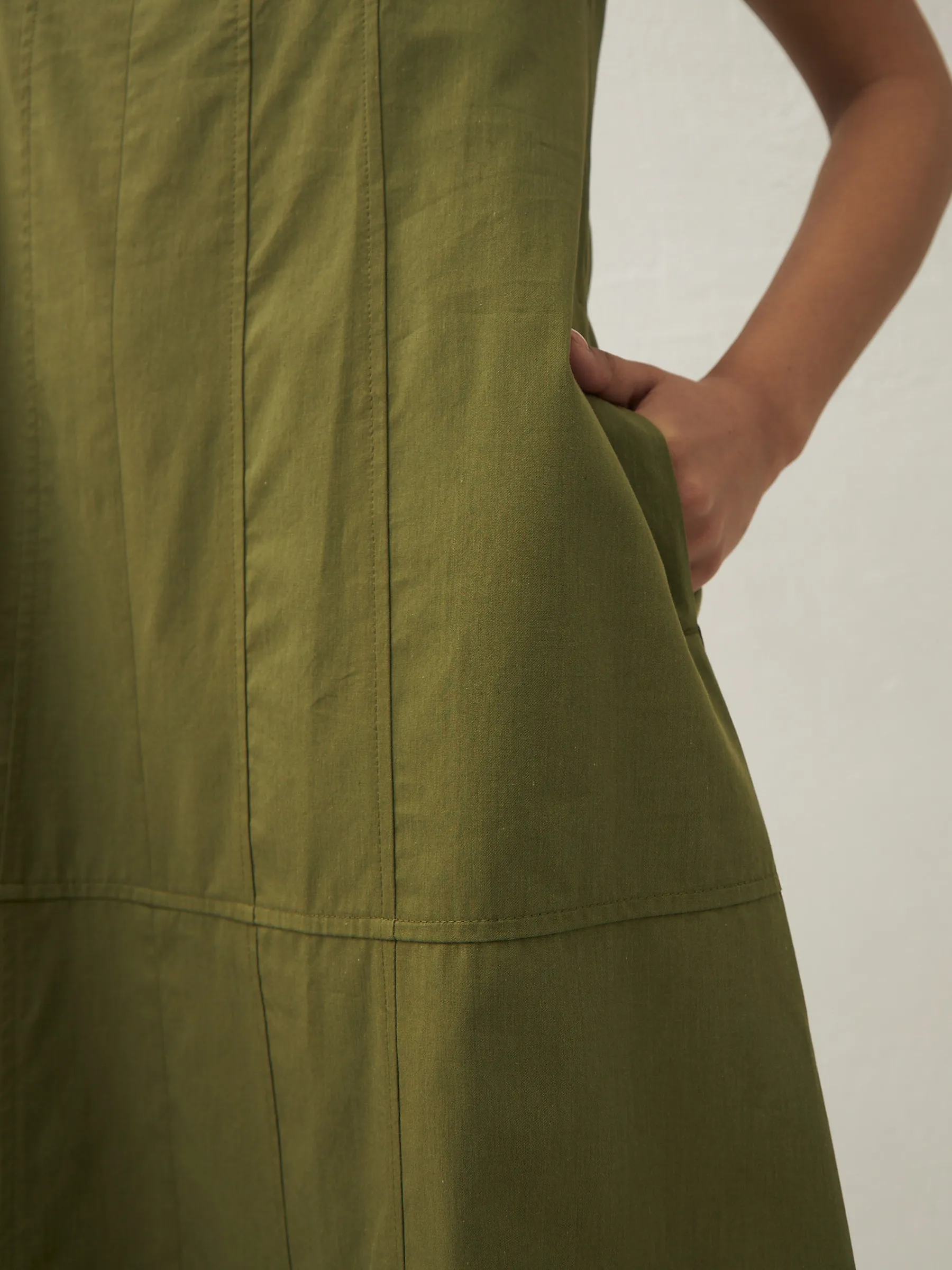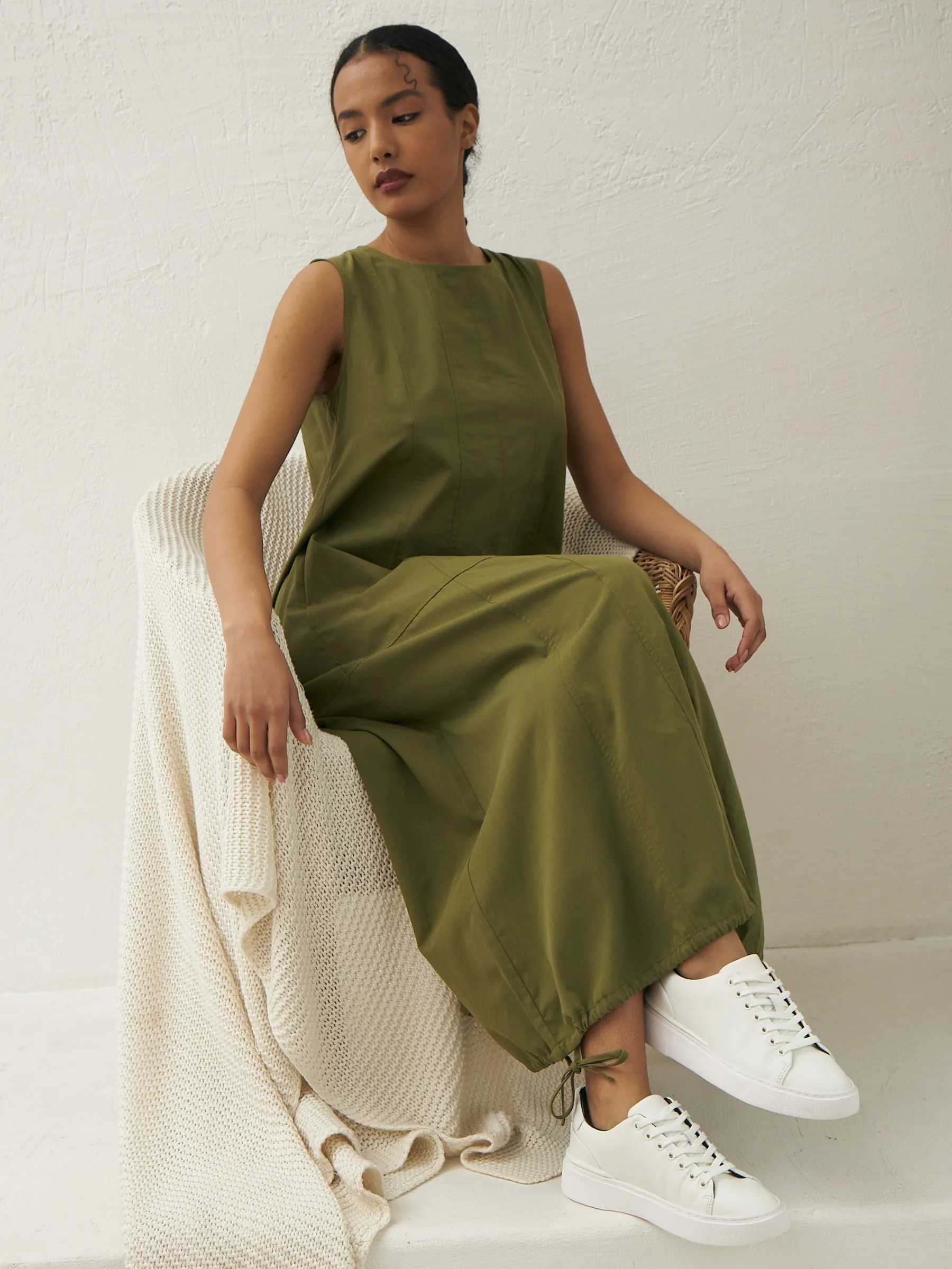 Платье травянистого оттенка без рукавов с декоративными строчками и оригинальными резинками на подоле с возможностью регулирования. Модель выполнена в свободном крое из натуральной вискозы и дышащего хлопка, которые приятны к телу в теплую погоду. Подойдет для весенне-осеннего сезона и летних образов.