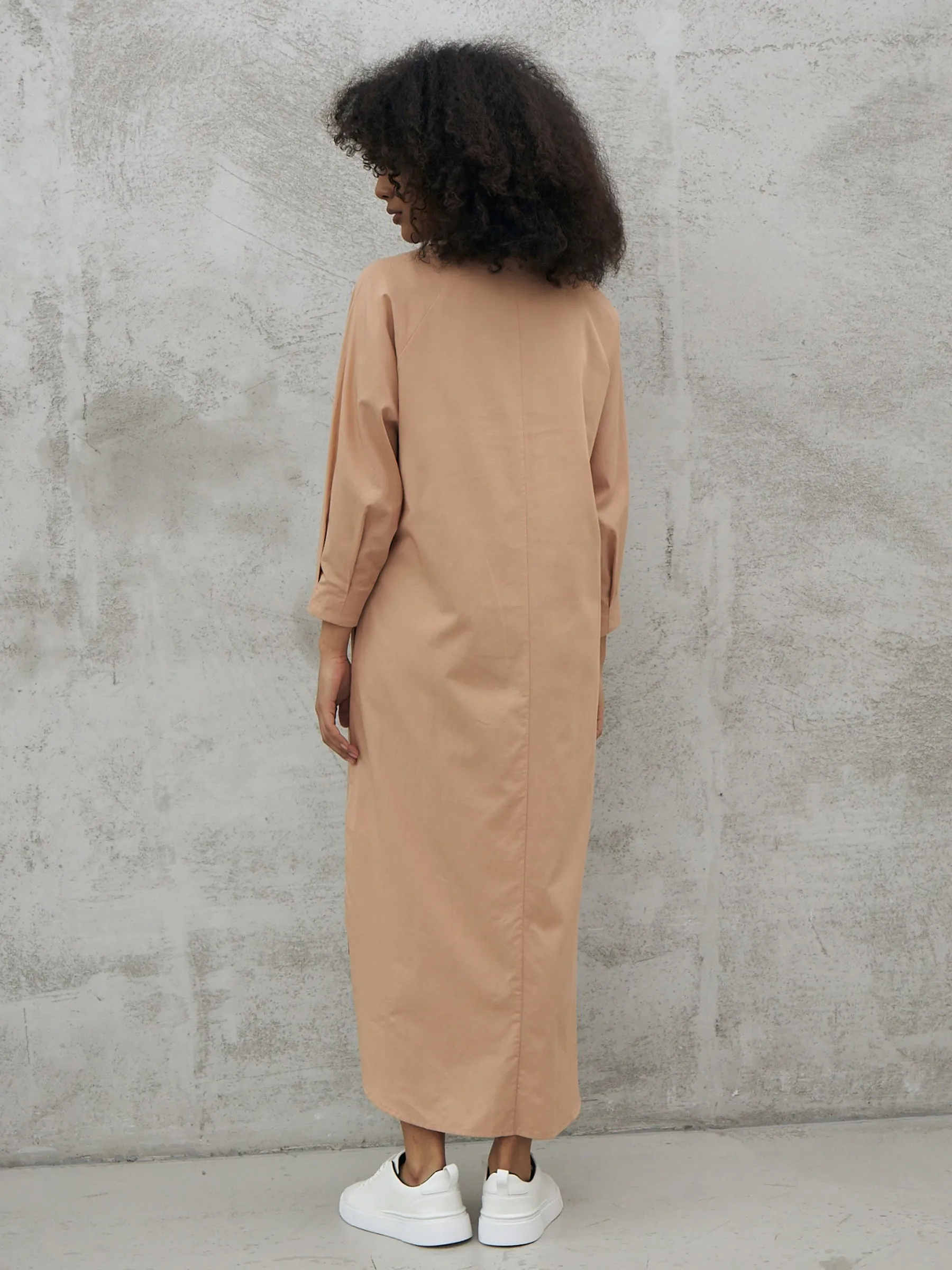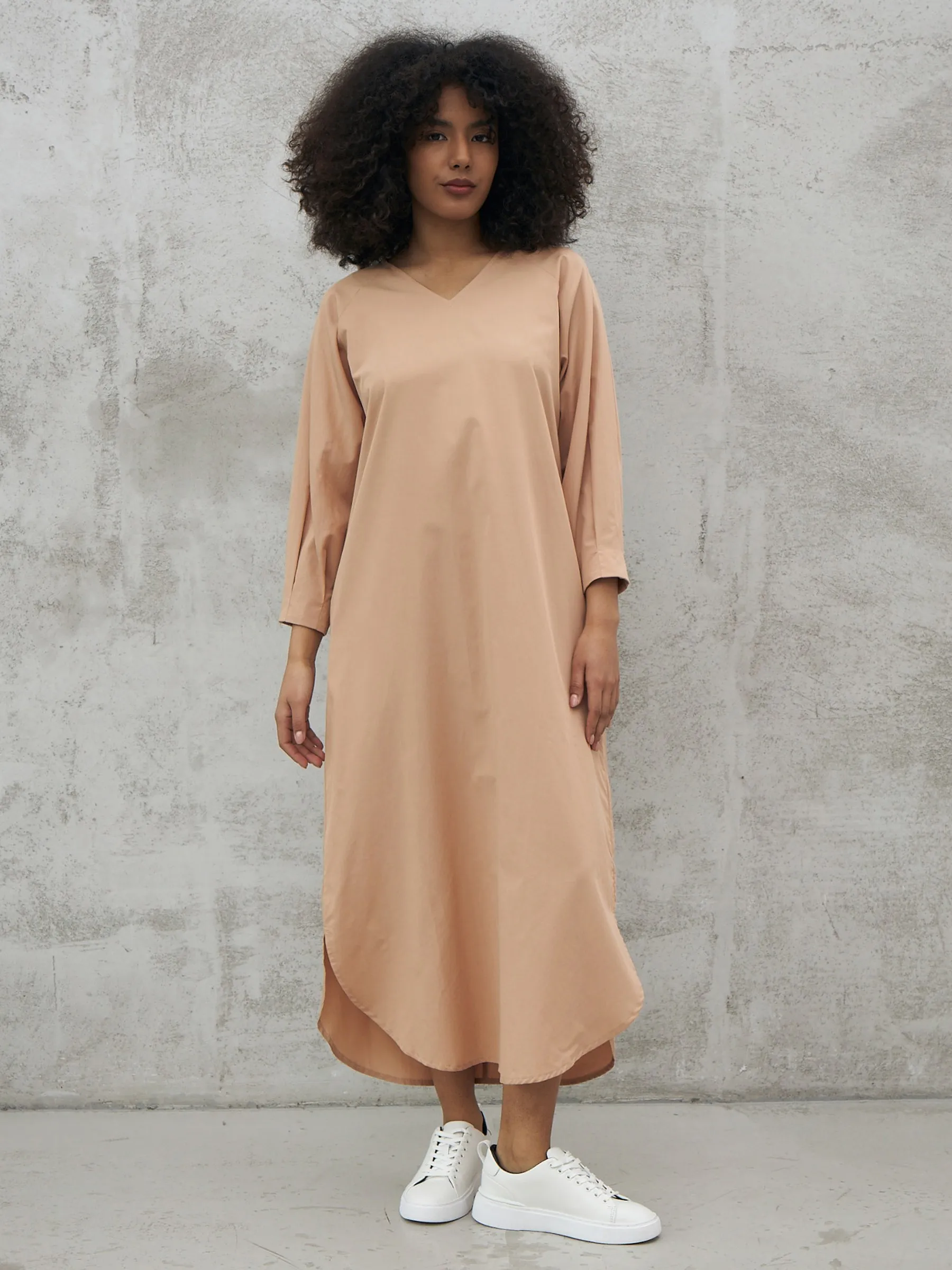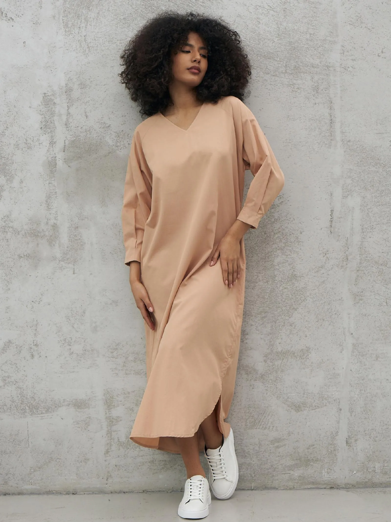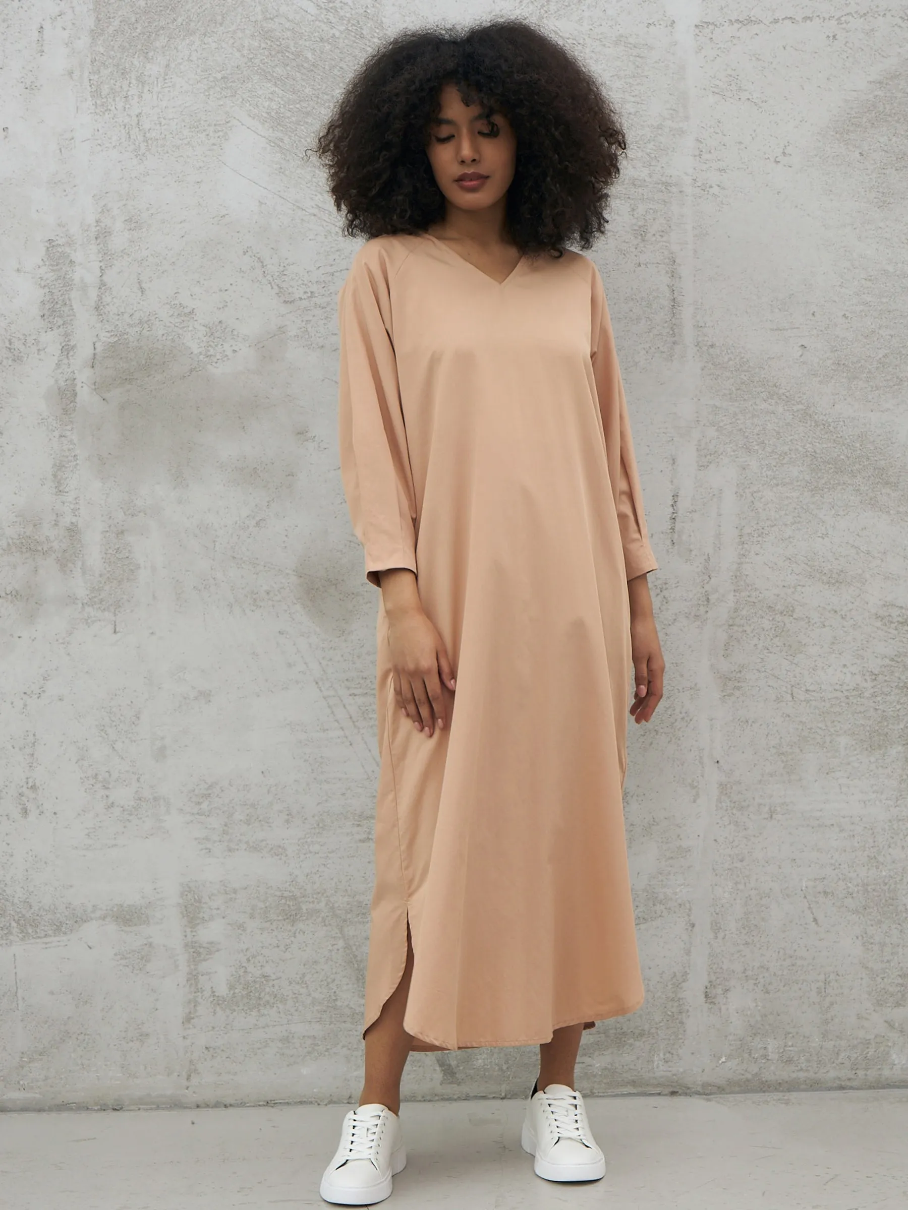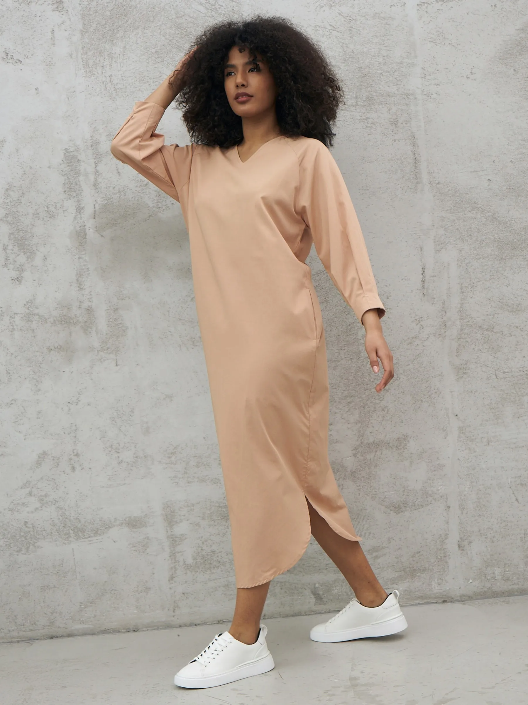 Песочное платье миди с v-образным вырезом, закругленными разрезами на подоле и стильным акцентным поясом, чтобы подчеркнуть фигуру. Модель выполнена из приятных к телу материалов: нежной вискозы и органического дышащего хлопка. Платье подойдет для повседневного стиля или вечерних образов в тёплое время года.