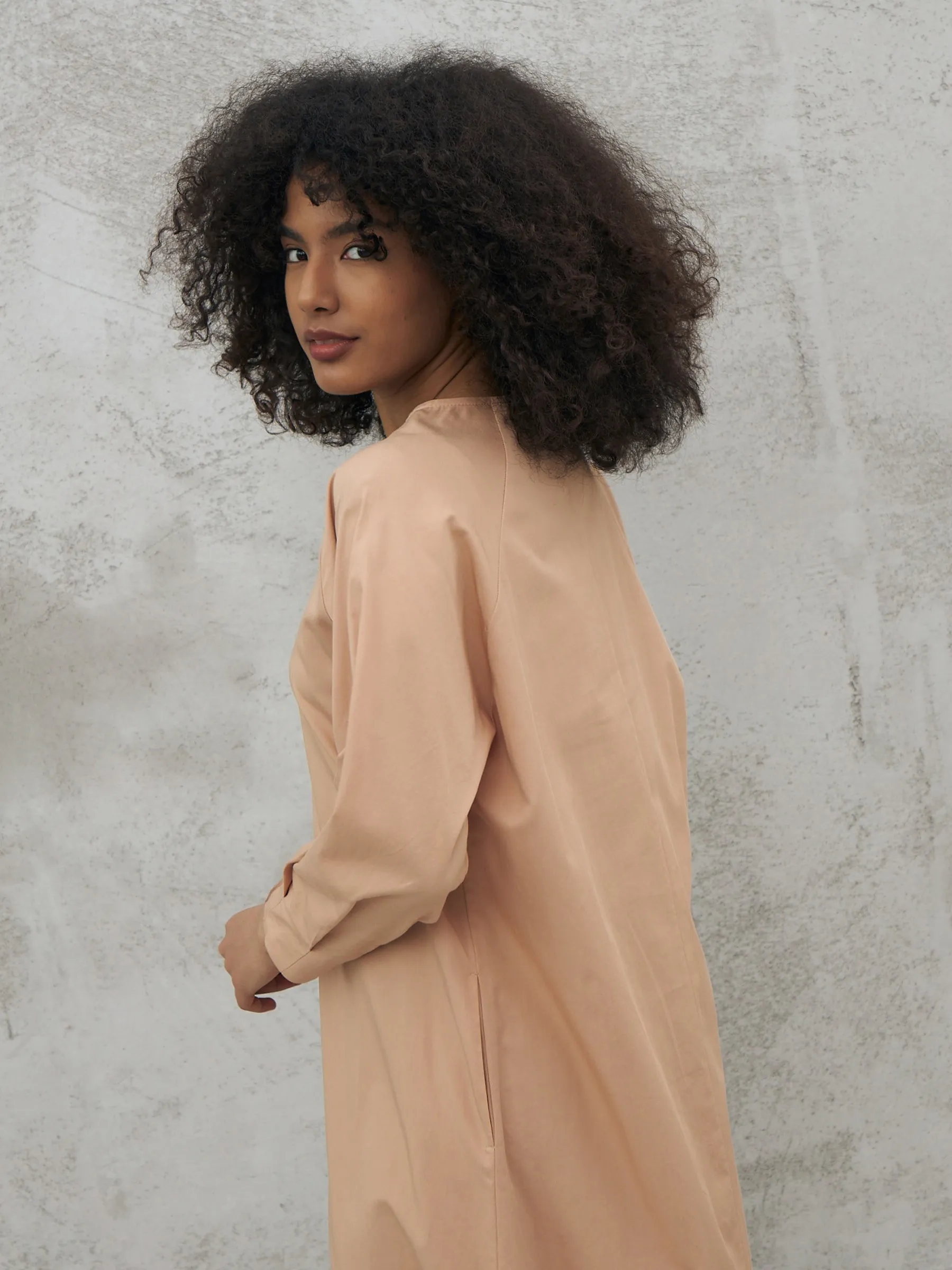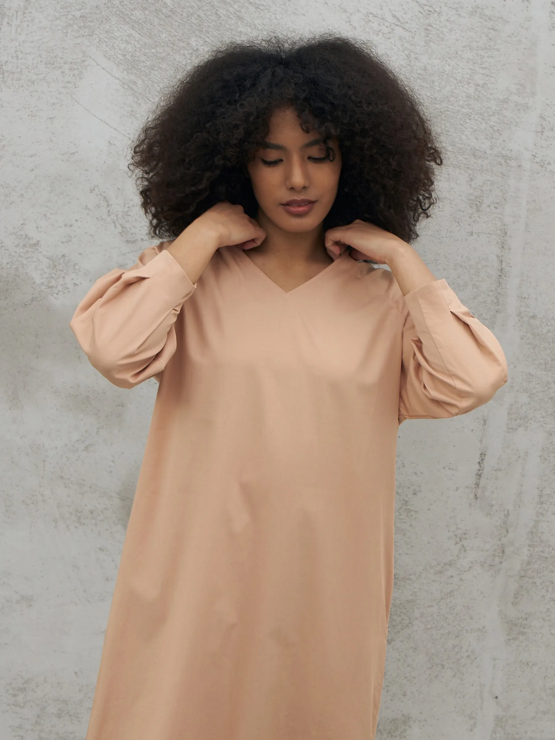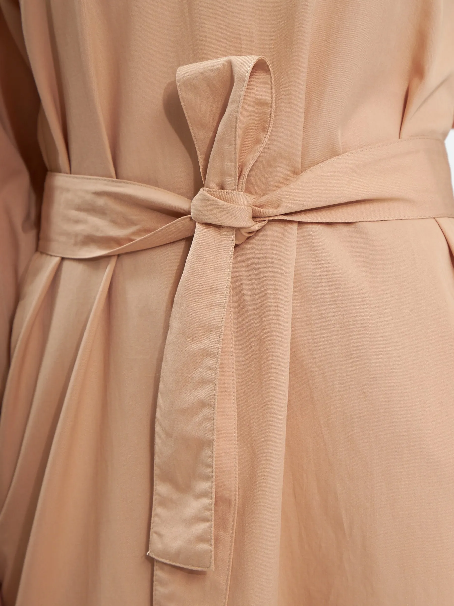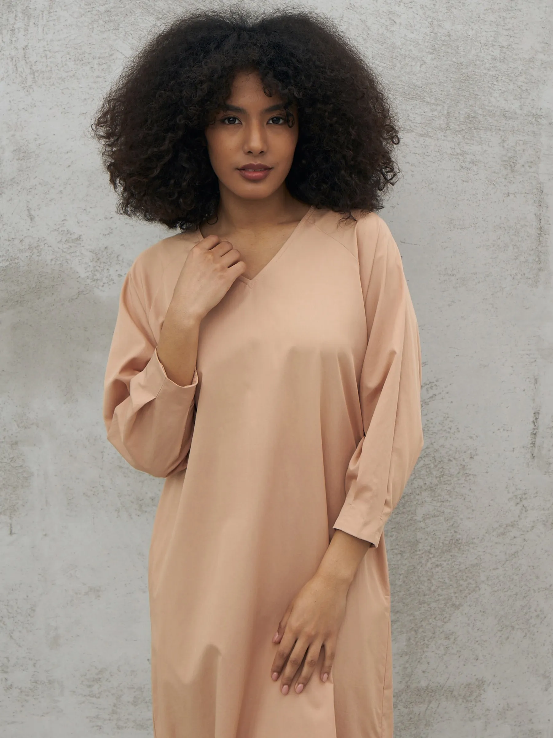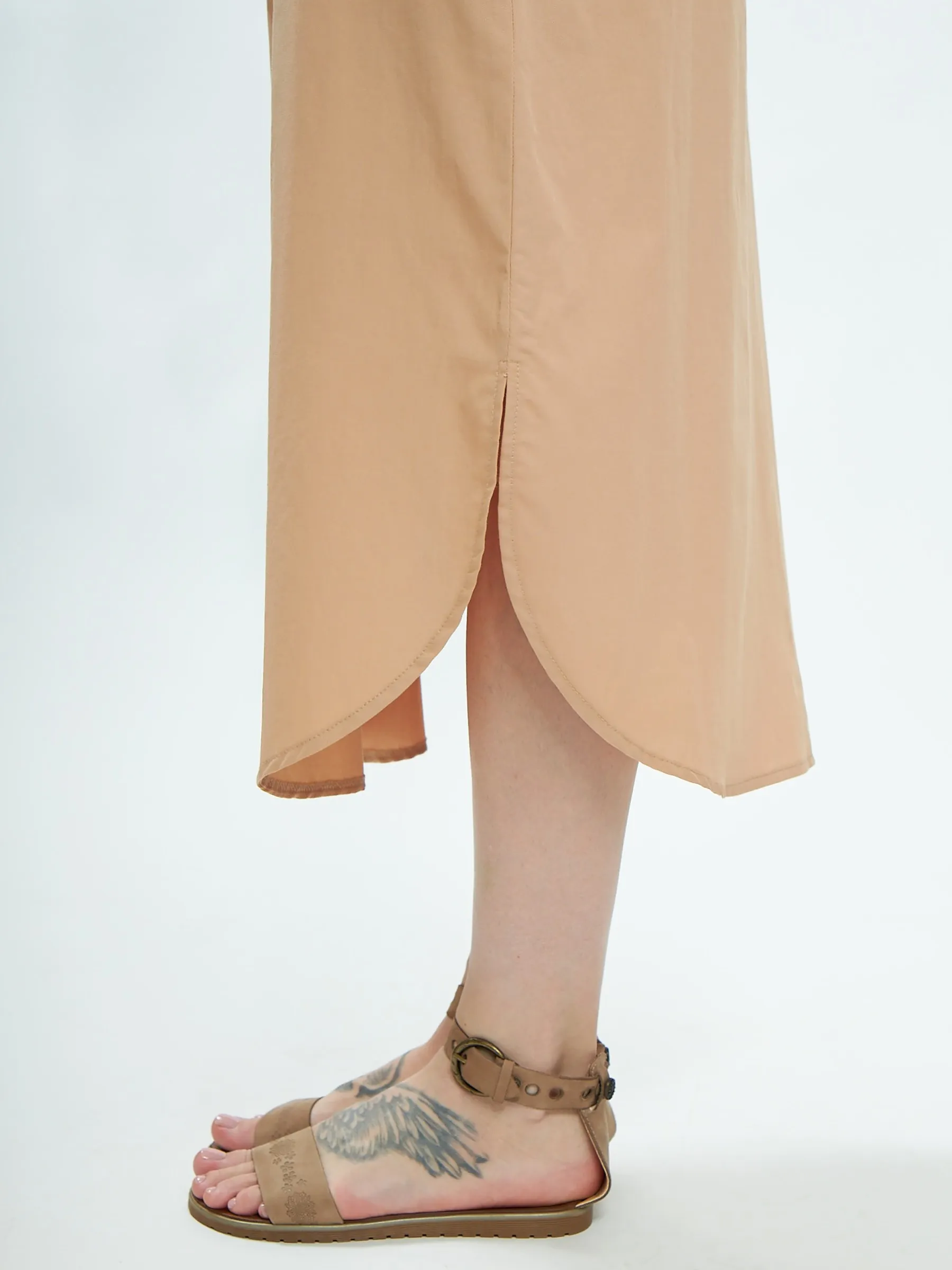 Песочное платье миди с v-образным вырезом, закругленными разрезами на подоле и стильным акцентным поясом, чтобы подчеркнуть фигуру. Модель выполнена из приятных к телу материалов: нежной вискозы и органического дышащего хлопка. Платье подойдет для повседневного стиля или вечерних образов в тёплое время года.
