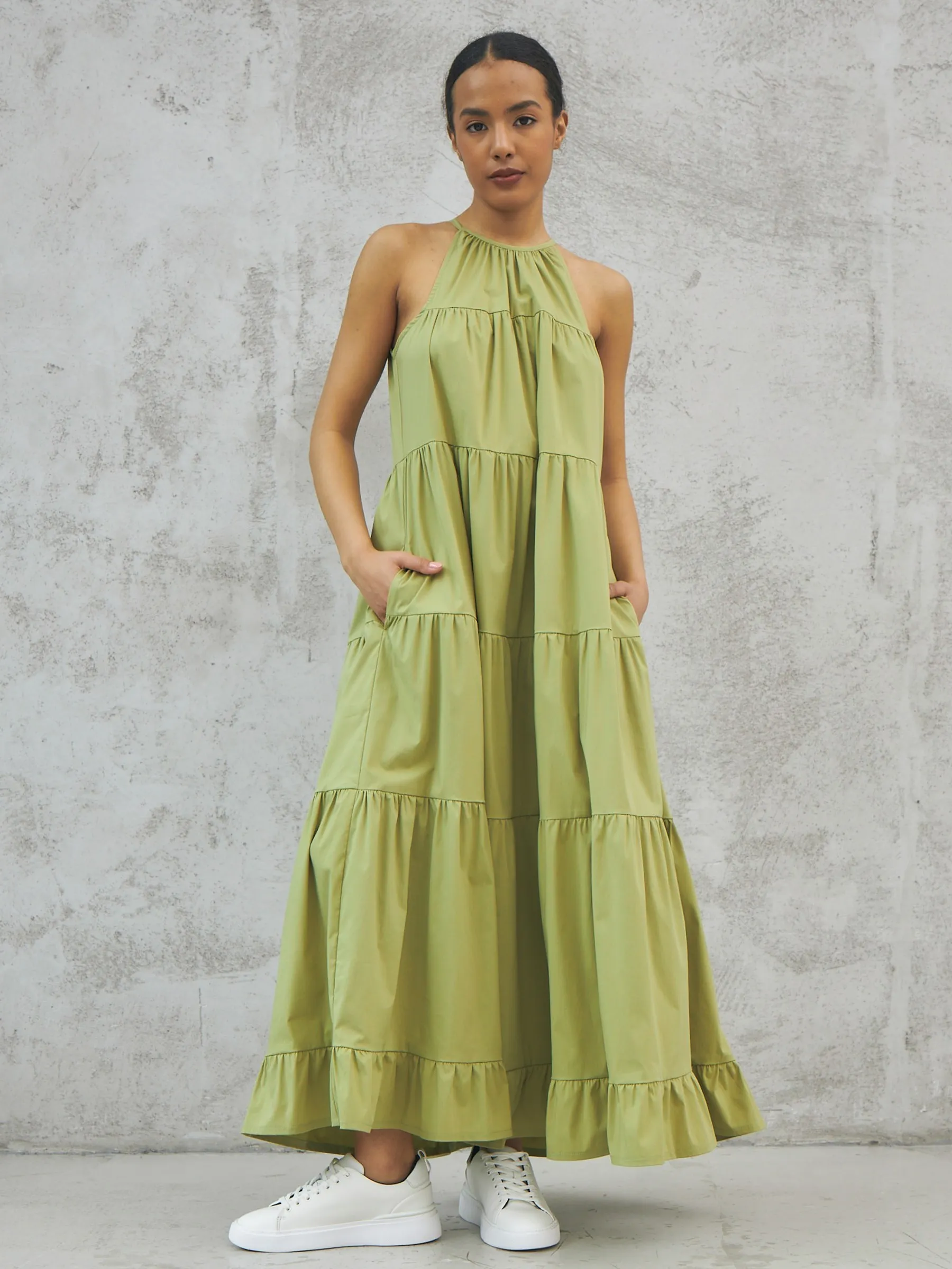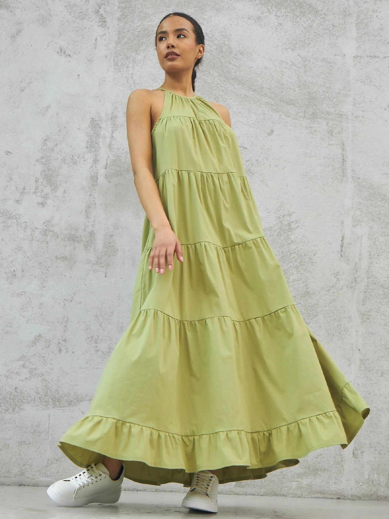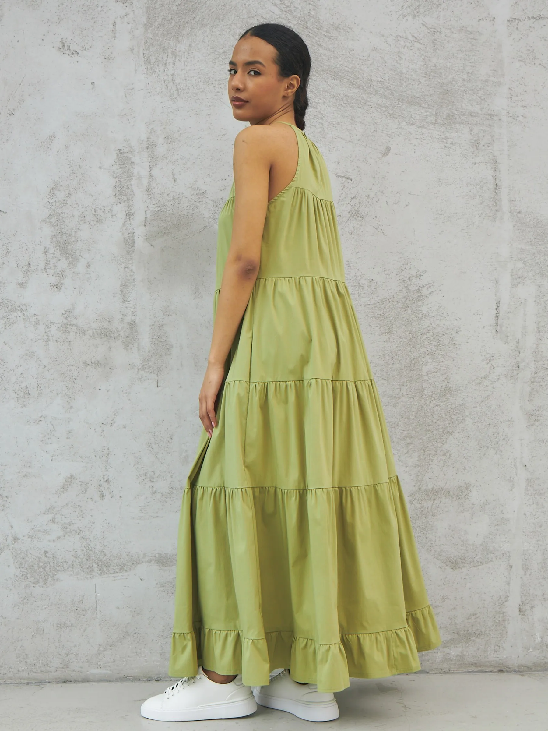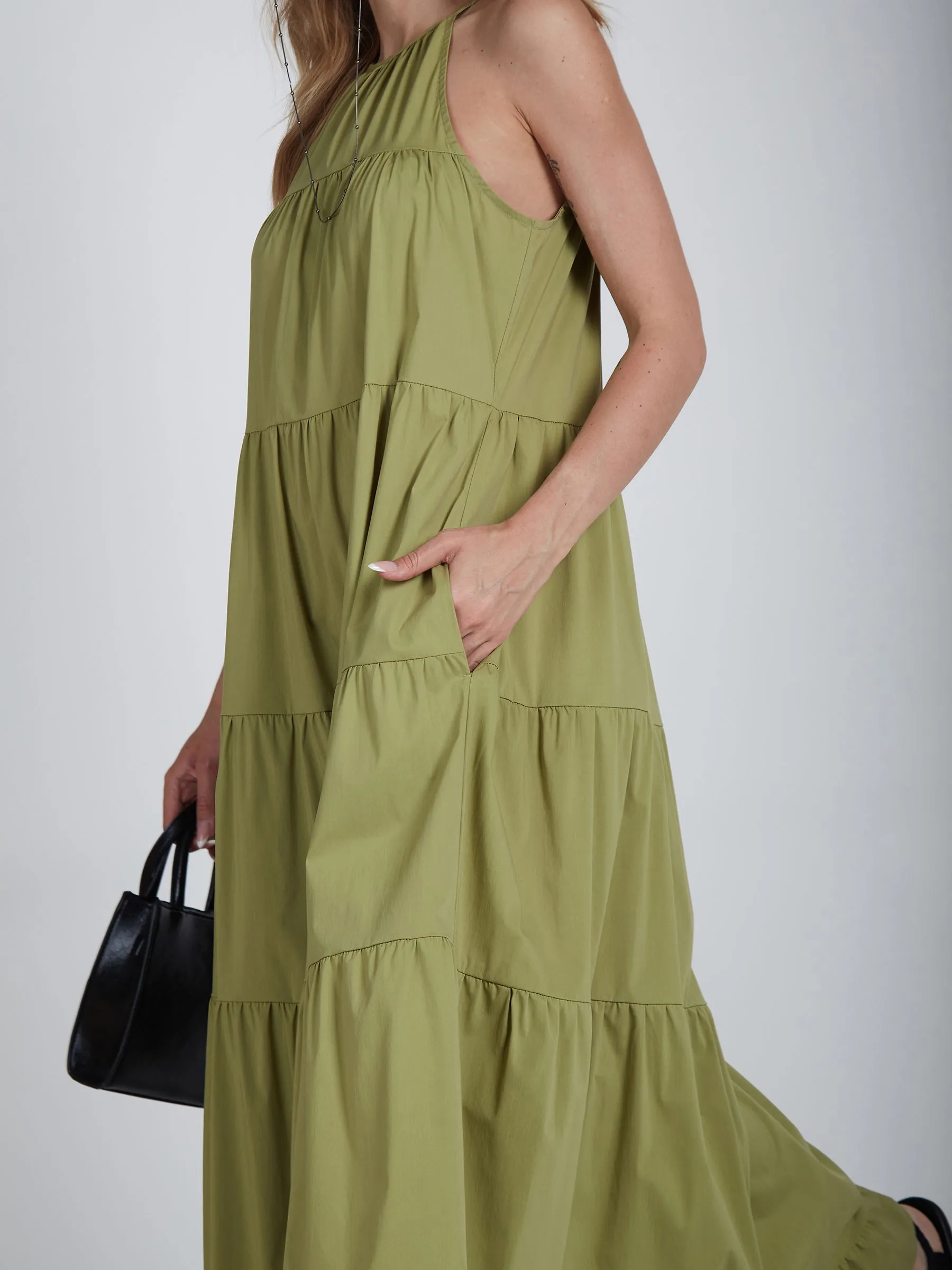Макси платье из экологичного хлопка на застежке с незаметными карманами и мягкими воланами, создающими нежный эффект. Для большей практичности и эластичности в ткань добавлены волокна нейлона и эластана, не ухудшающие комфорт во время носки. Платье без рукавов идеально для отдыха.