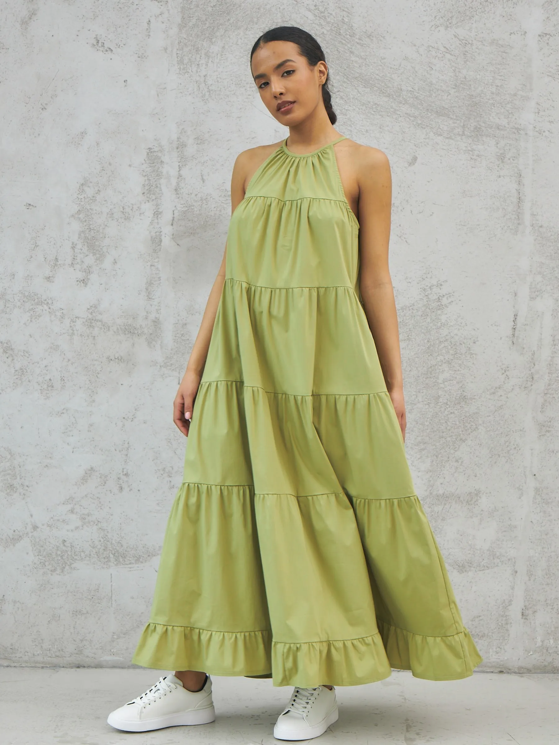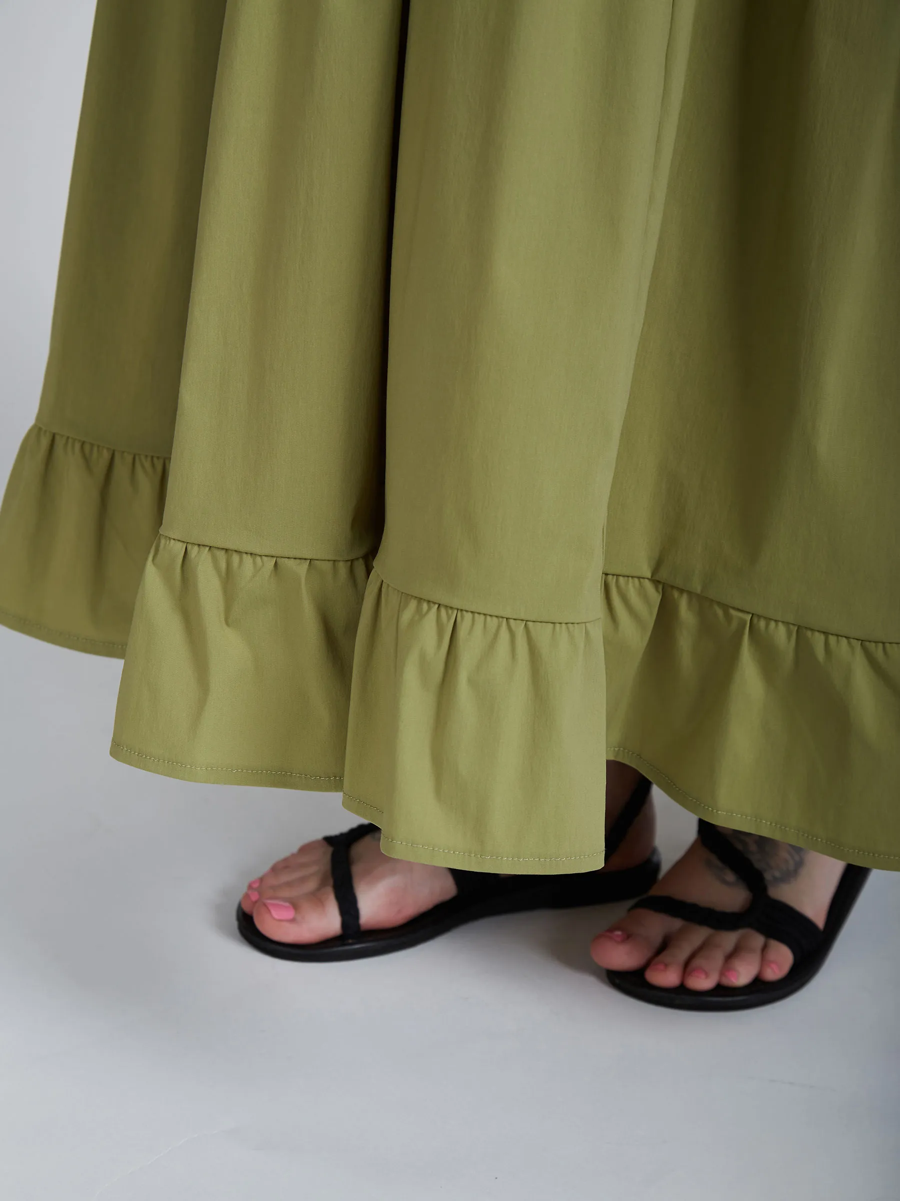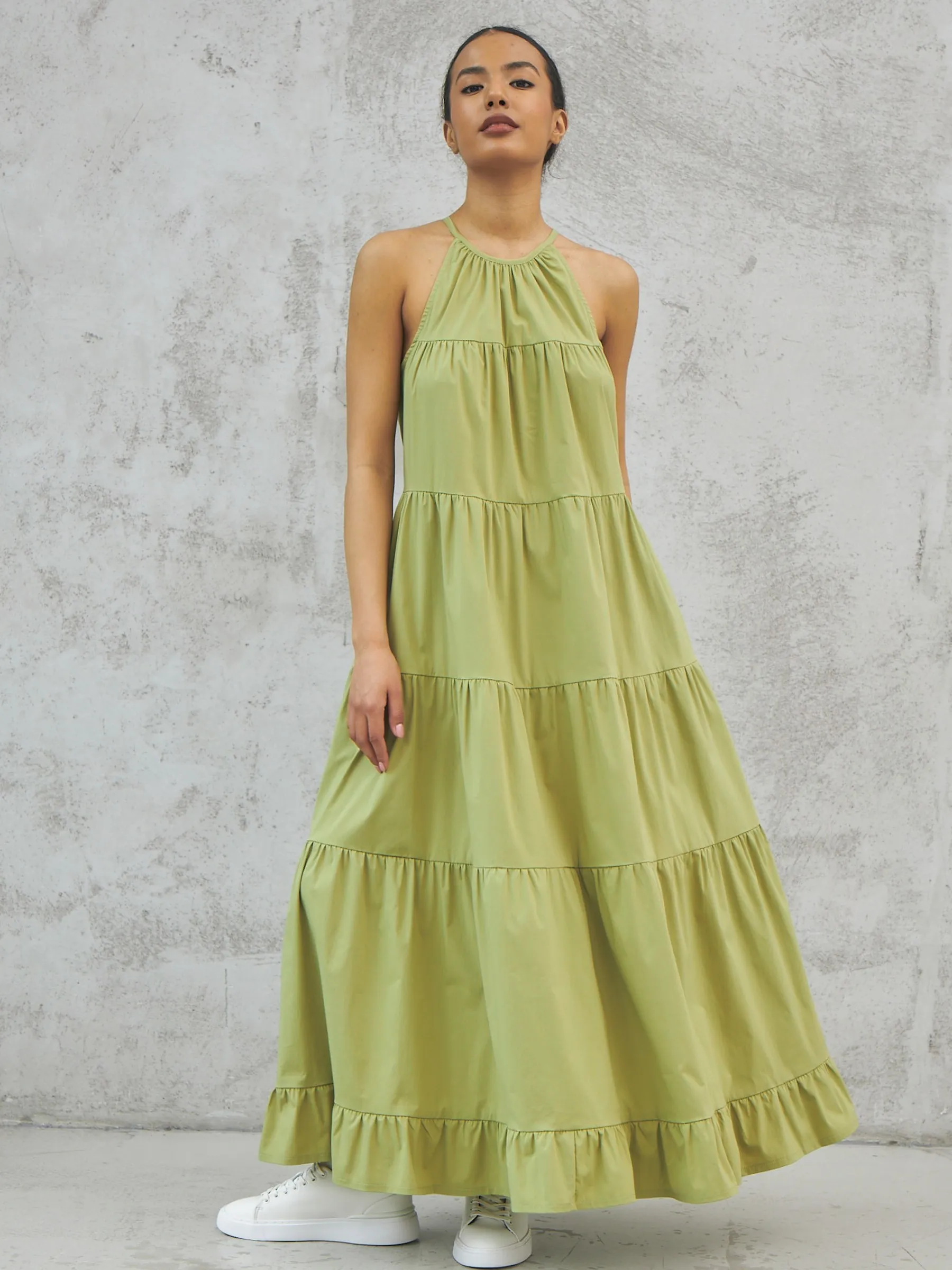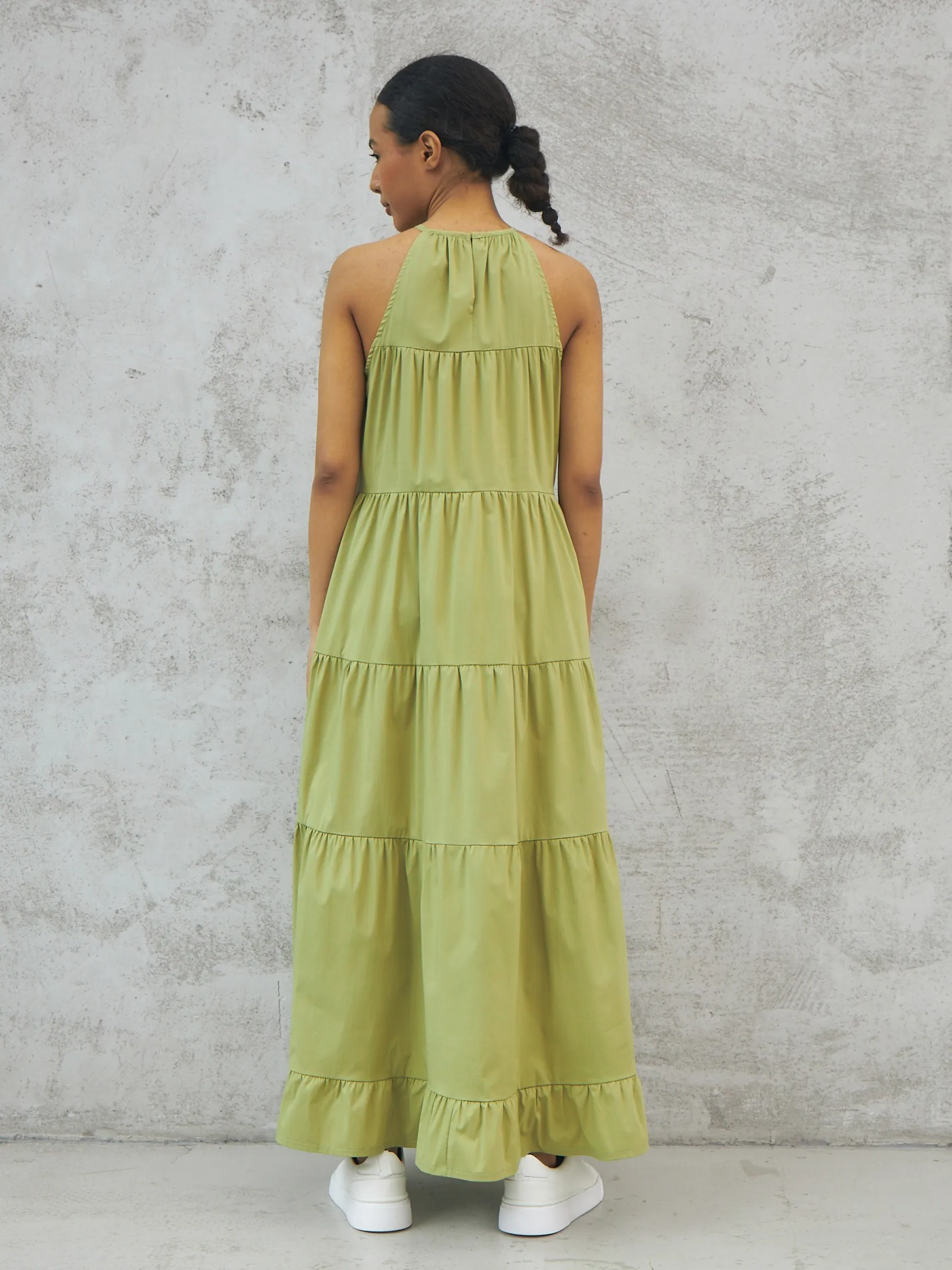 Макси платье из экологичного хлопка на застежке с незаметными карманами и мягкими воланами, создающими нежный эффект. Для большей практичности и эластичности в ткань добавлены волокна нейлона и эластана, не ухудшающие комфорт во время носки. Платье без рукавов идеально для отдыха.